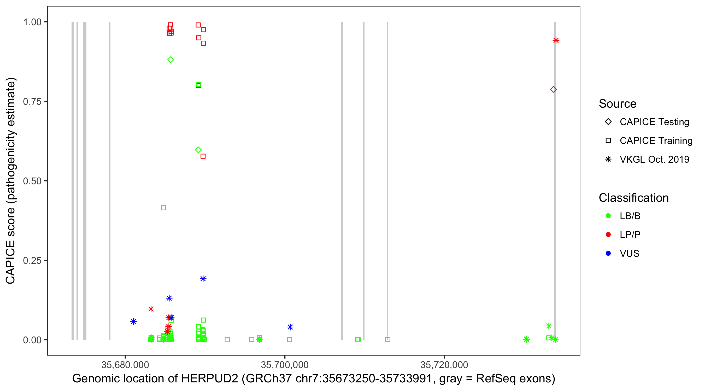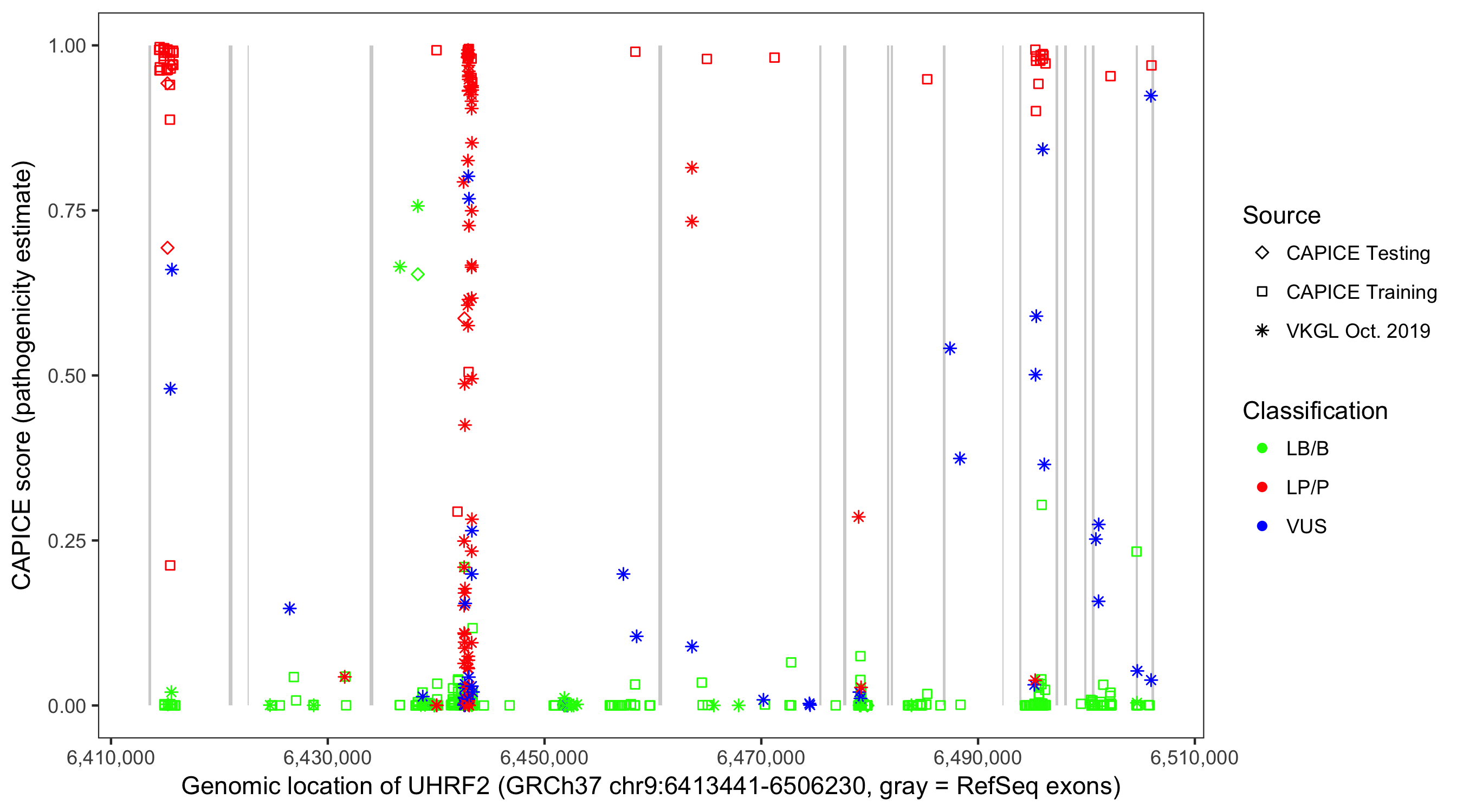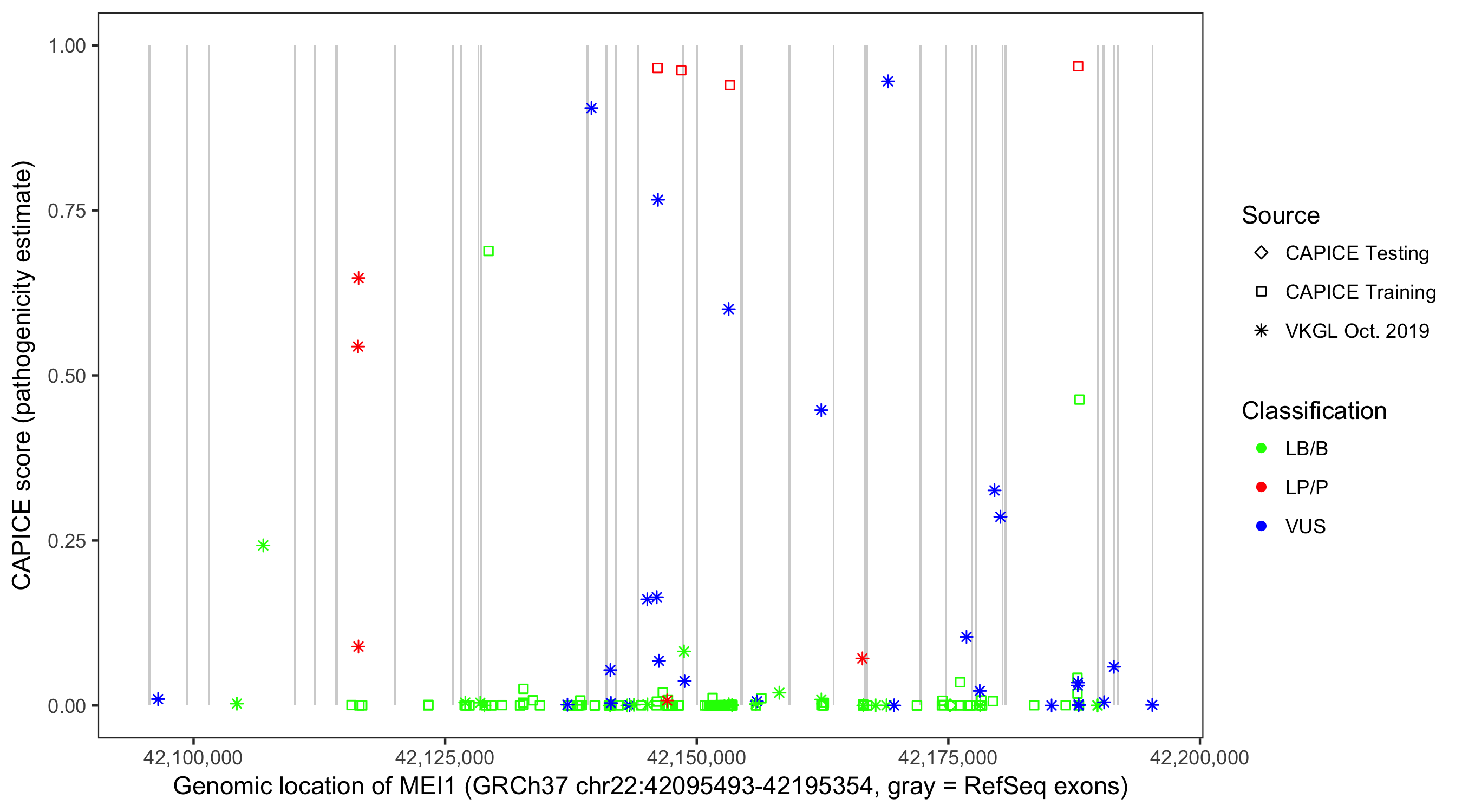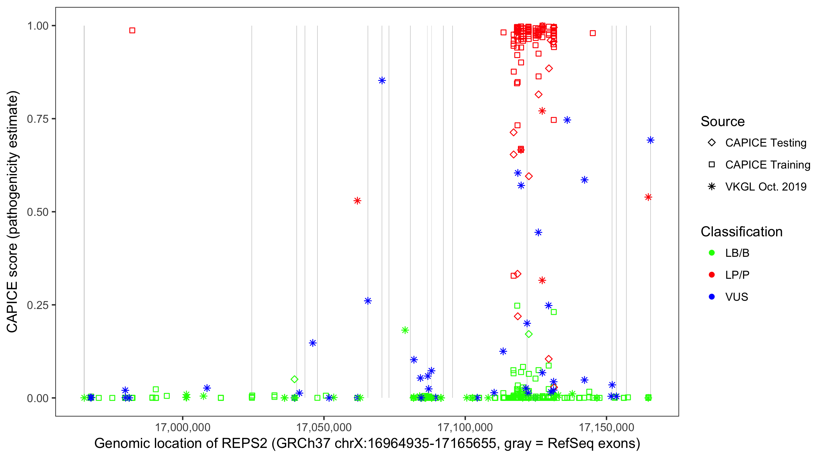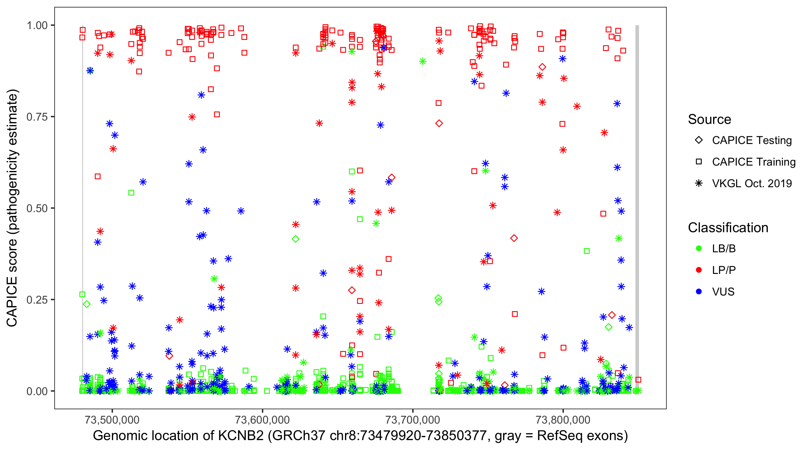 Shown are CAPICE train/test variants plus VKGL Oct 2019.