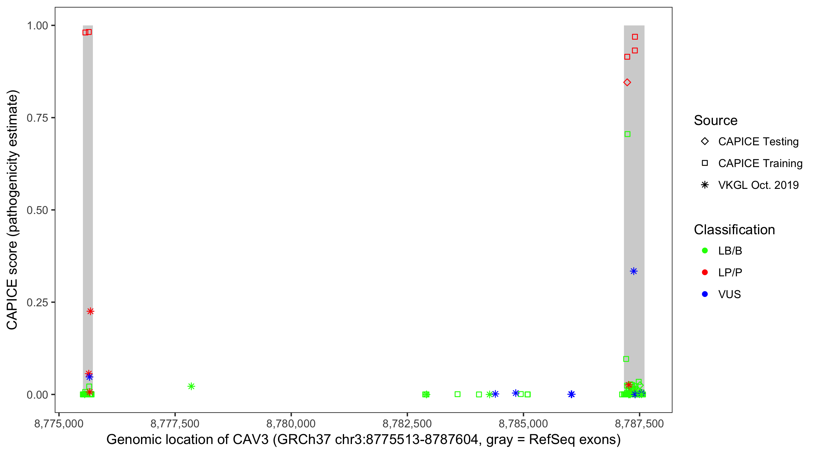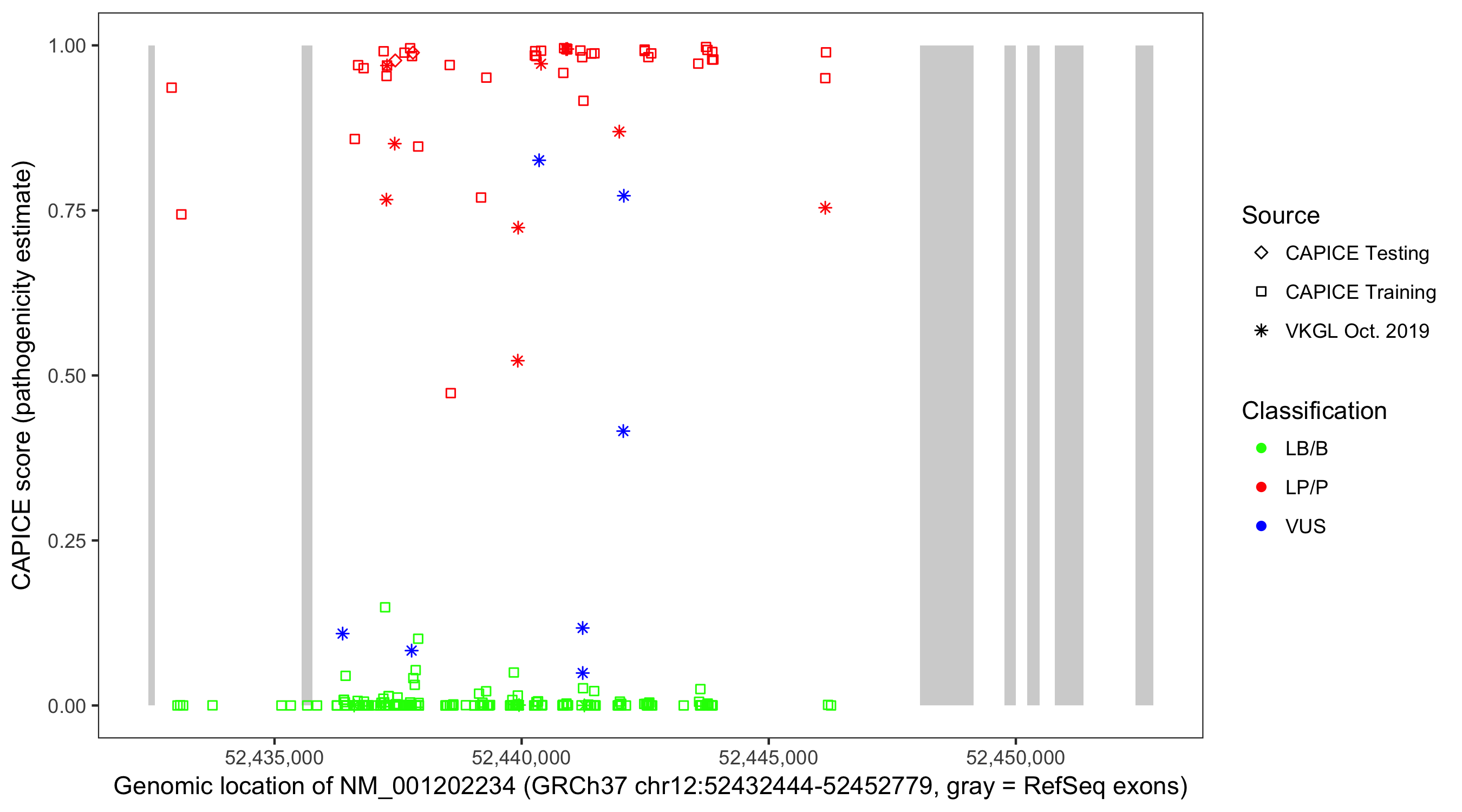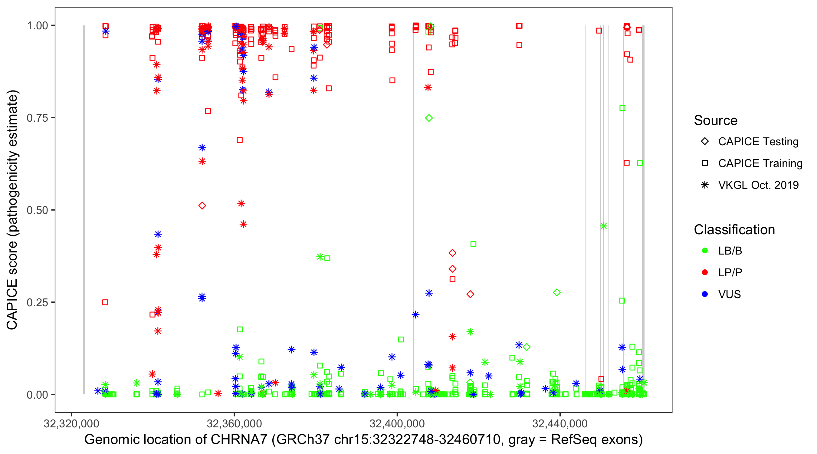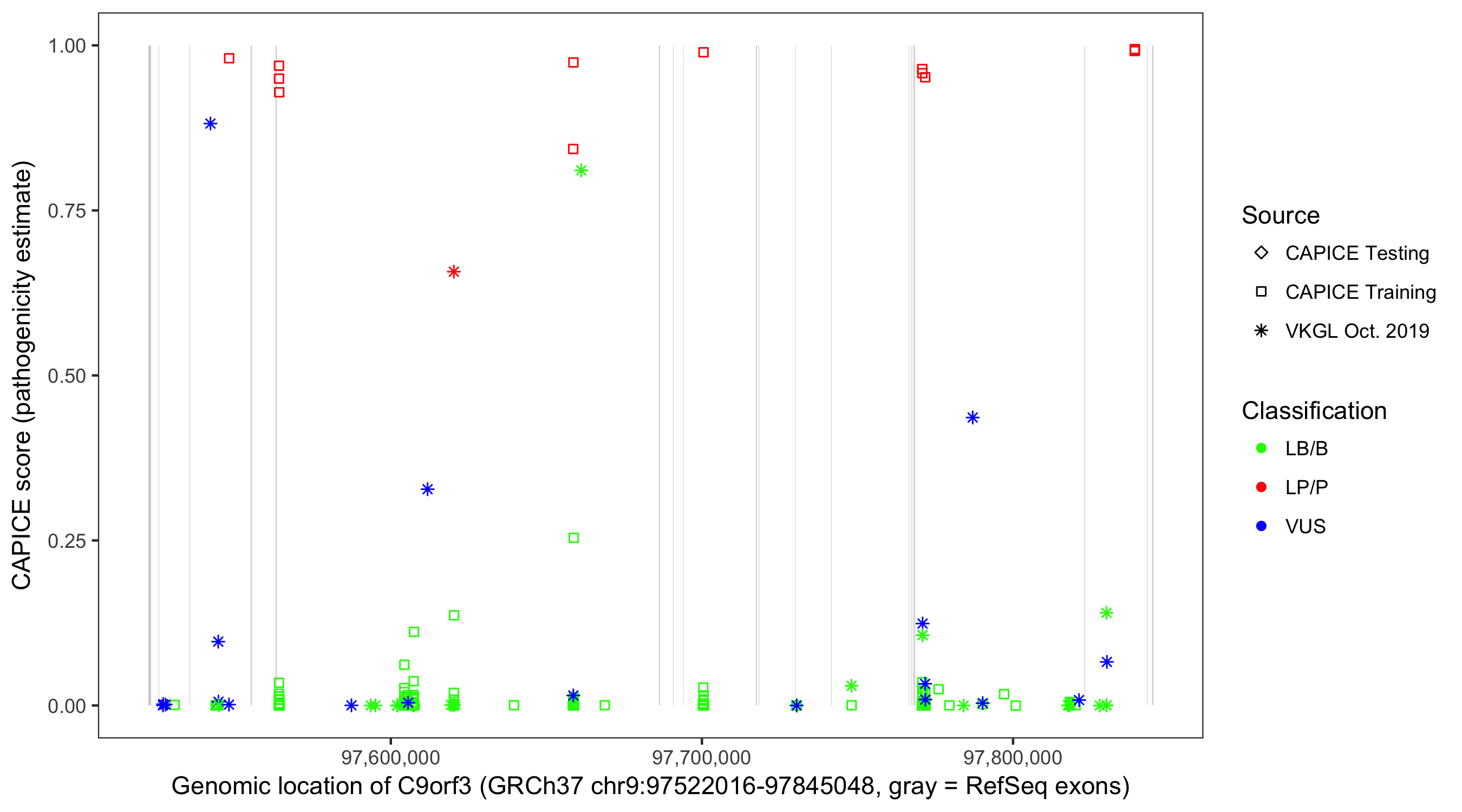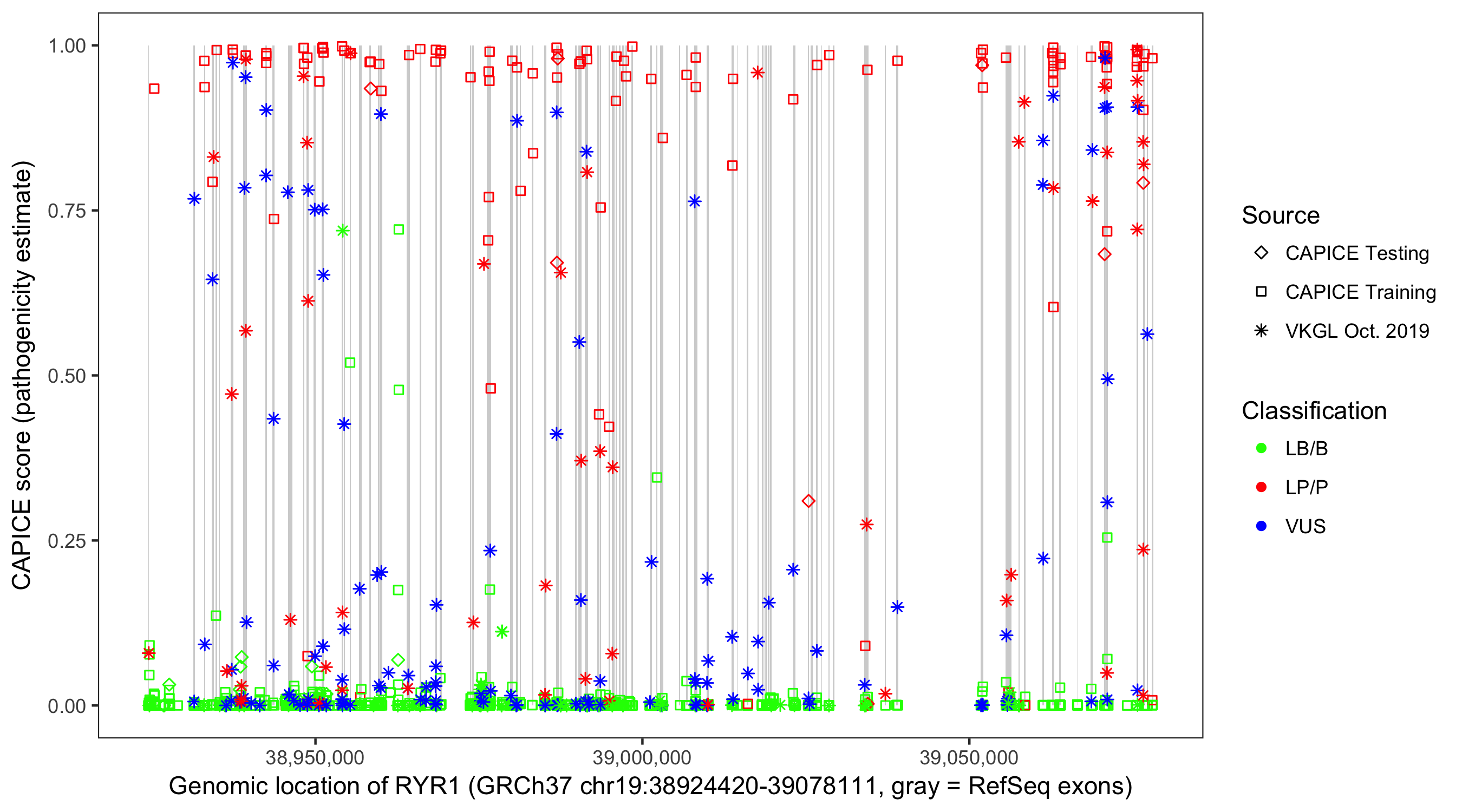 Shown are CAPICE train/test variants plus VKGL Oct 2019.