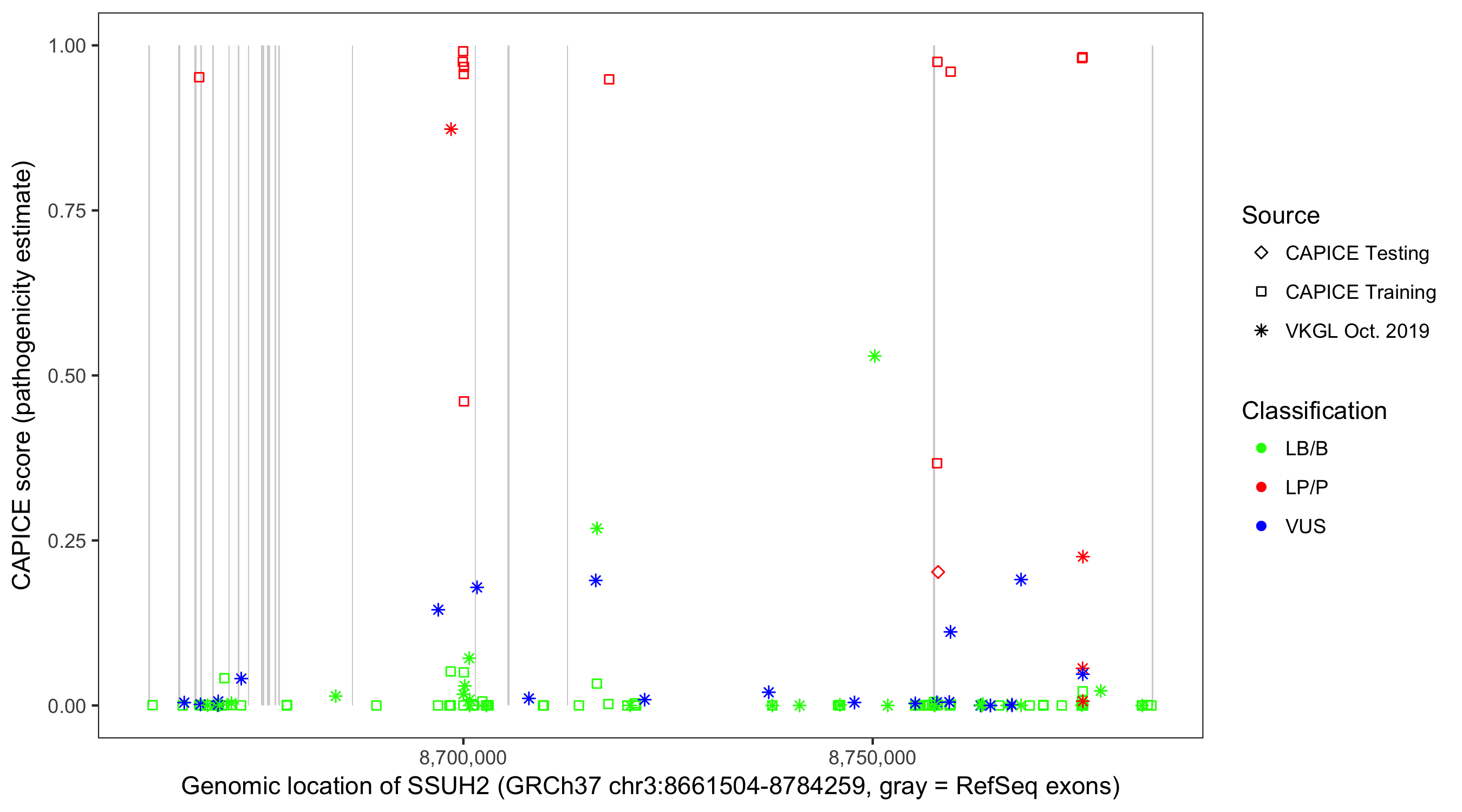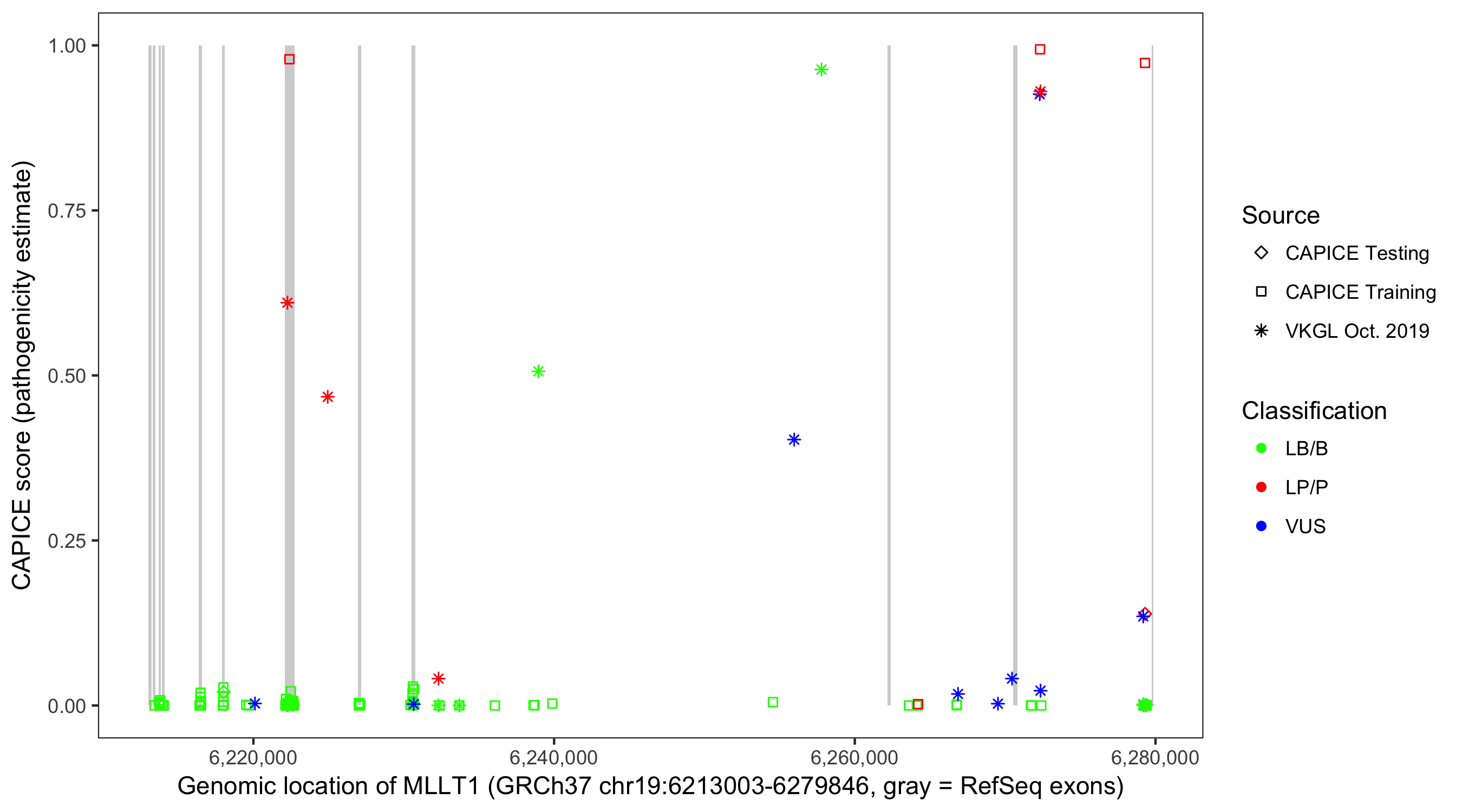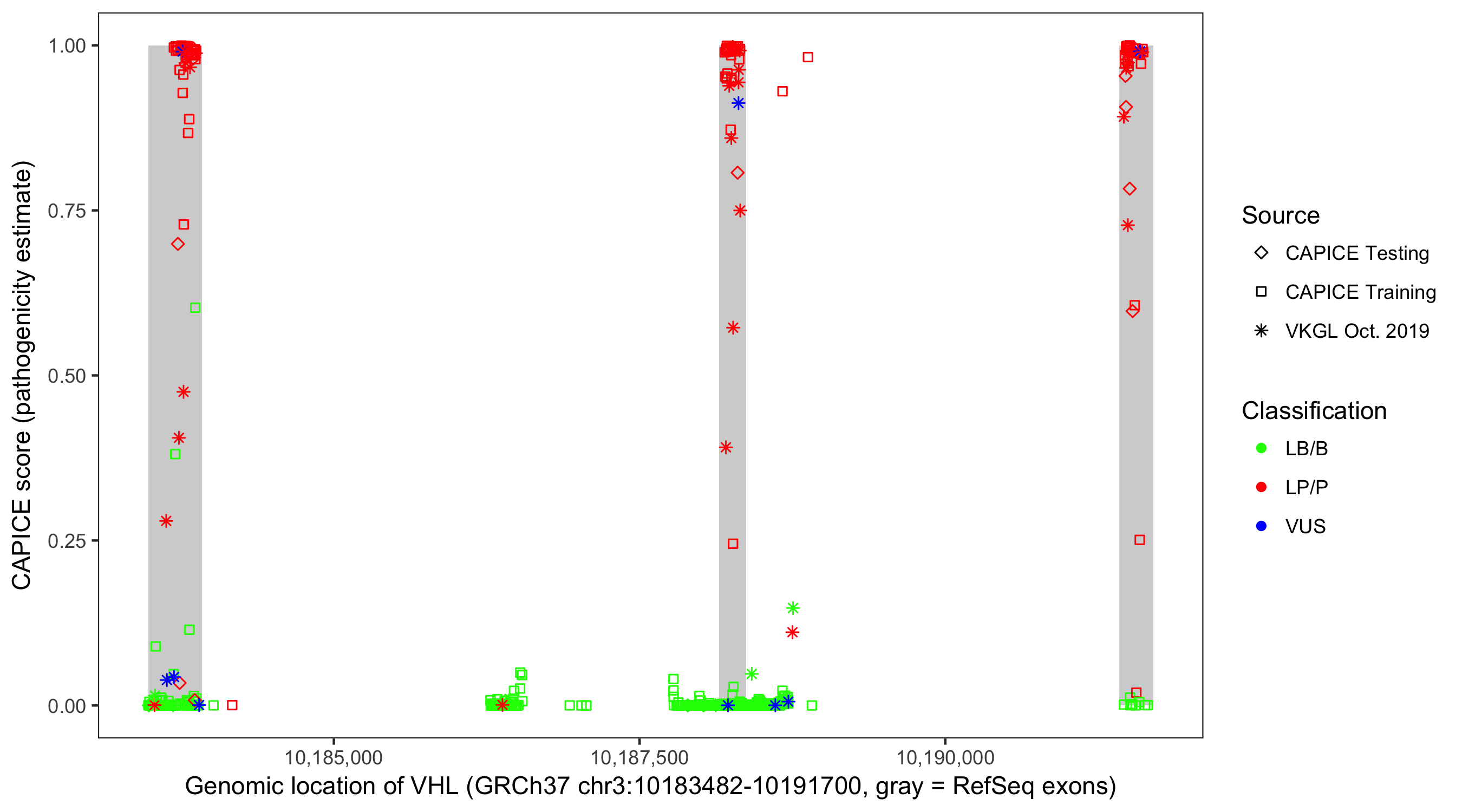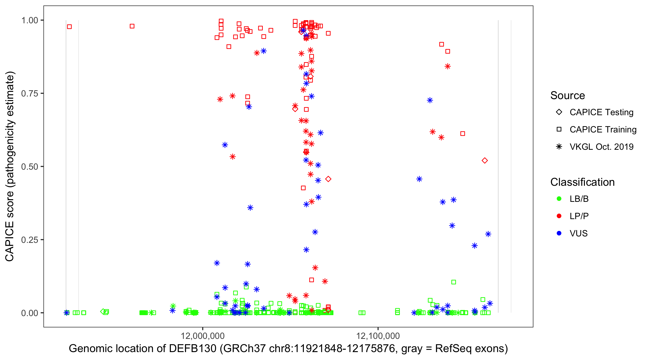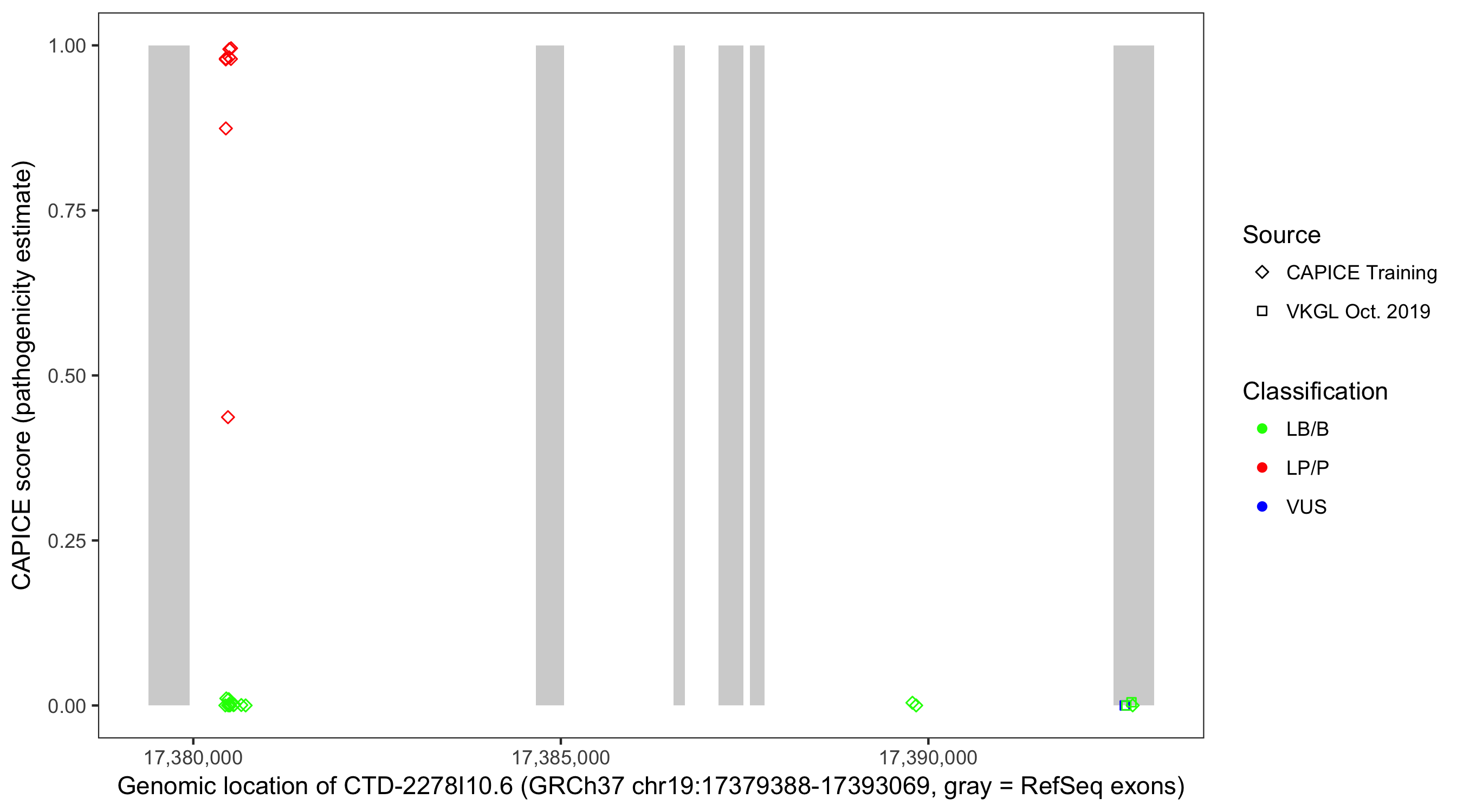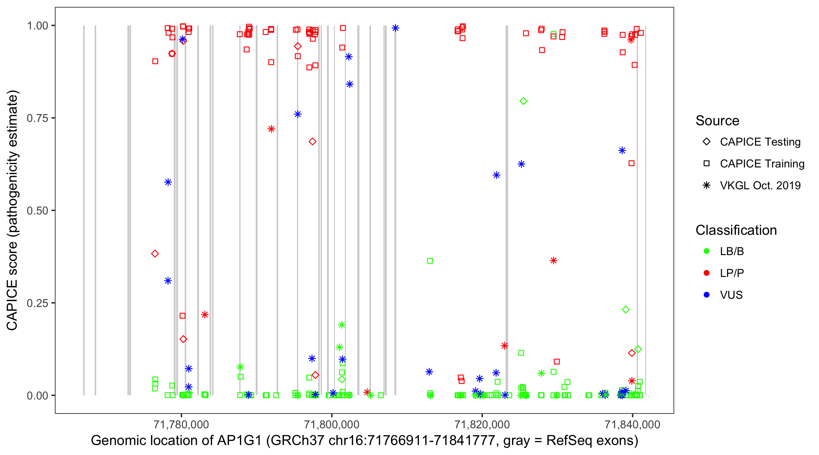 Shown are CAPICE train/test variants plus VKGL Oct 2019.