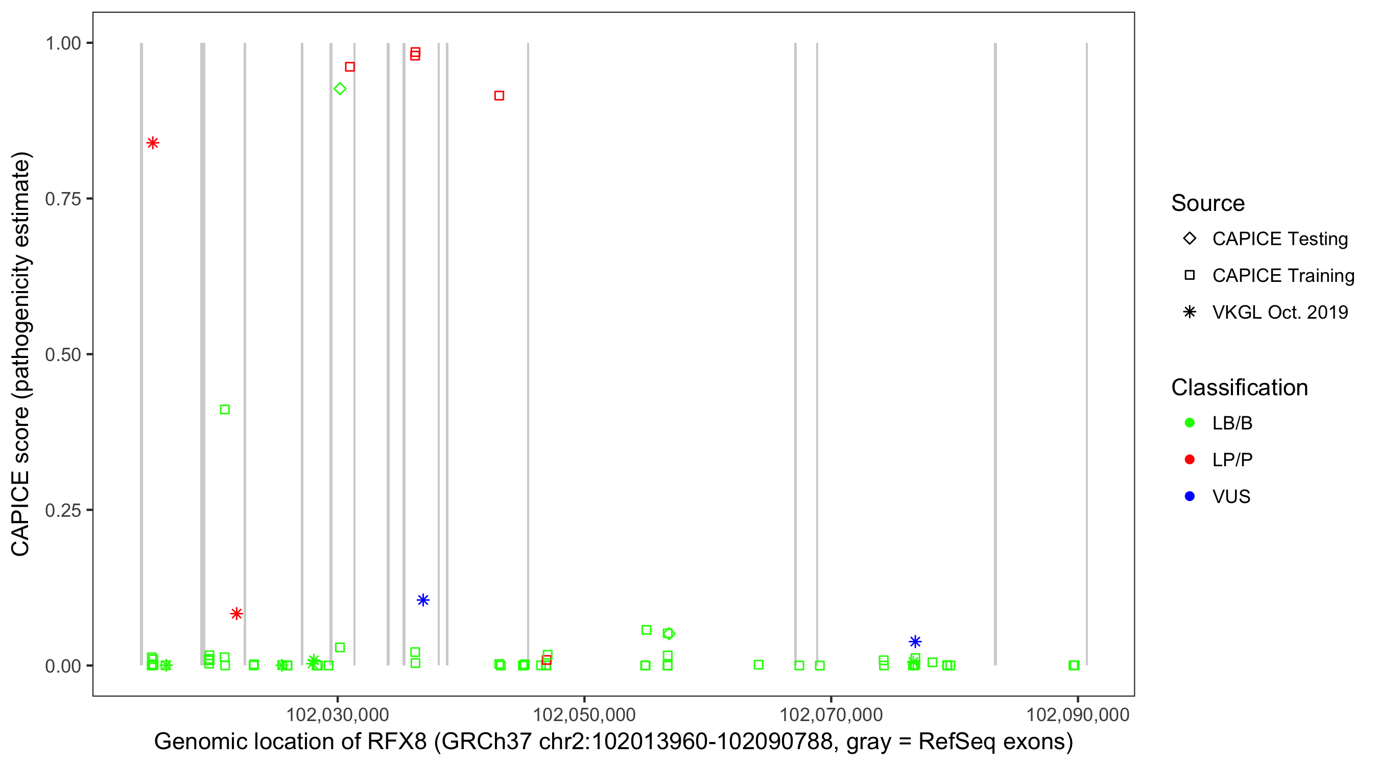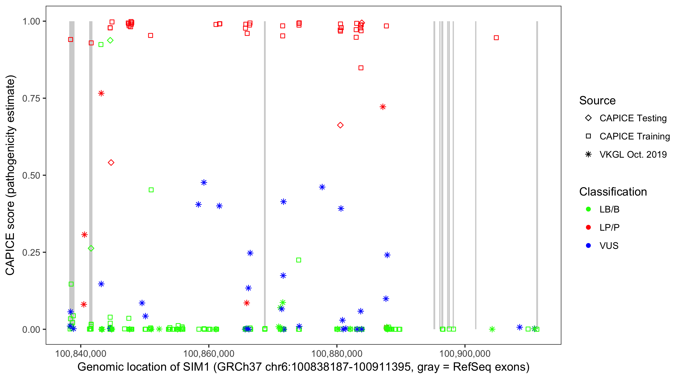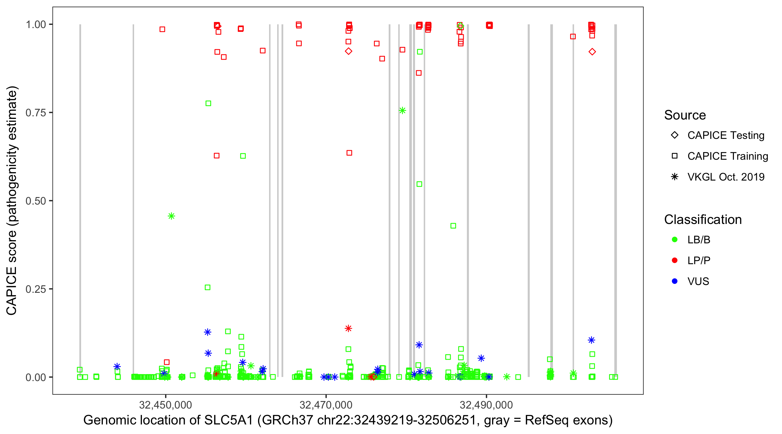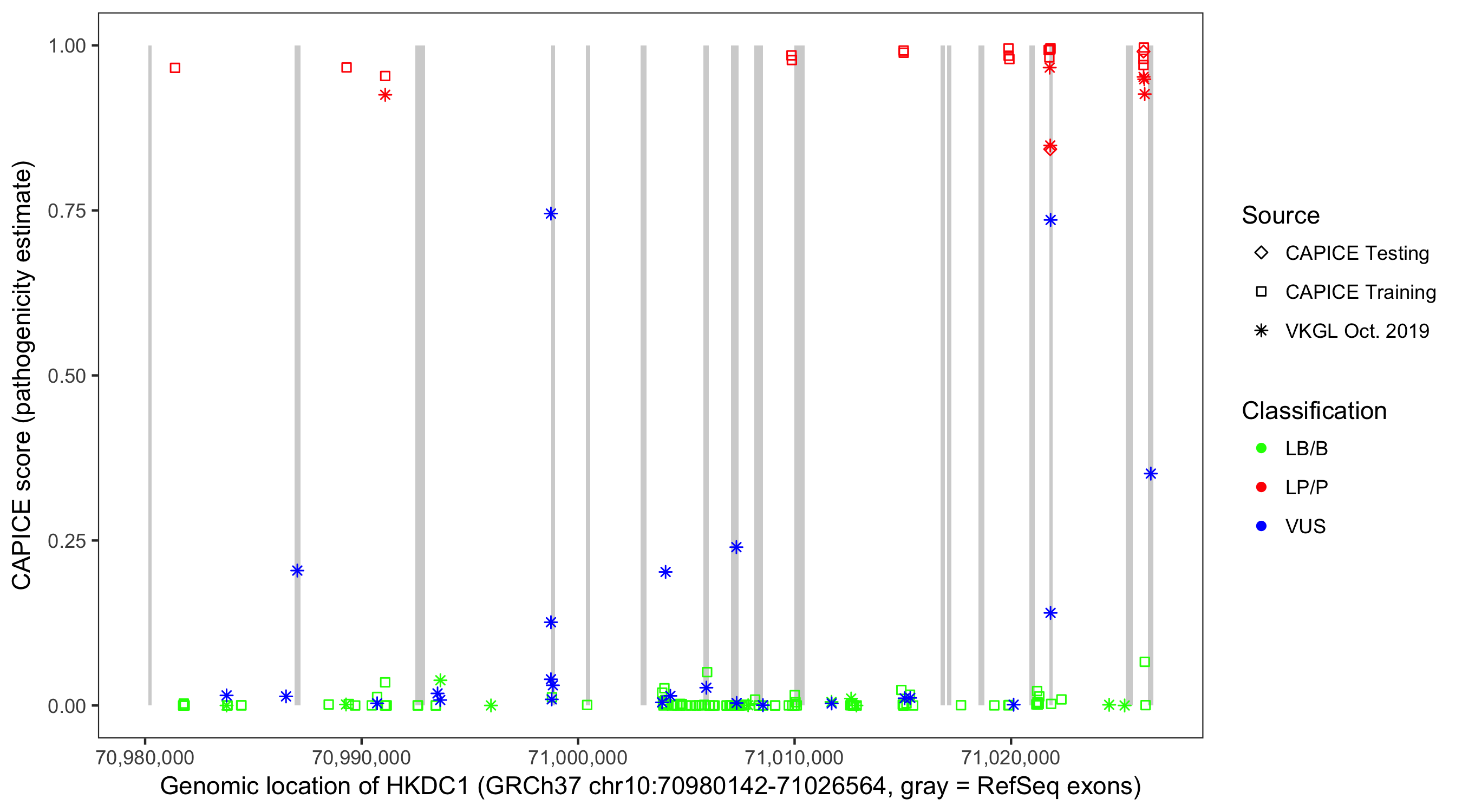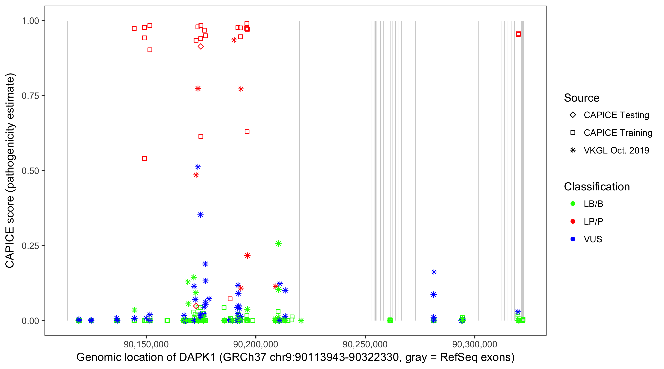 Shown are CAPICE train/test variants plus VKGL Oct 2019.