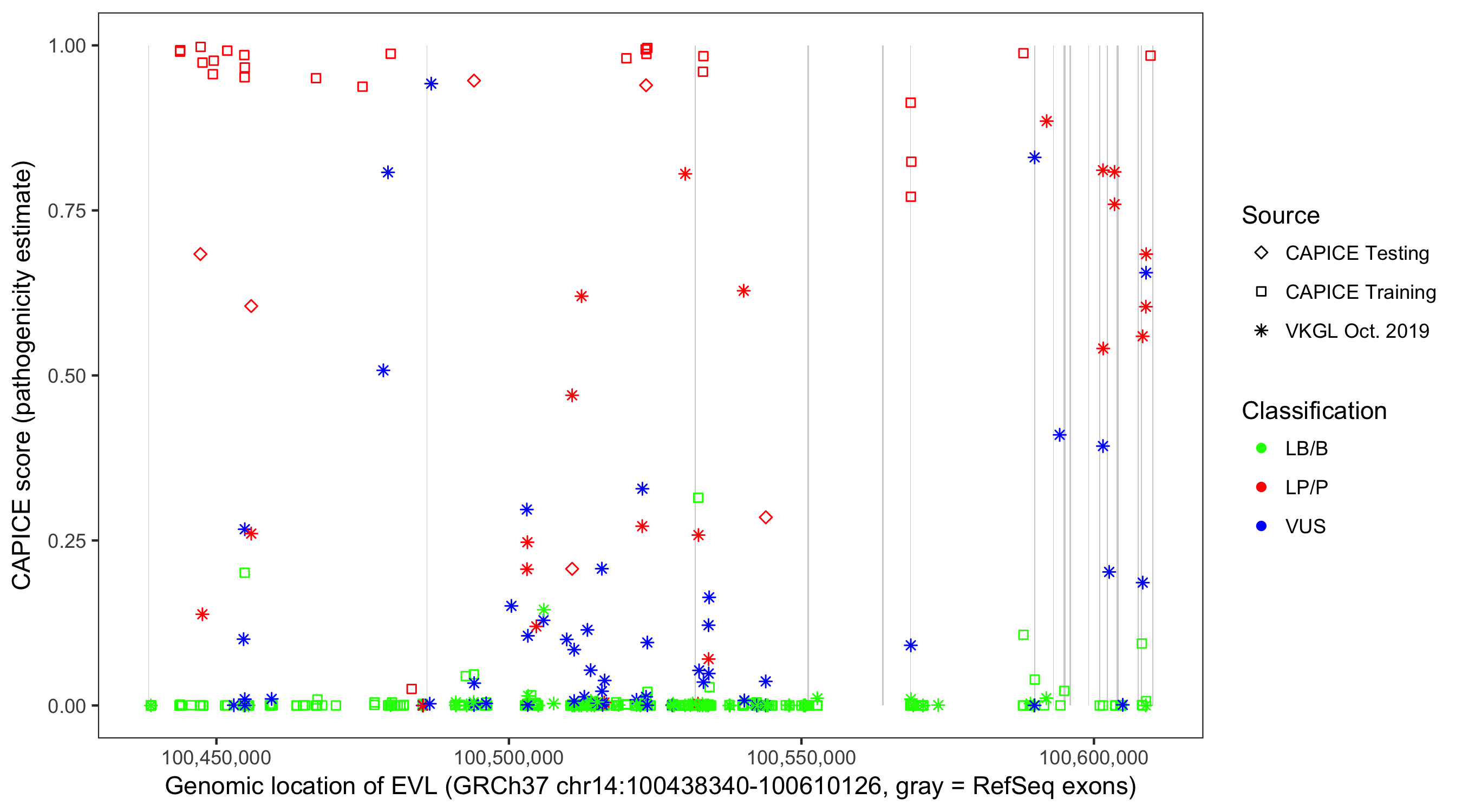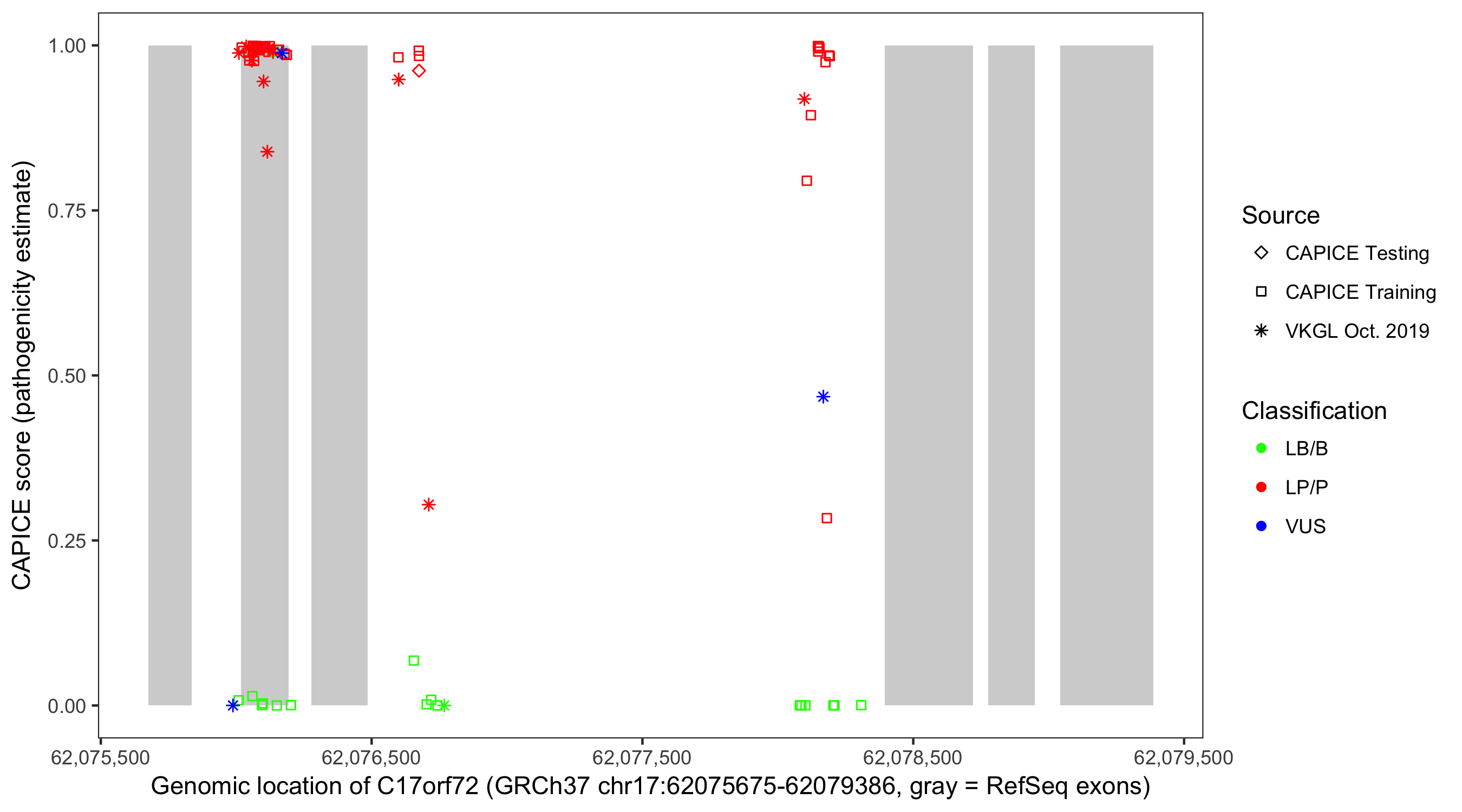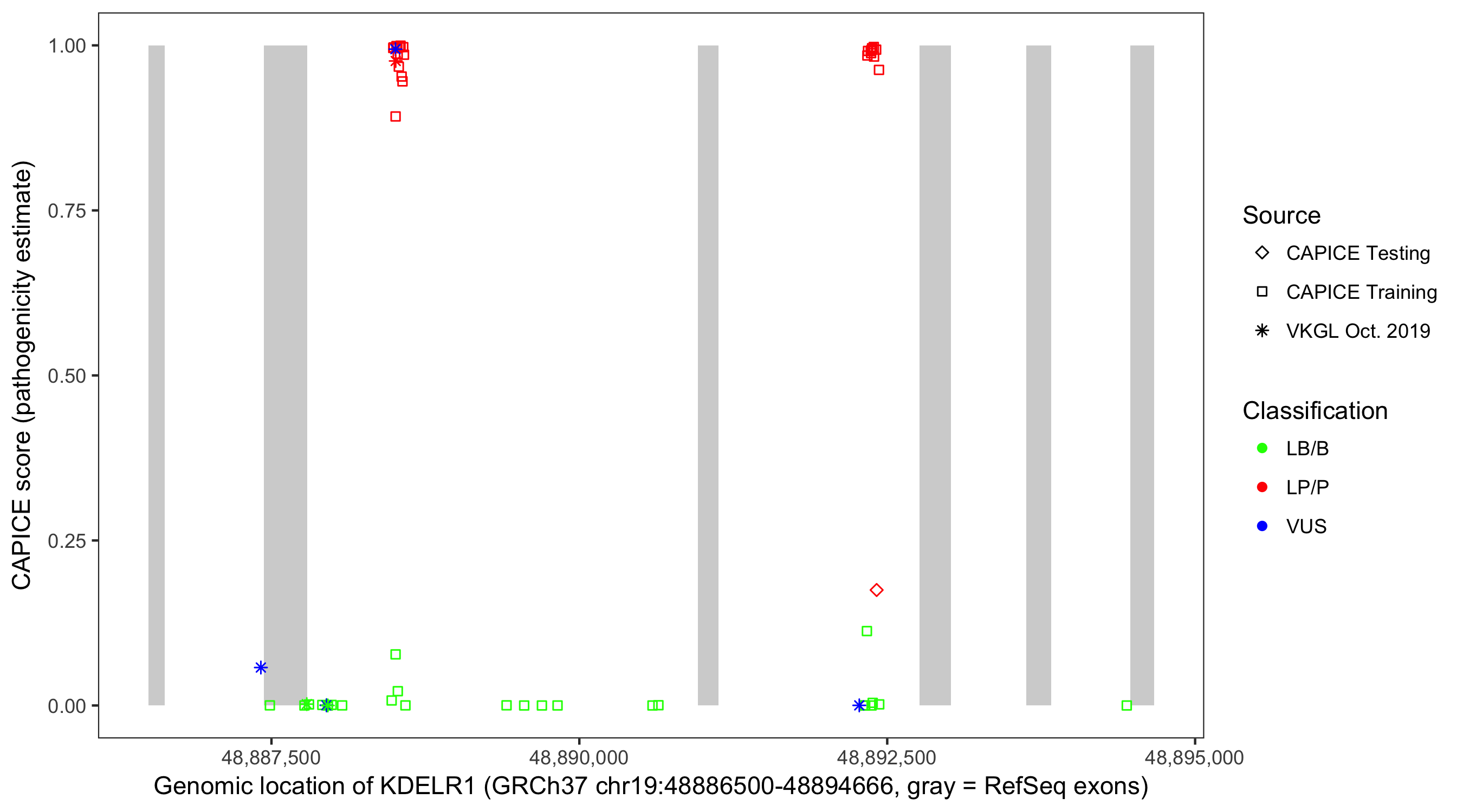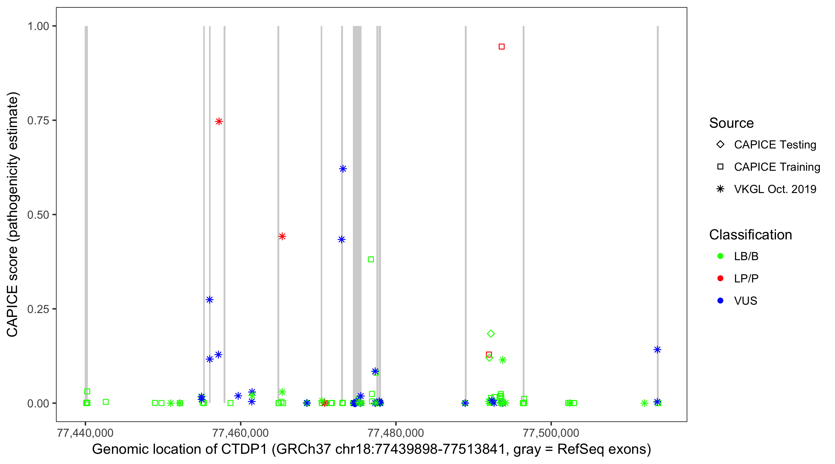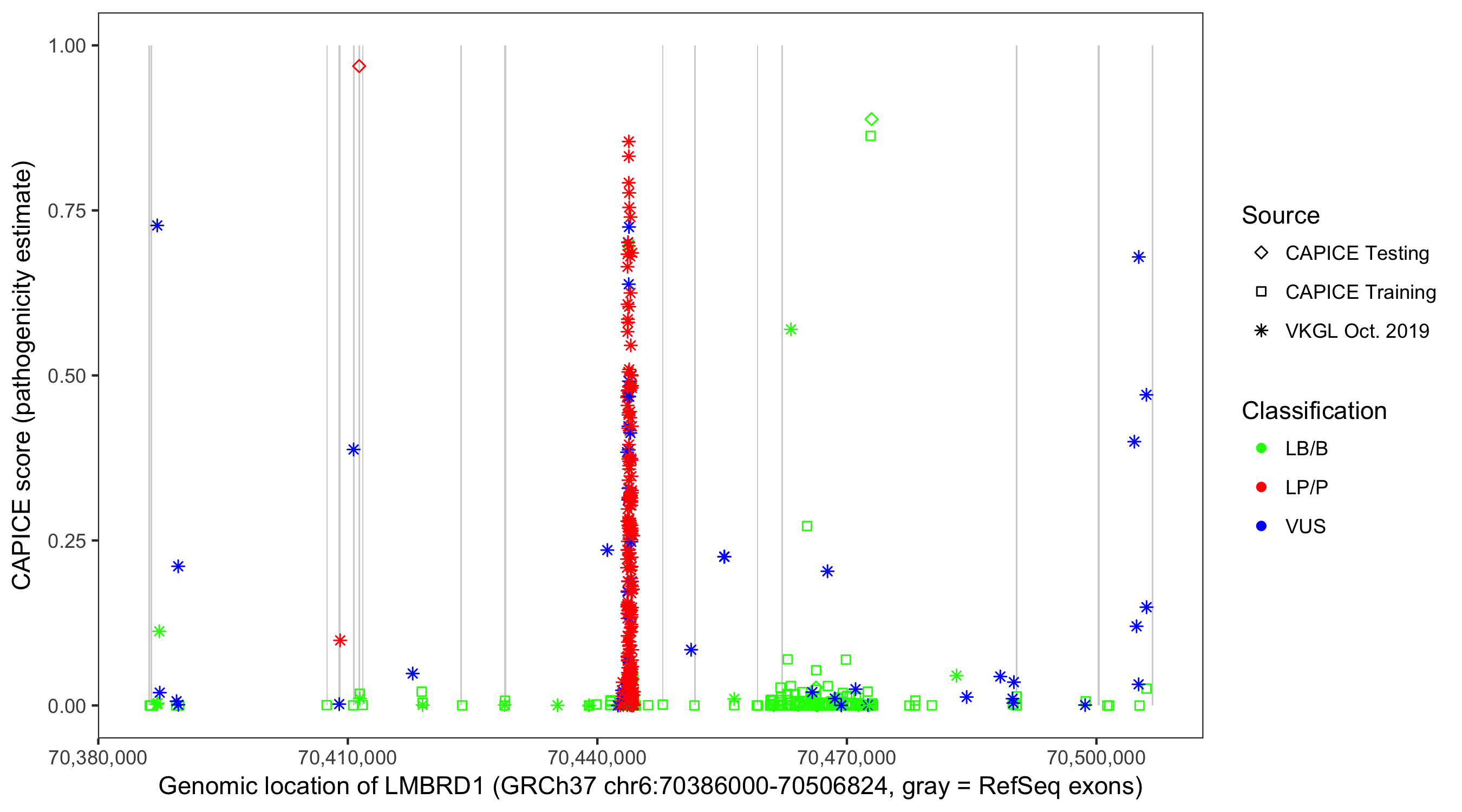 Shown are CAPICE train/test variants plus VKGL Oct 2019.