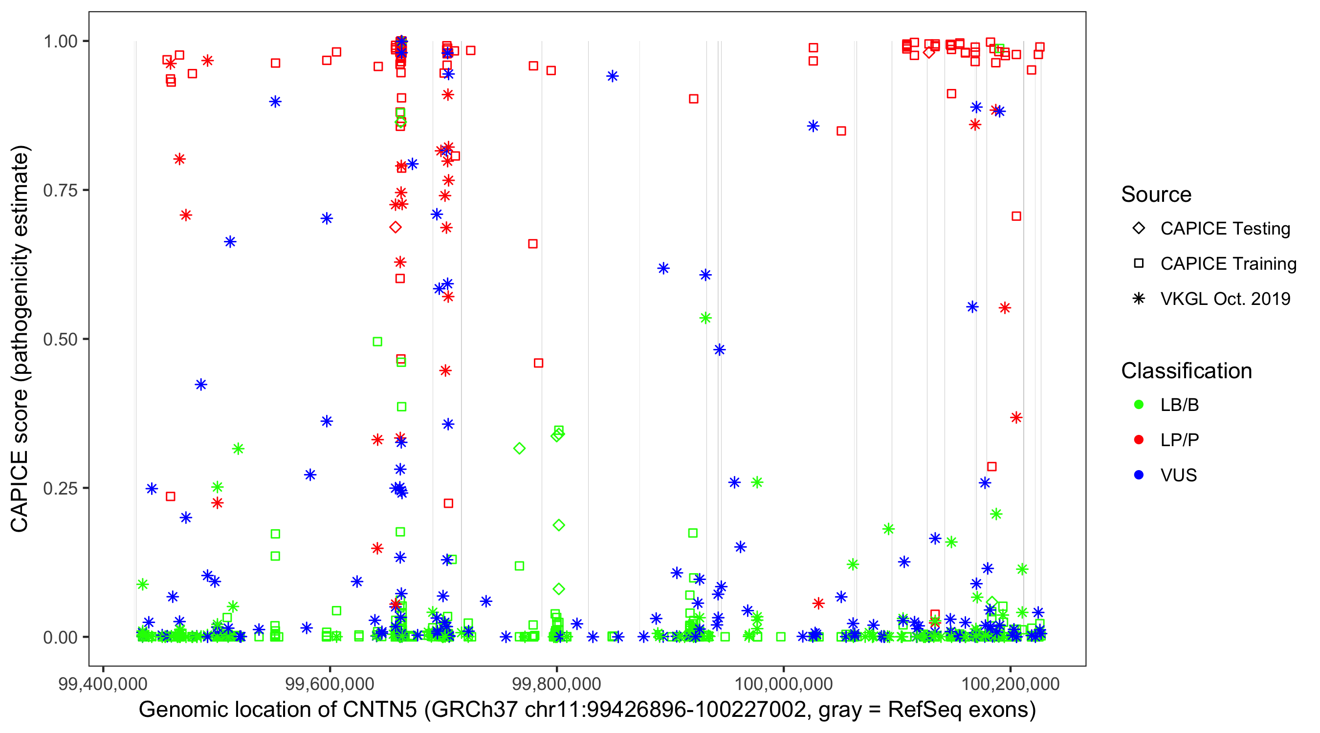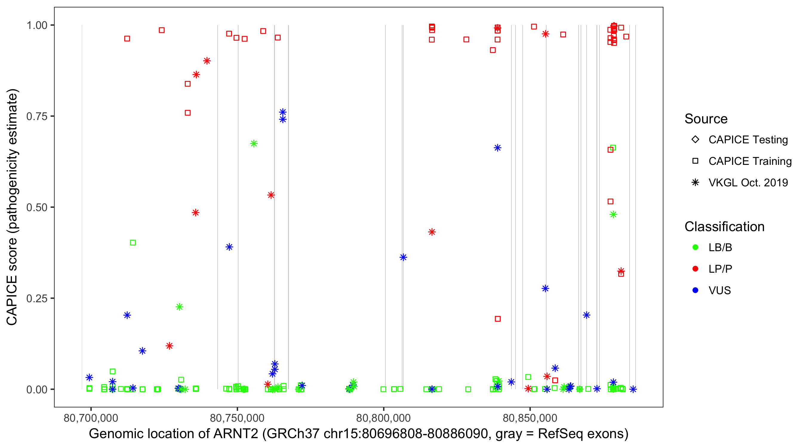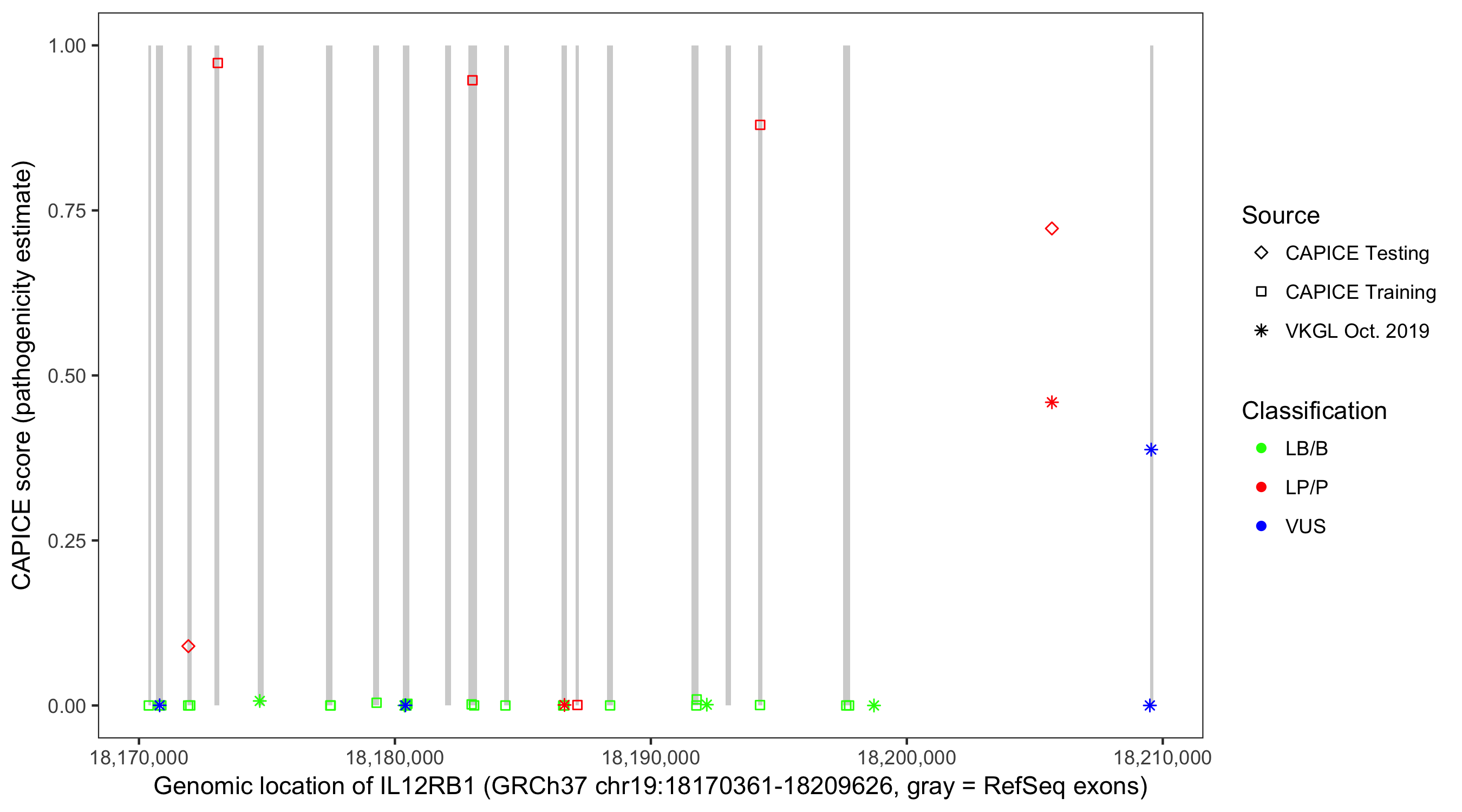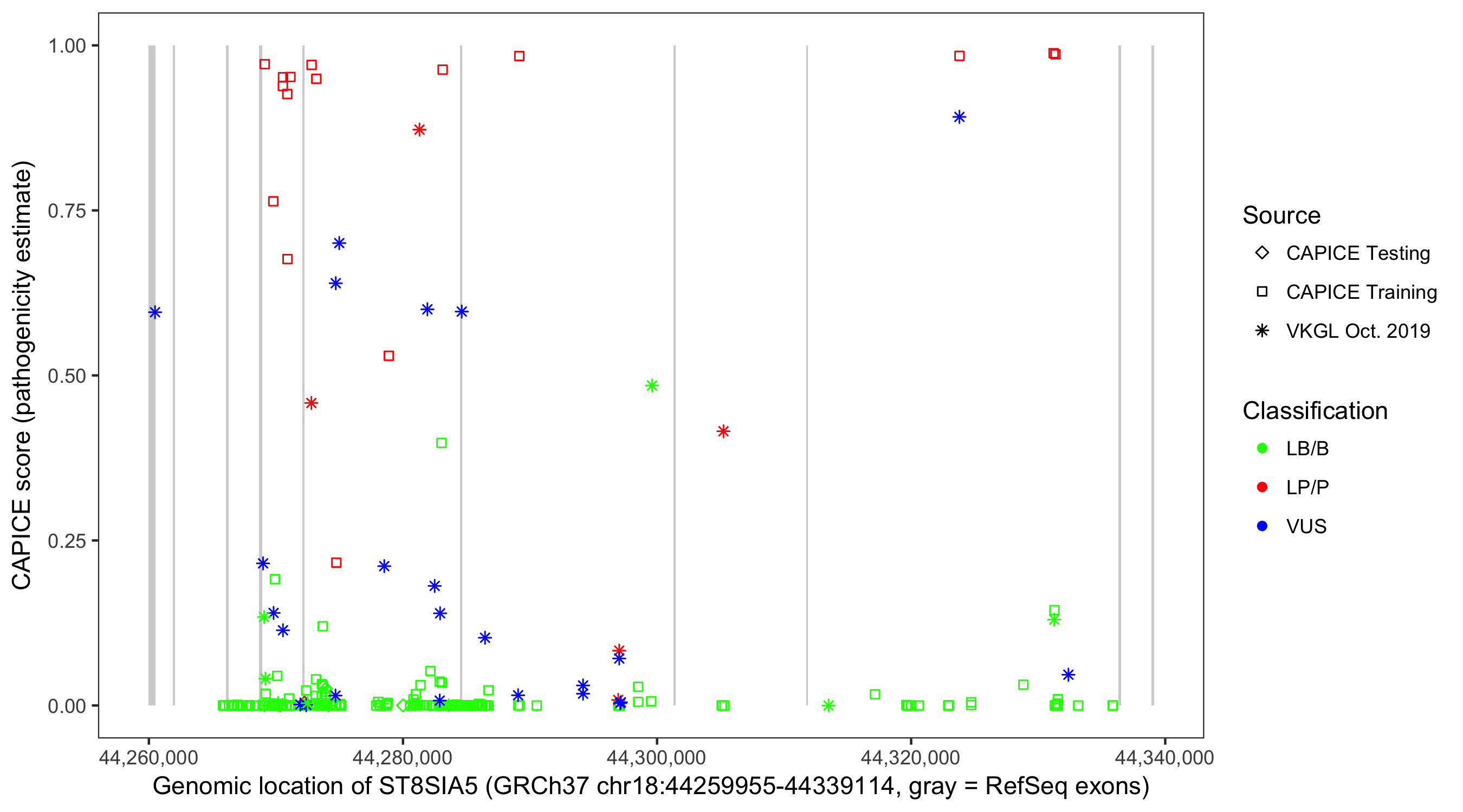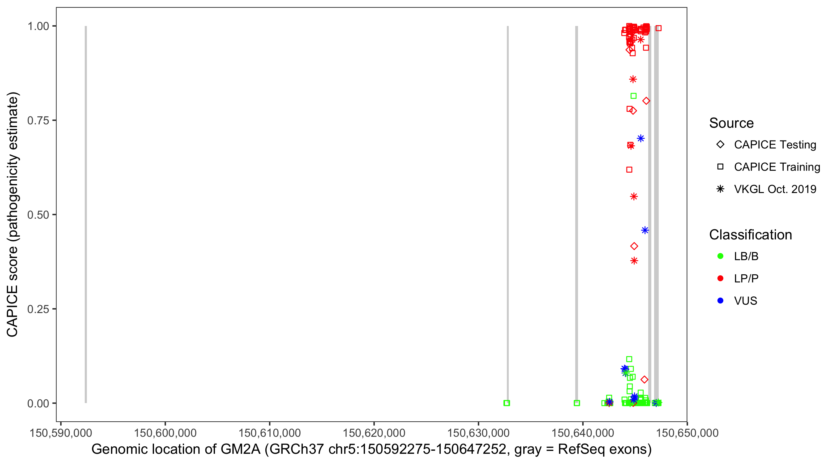 Shown are CAPICE train/test variants plus VKGL Oct 2019.