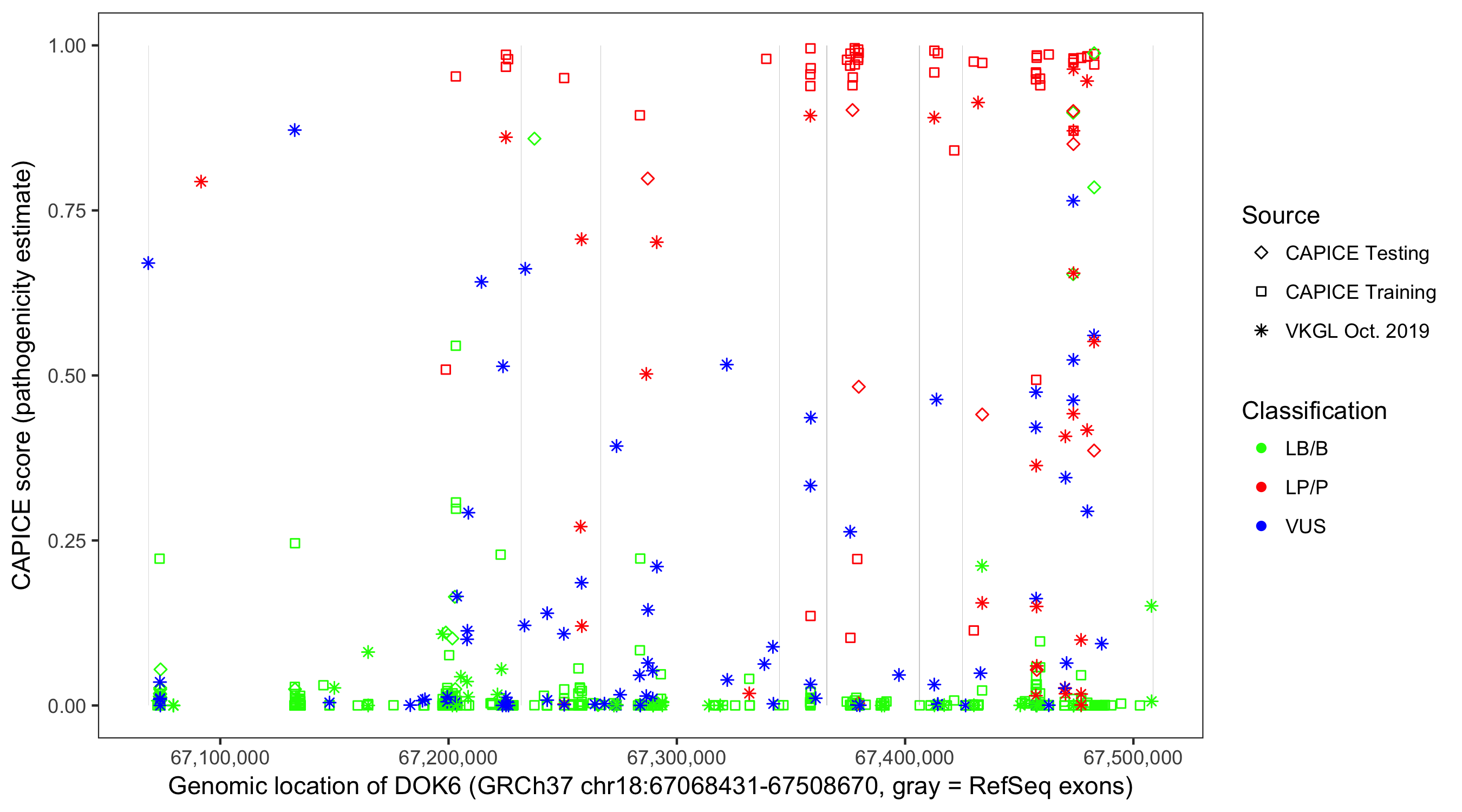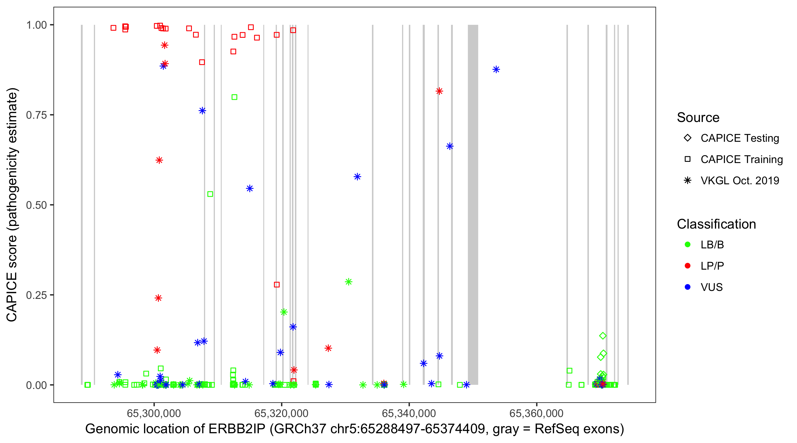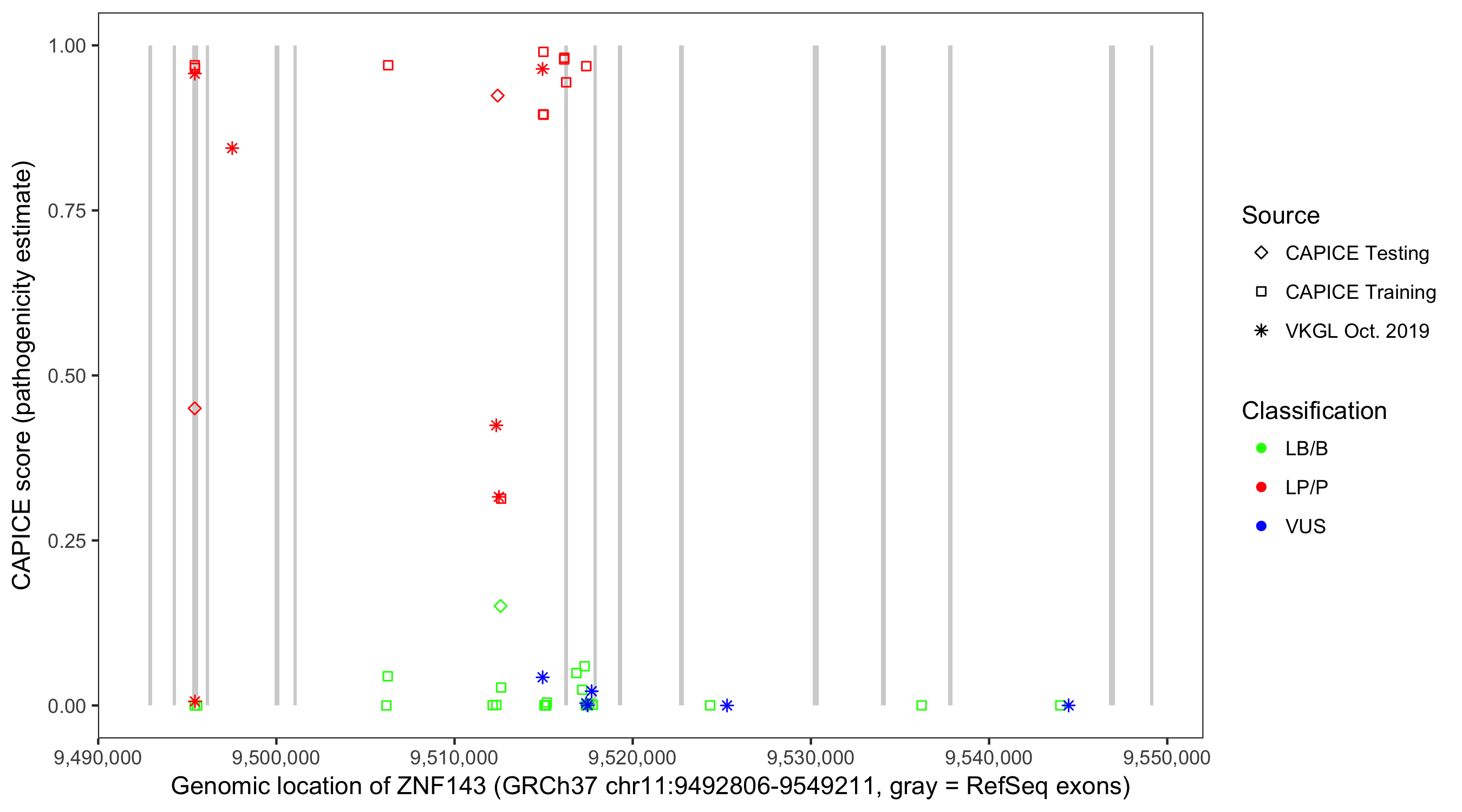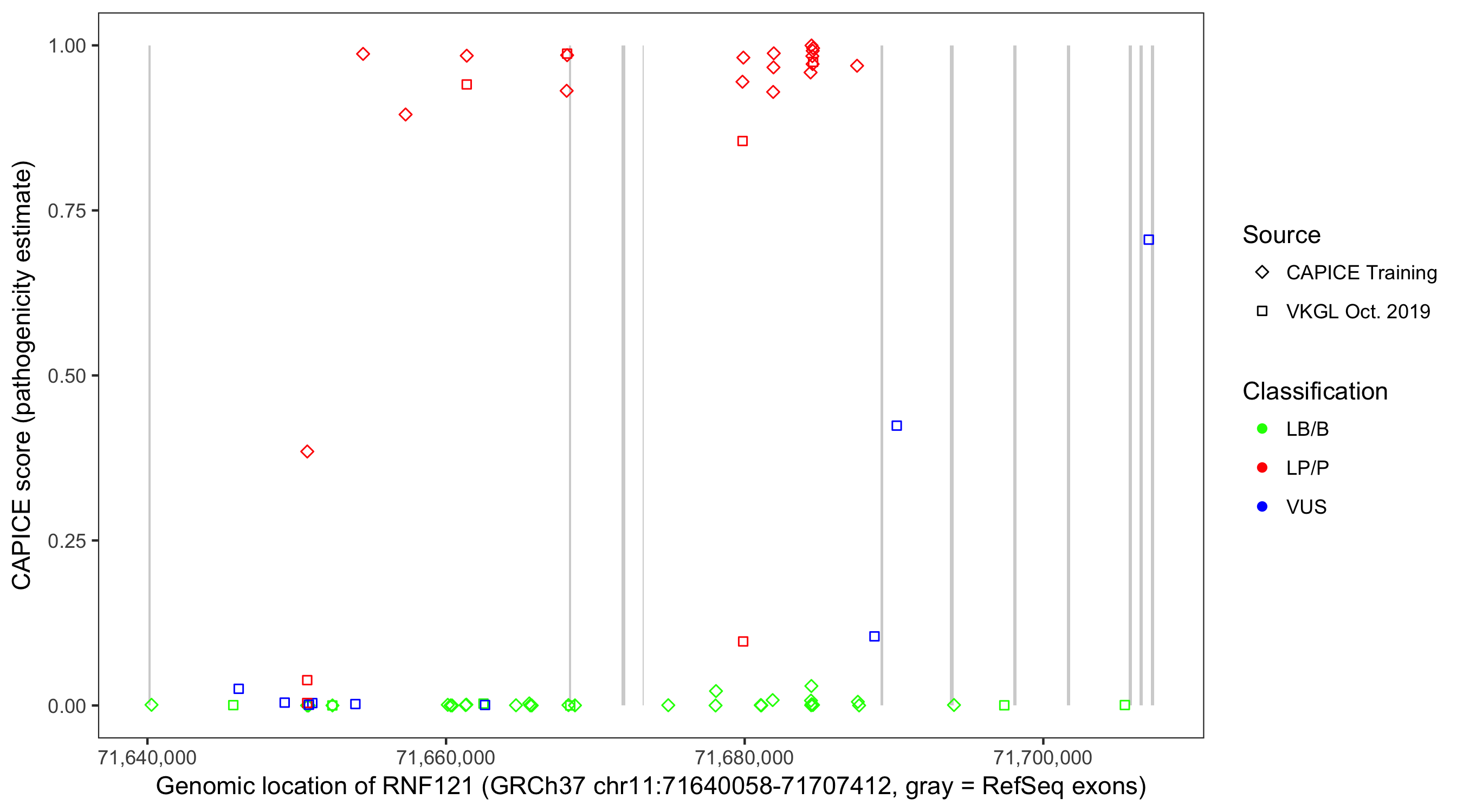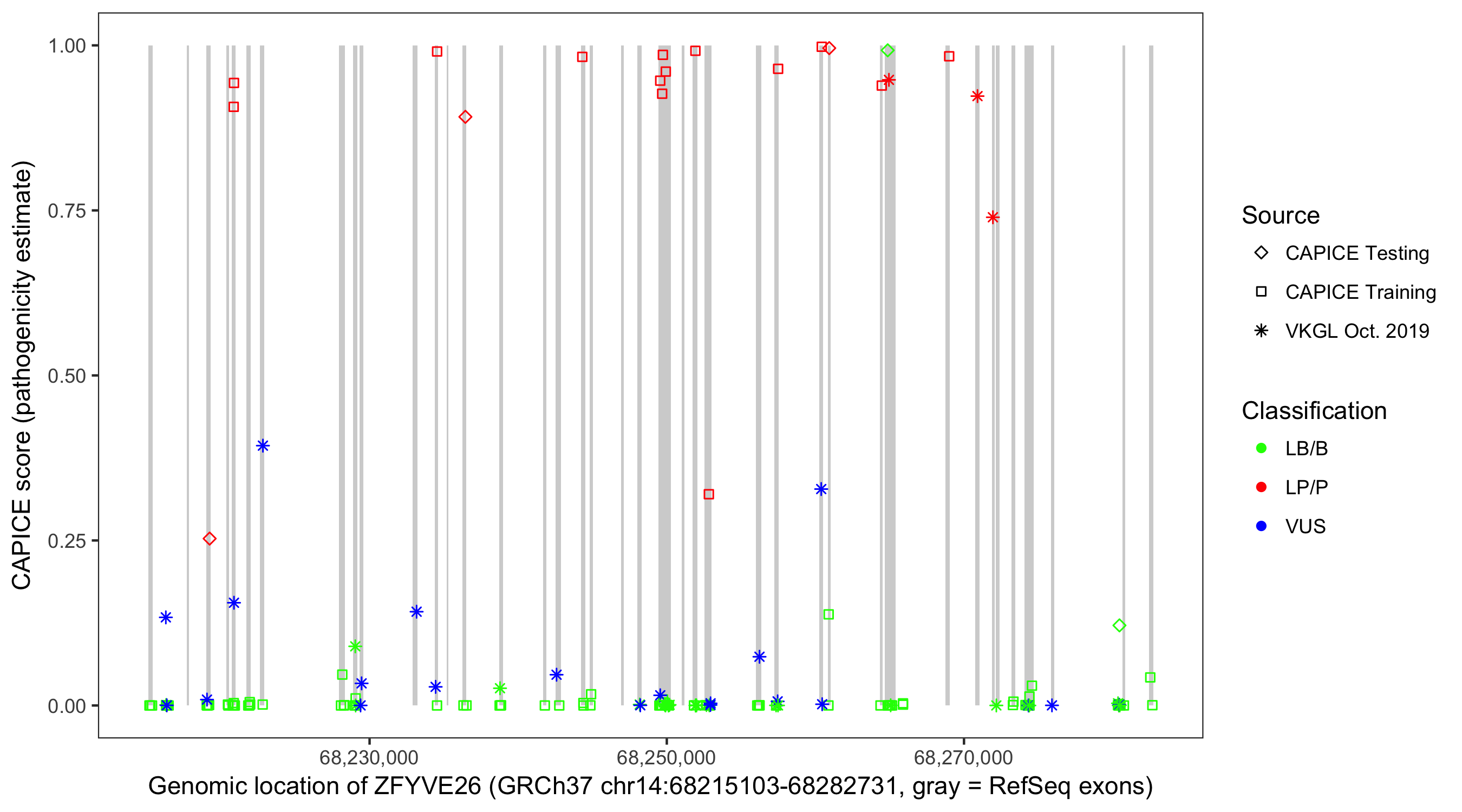 Shown are CAPICE train/test variants plus VKGL Oct 2019.