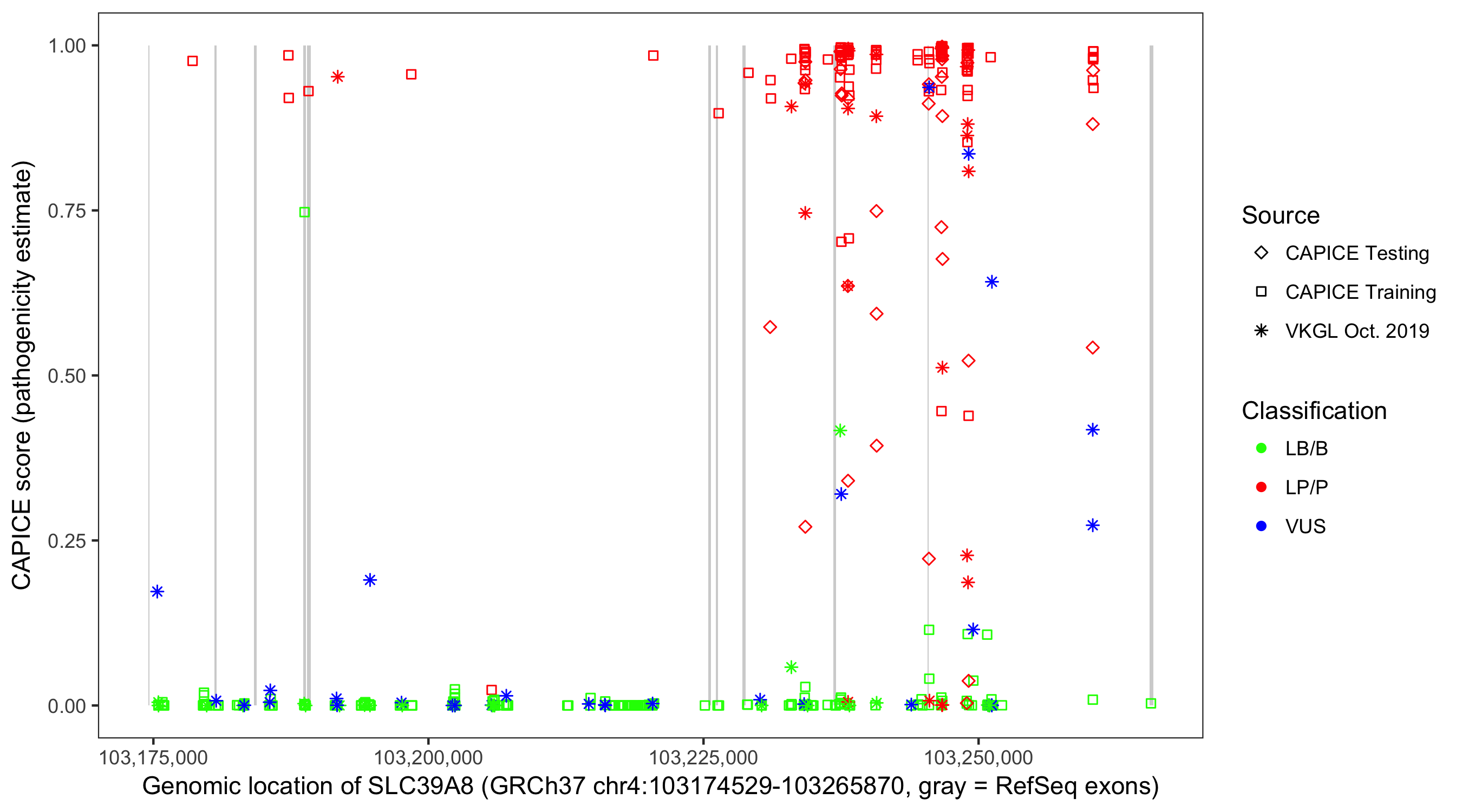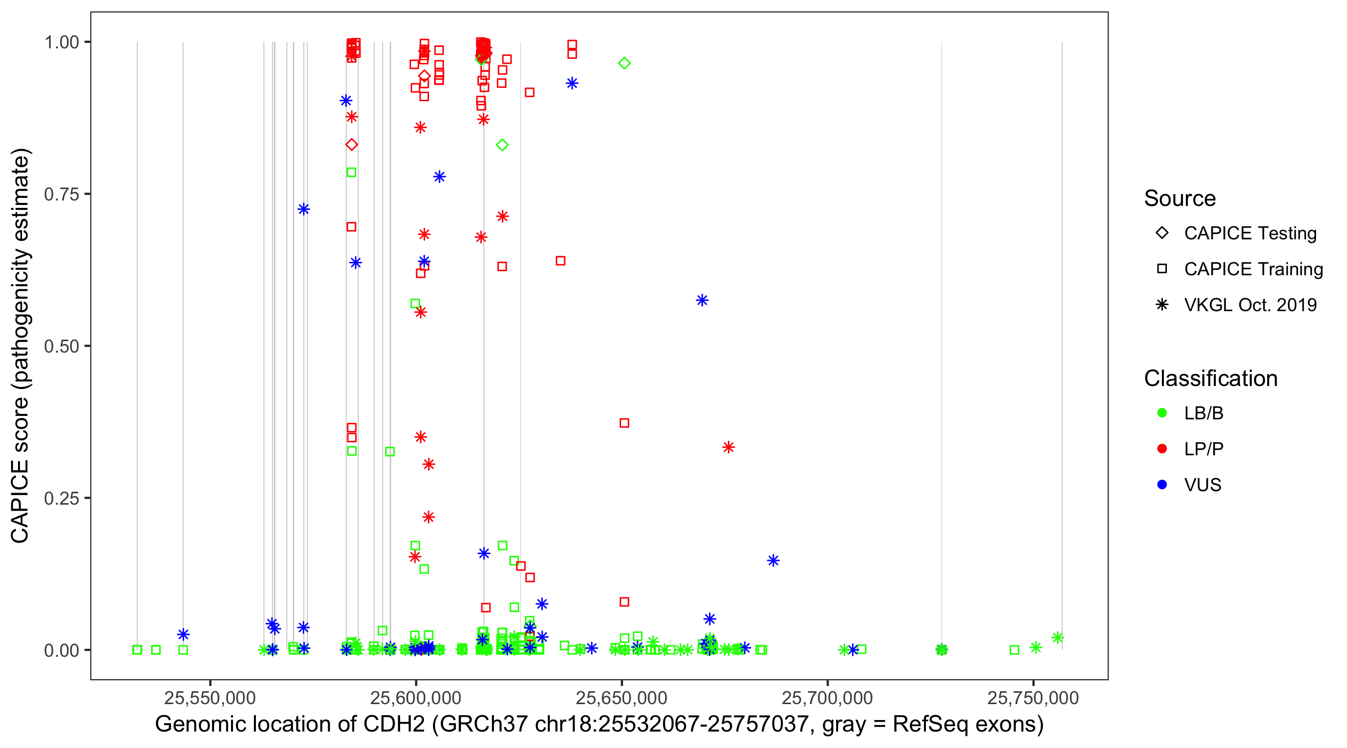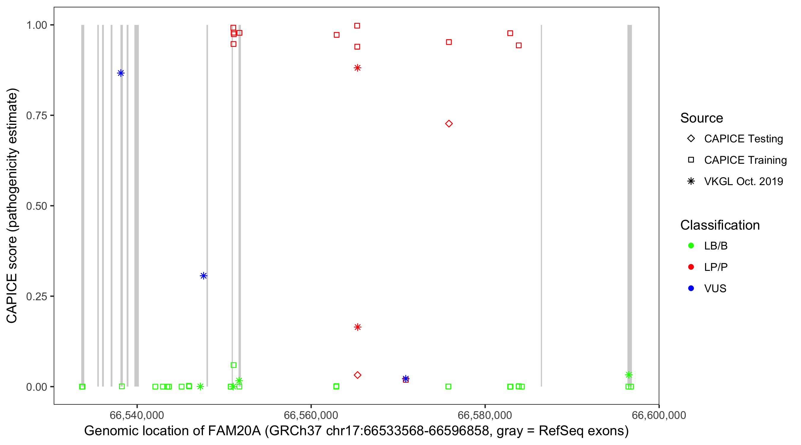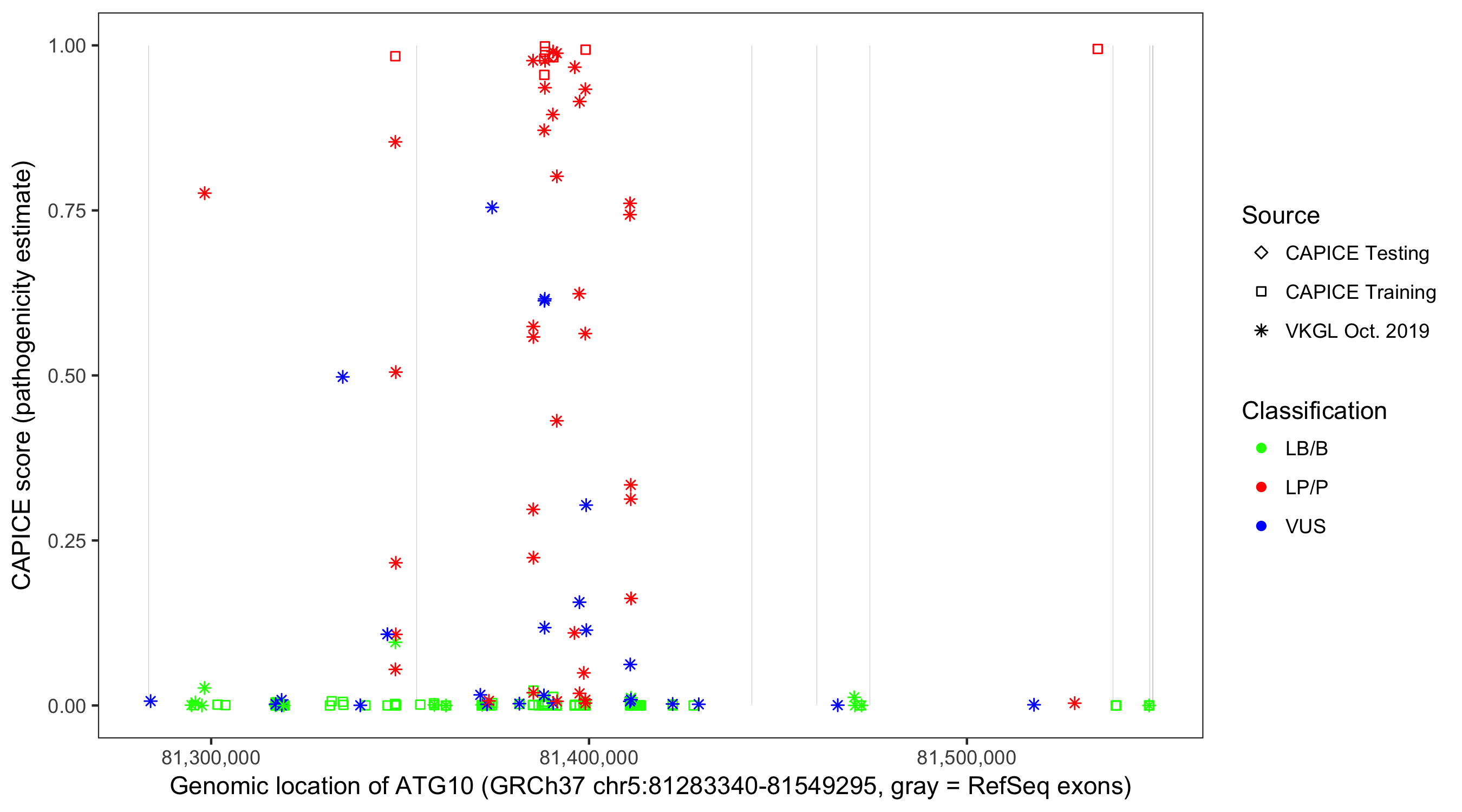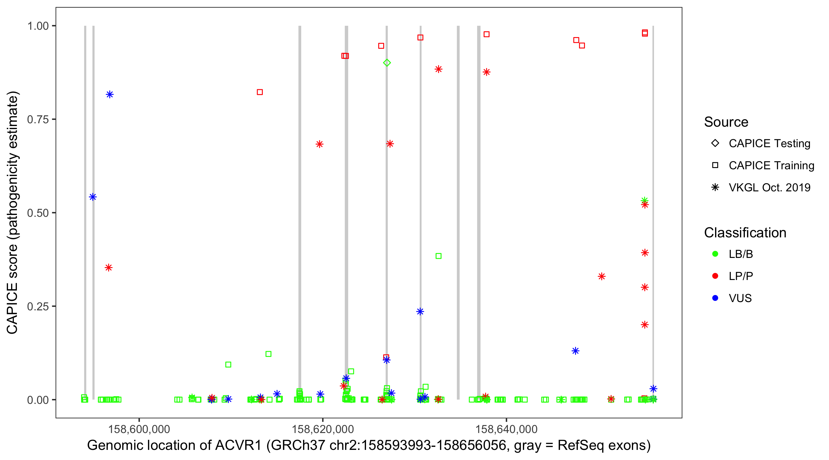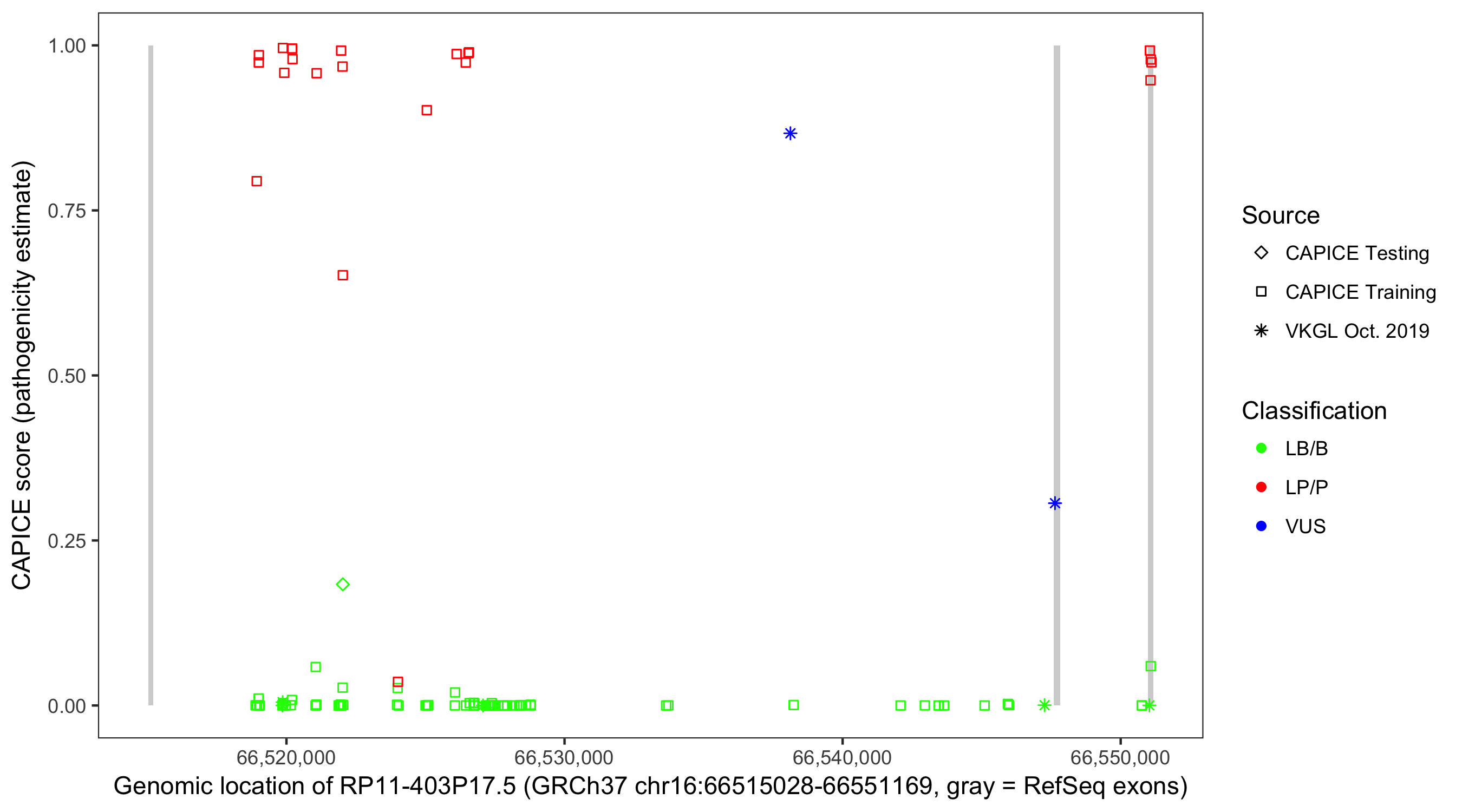 Shown are CAPICE train/test variants plus VKGL Oct 2019.