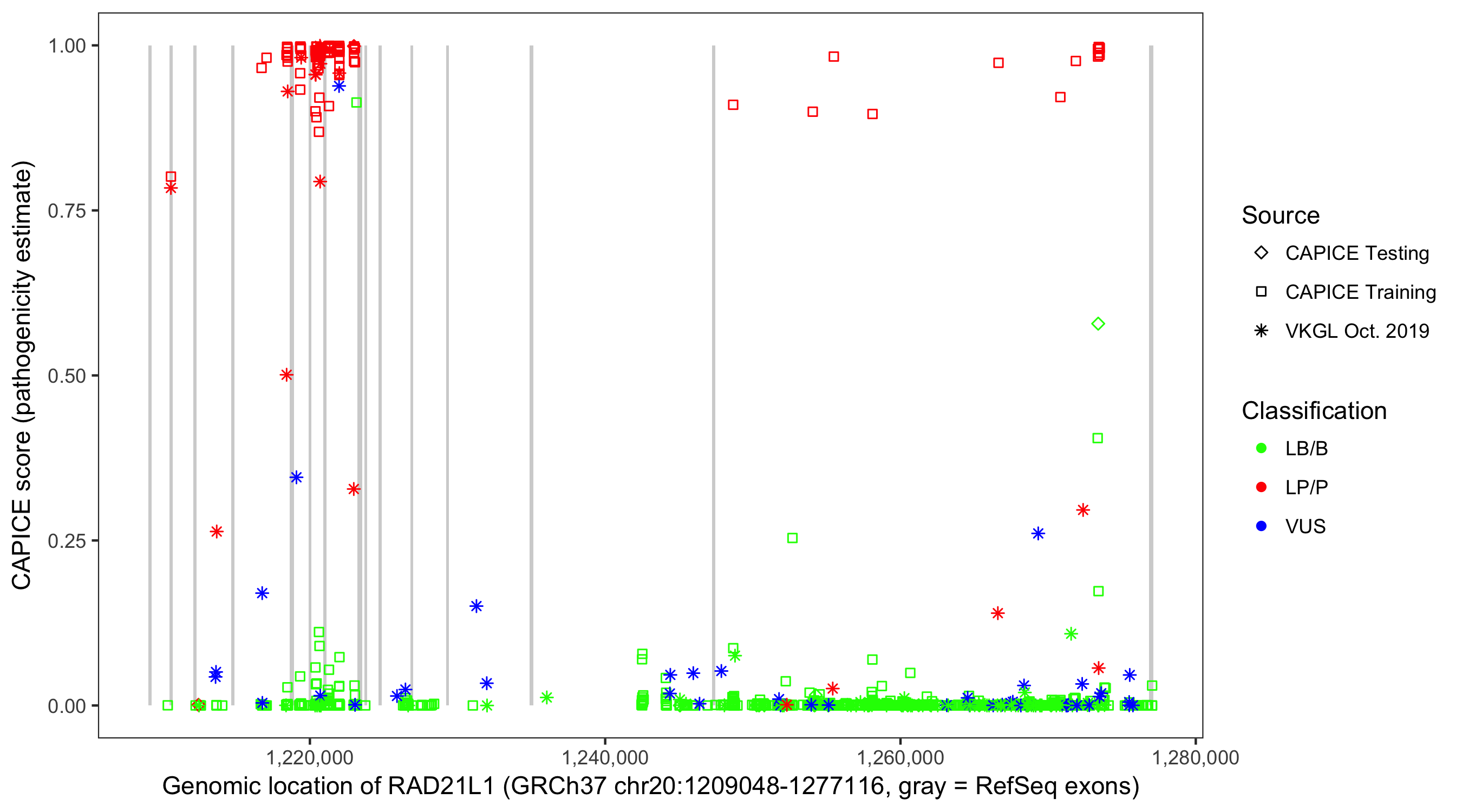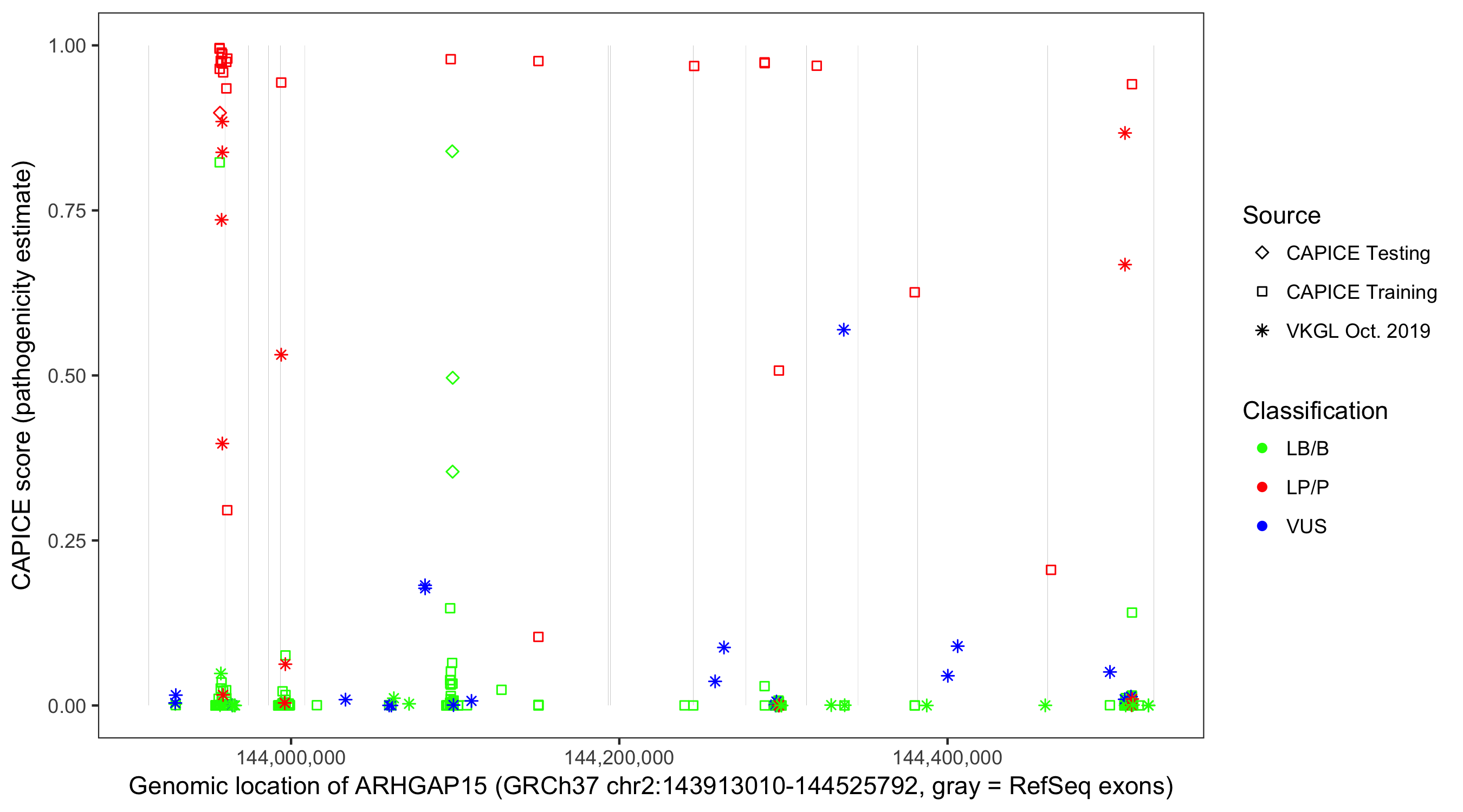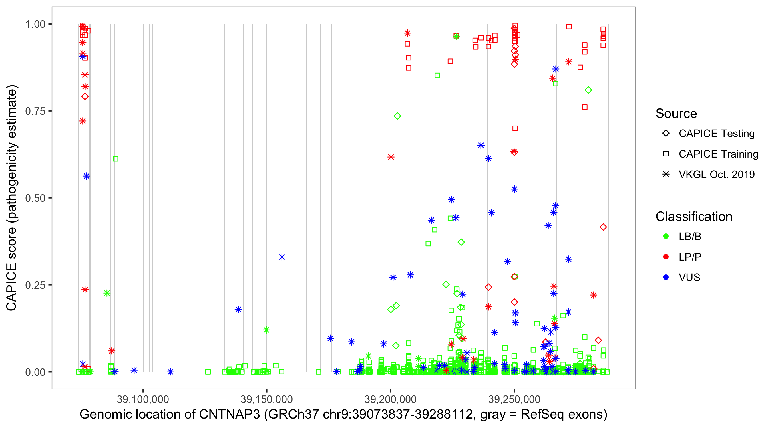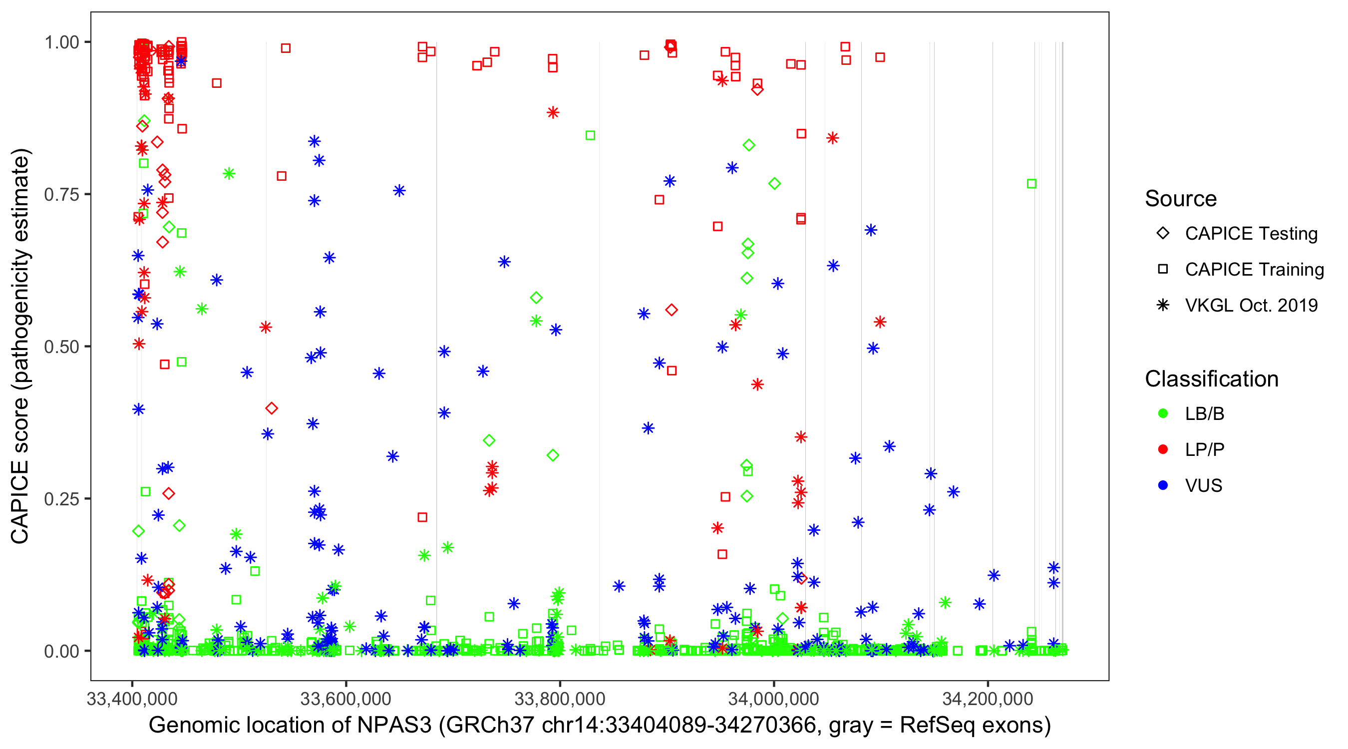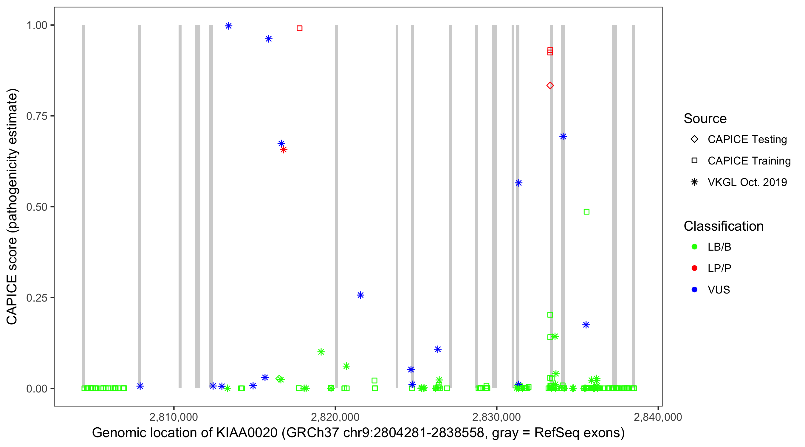 Shown are CAPICE train/test variants plus VKGL Oct 2019.