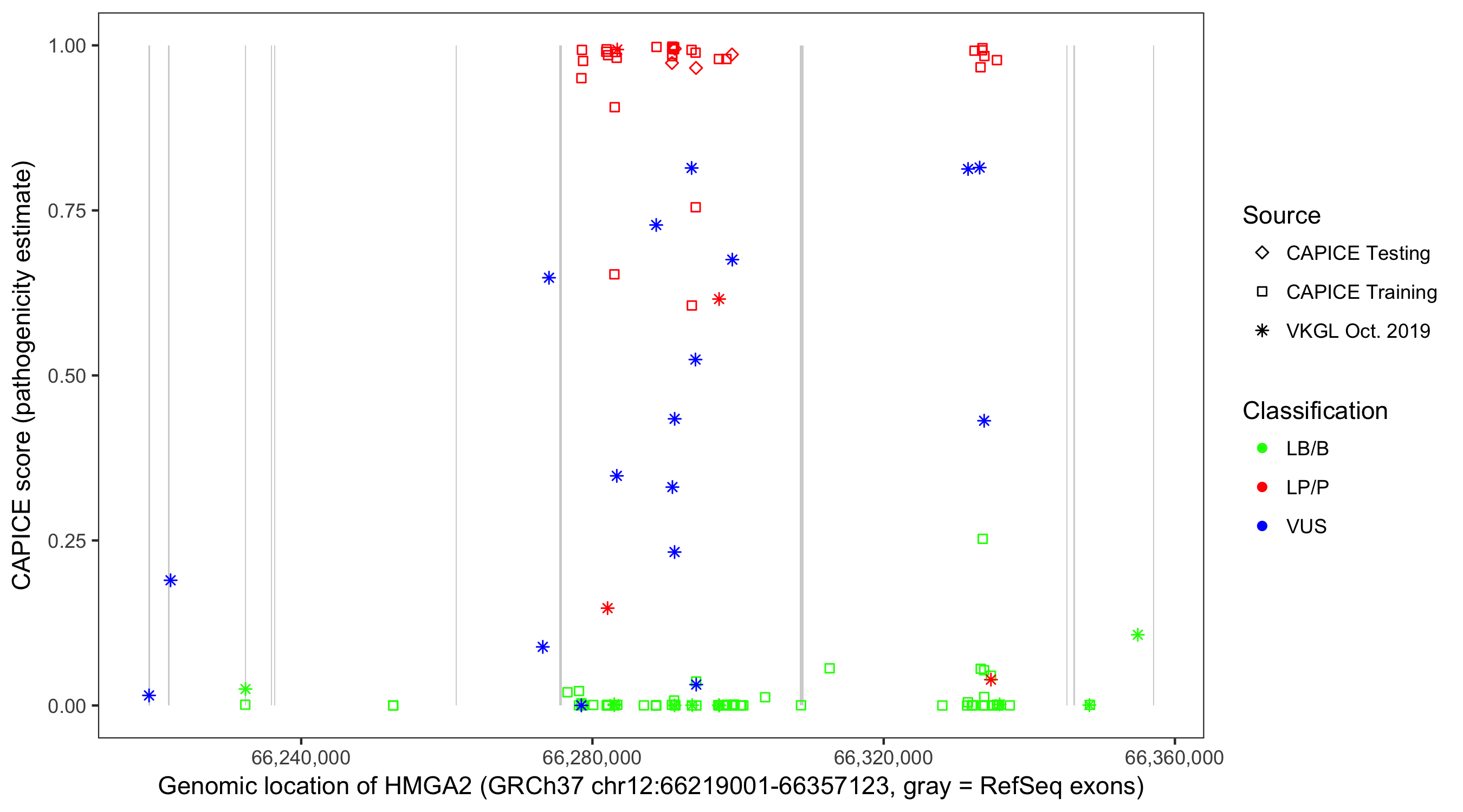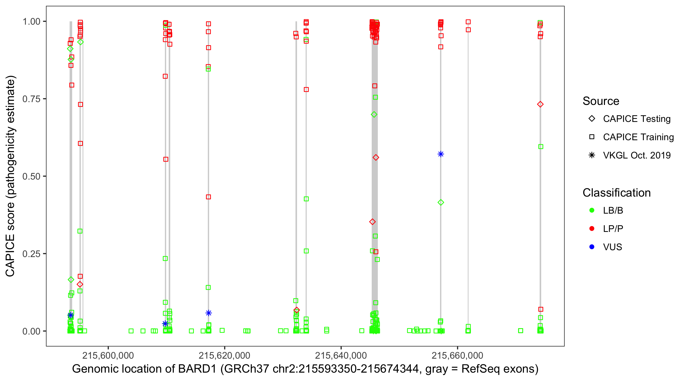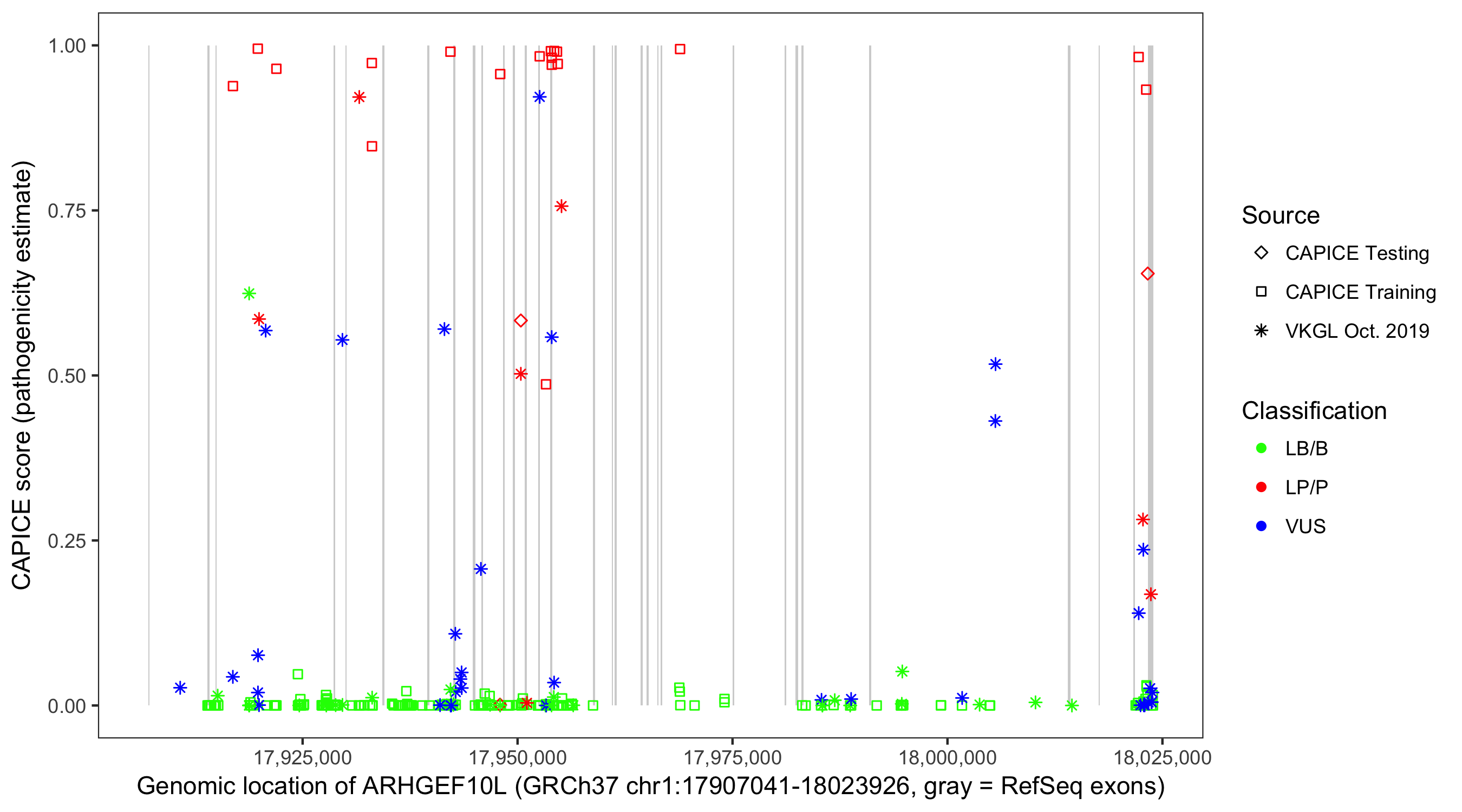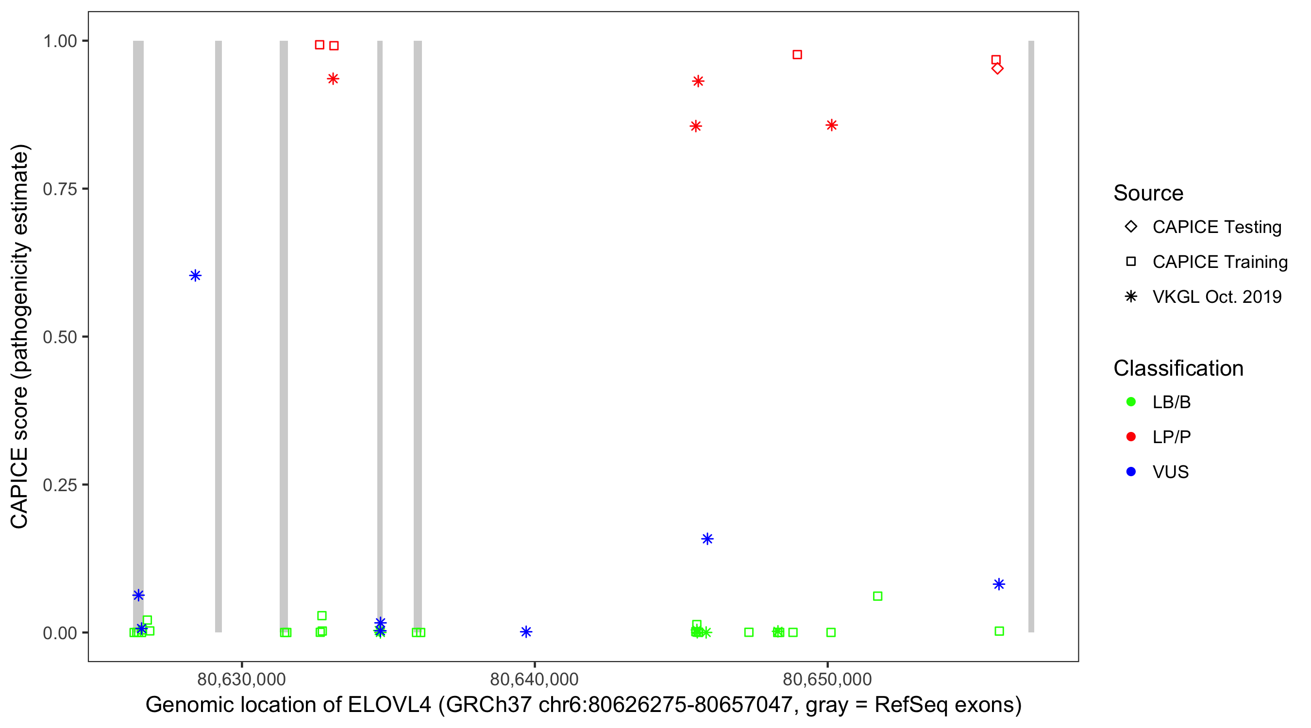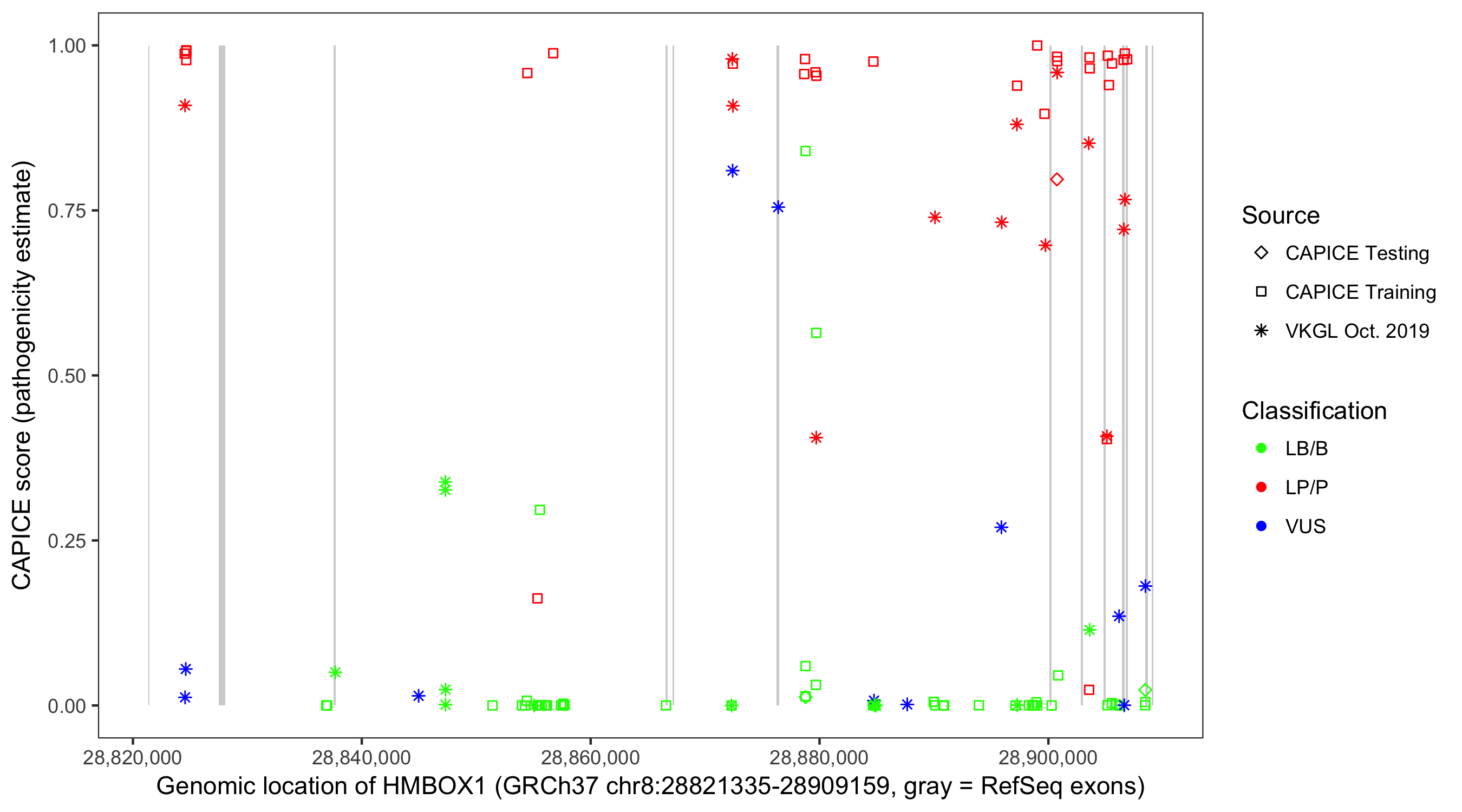 Shown are CAPICE train/test variants plus VKGL Oct 2019.
