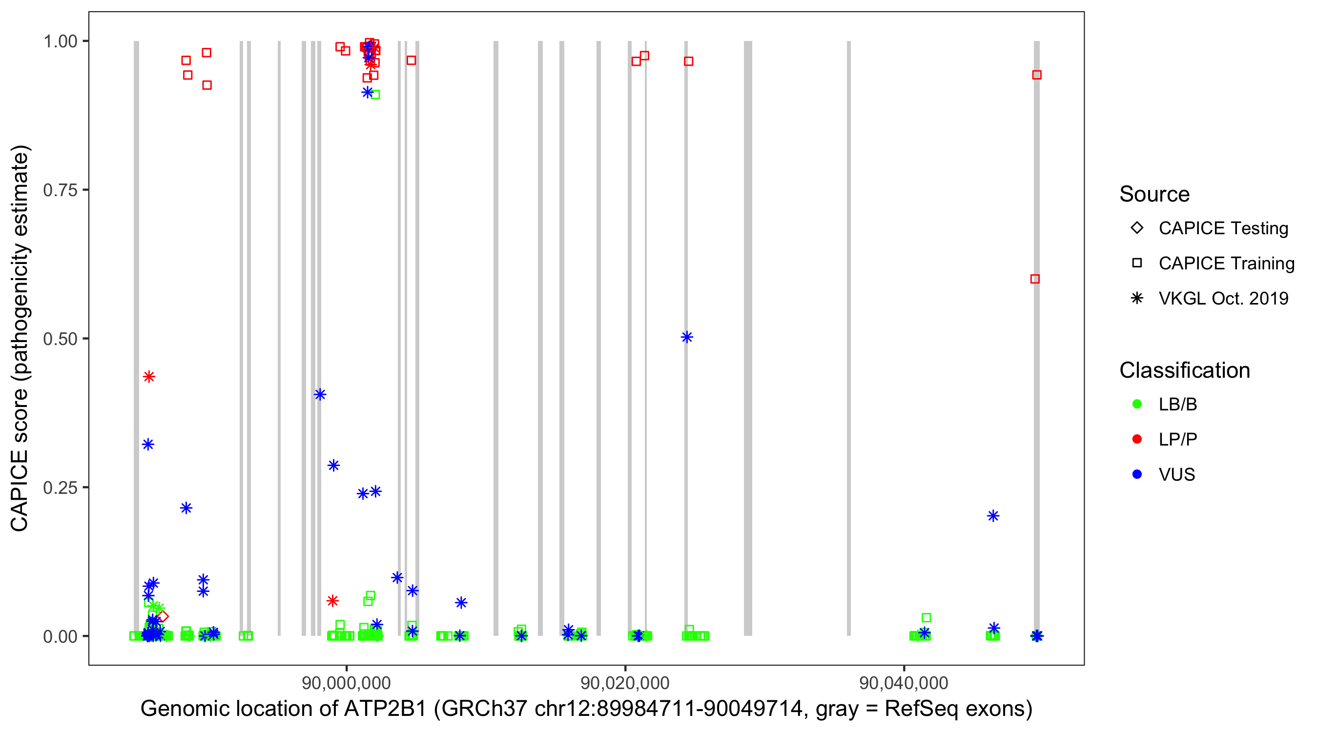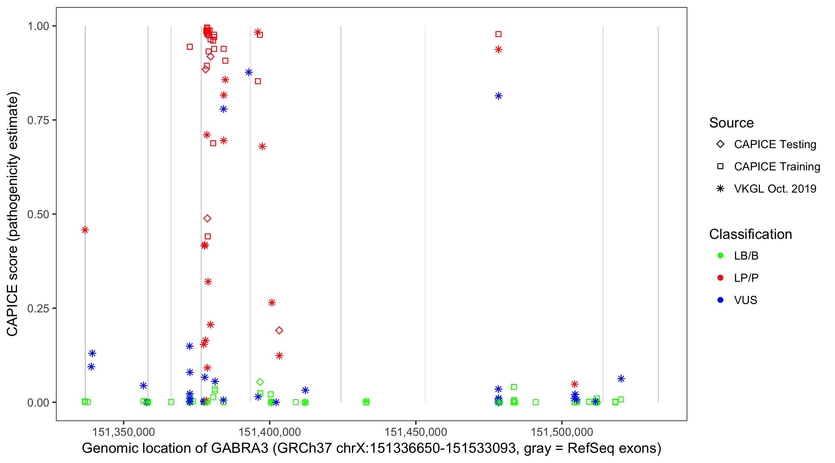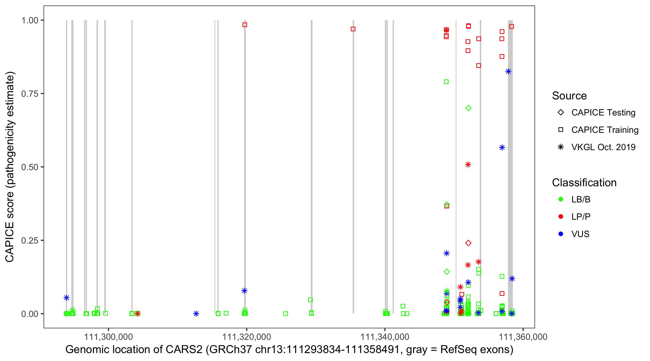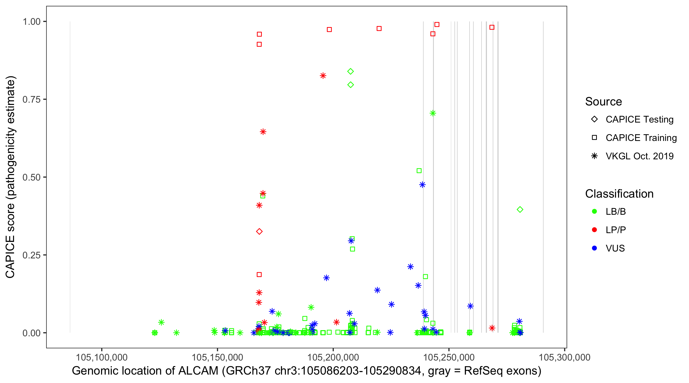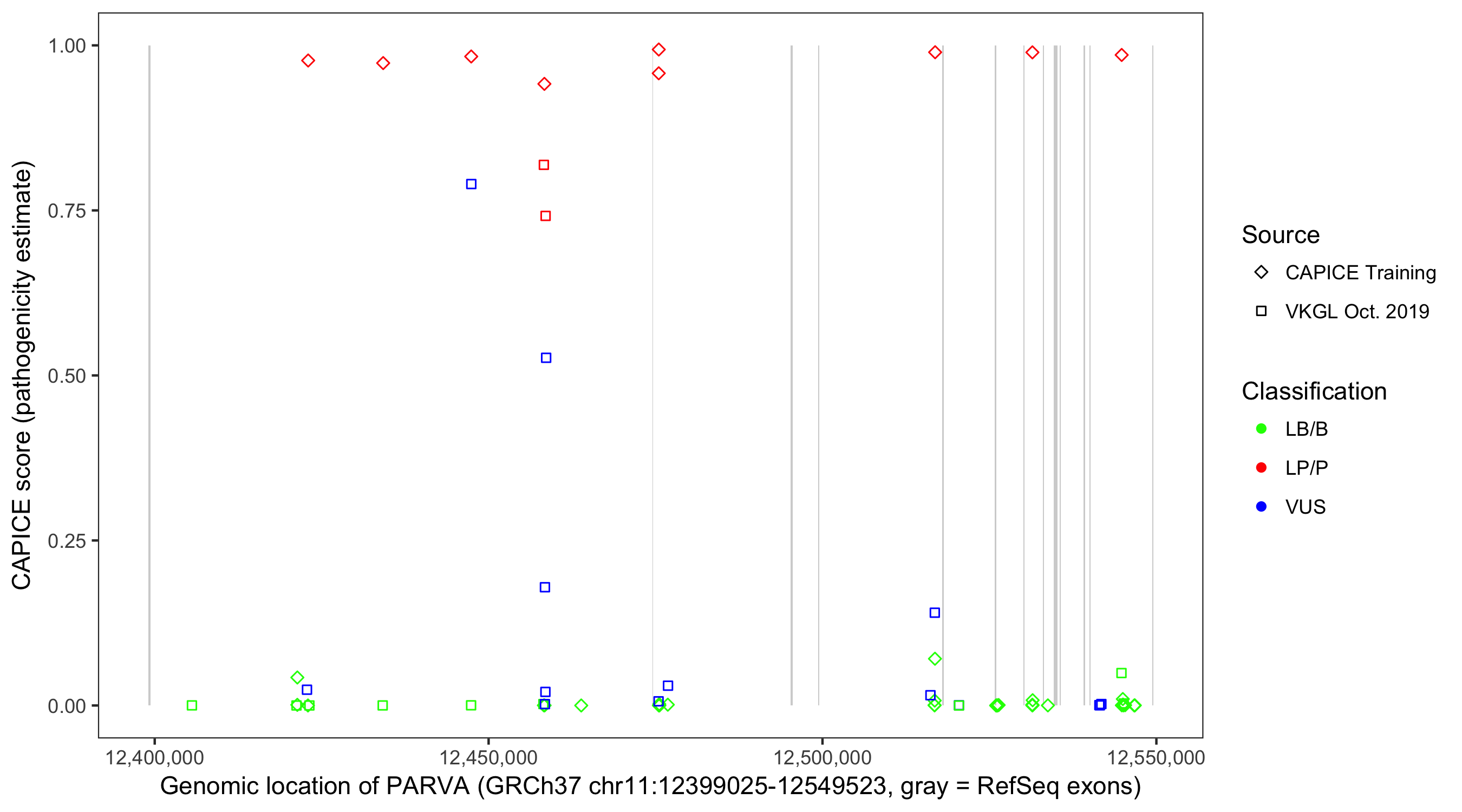 Shown are CAPICE train/test variants plus VKGL Oct 2019.