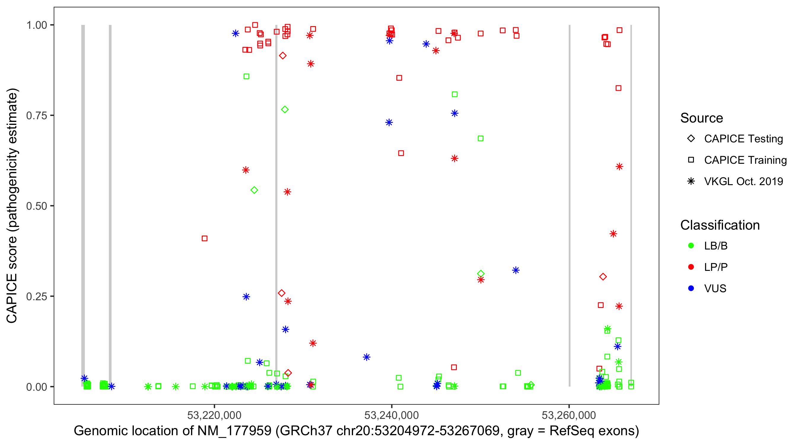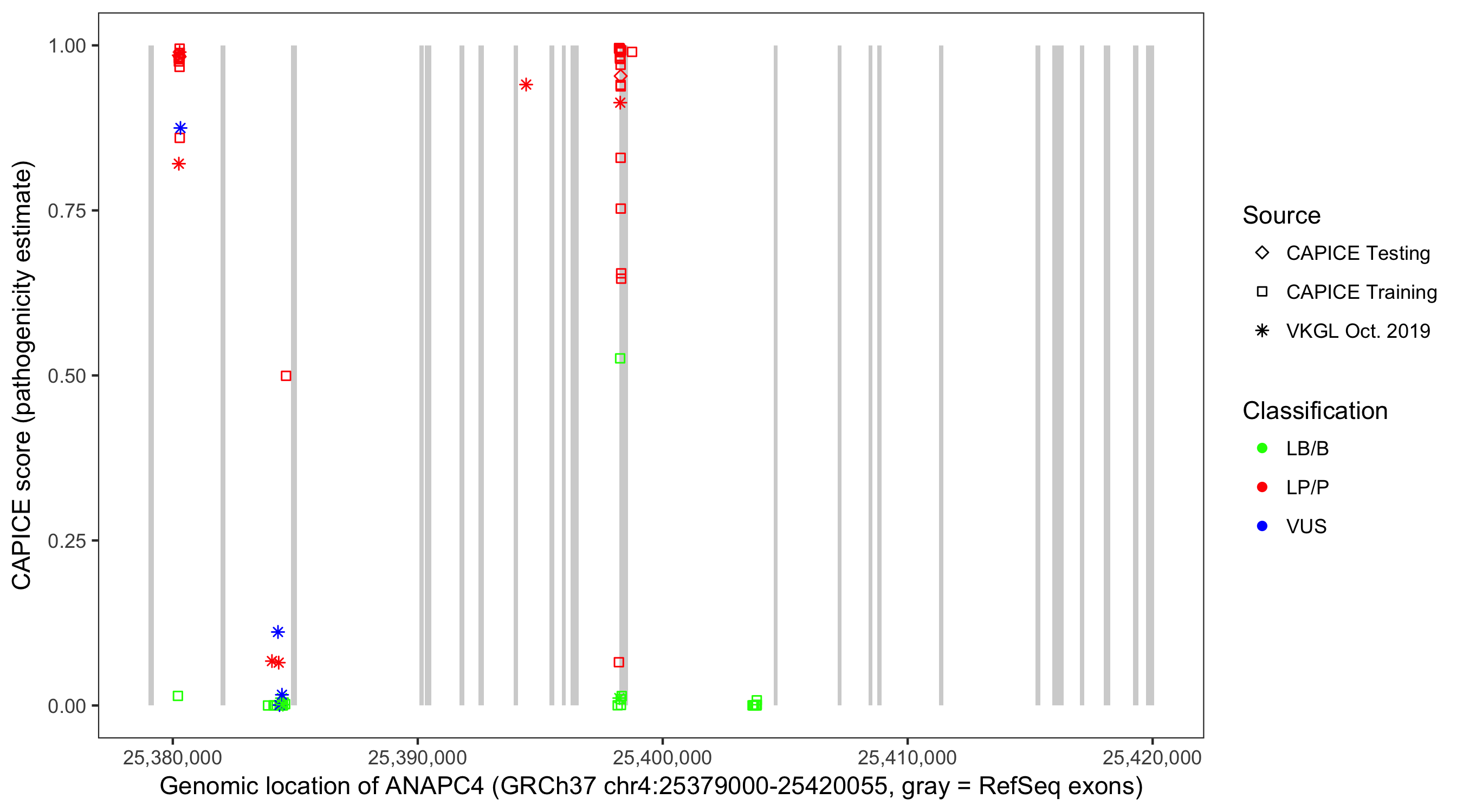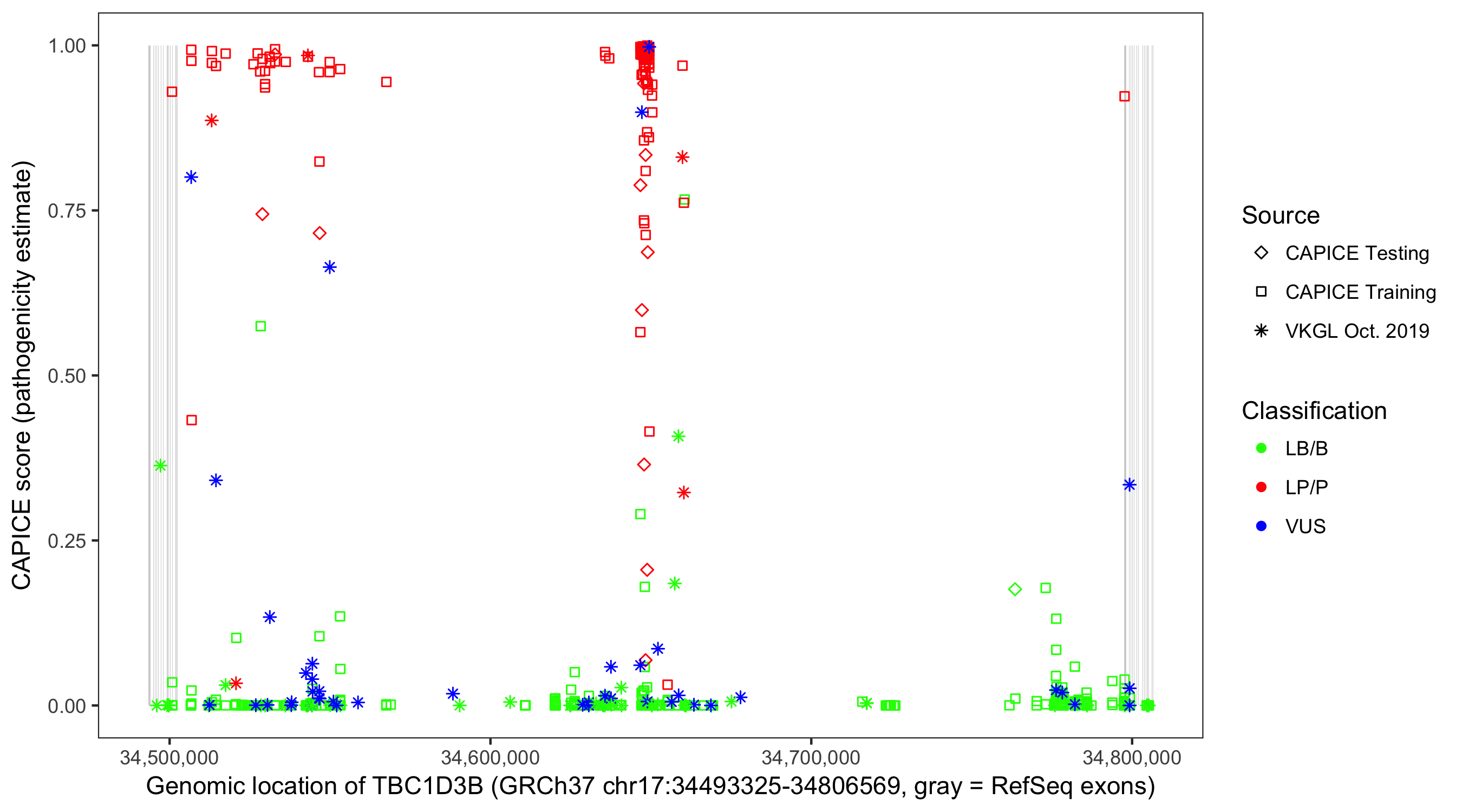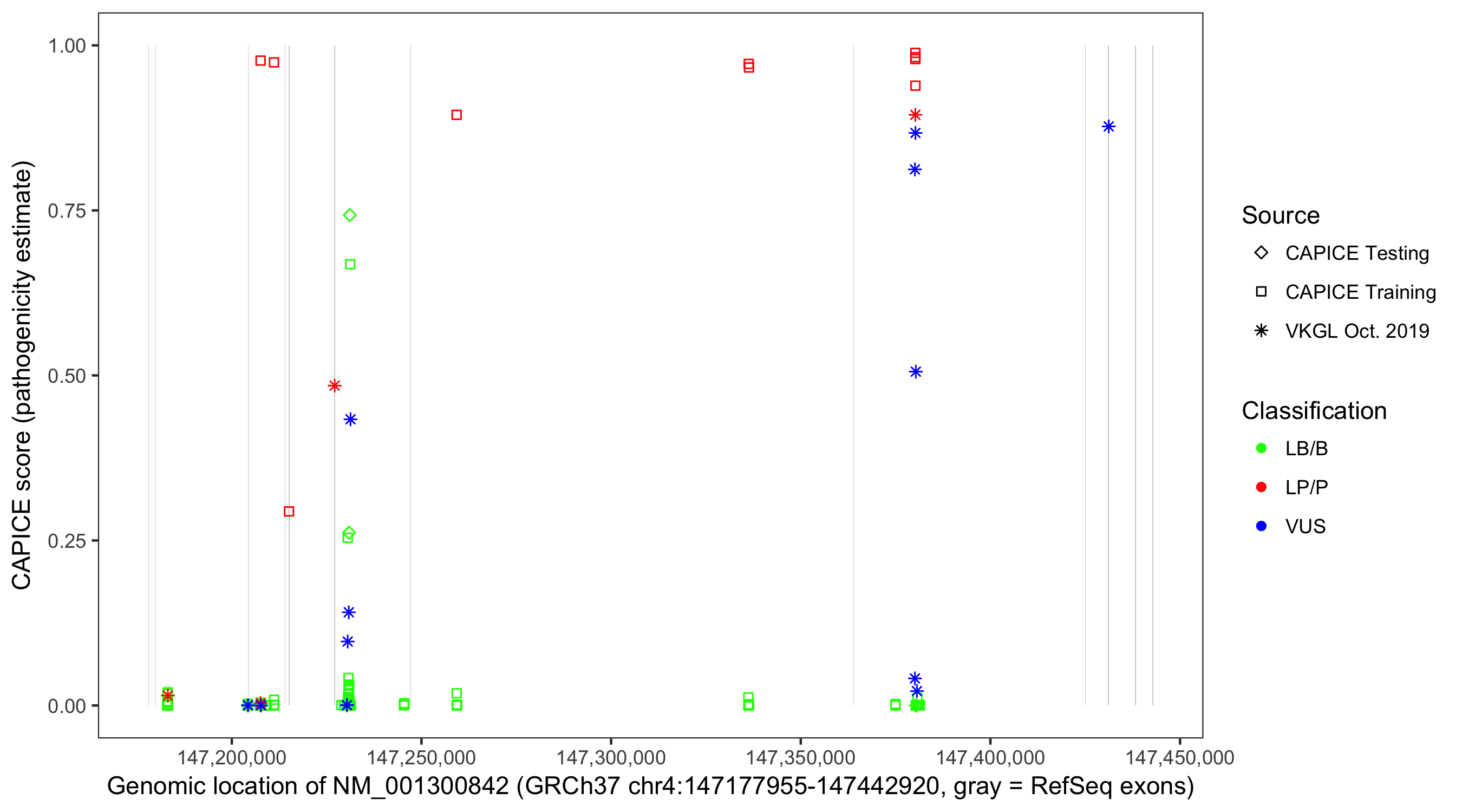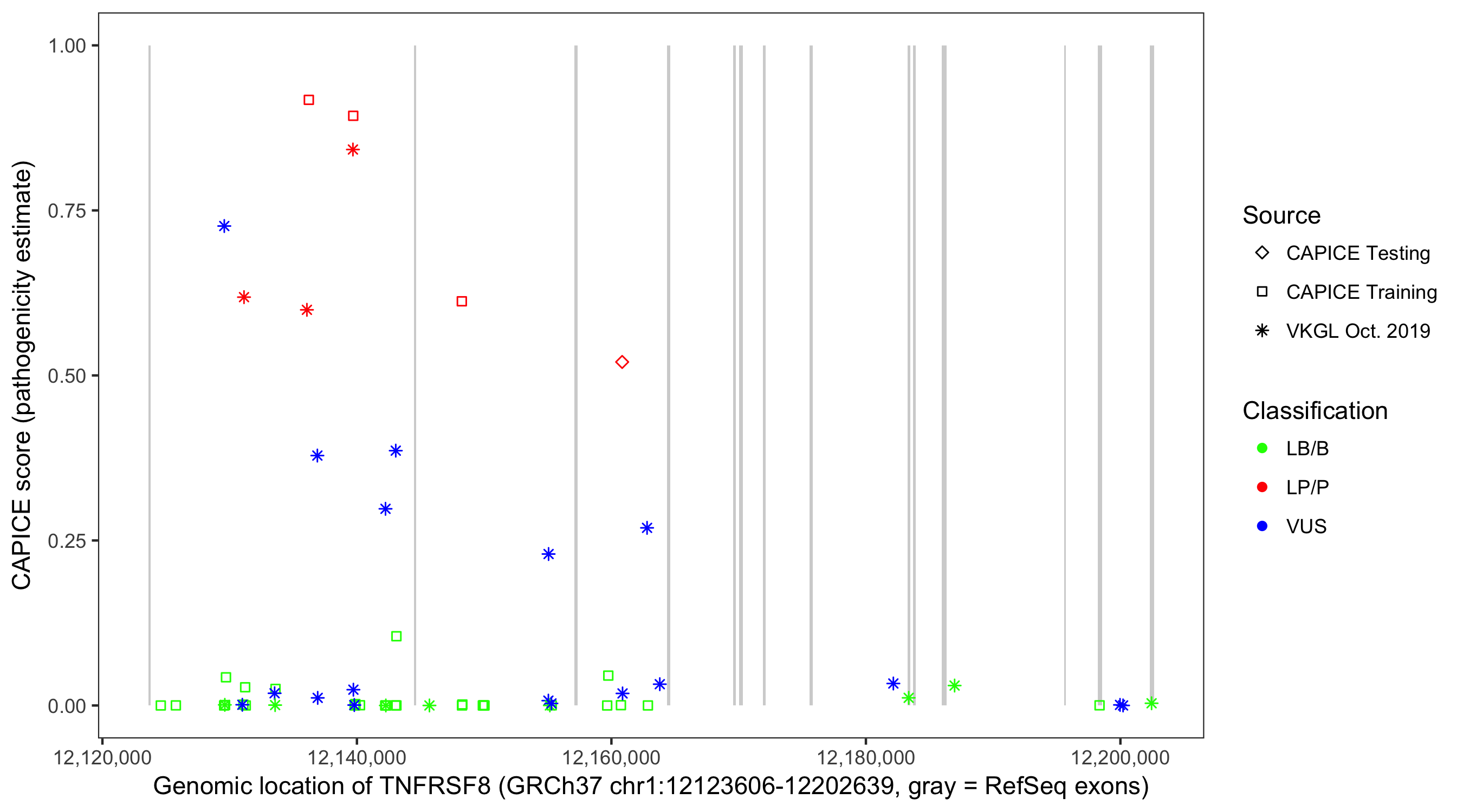 Shown are CAPICE train/test variants plus VKGL Oct 2019.