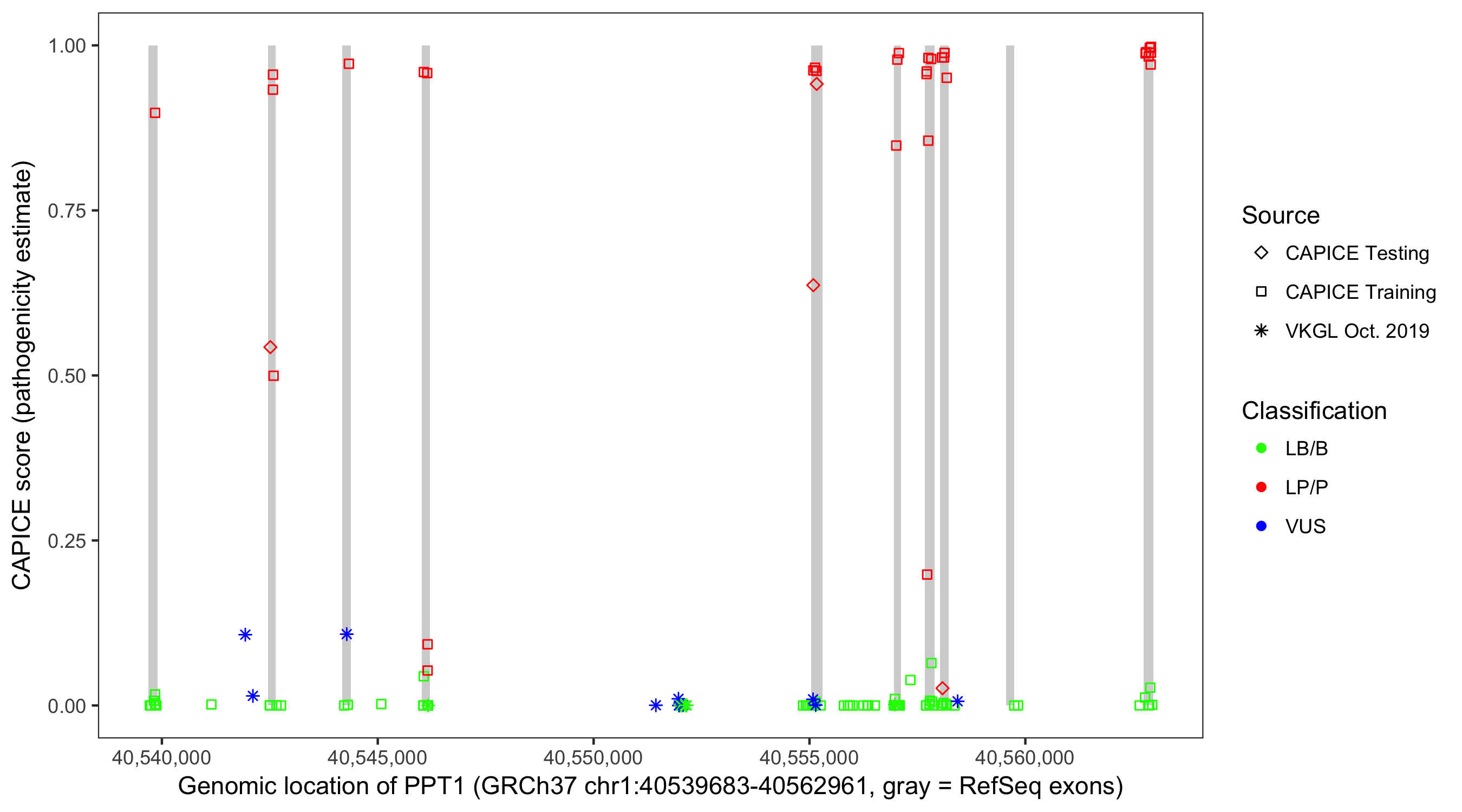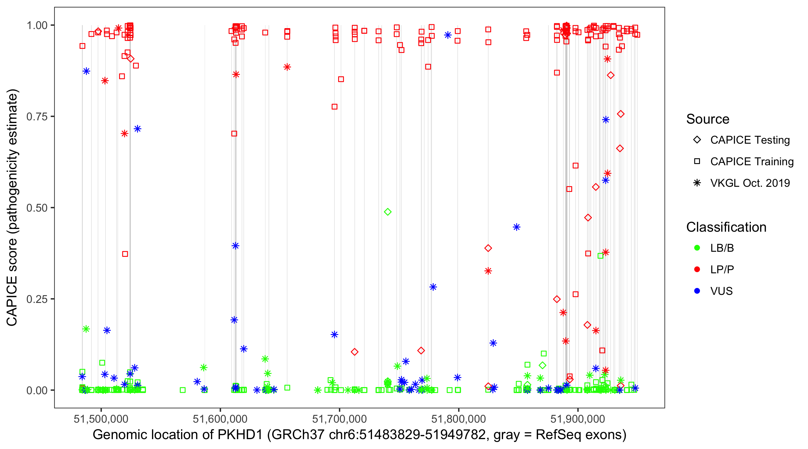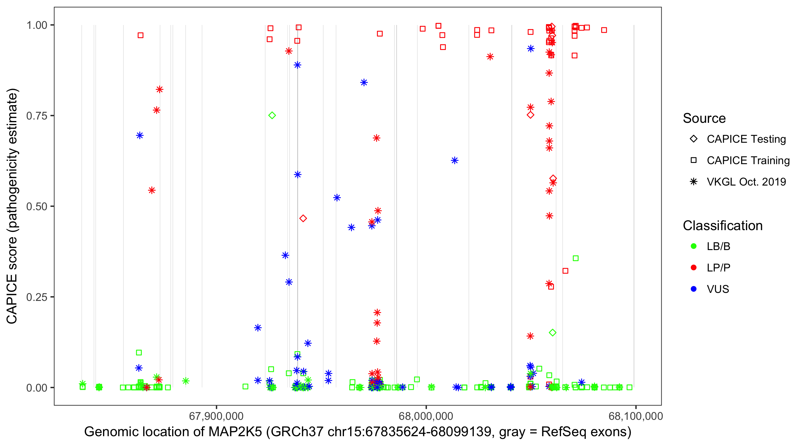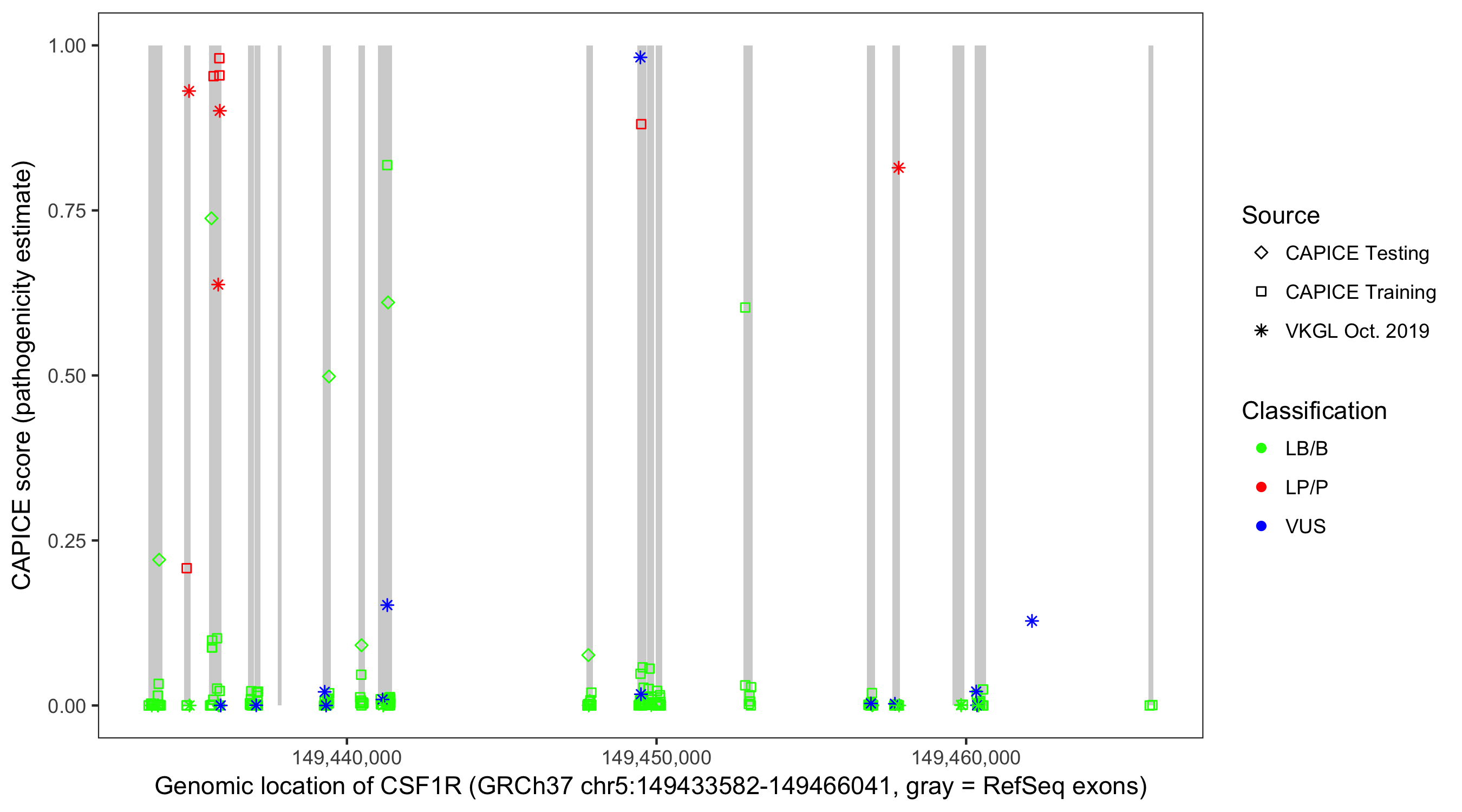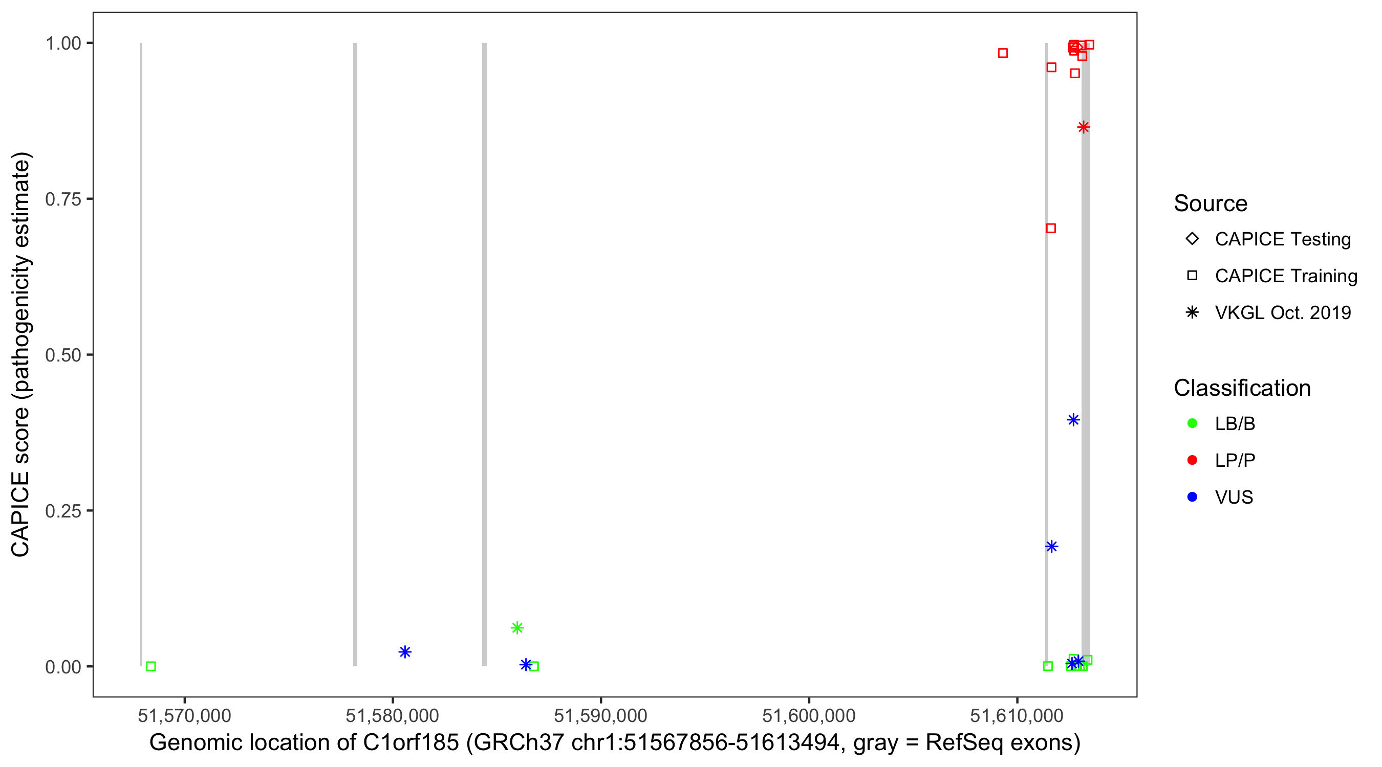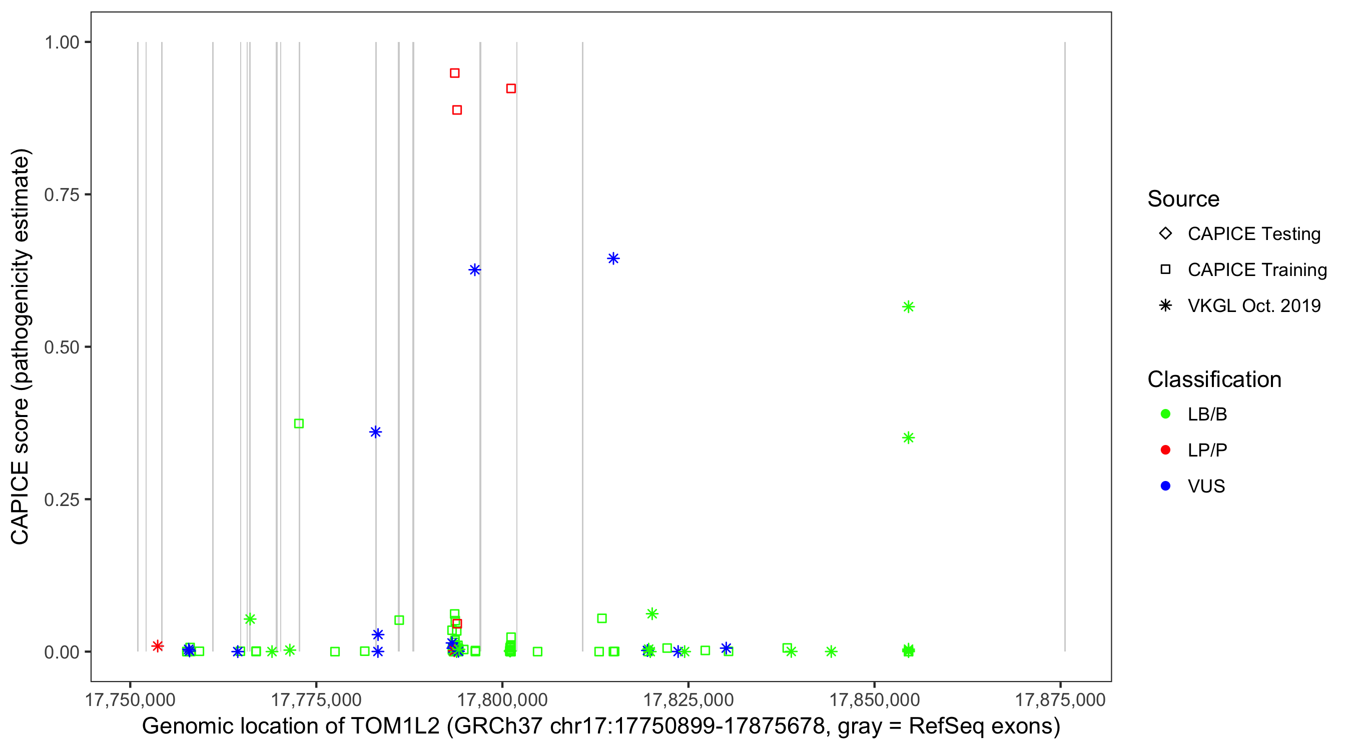 Shown are CAPICE train/test variants plus VKGL Oct 2019.