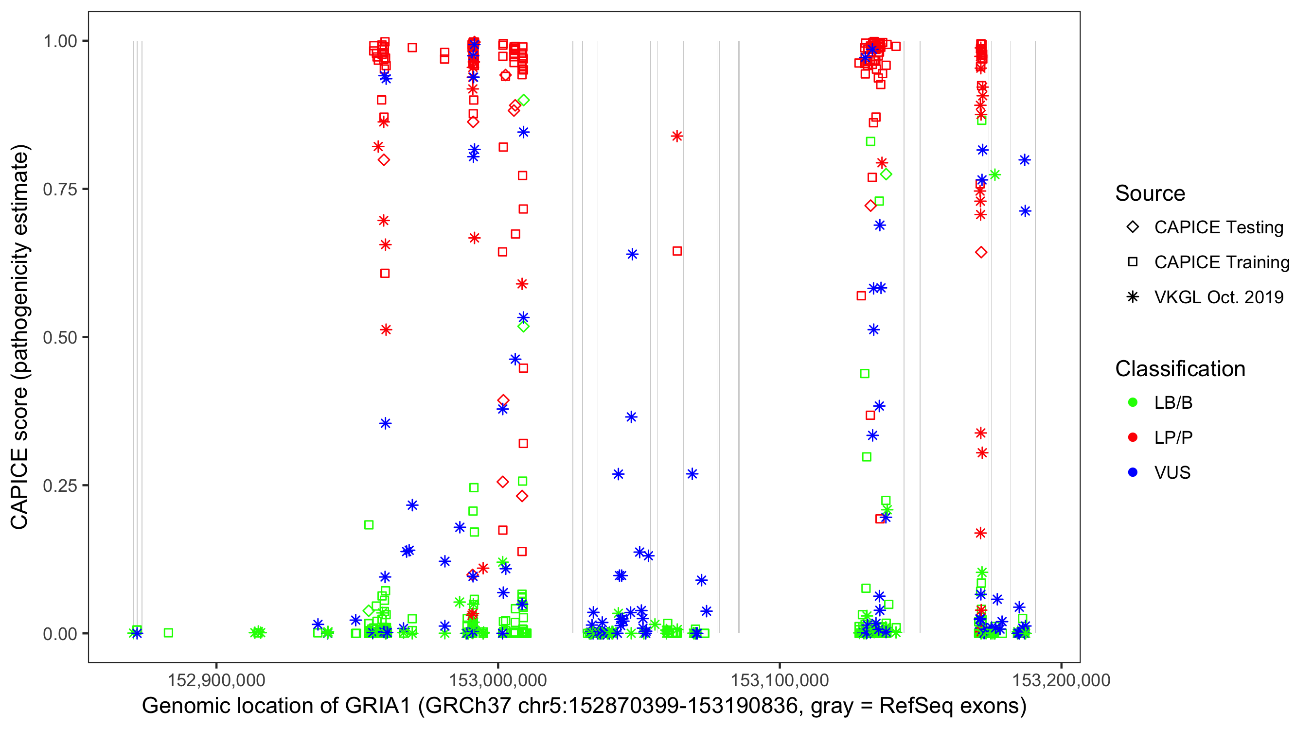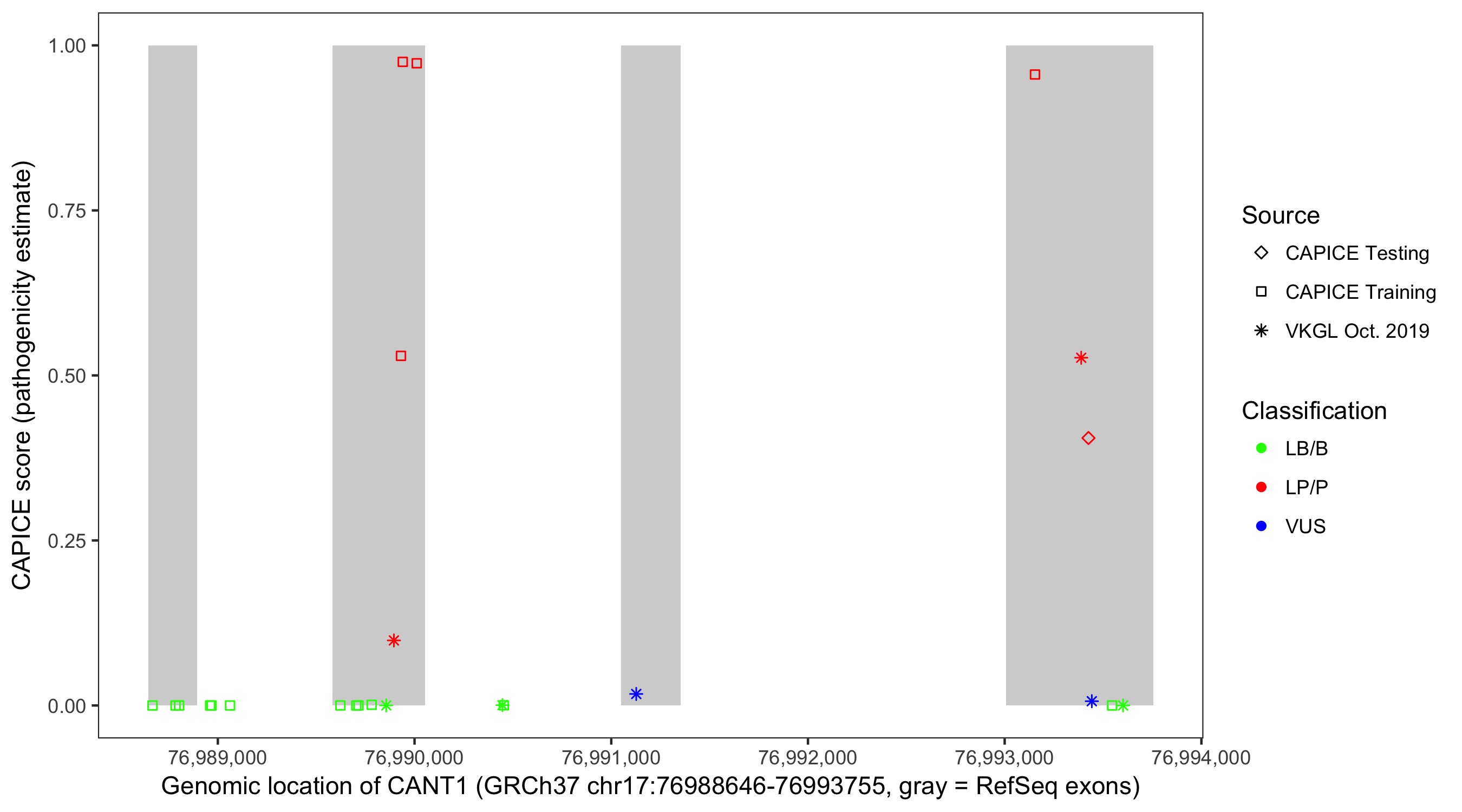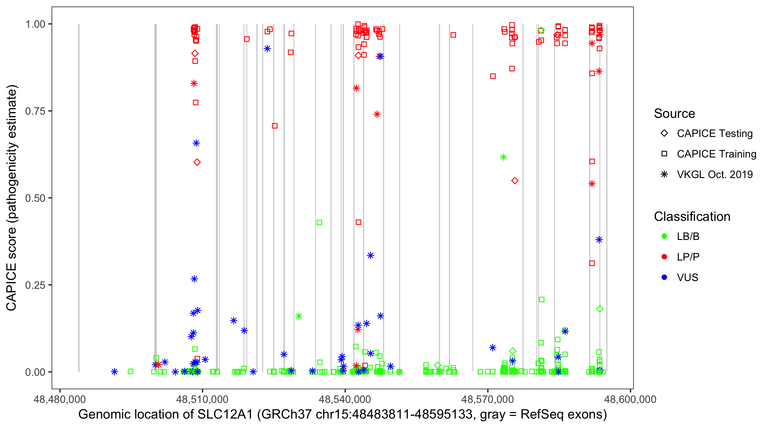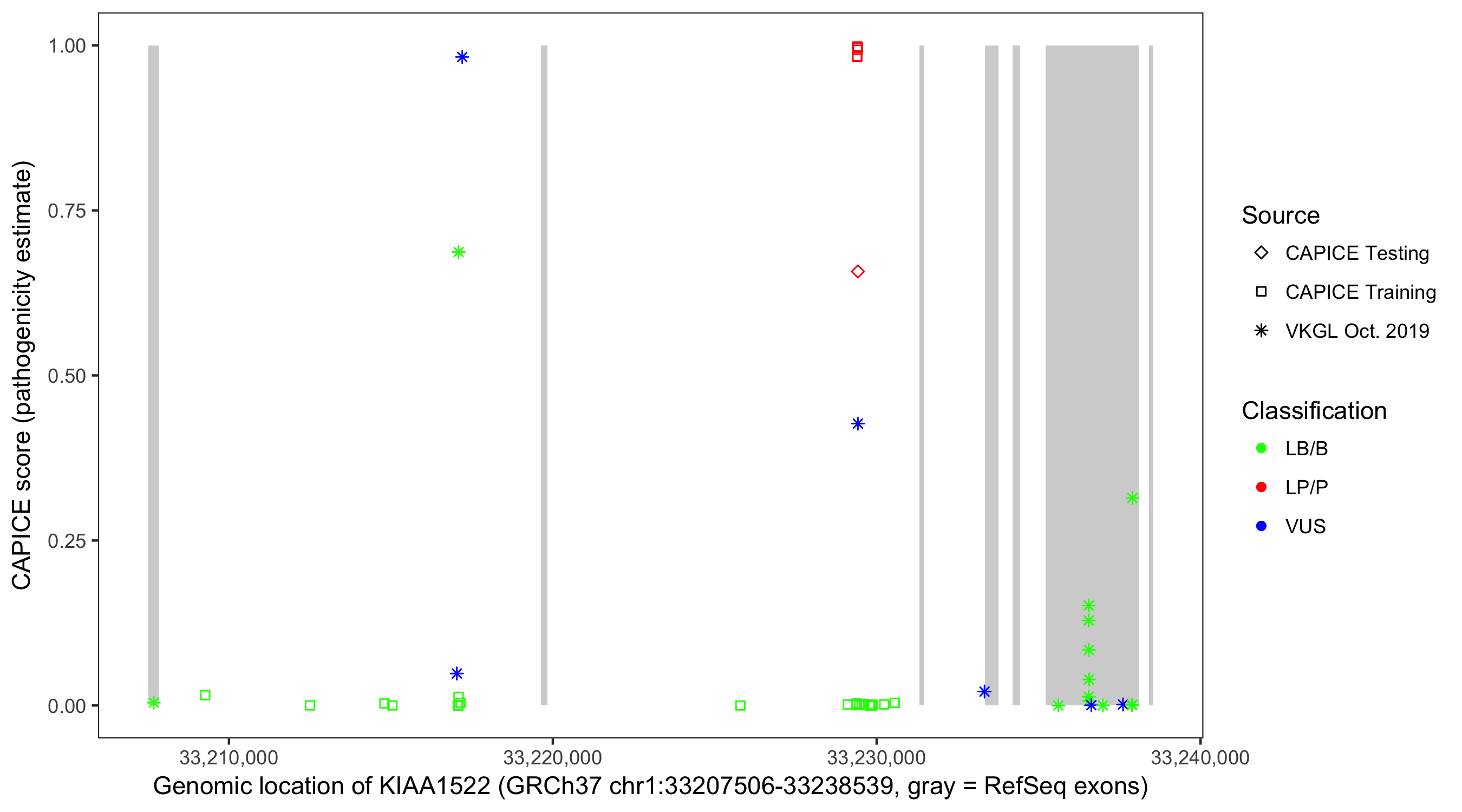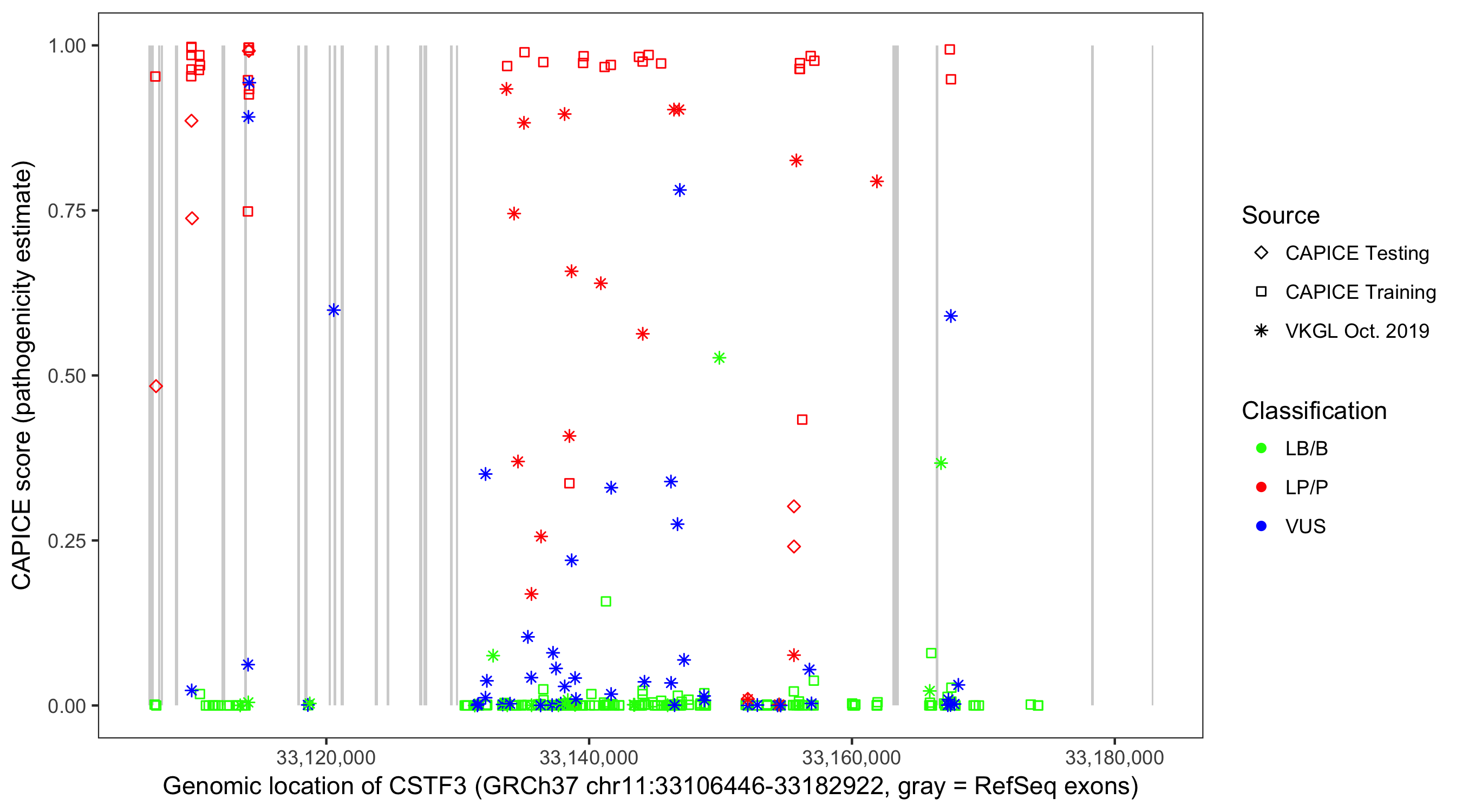 Shown are CAPICE train/test variants plus VKGL Oct 2019.
