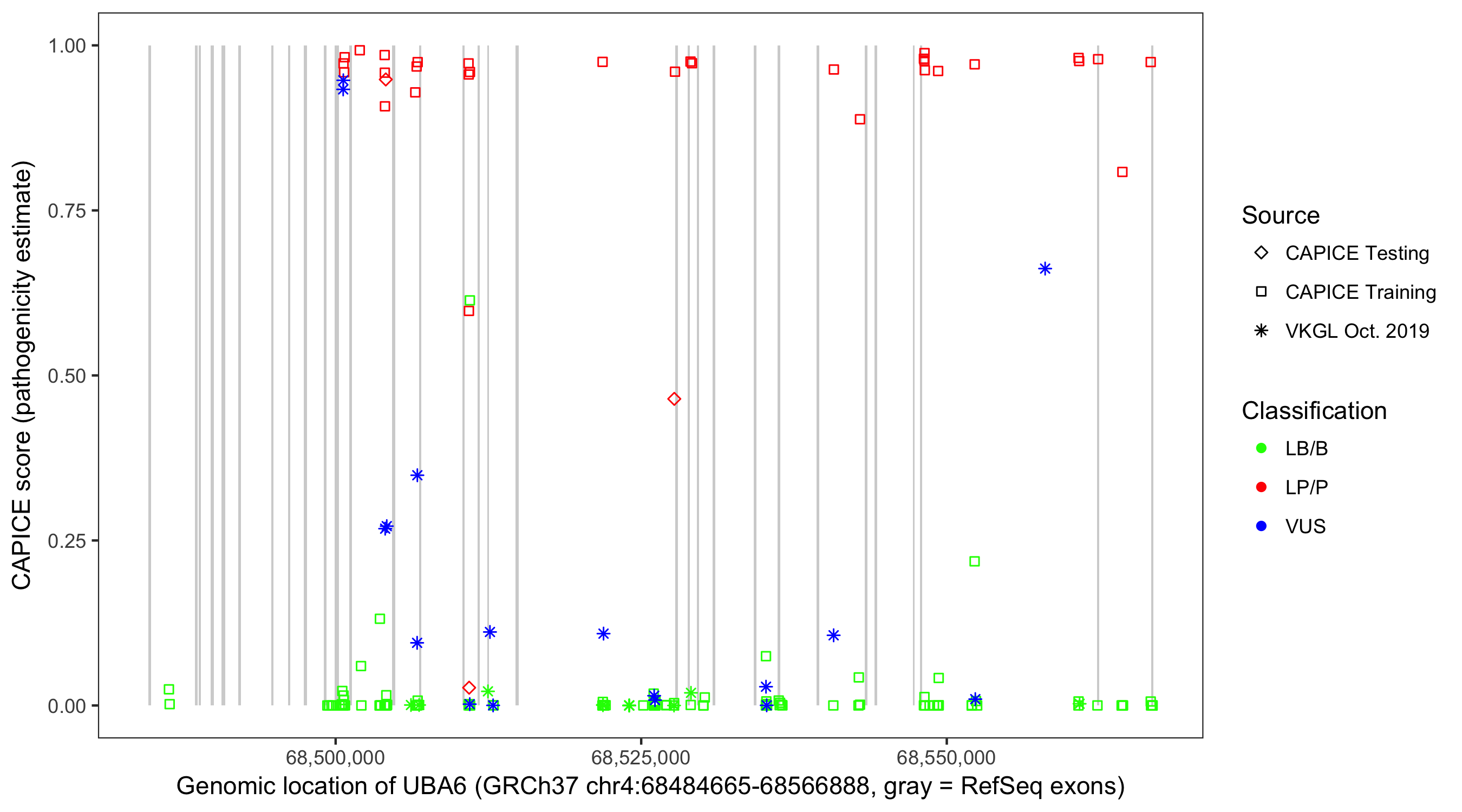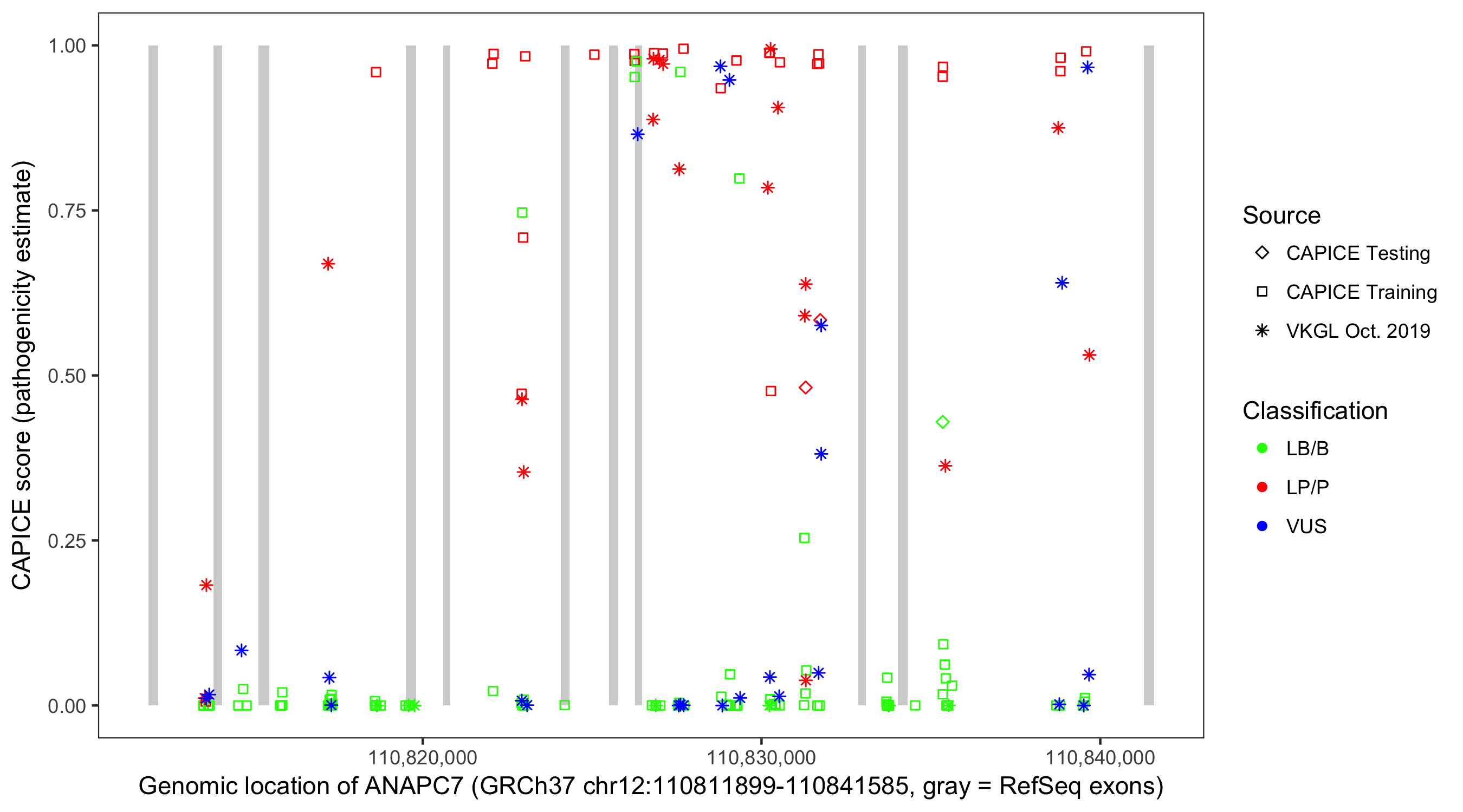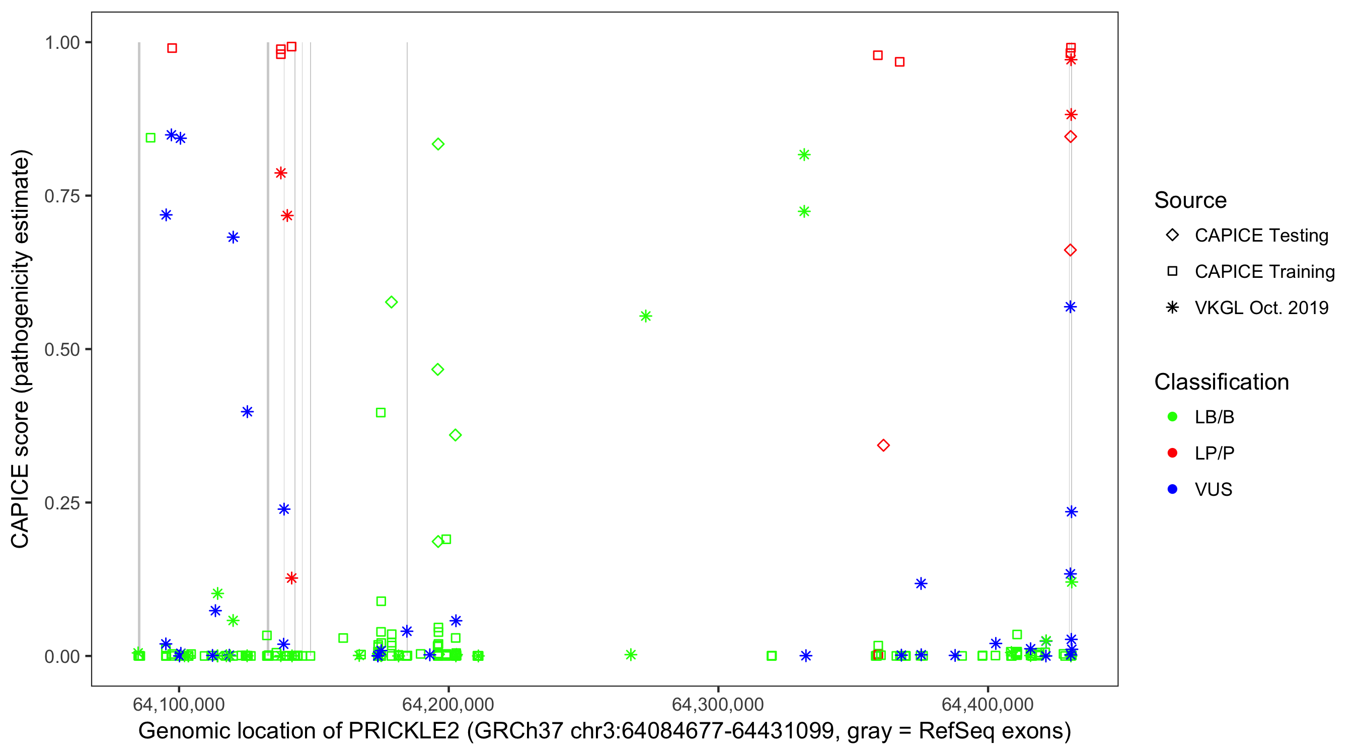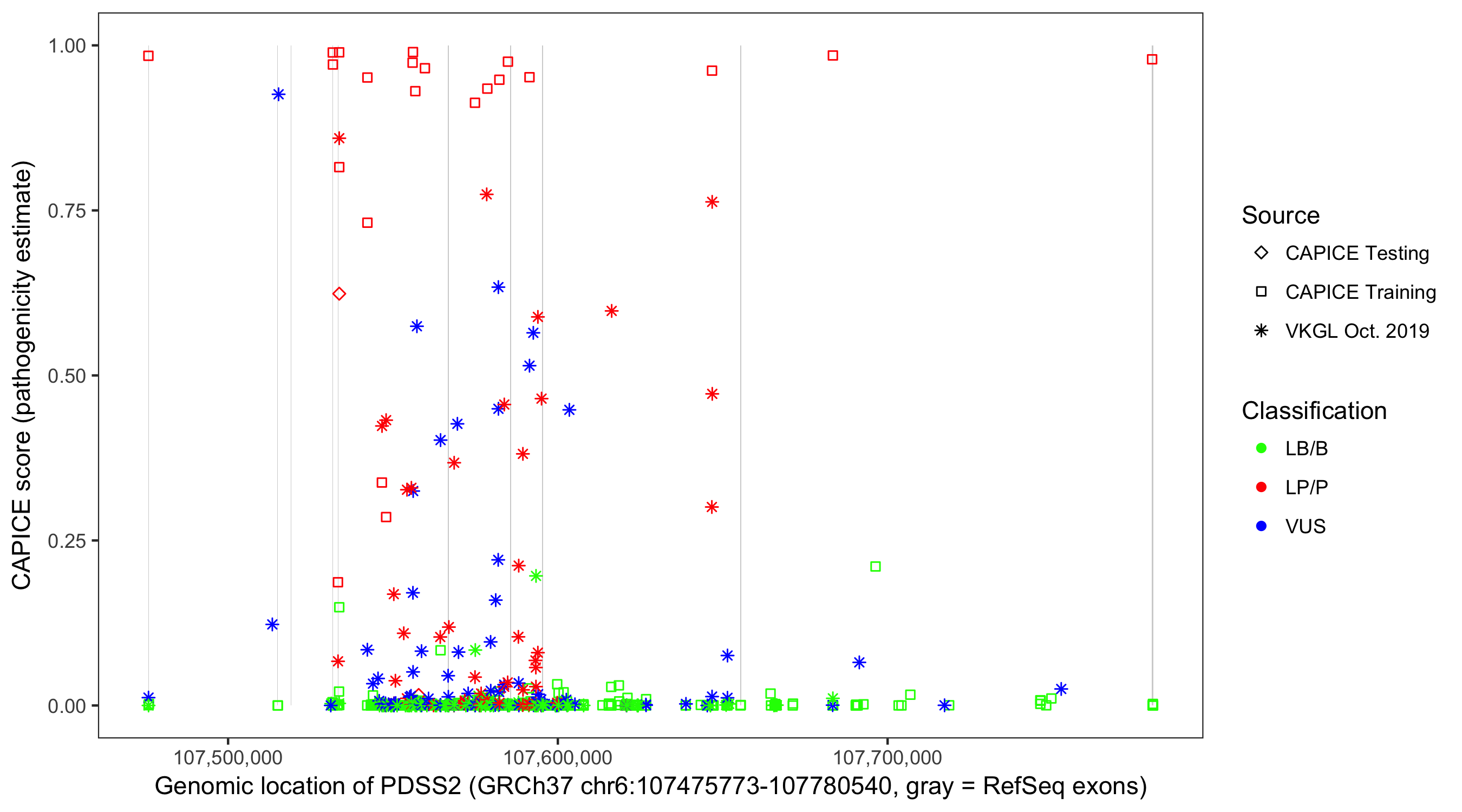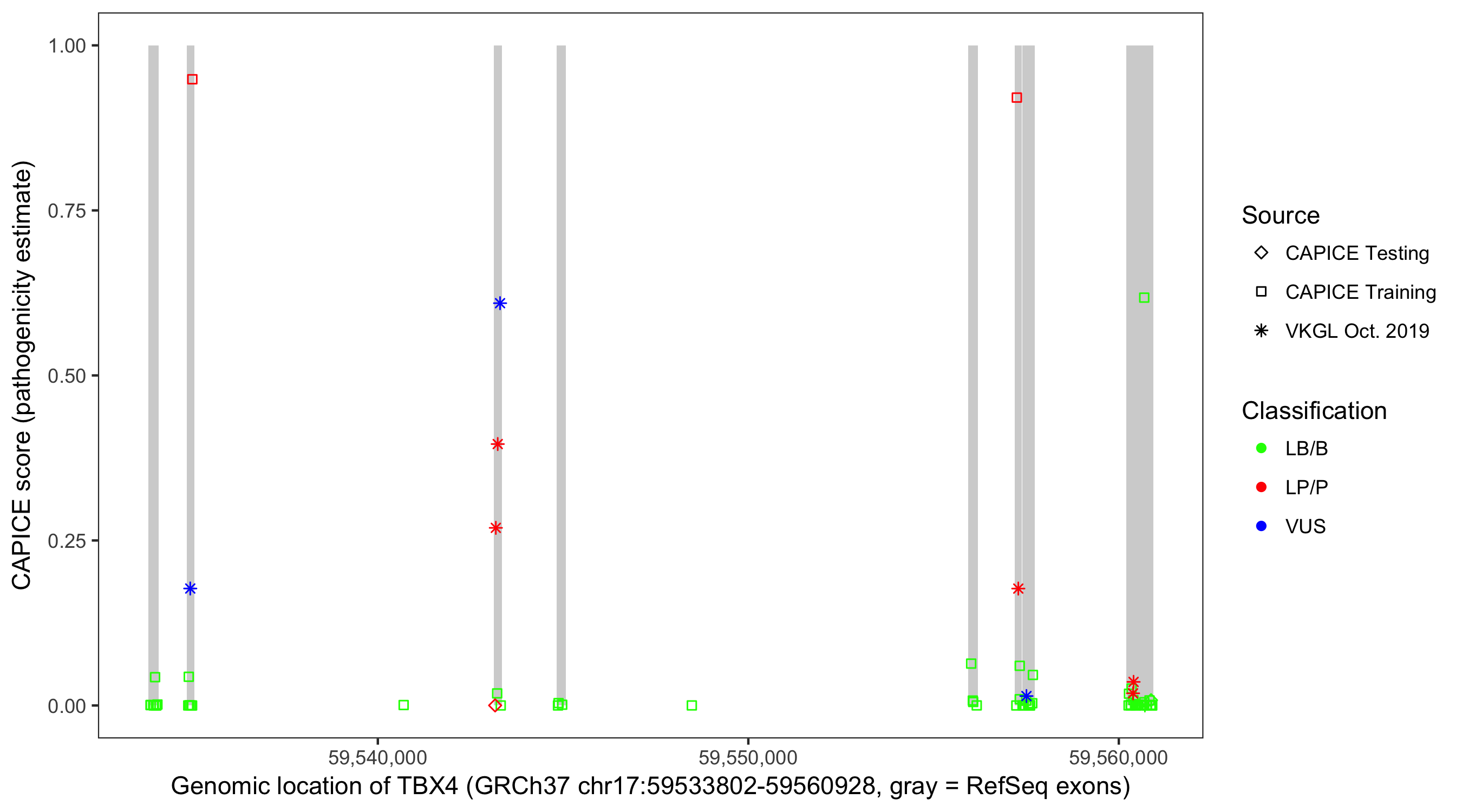 Shown are CAPICE train/test variants plus VKGL Oct 2019.