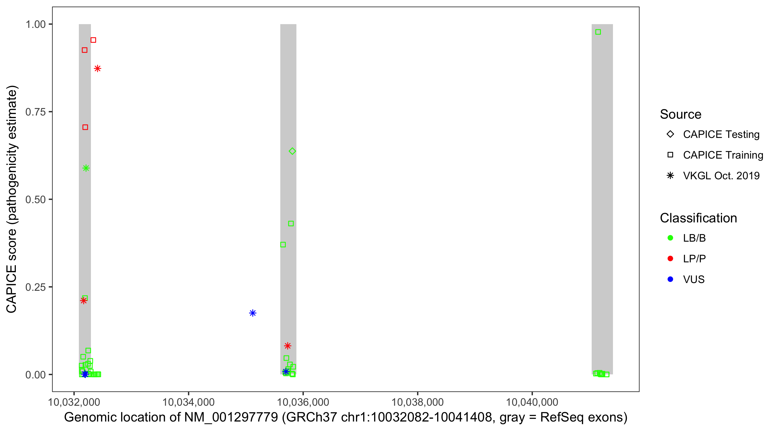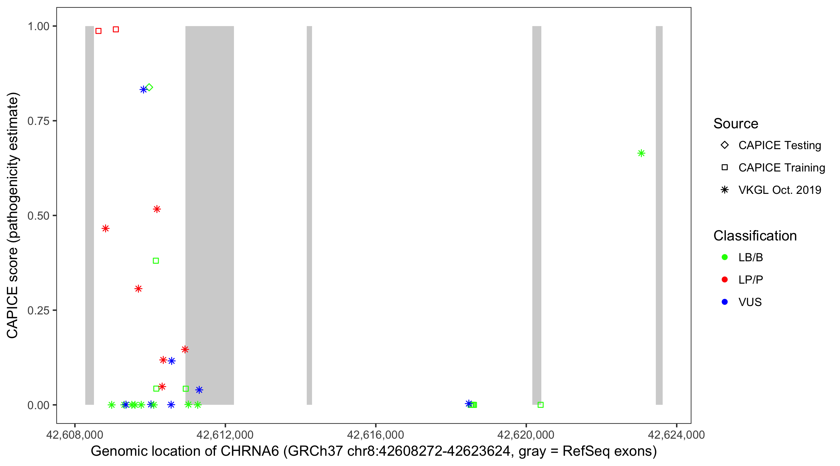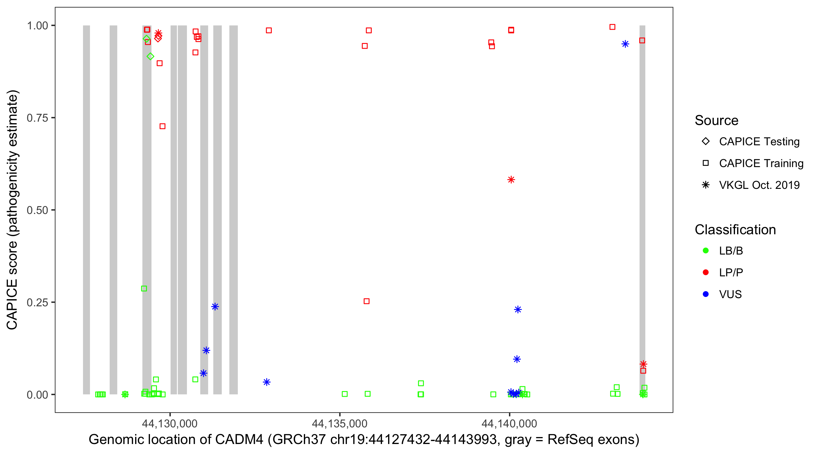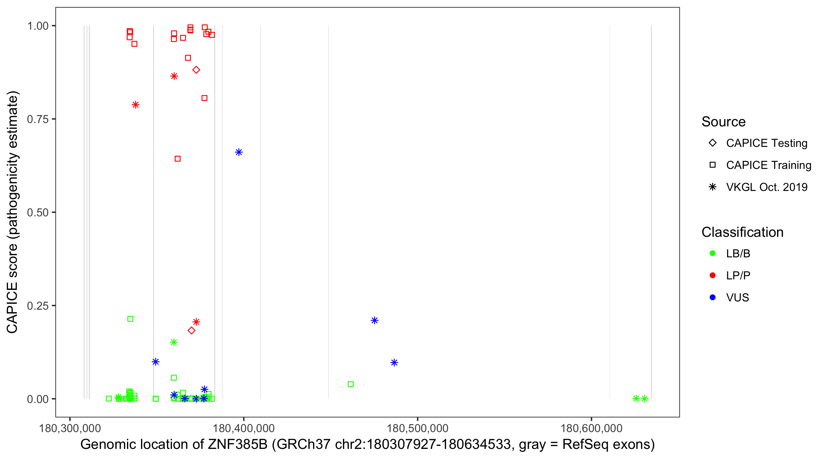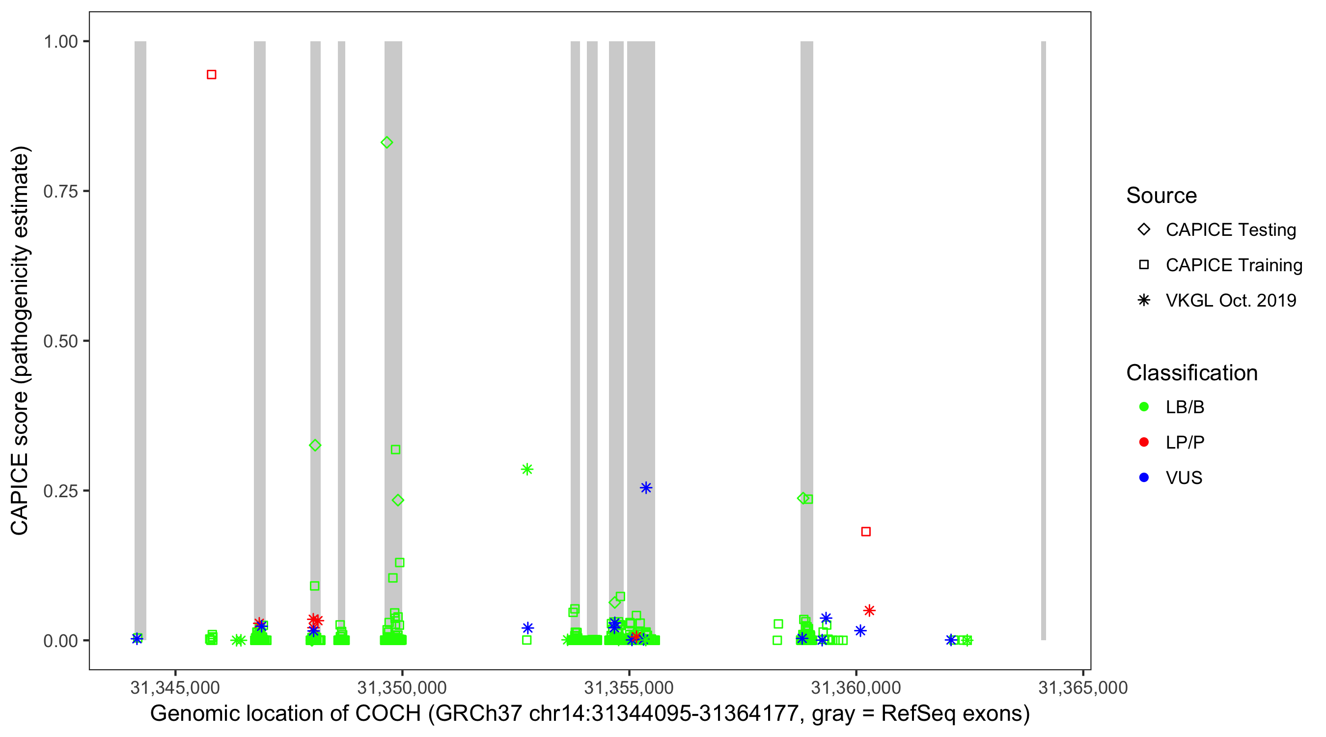 Shown are CAPICE train/test variants plus VKGL Oct 2019.