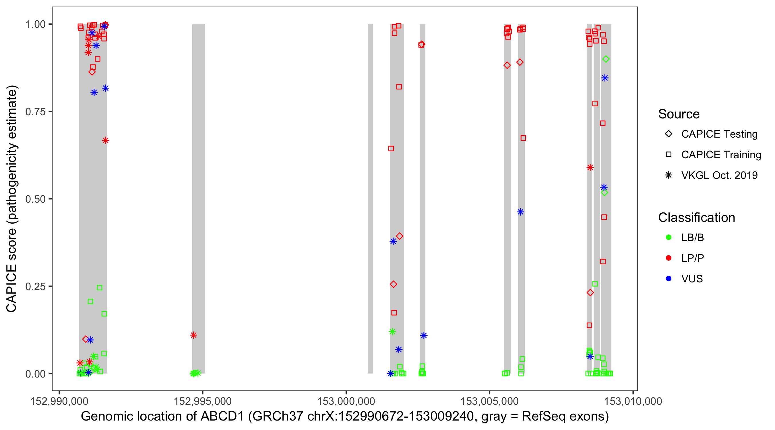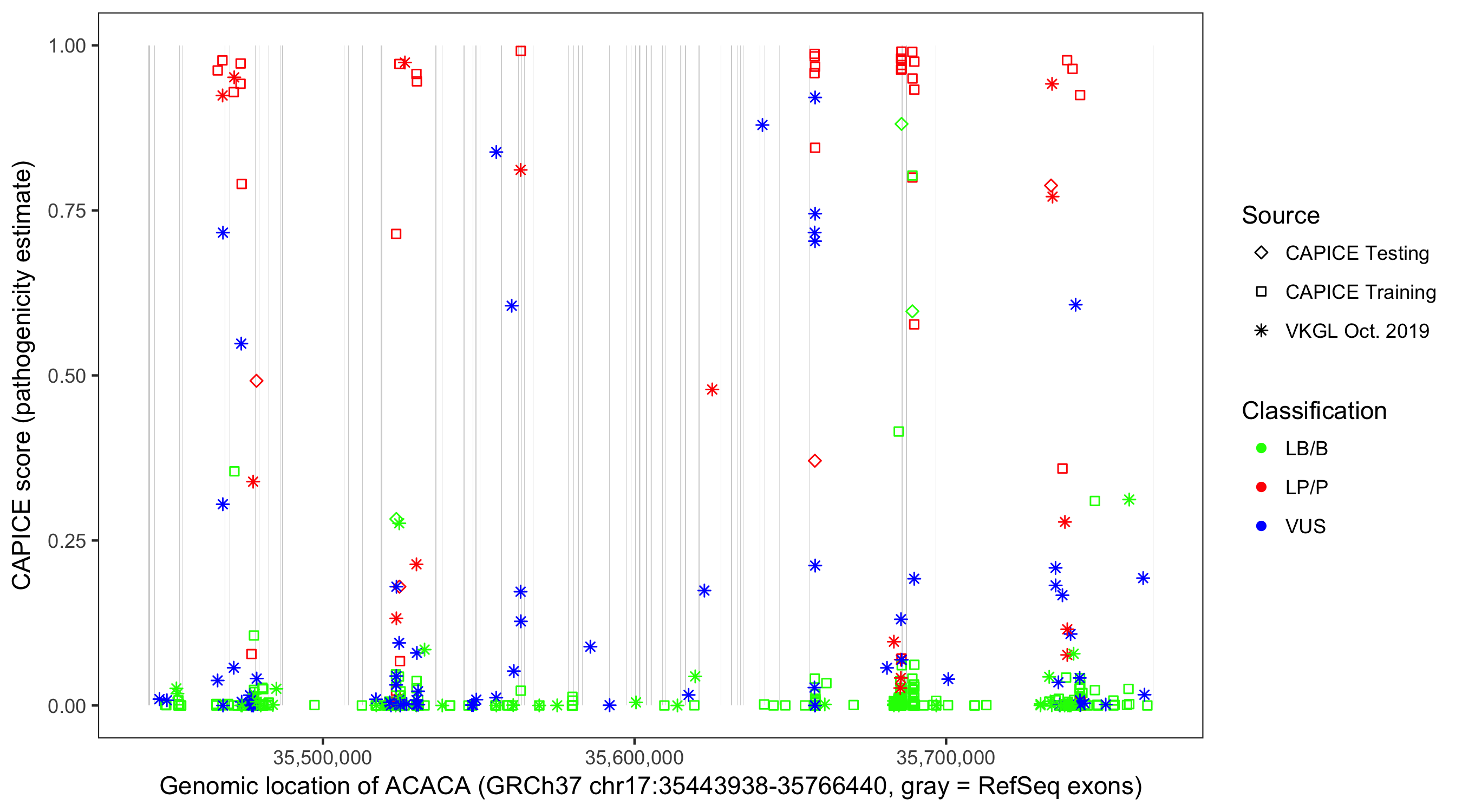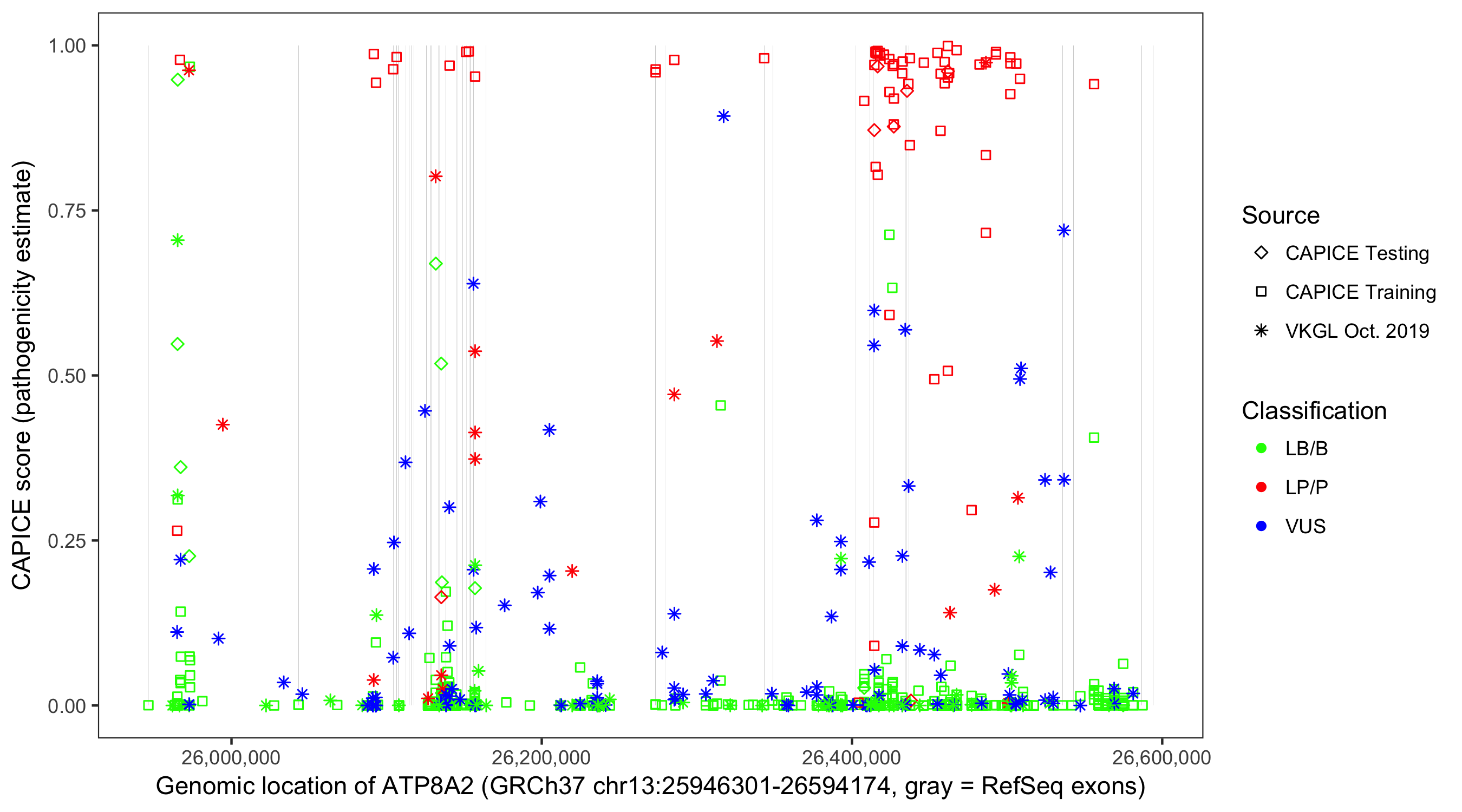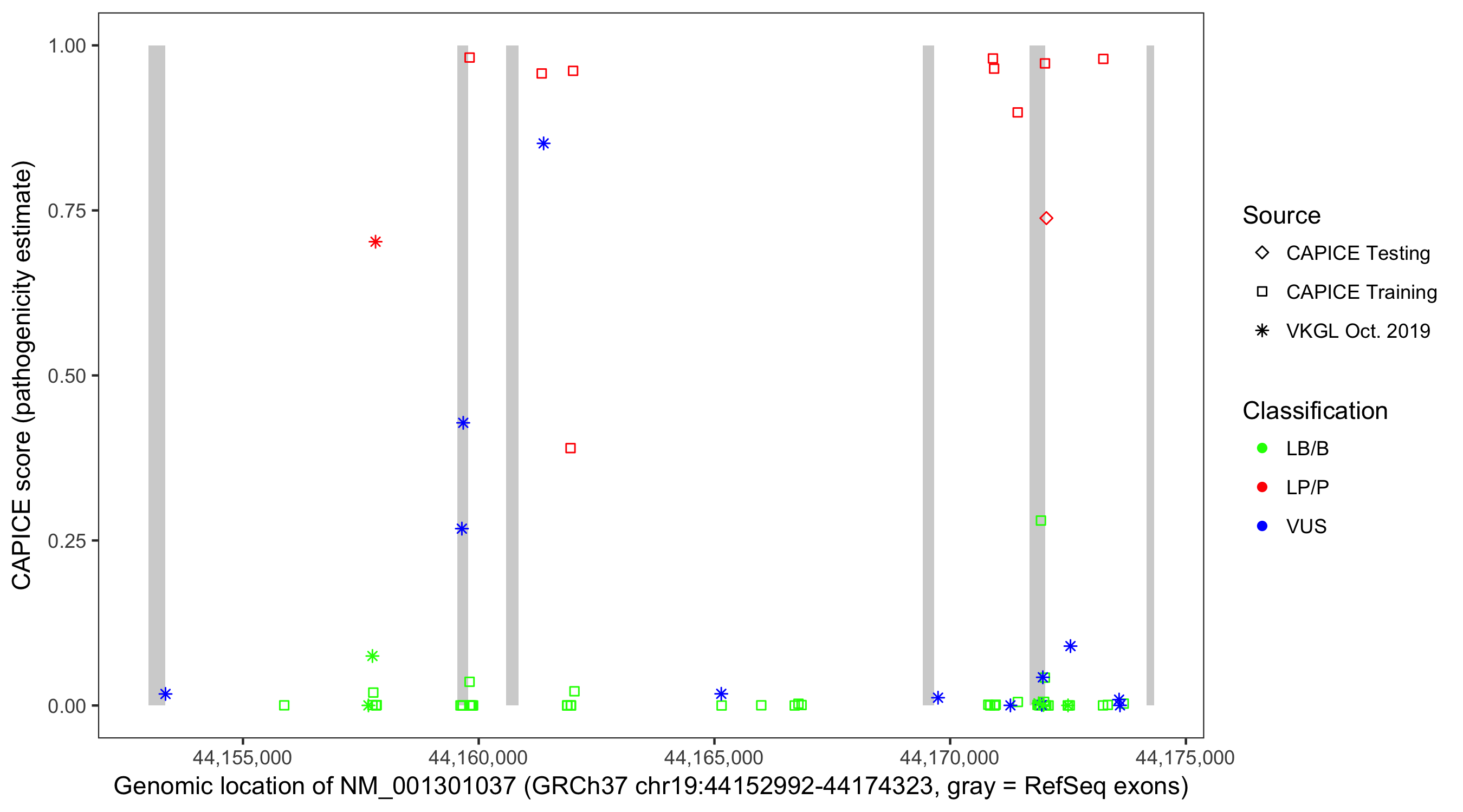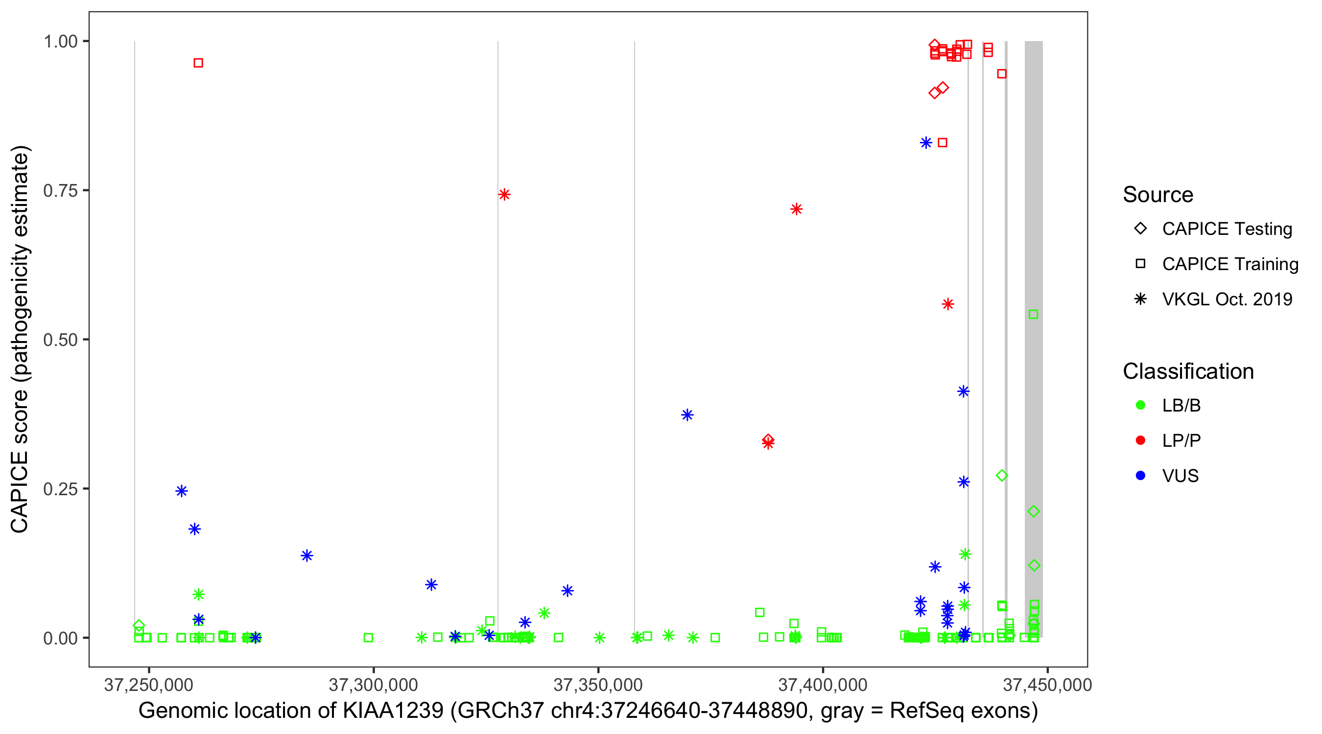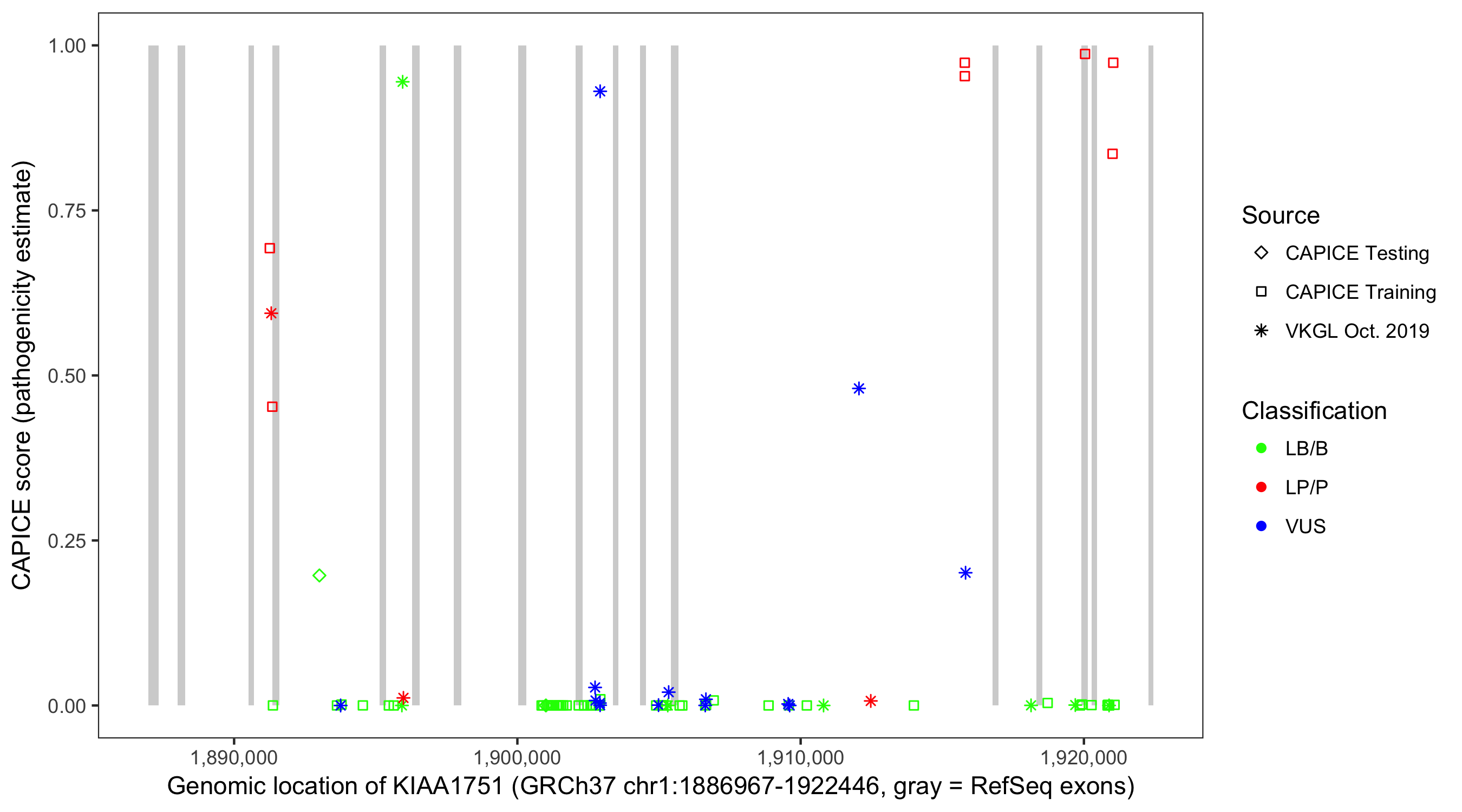 Shown are CAPICE train/test variants plus VKGL Oct 2019.