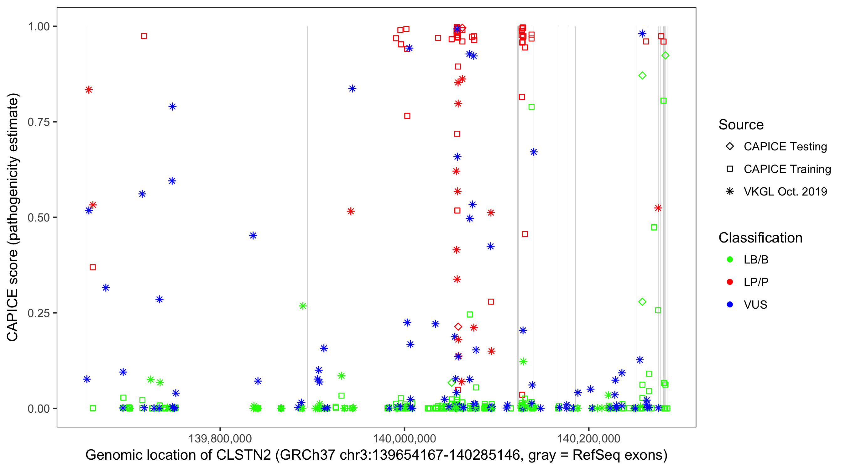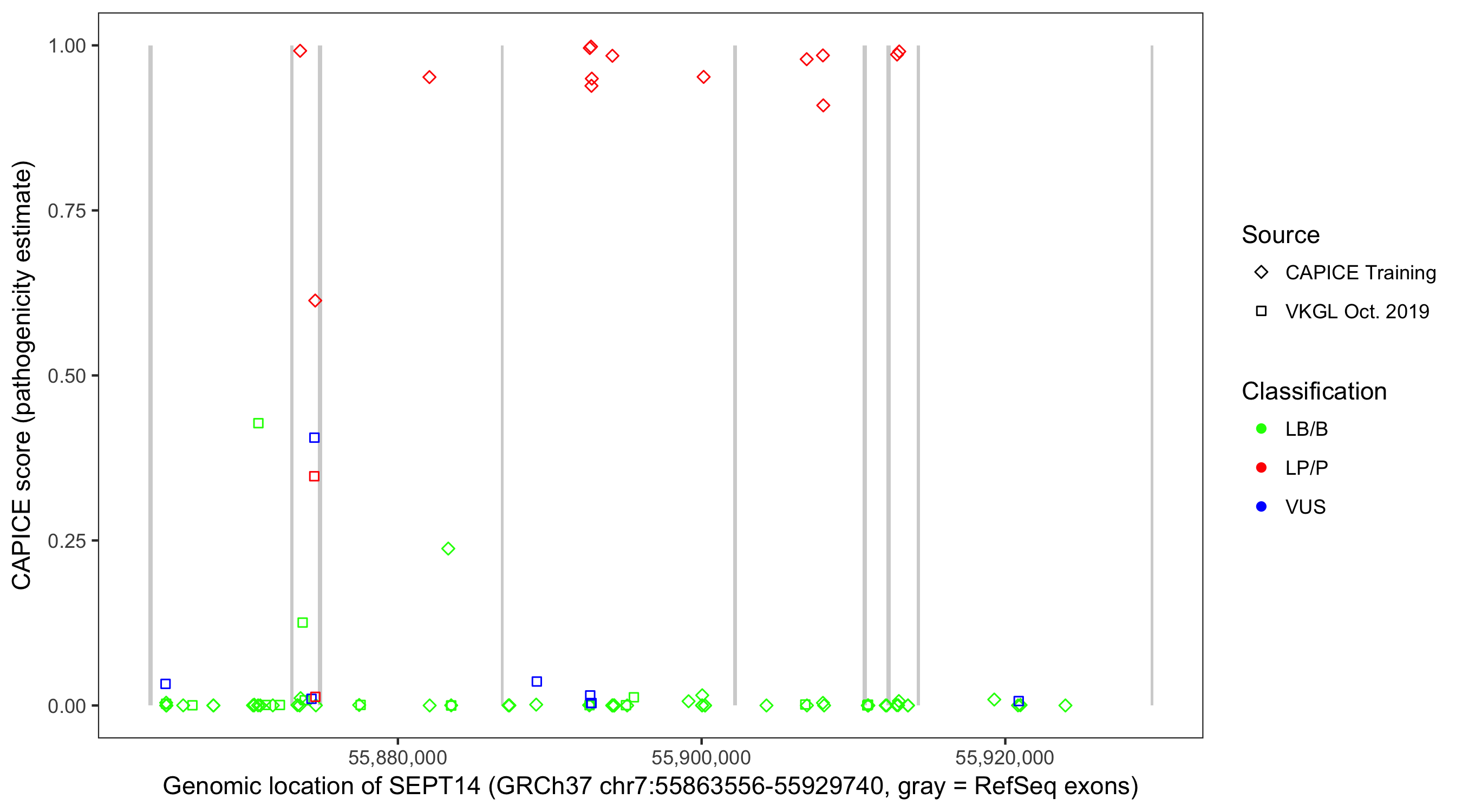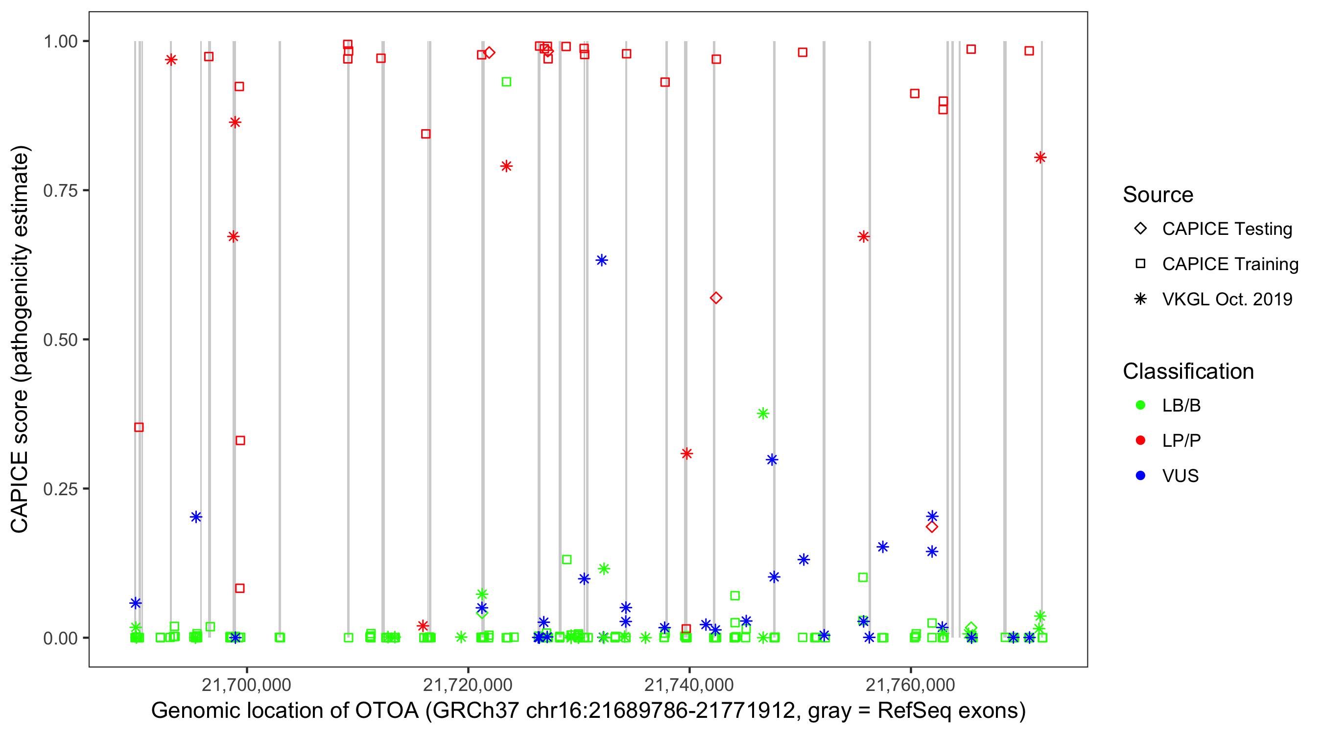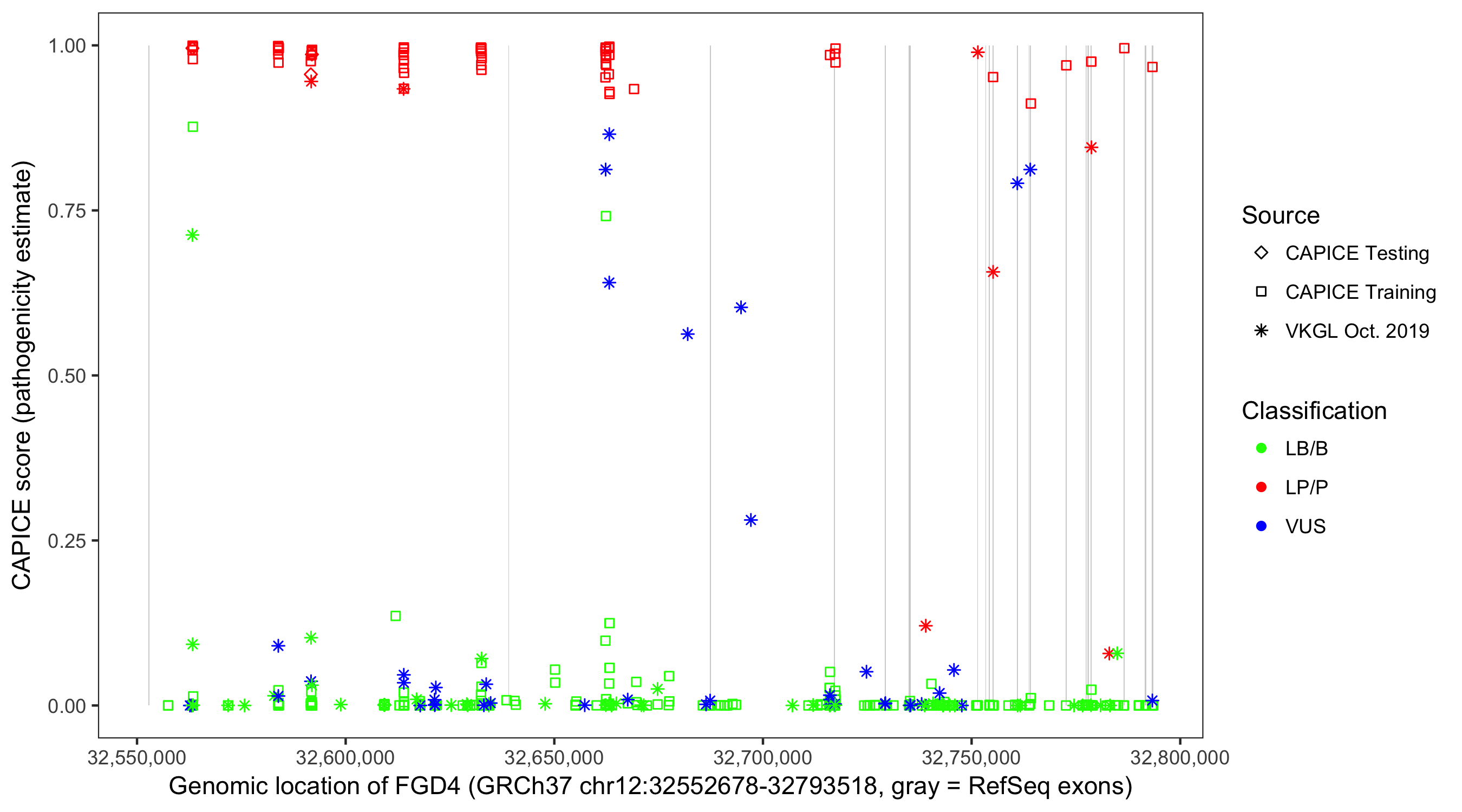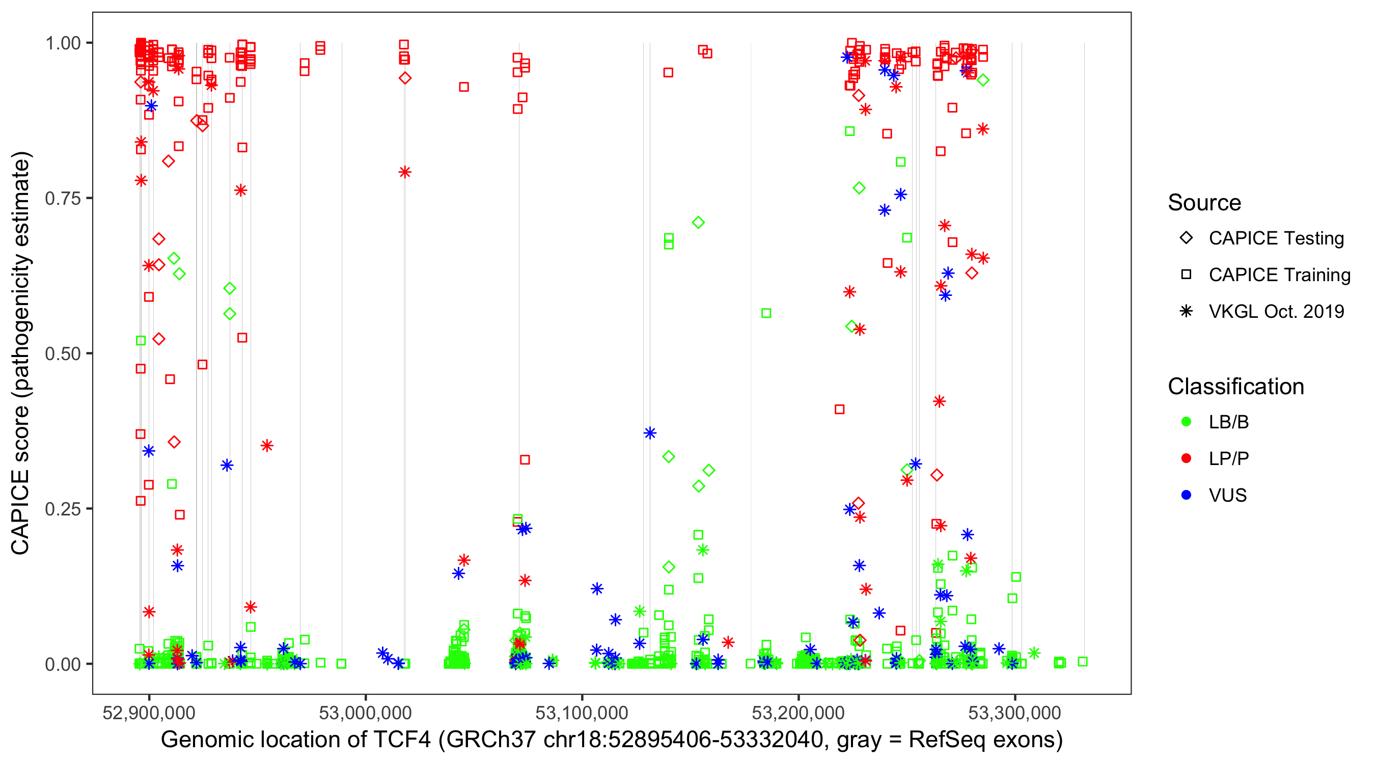 Shown are CAPICE train/test variants plus VKGL Oct 2019.