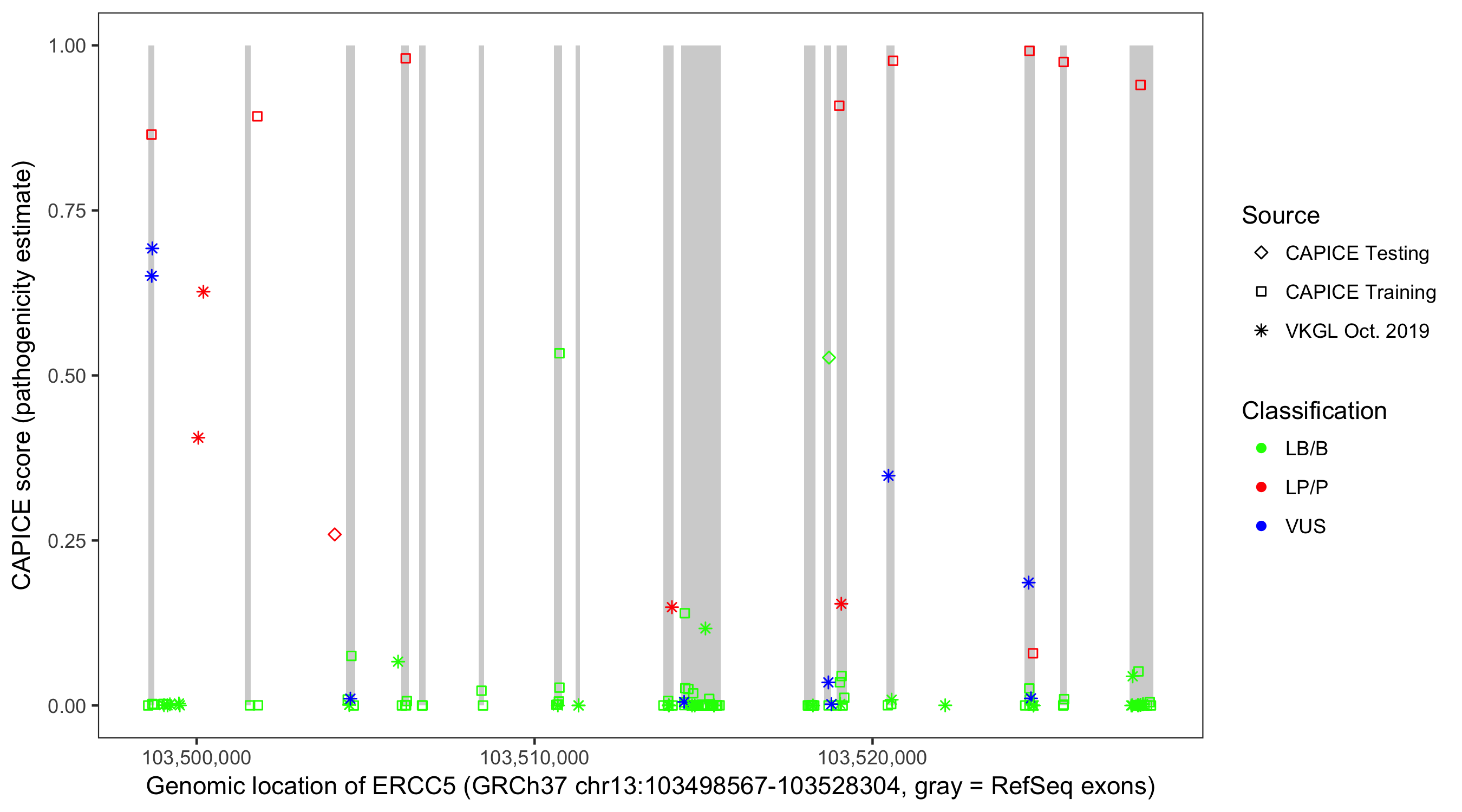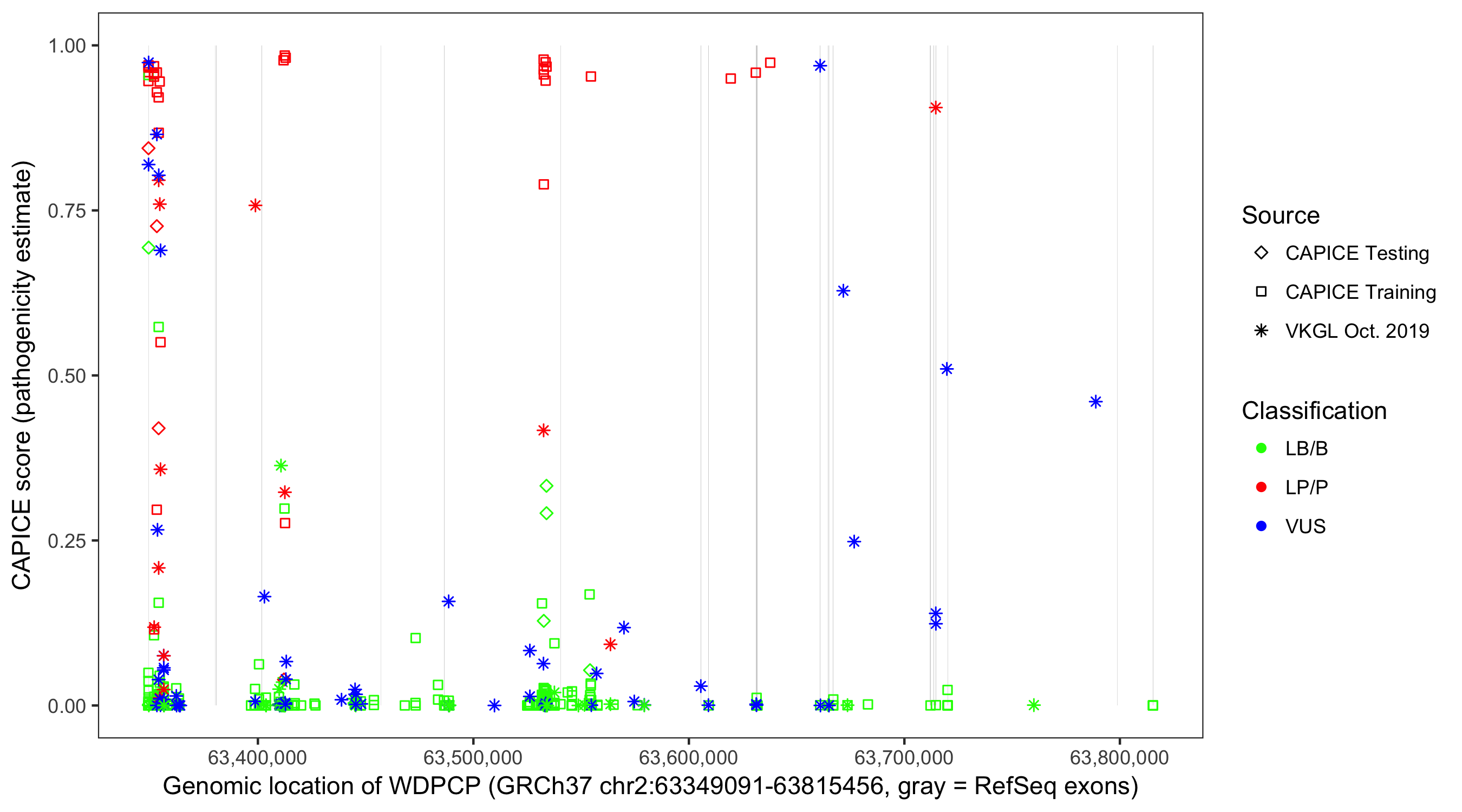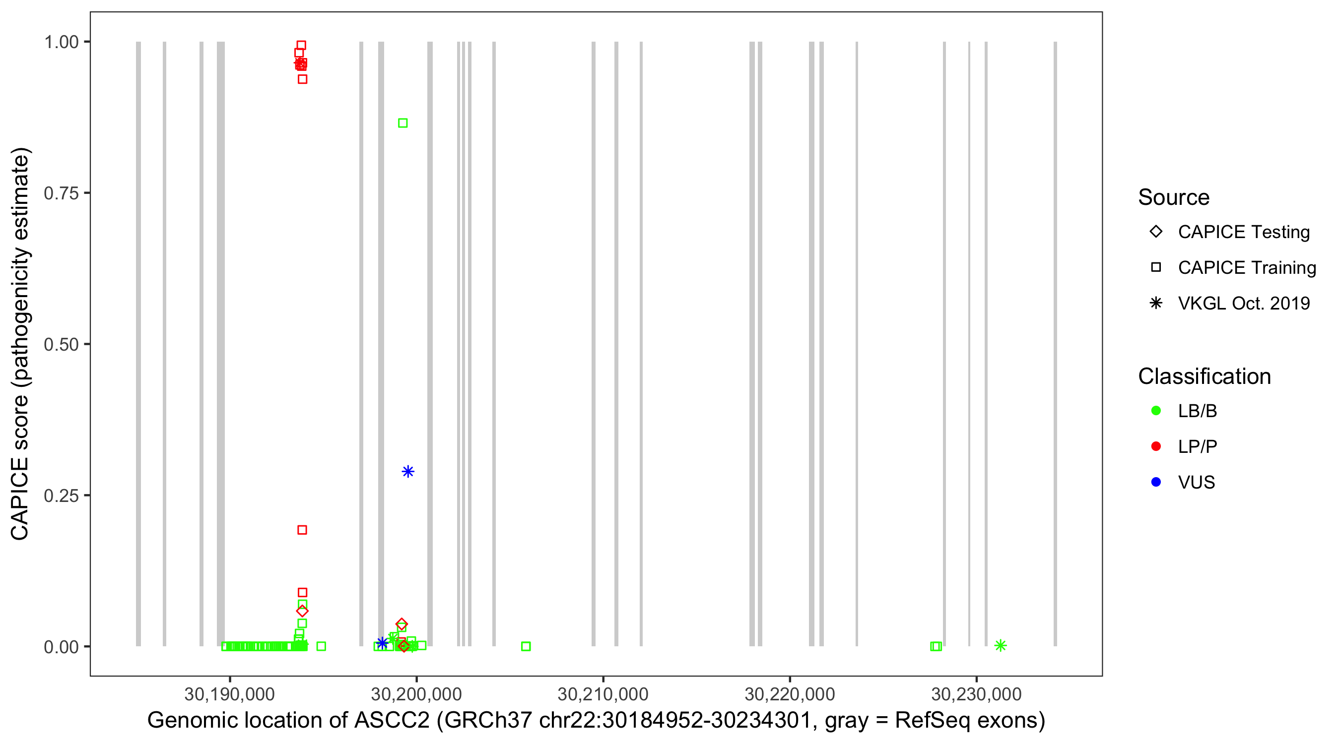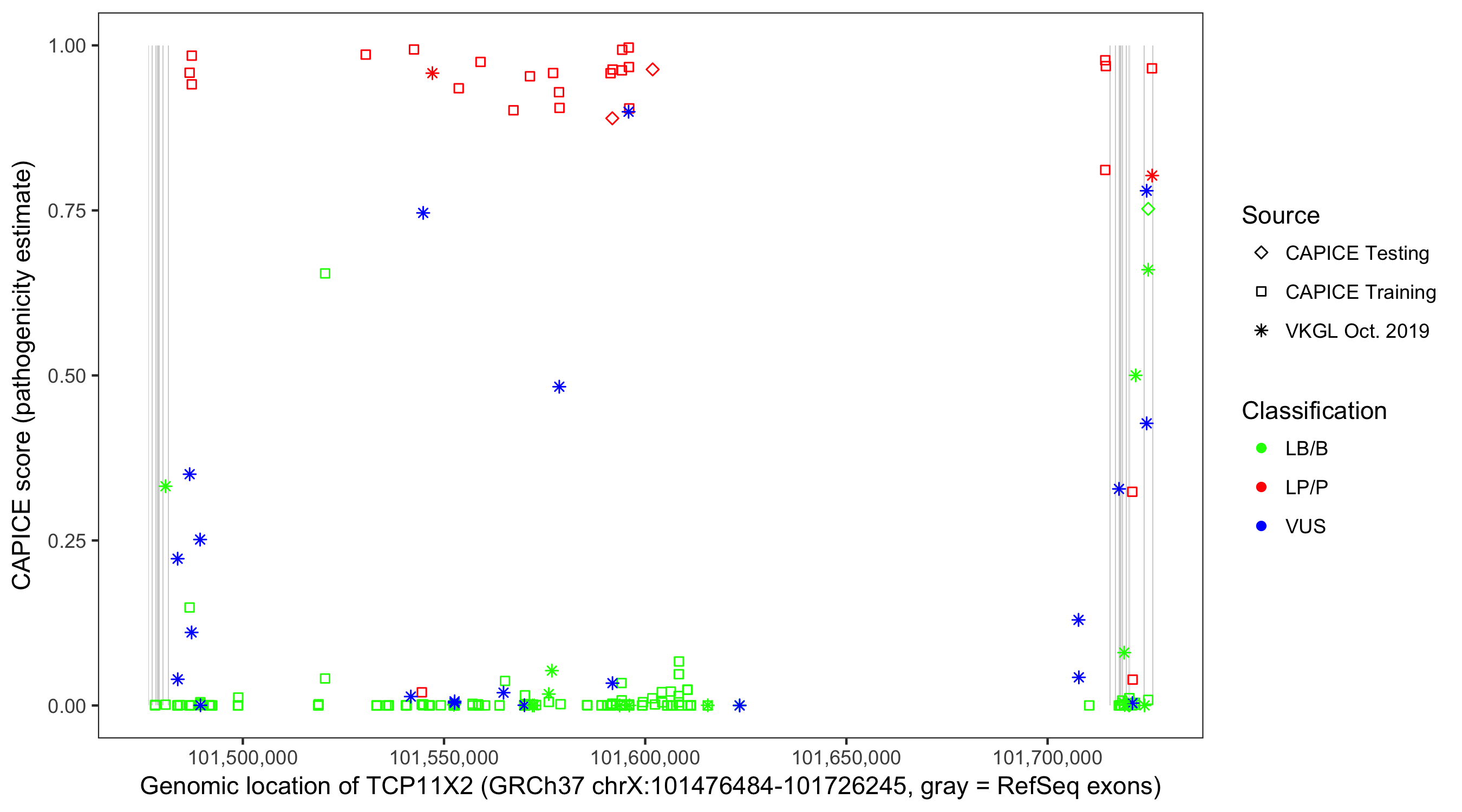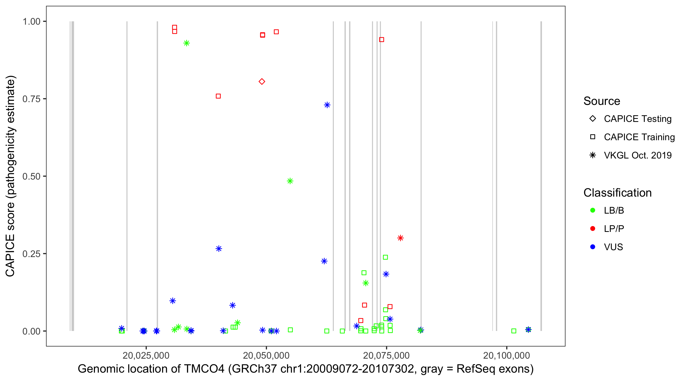 Shown are CAPICE train/test variants plus VKGL Oct 2019.