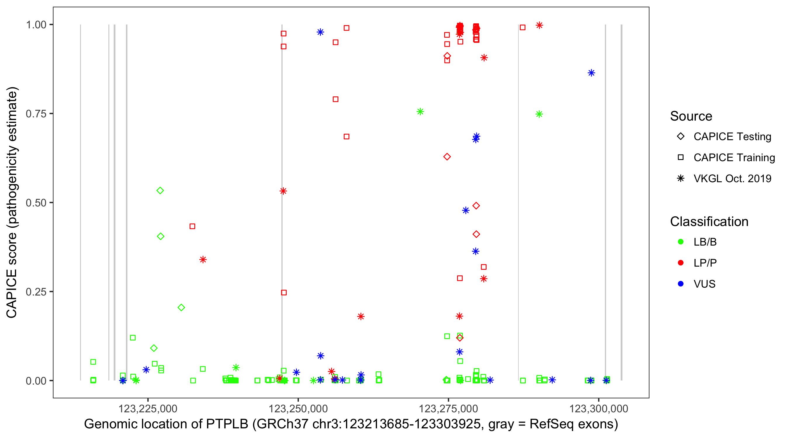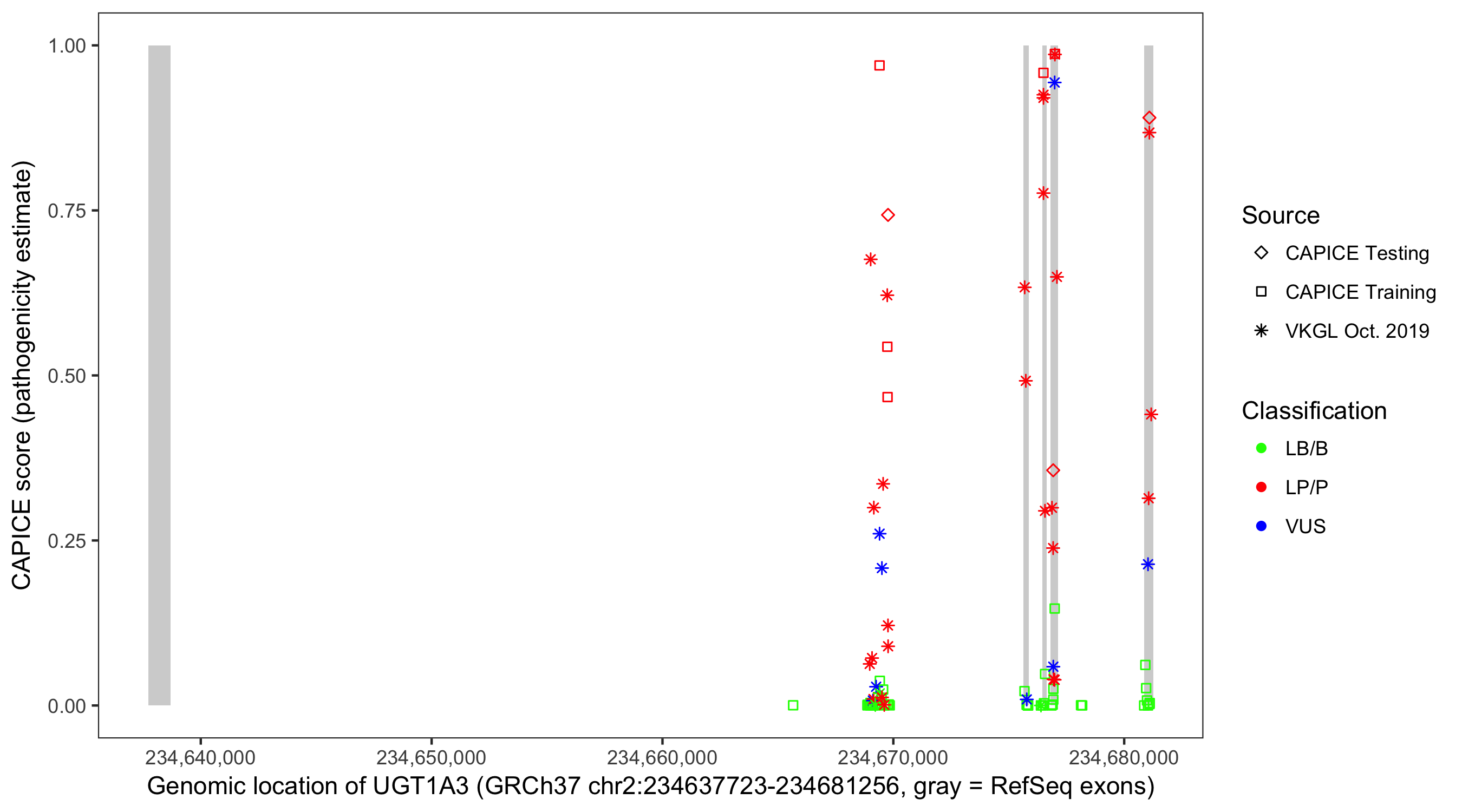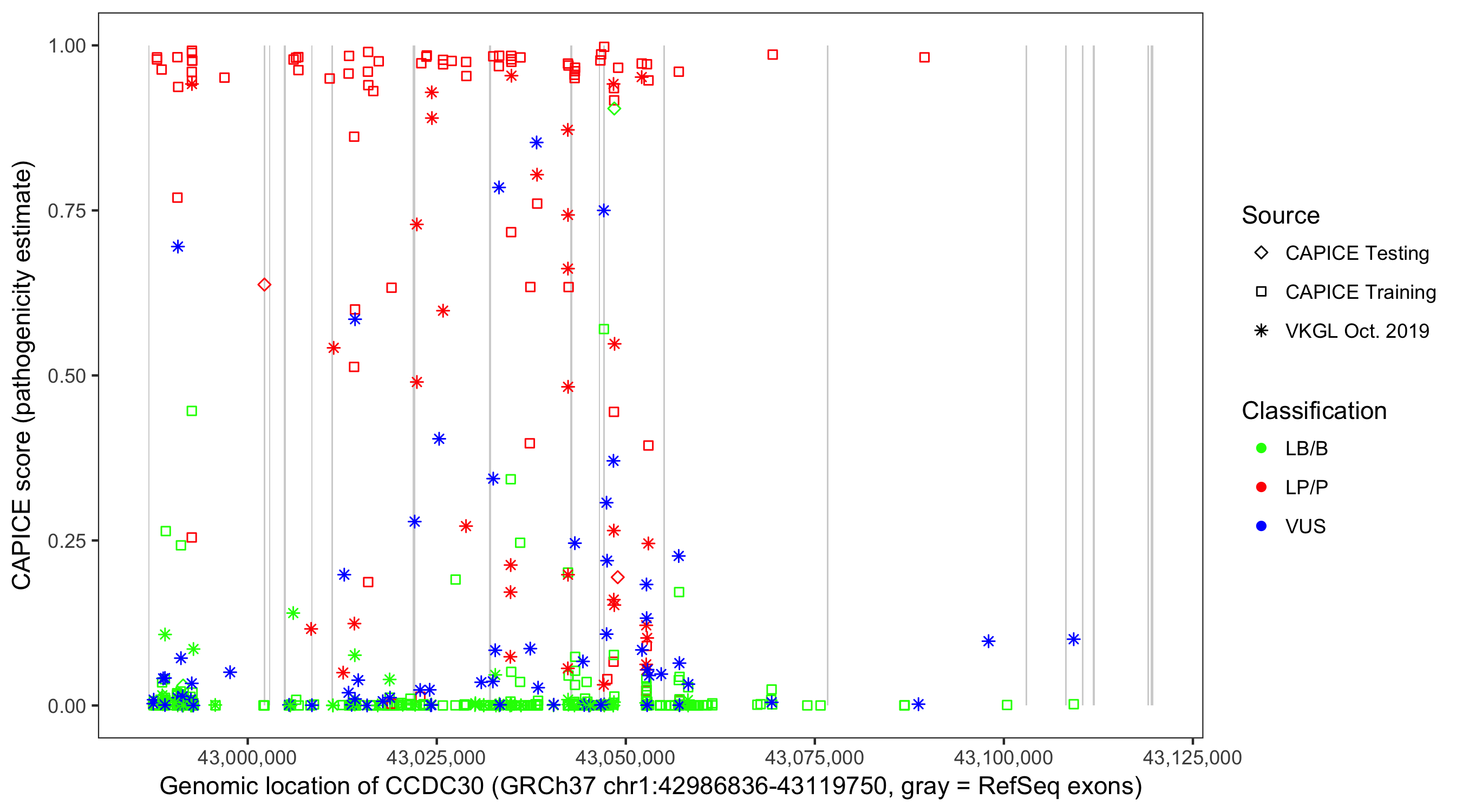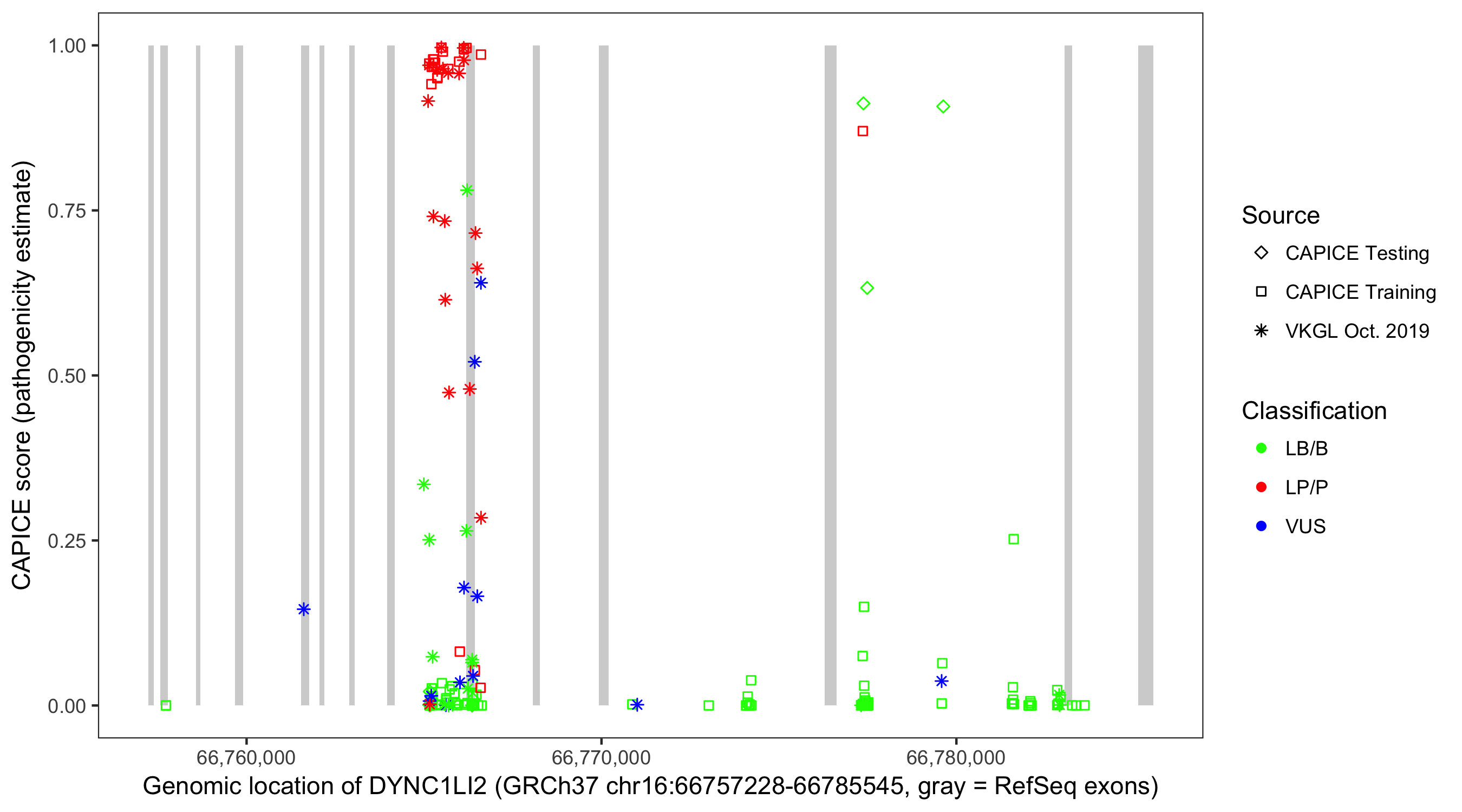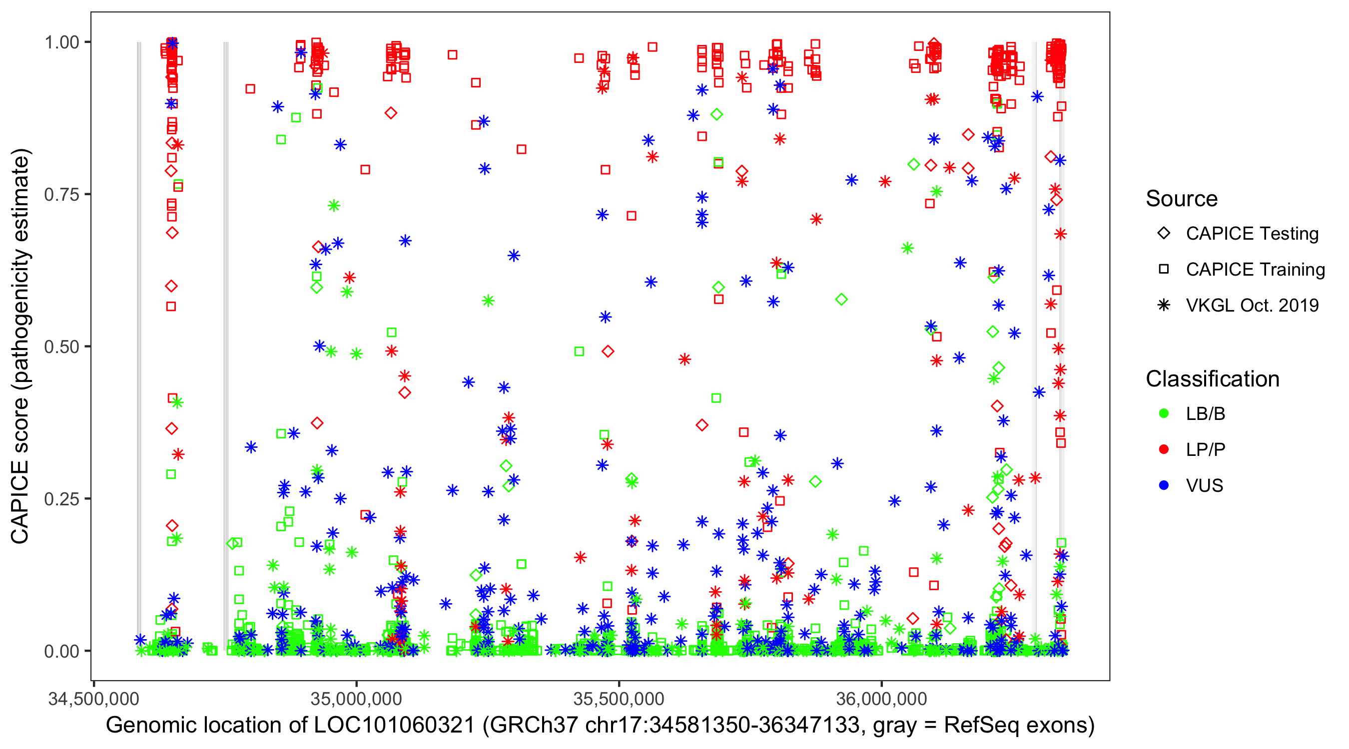 Shown are CAPICE train/test variants plus VKGL Oct 2019.