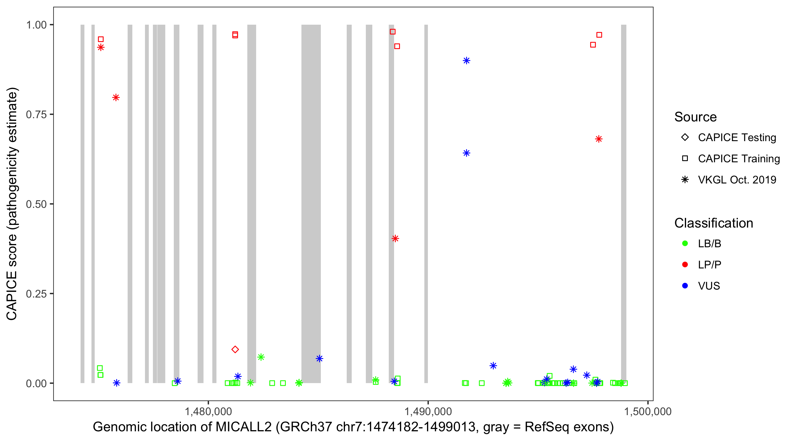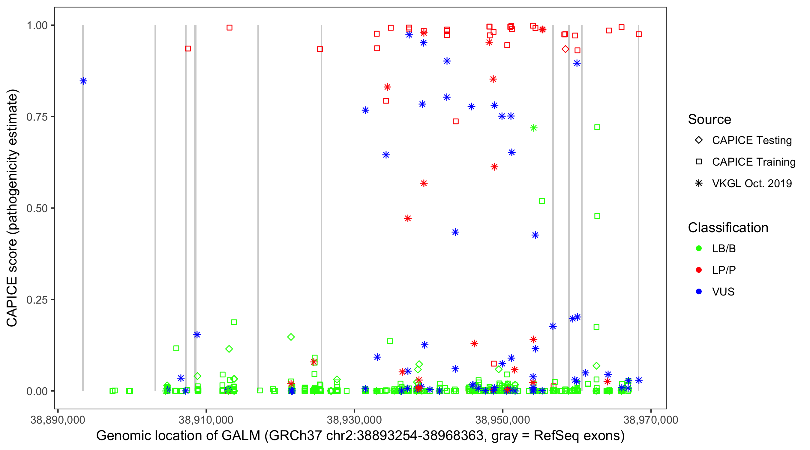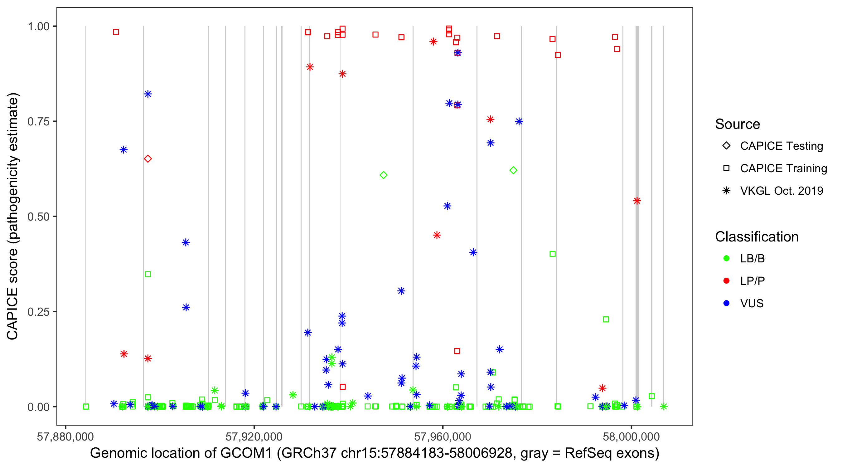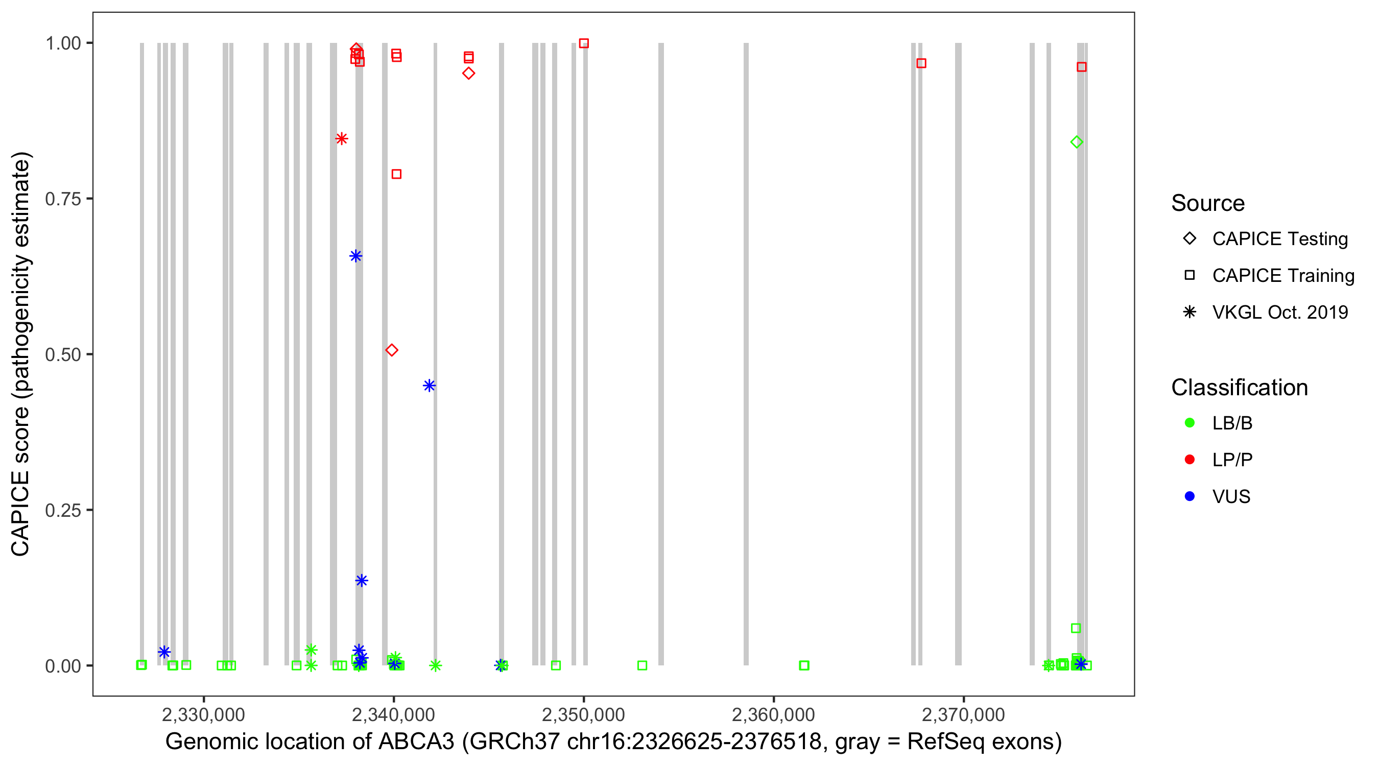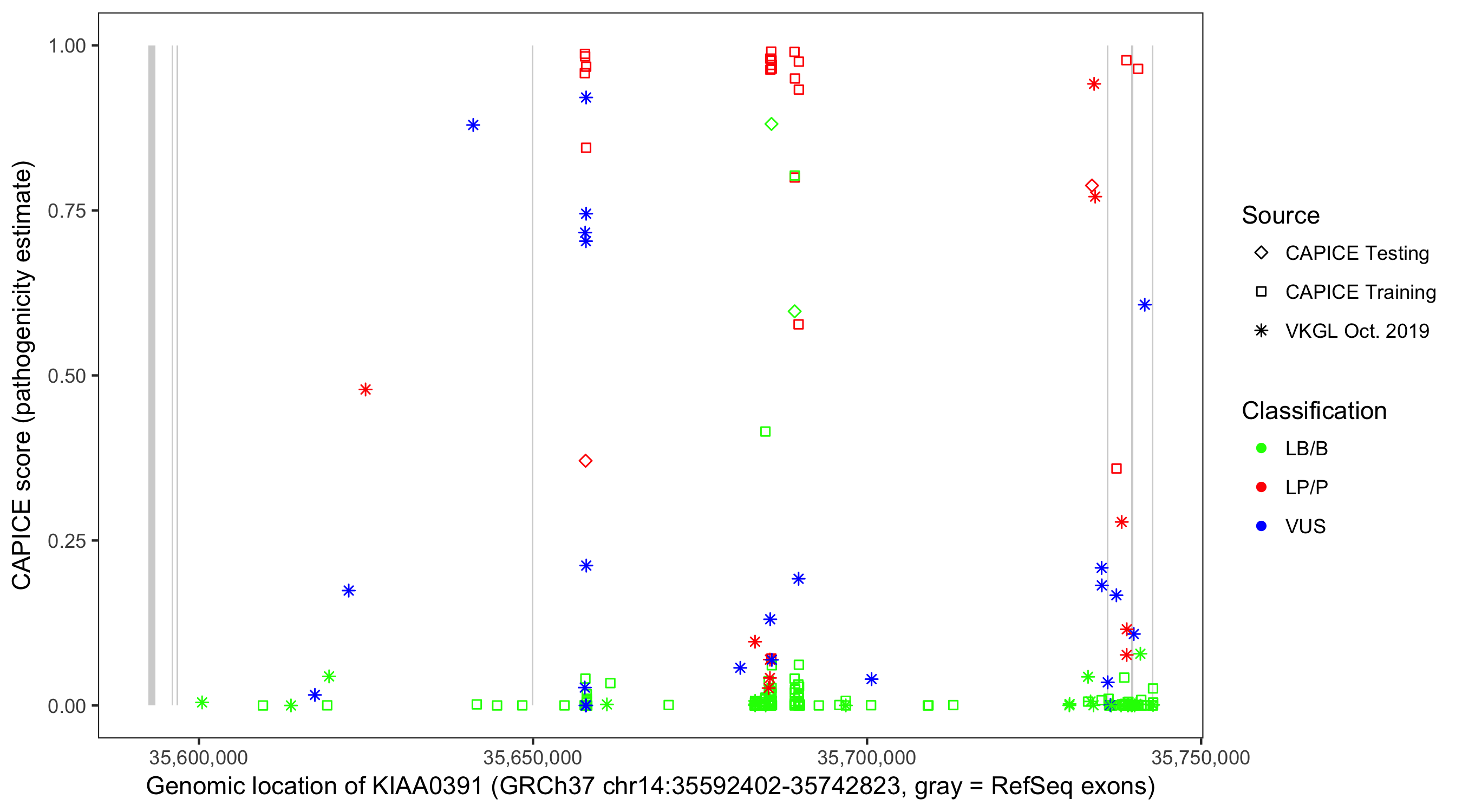 Shown are CAPICE train/test variants plus VKGL Oct 2019.