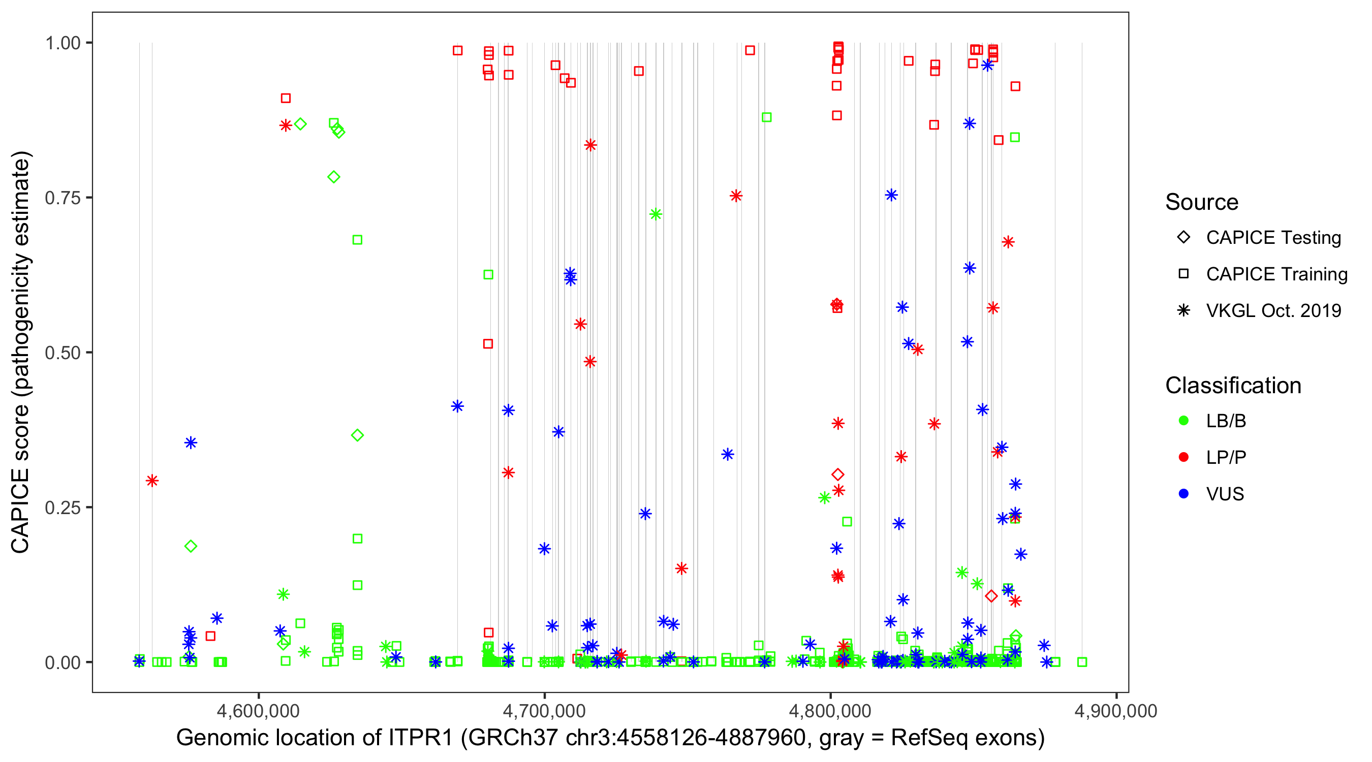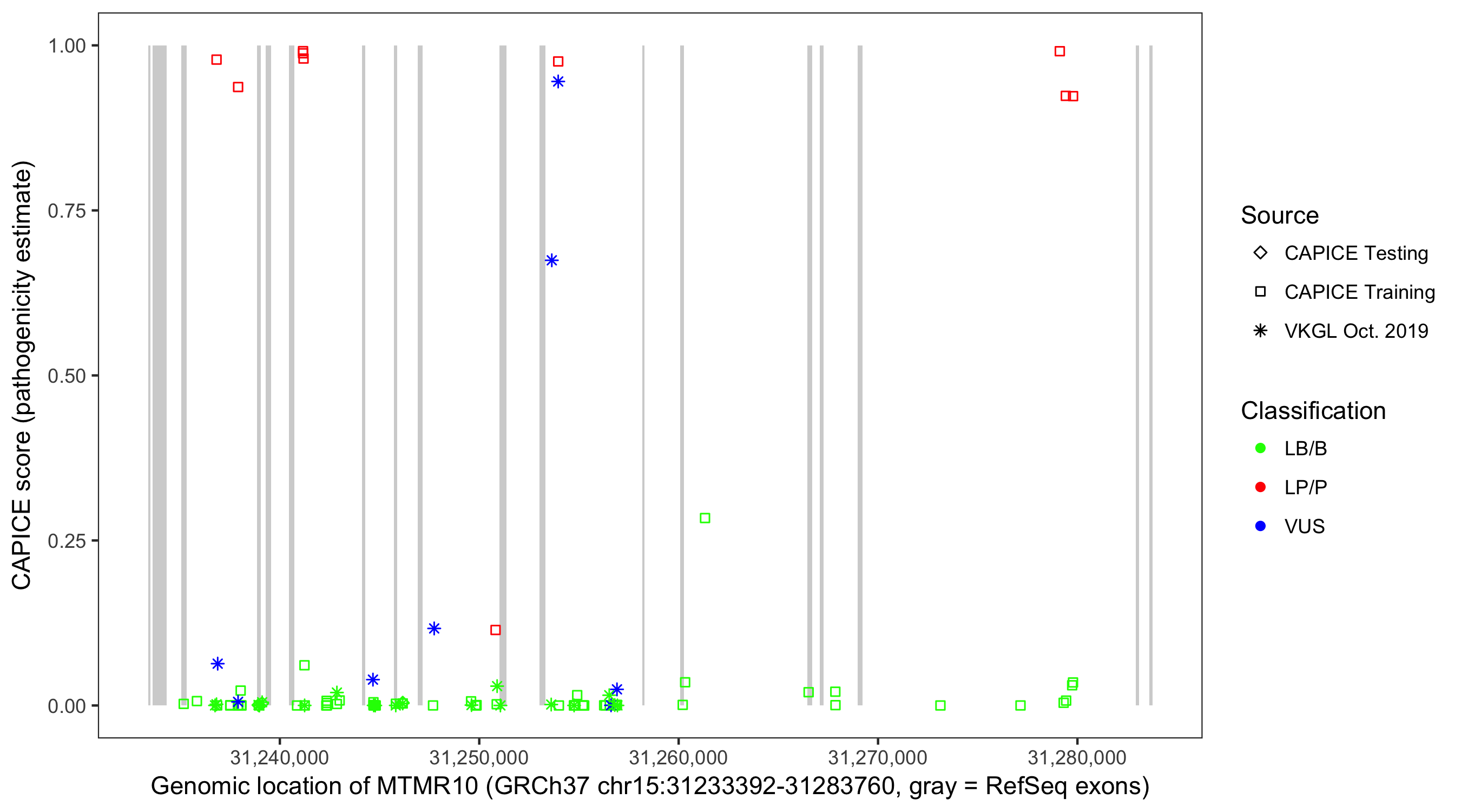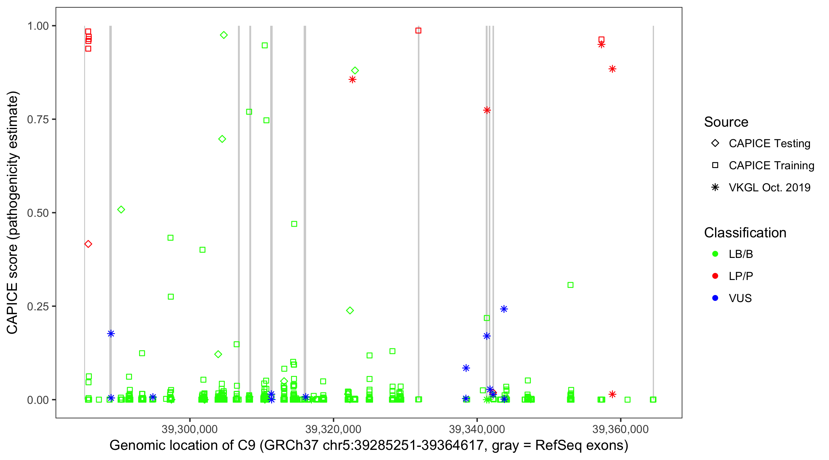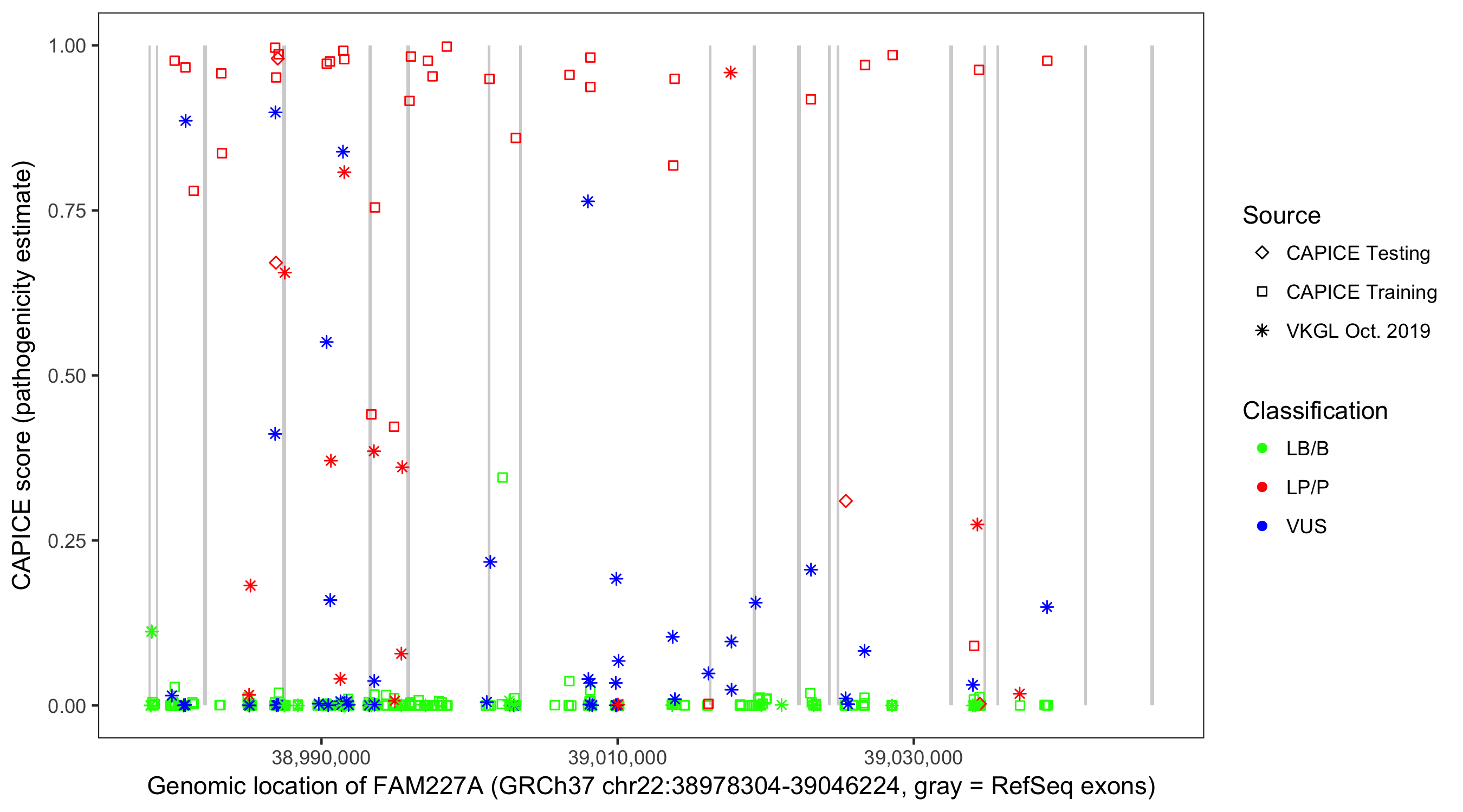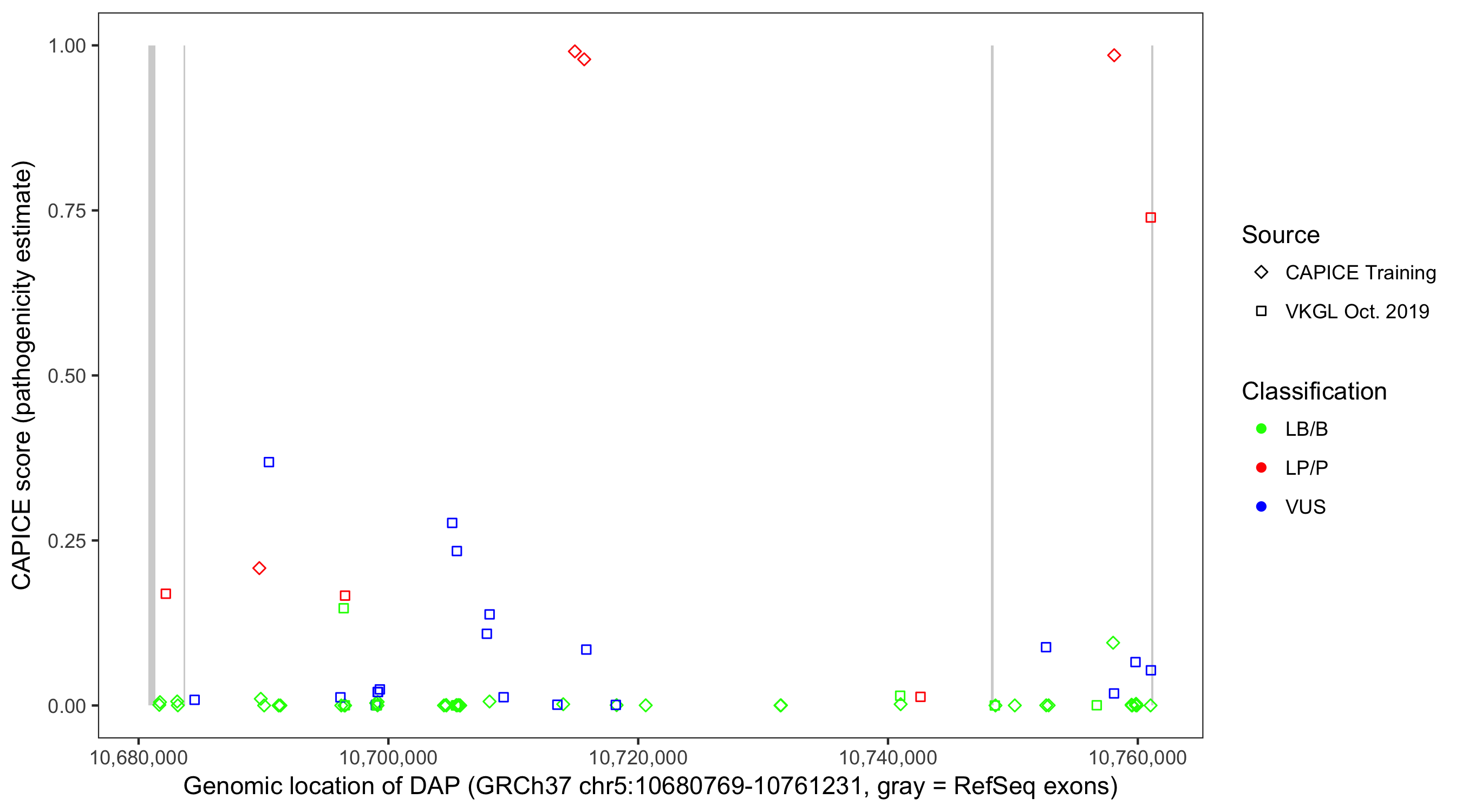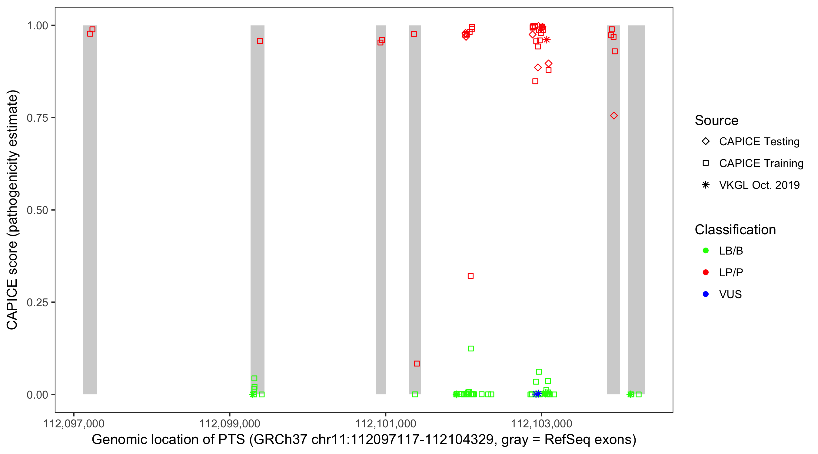 Shown are CAPICE train/test variants plus VKGL Oct 2019.