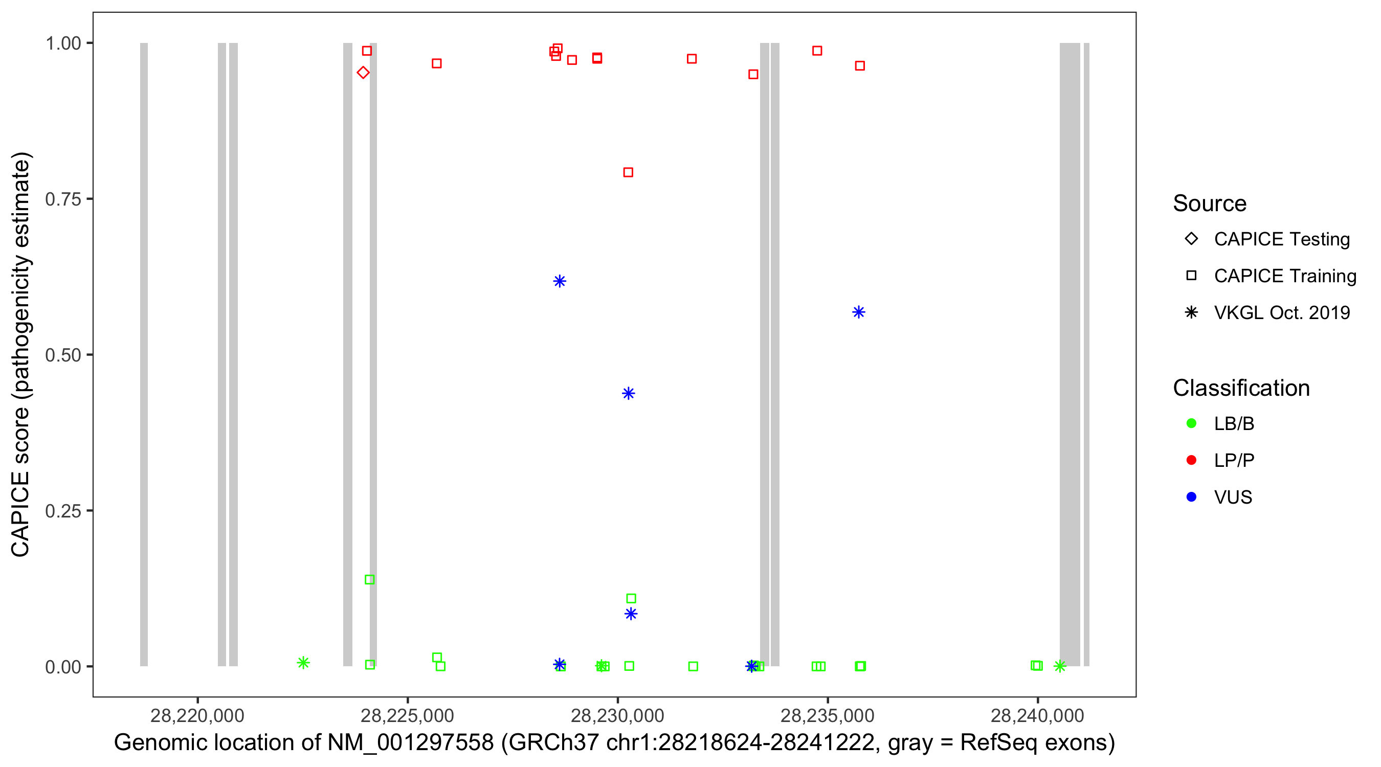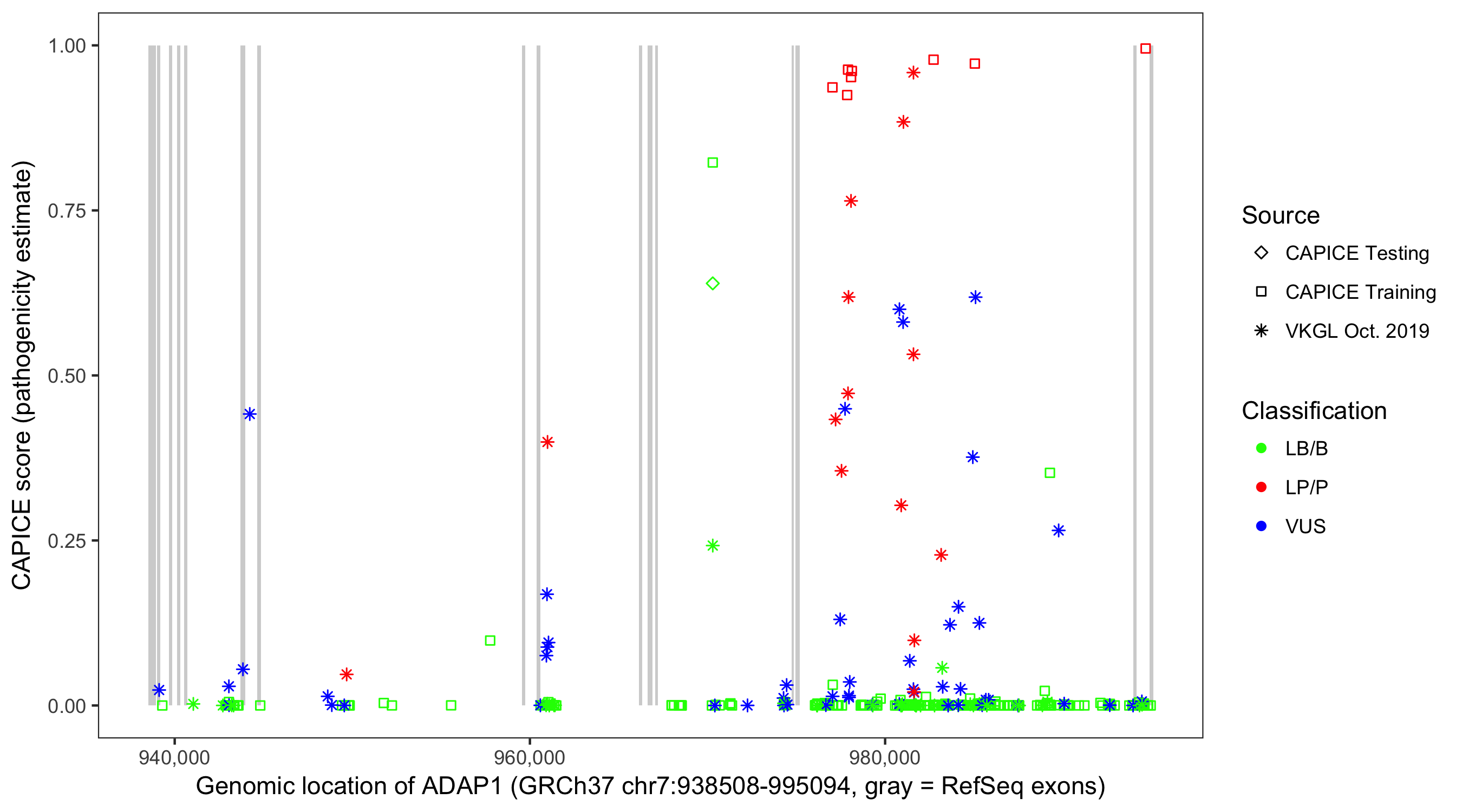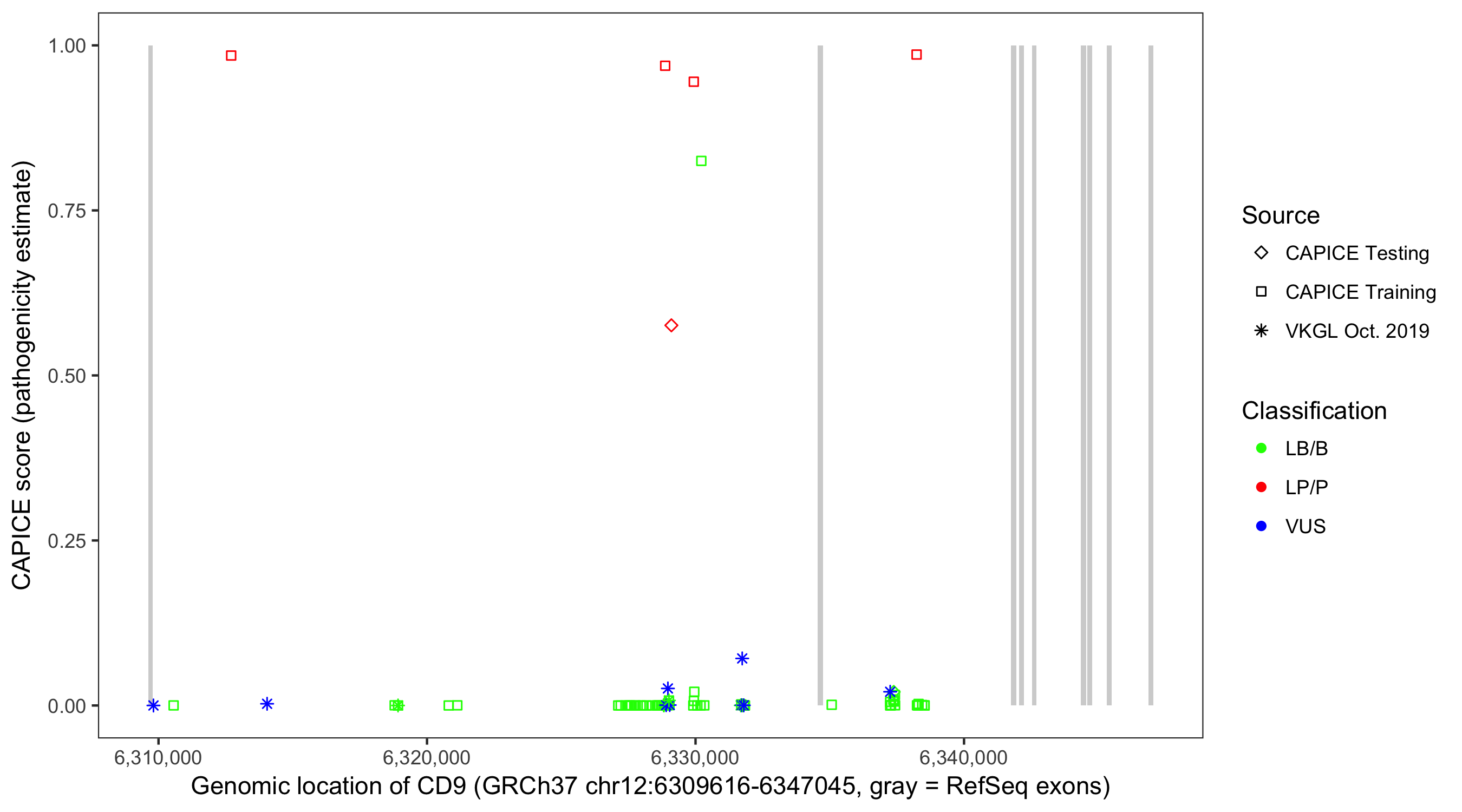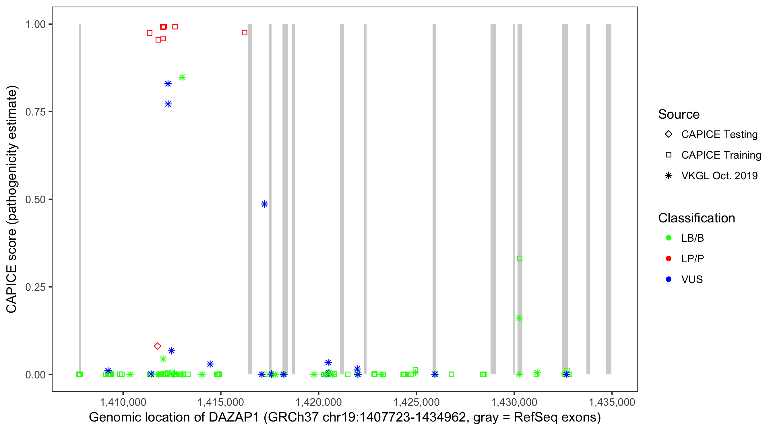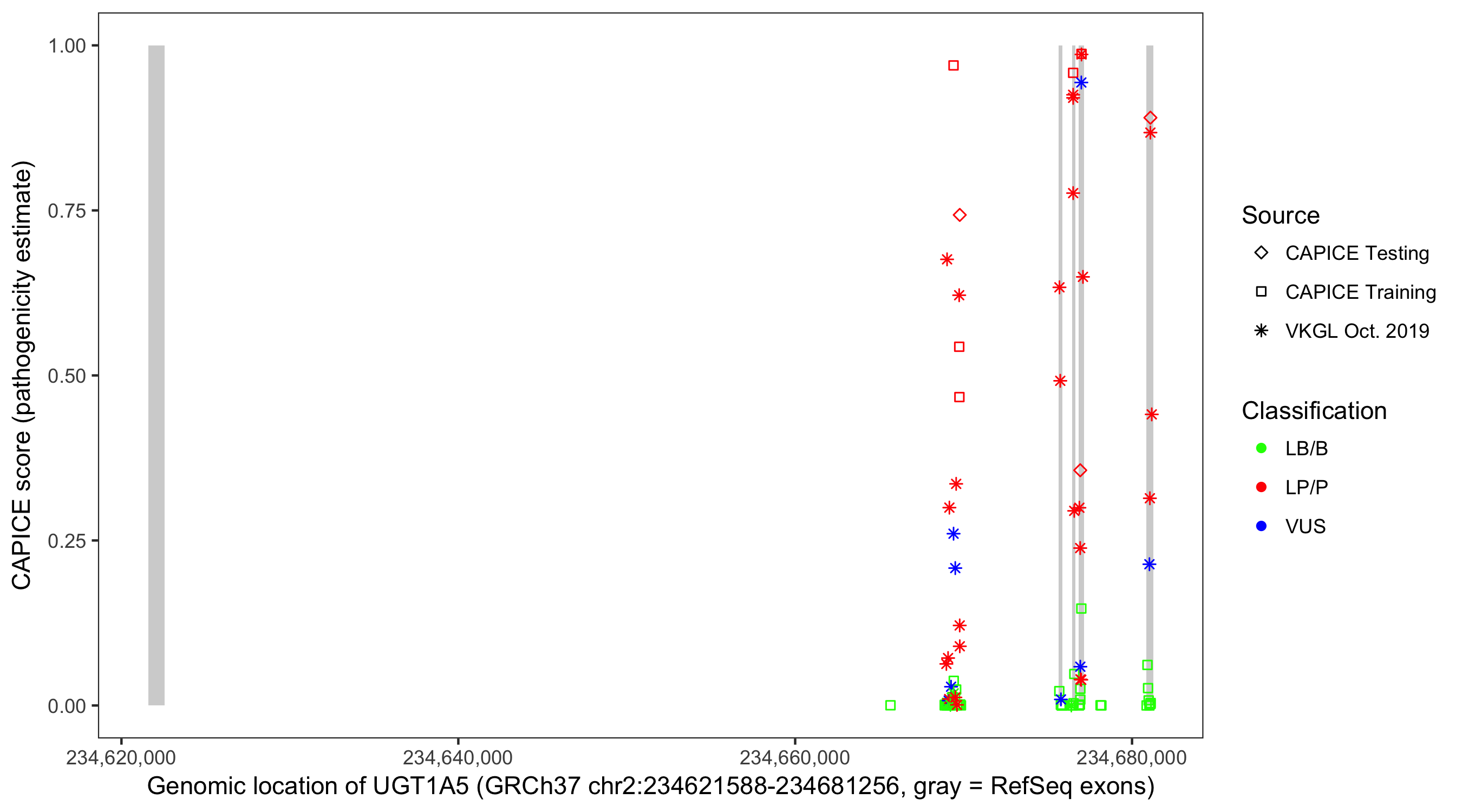Shown are CAPICE train/test variants plus VKGL Oct 2019.
