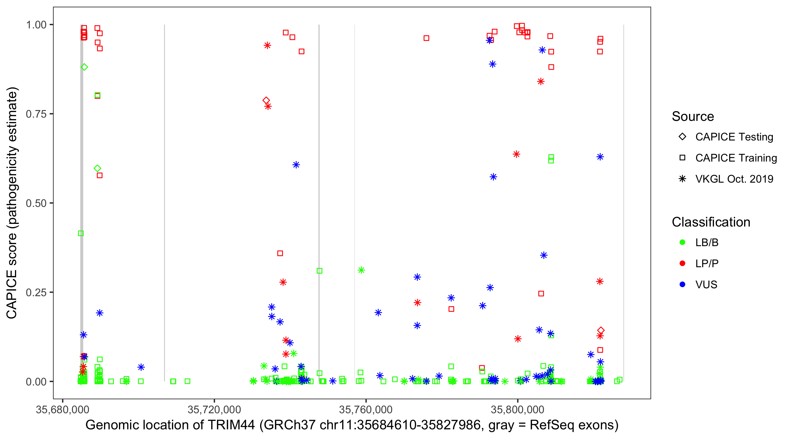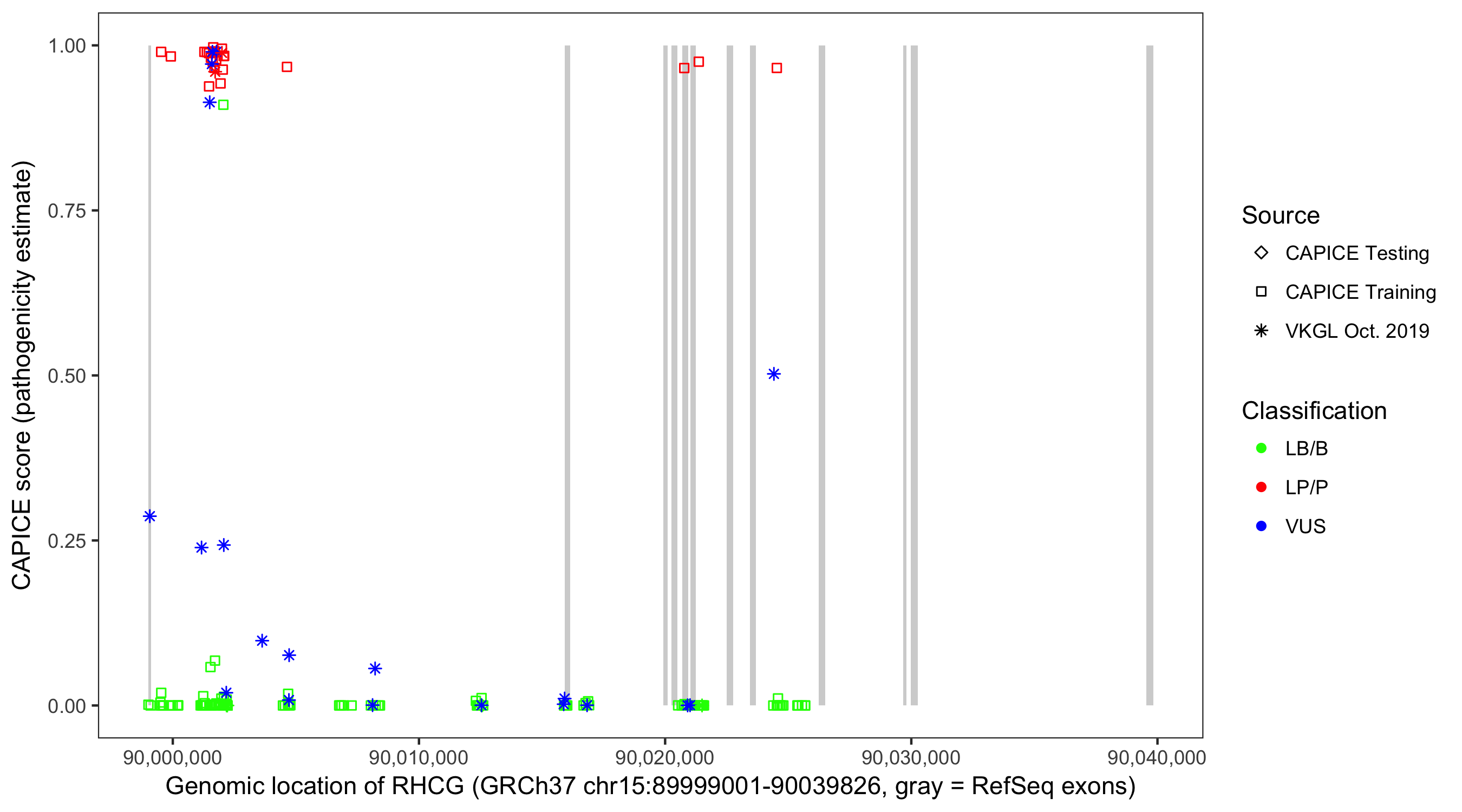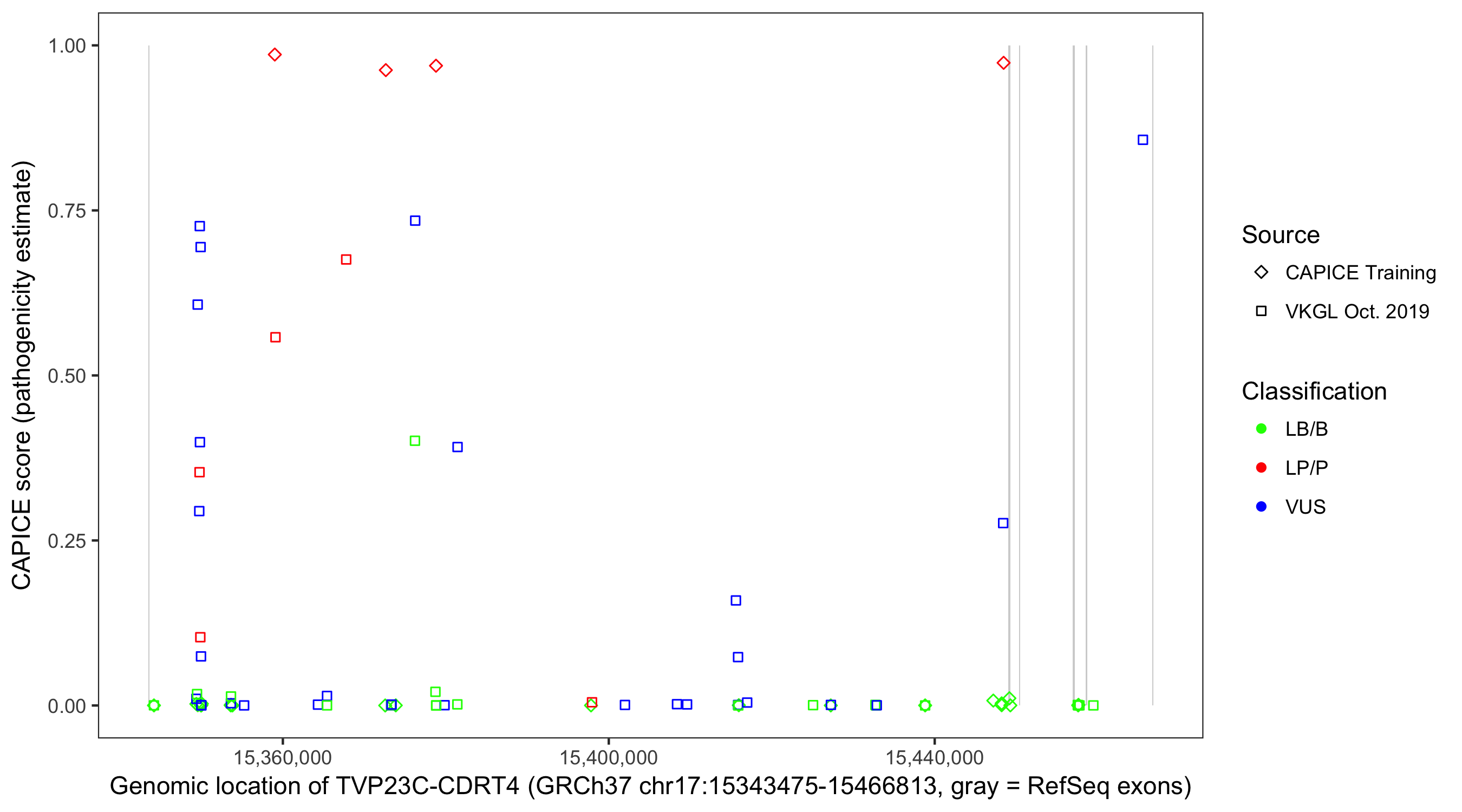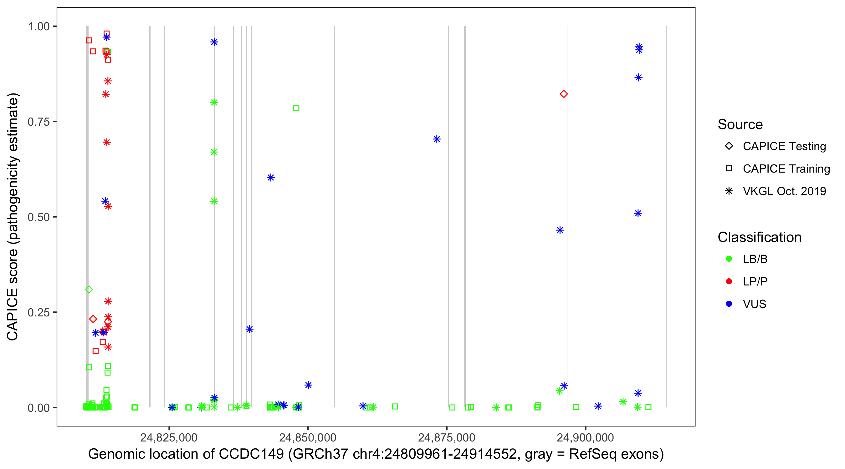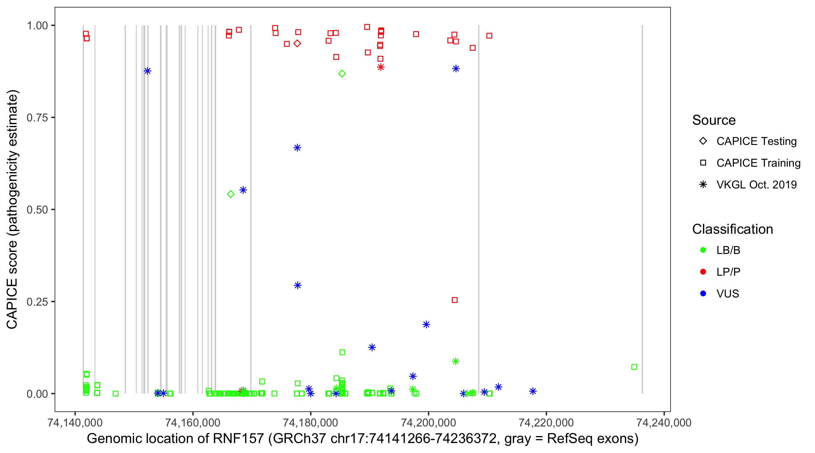 Shown are CAPICE train/test variants plus VKGL Oct 2019.