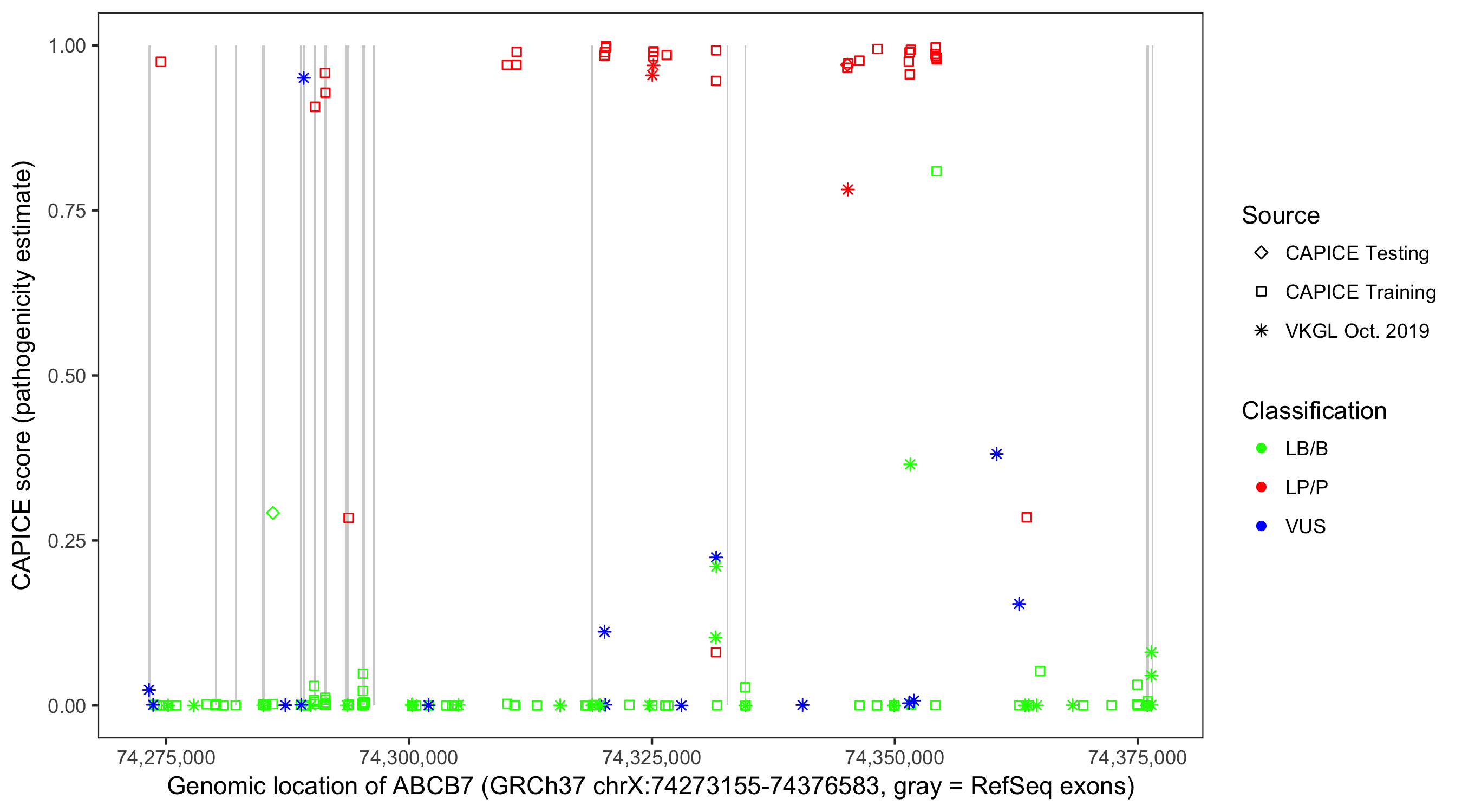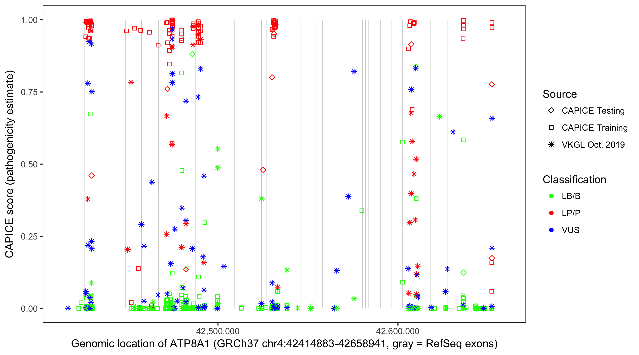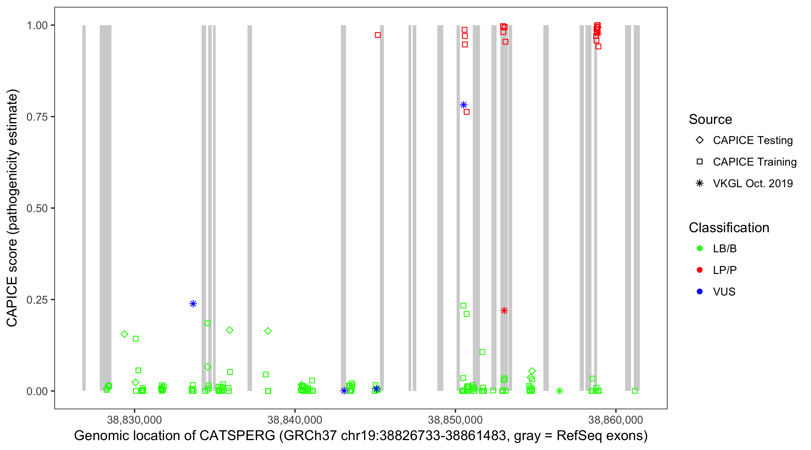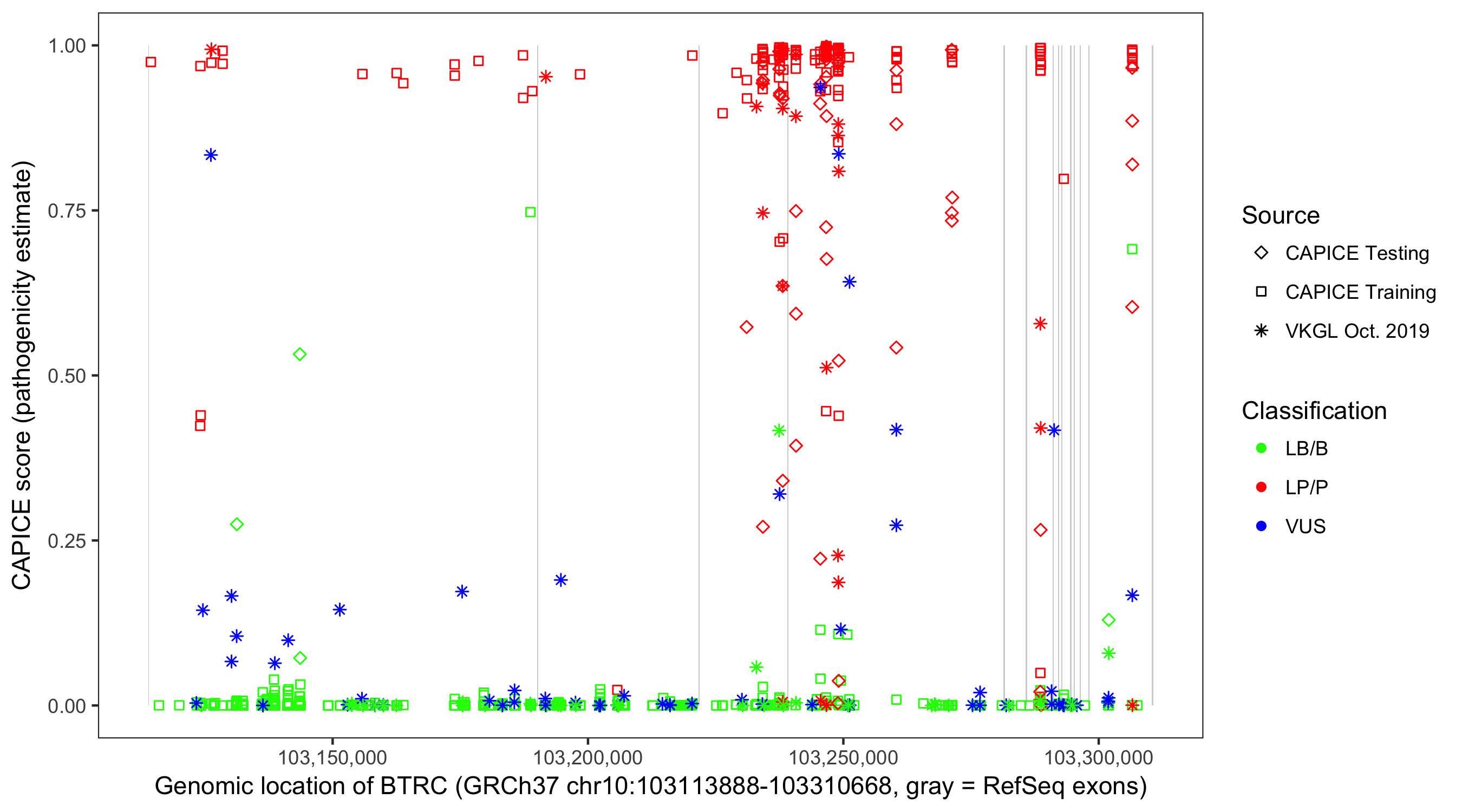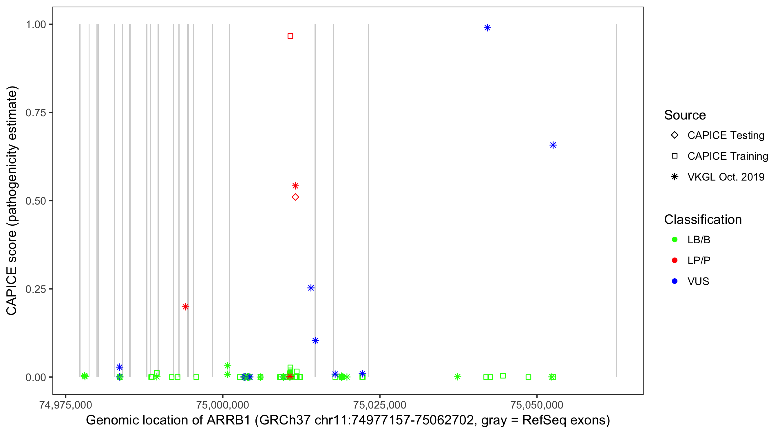 Shown are CAPICE train/test variants plus VKGL Oct 2019.