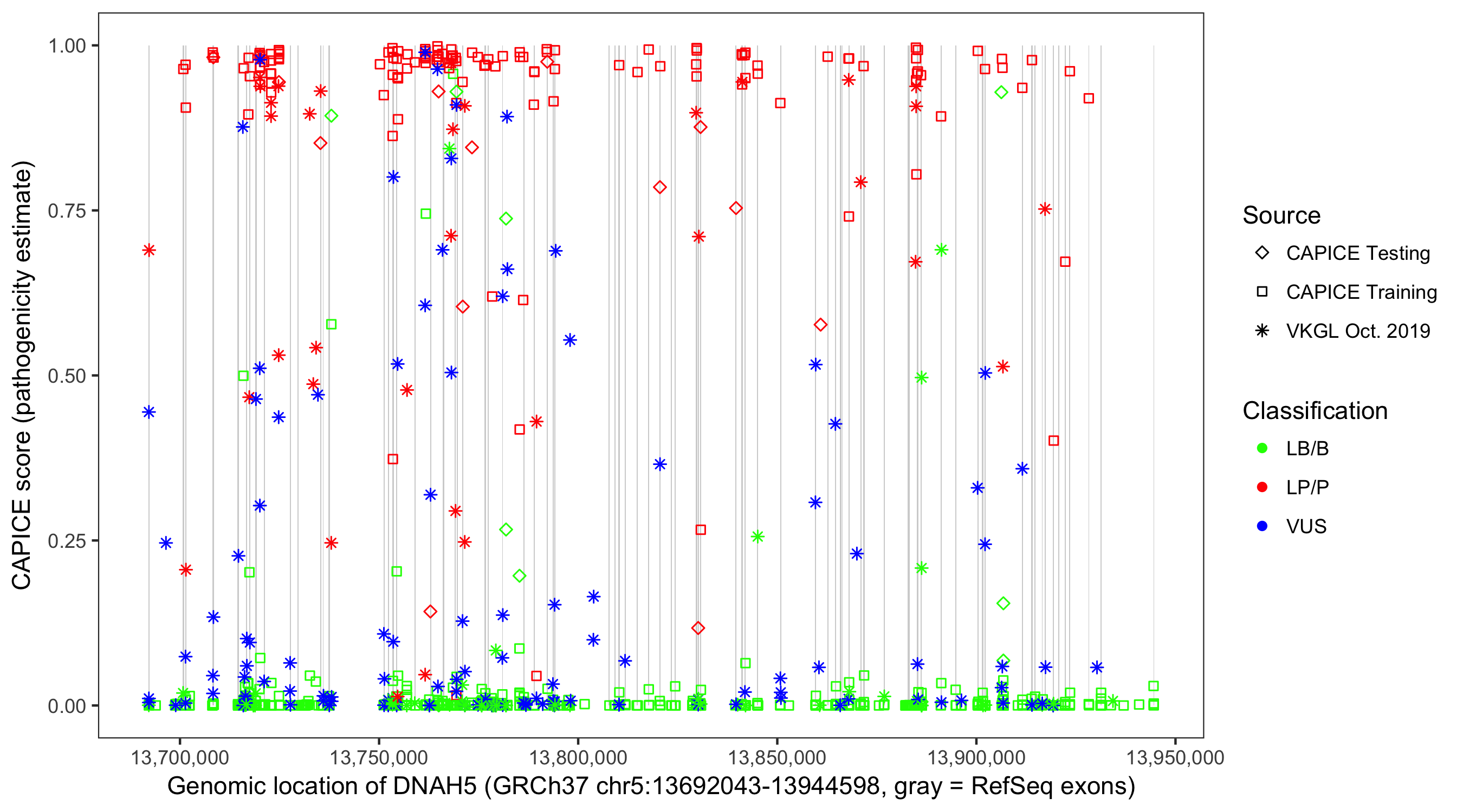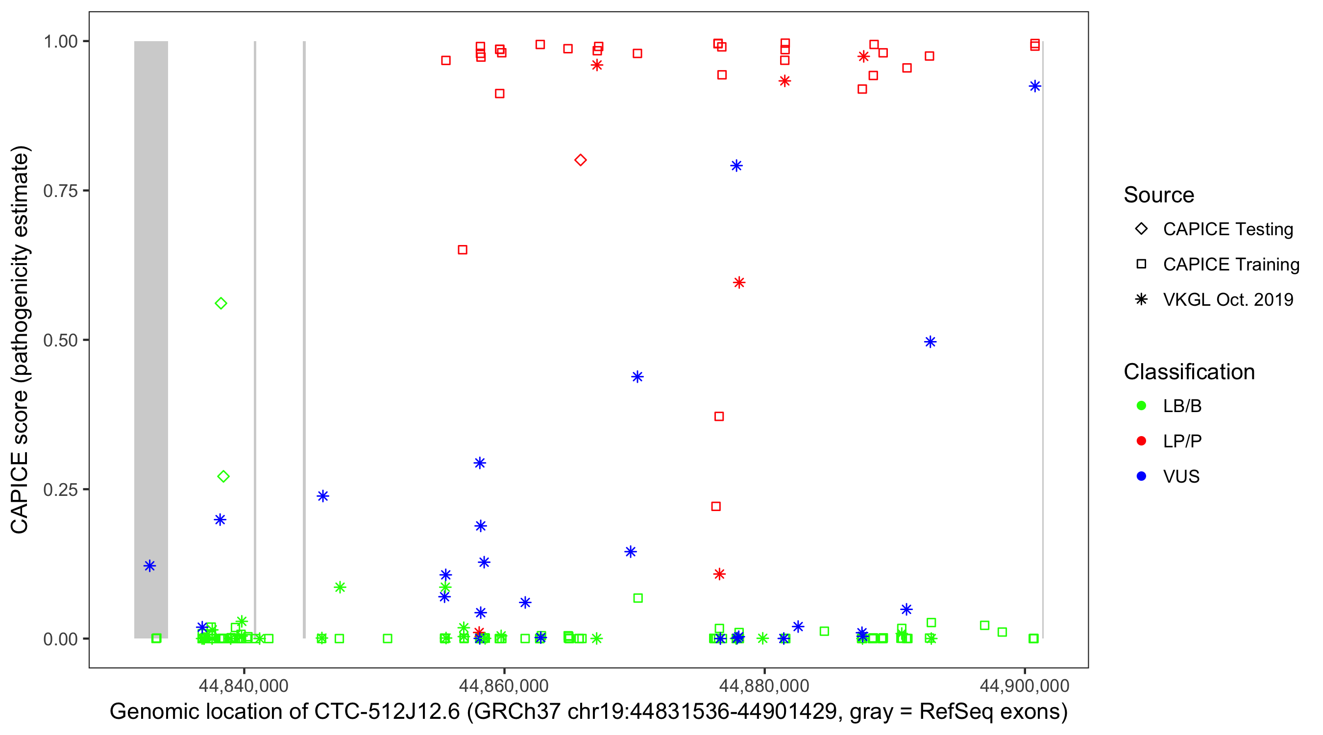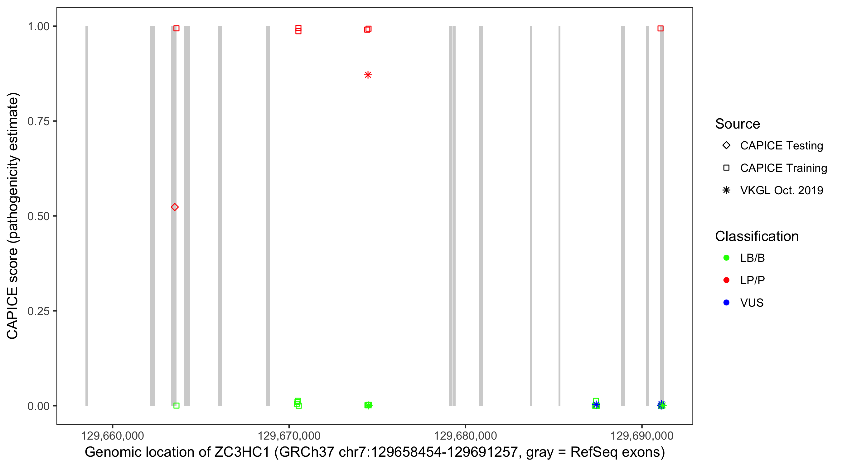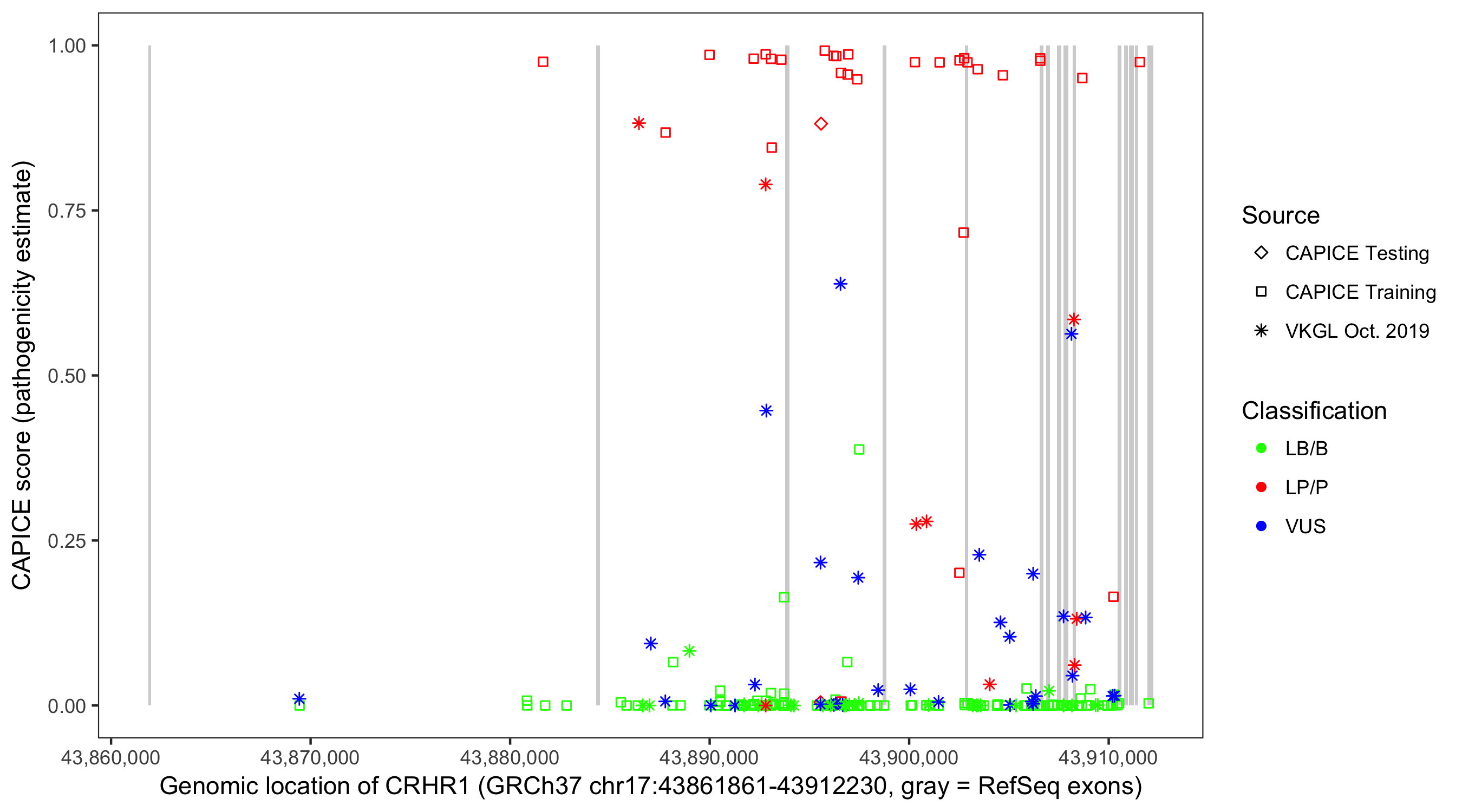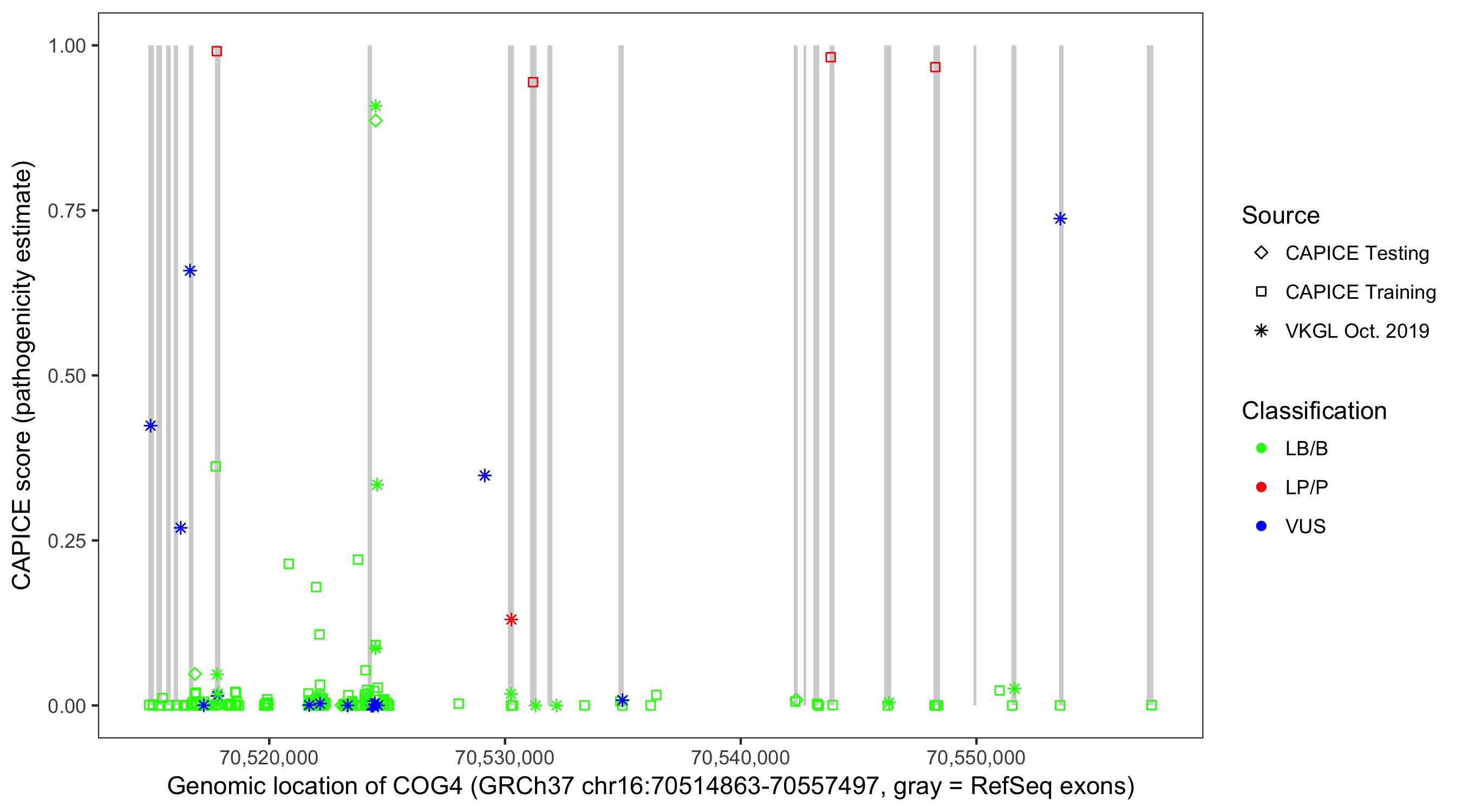 Shown are CAPICE train/test variants plus VKGL Oct 2019.