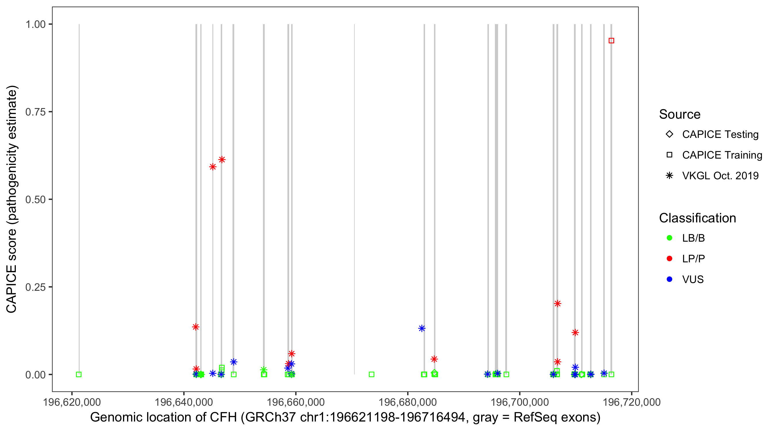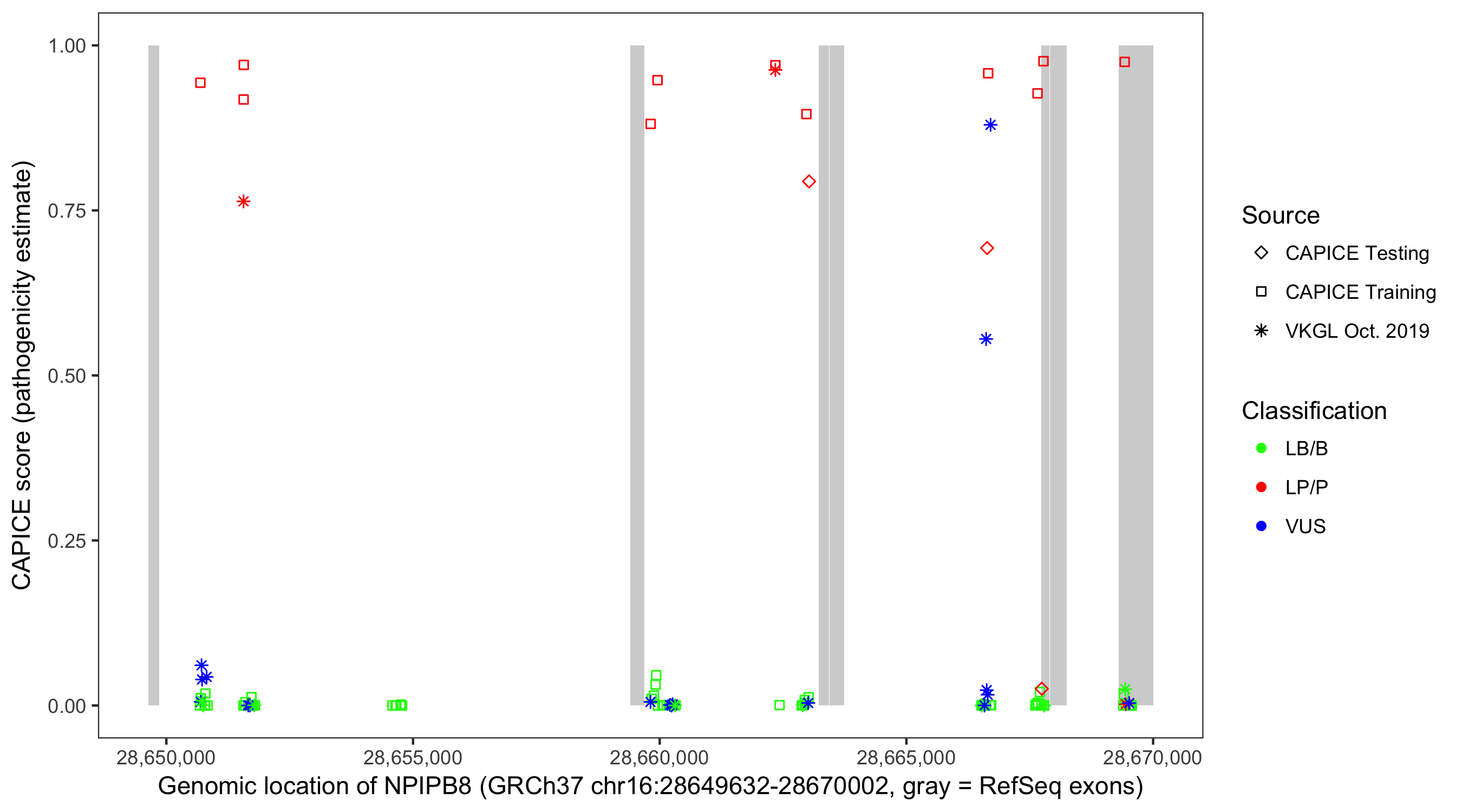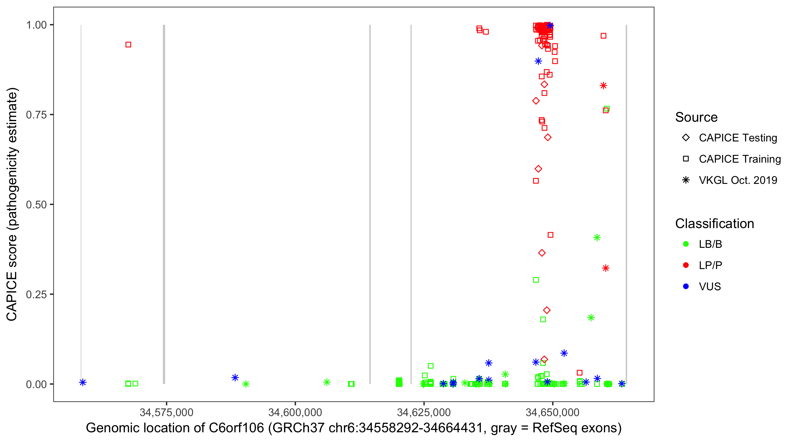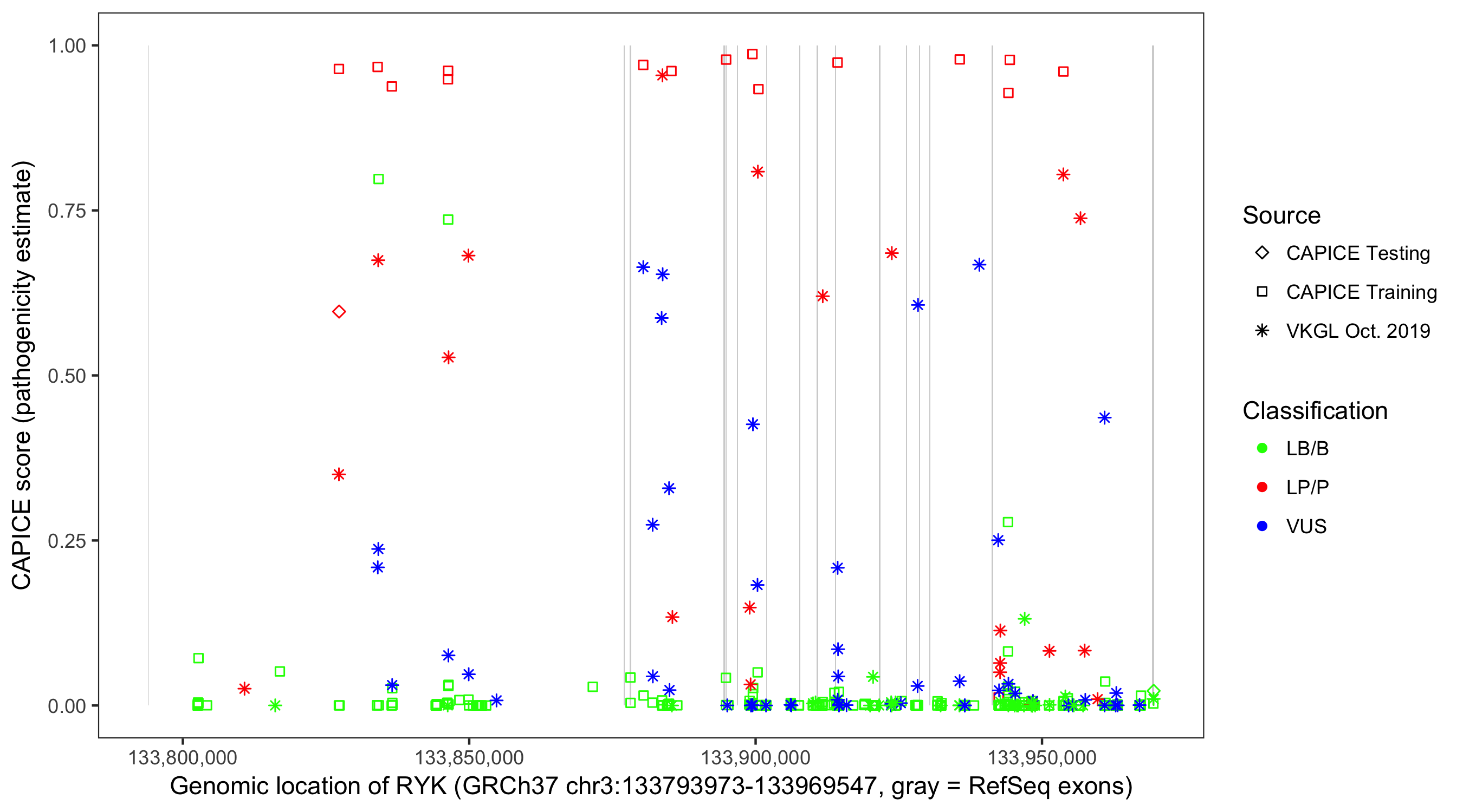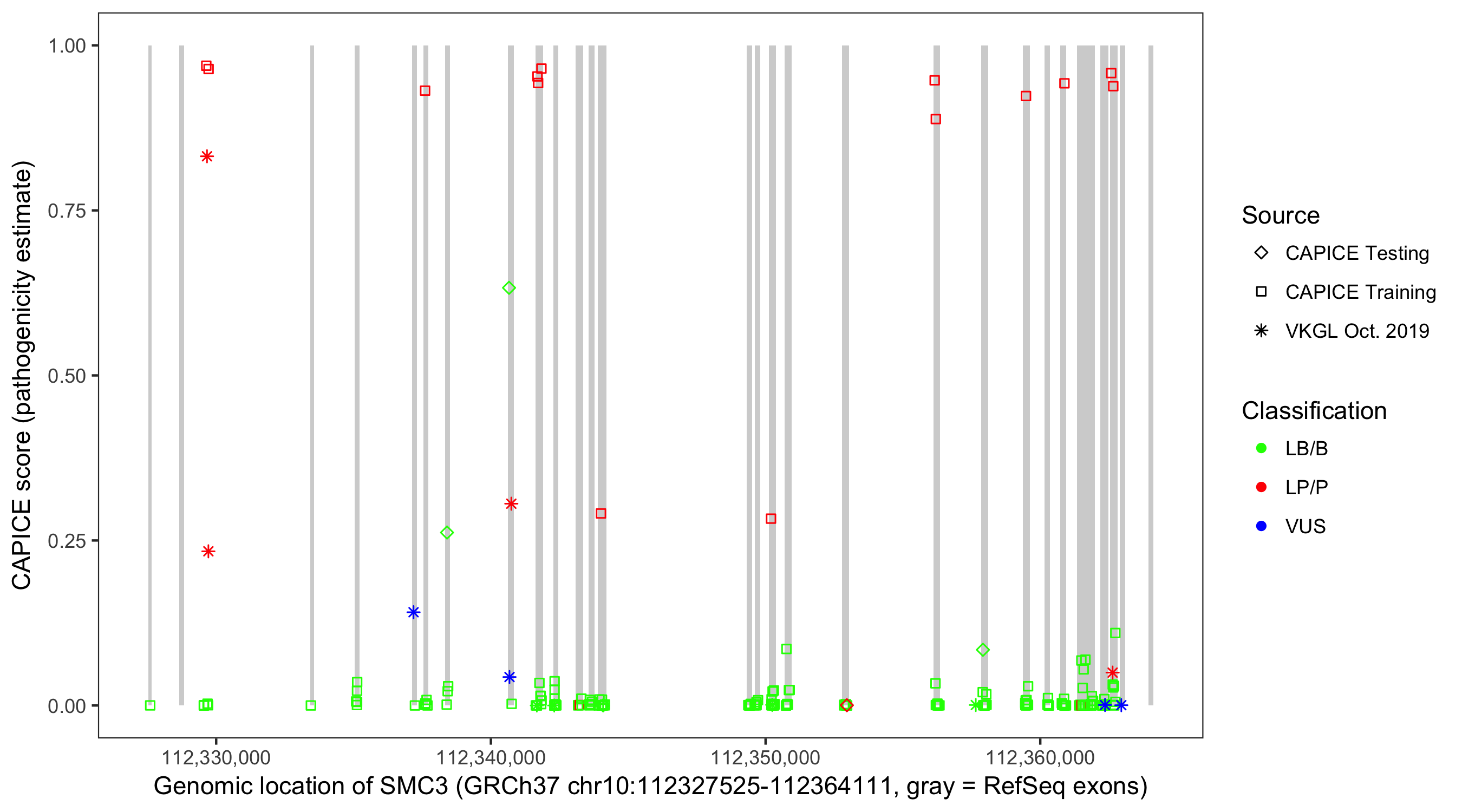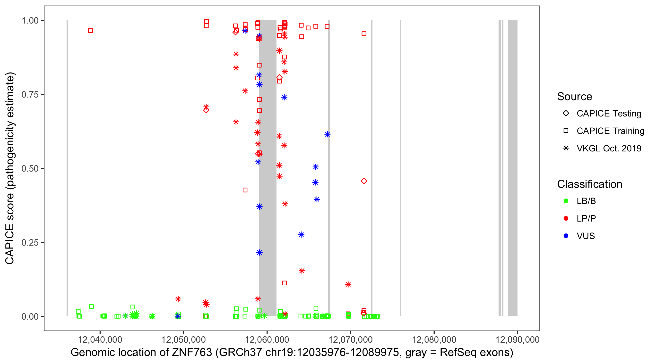 Shown are CAPICE train/test variants plus VKGL Oct 2019.