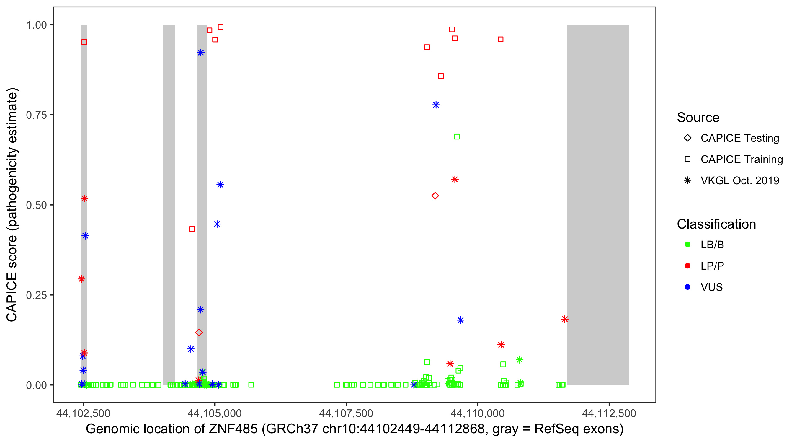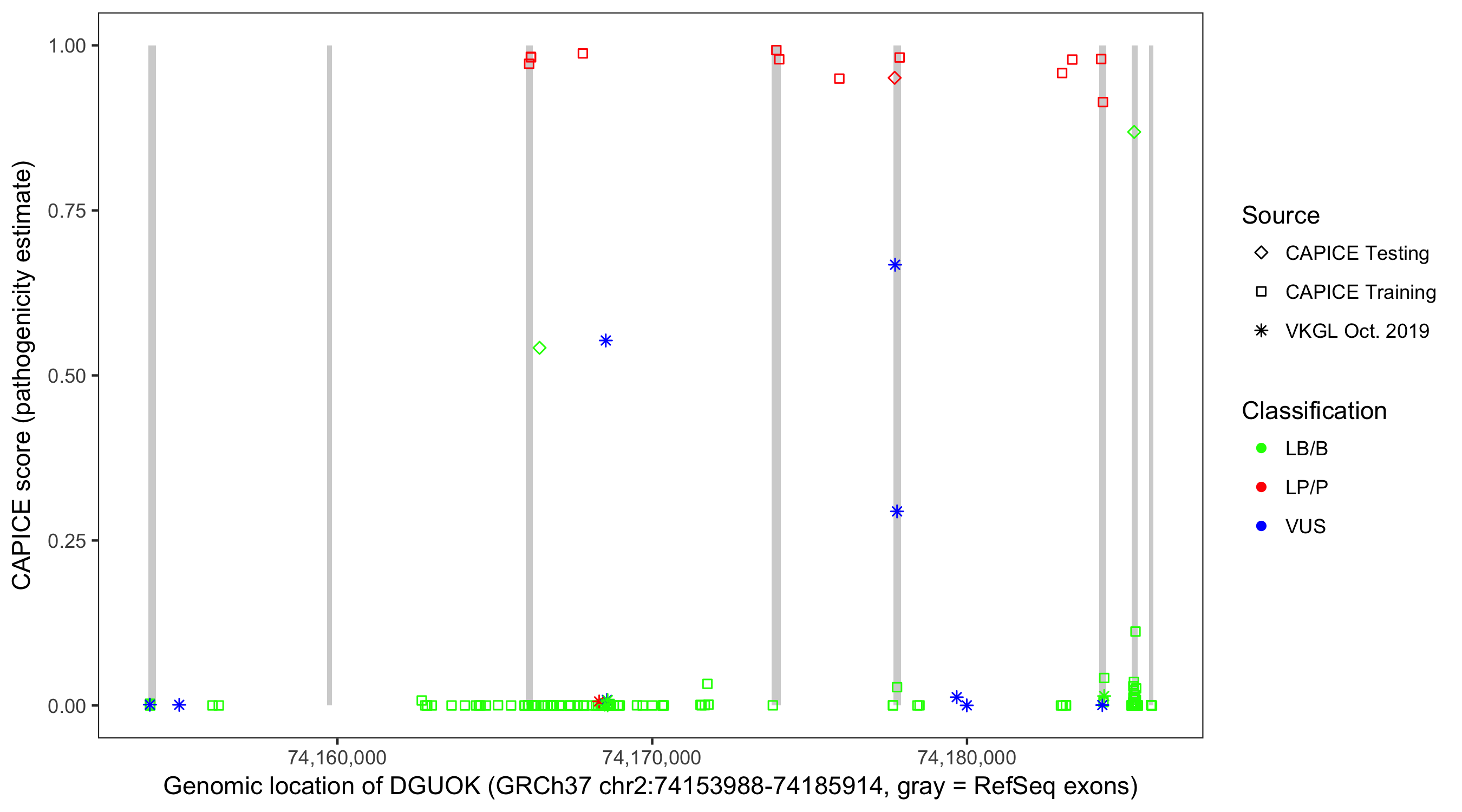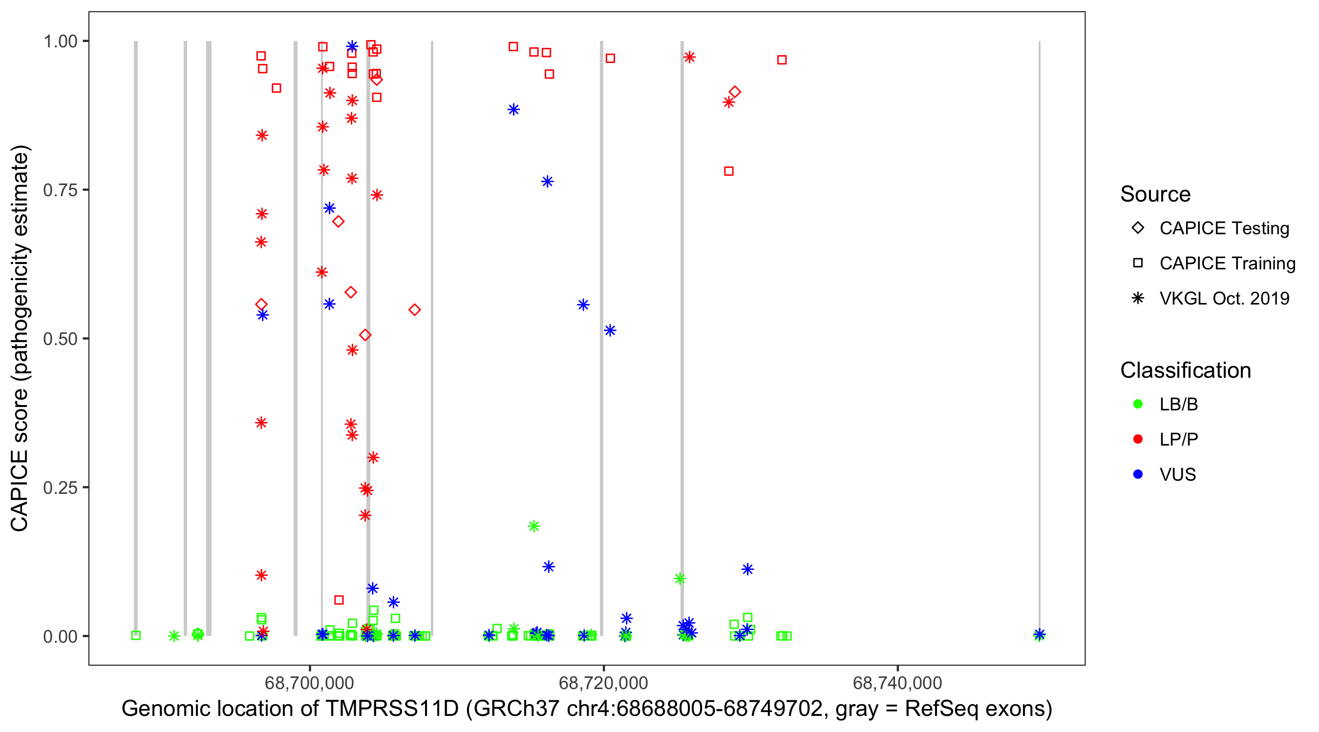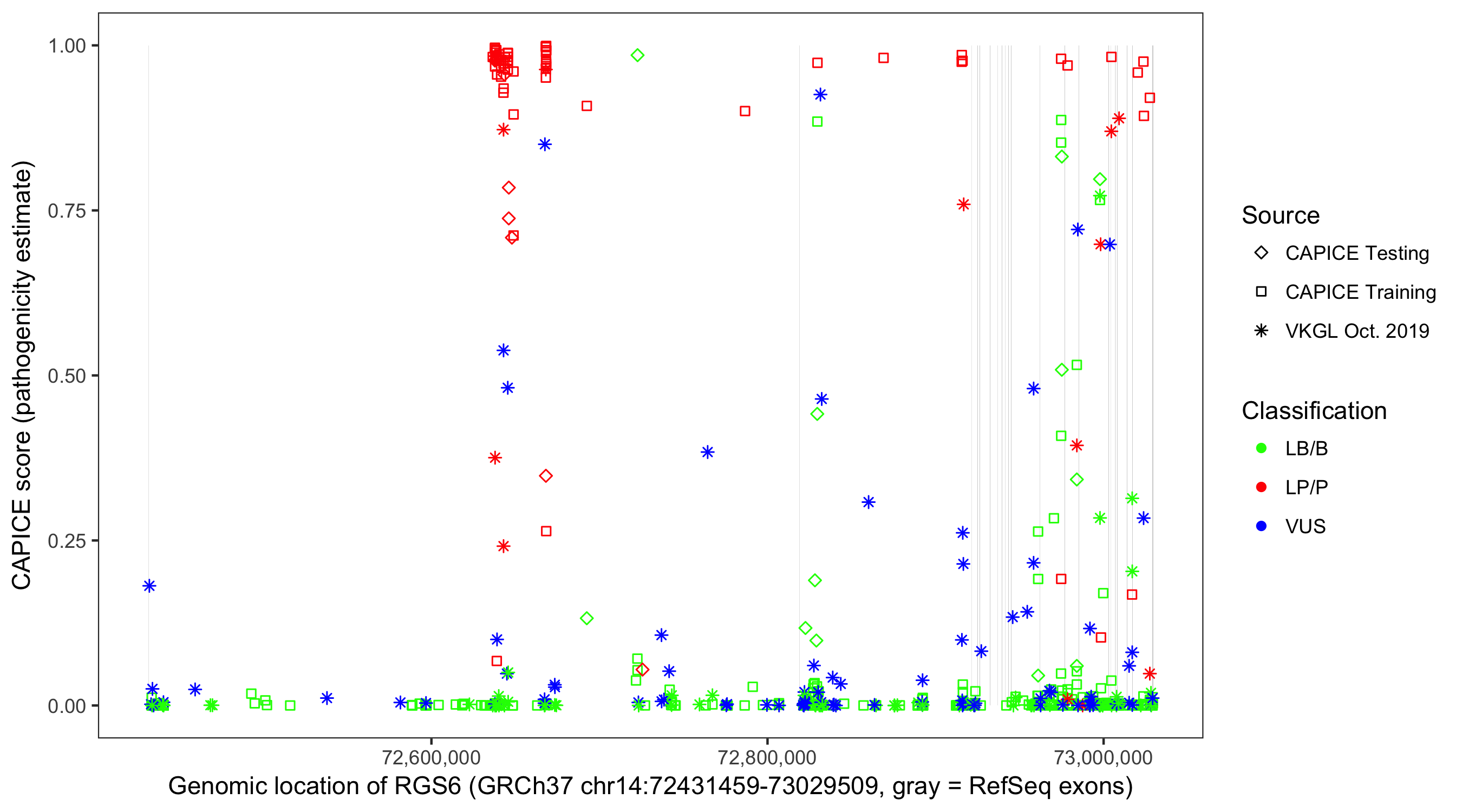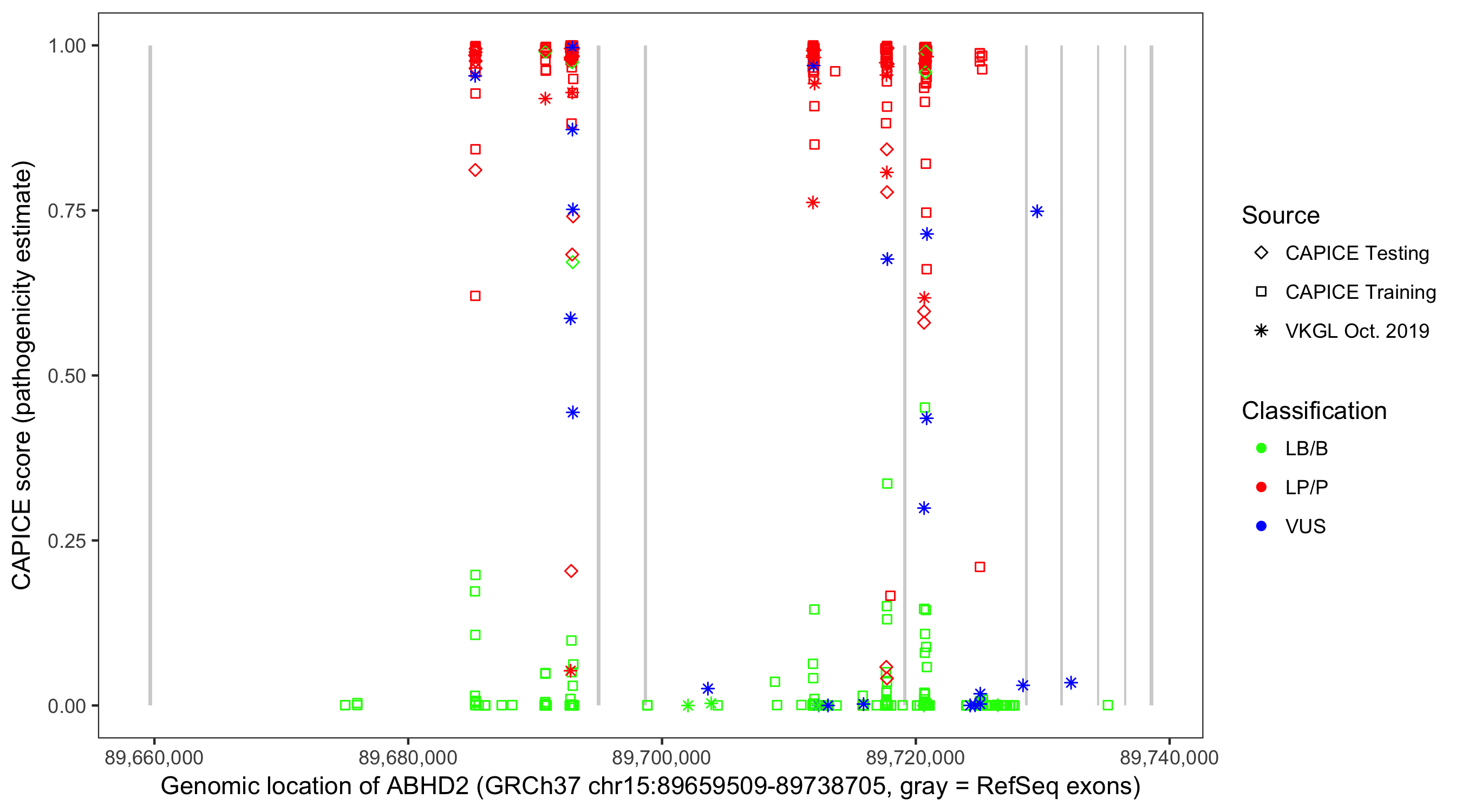 Shown are CAPICE train/test variants plus VKGL Oct 2019.