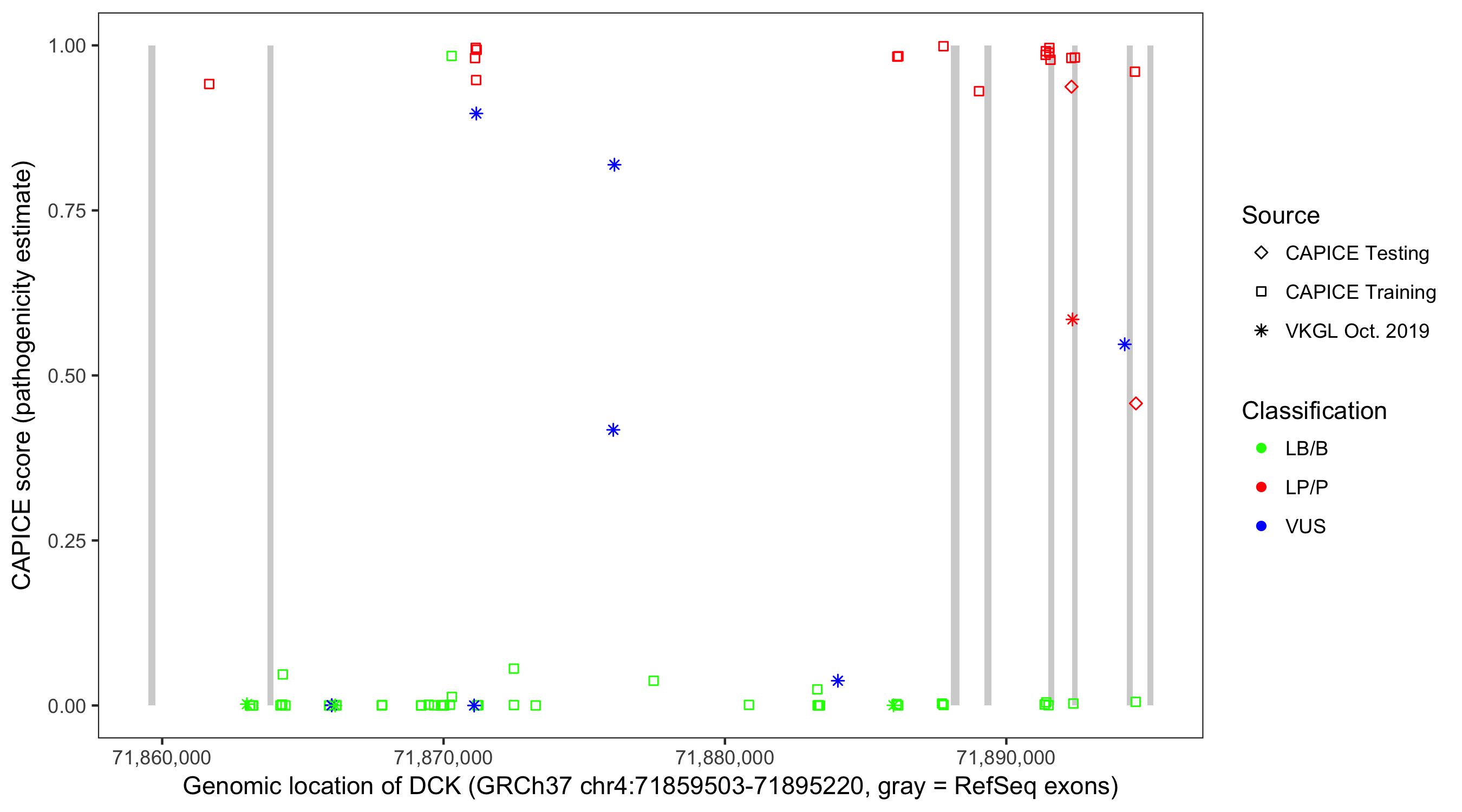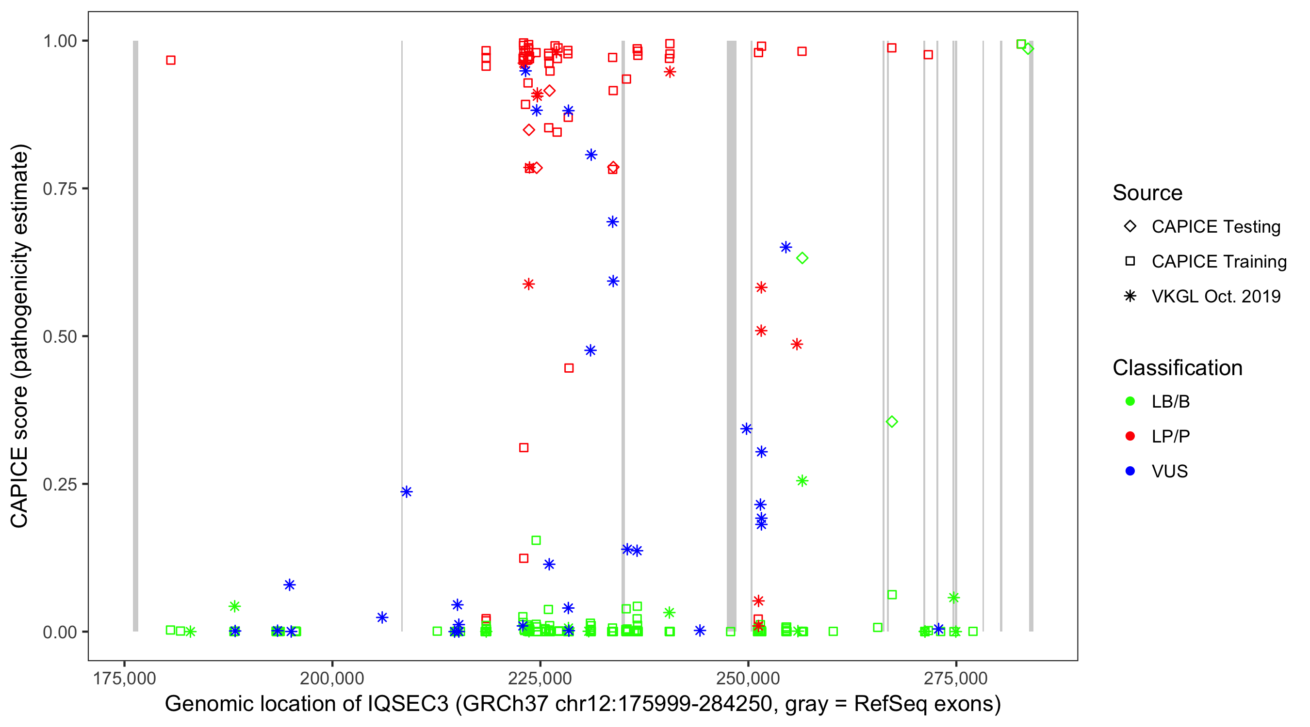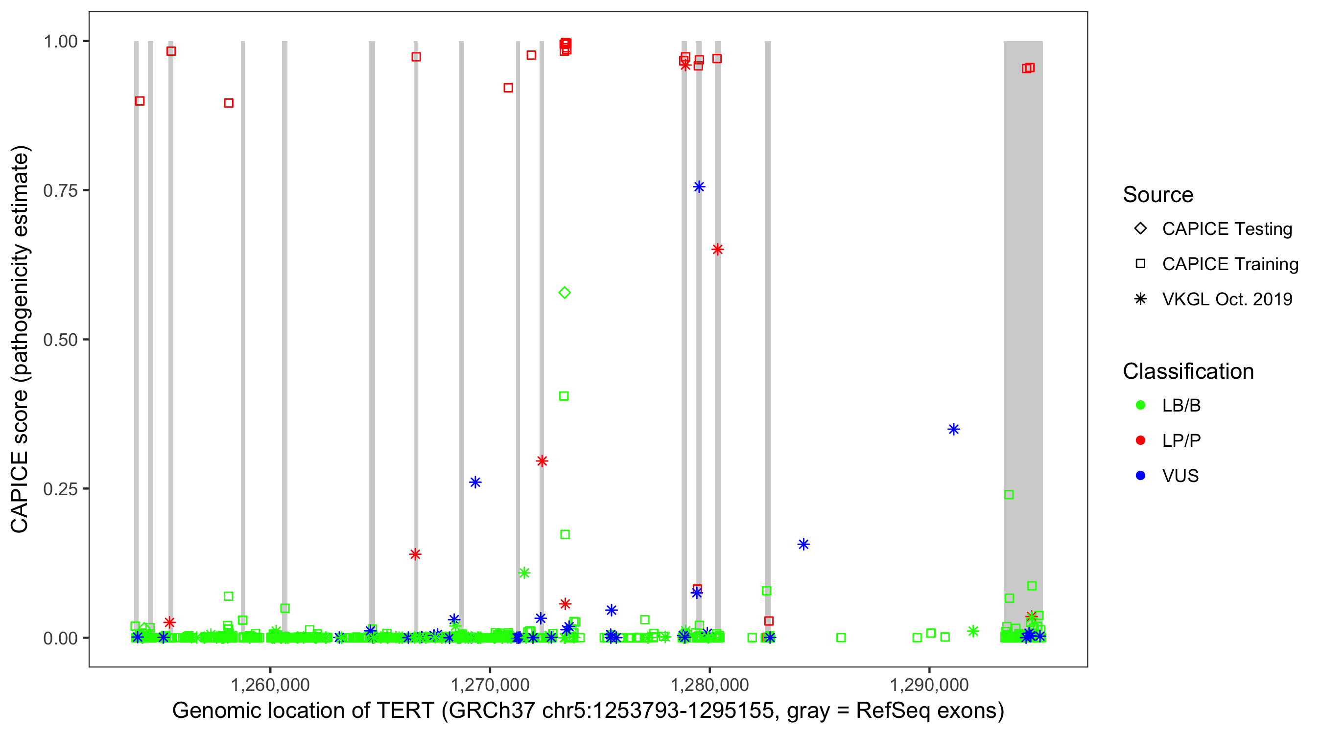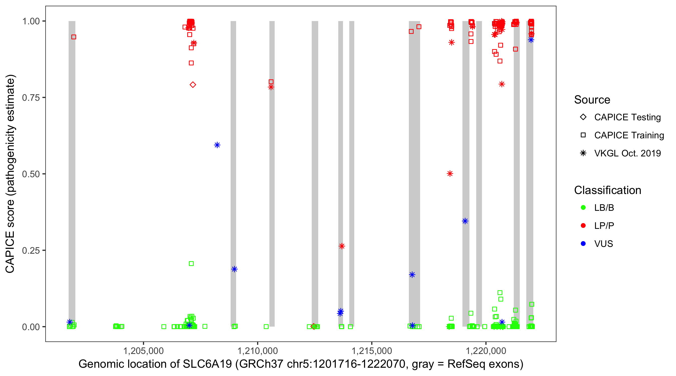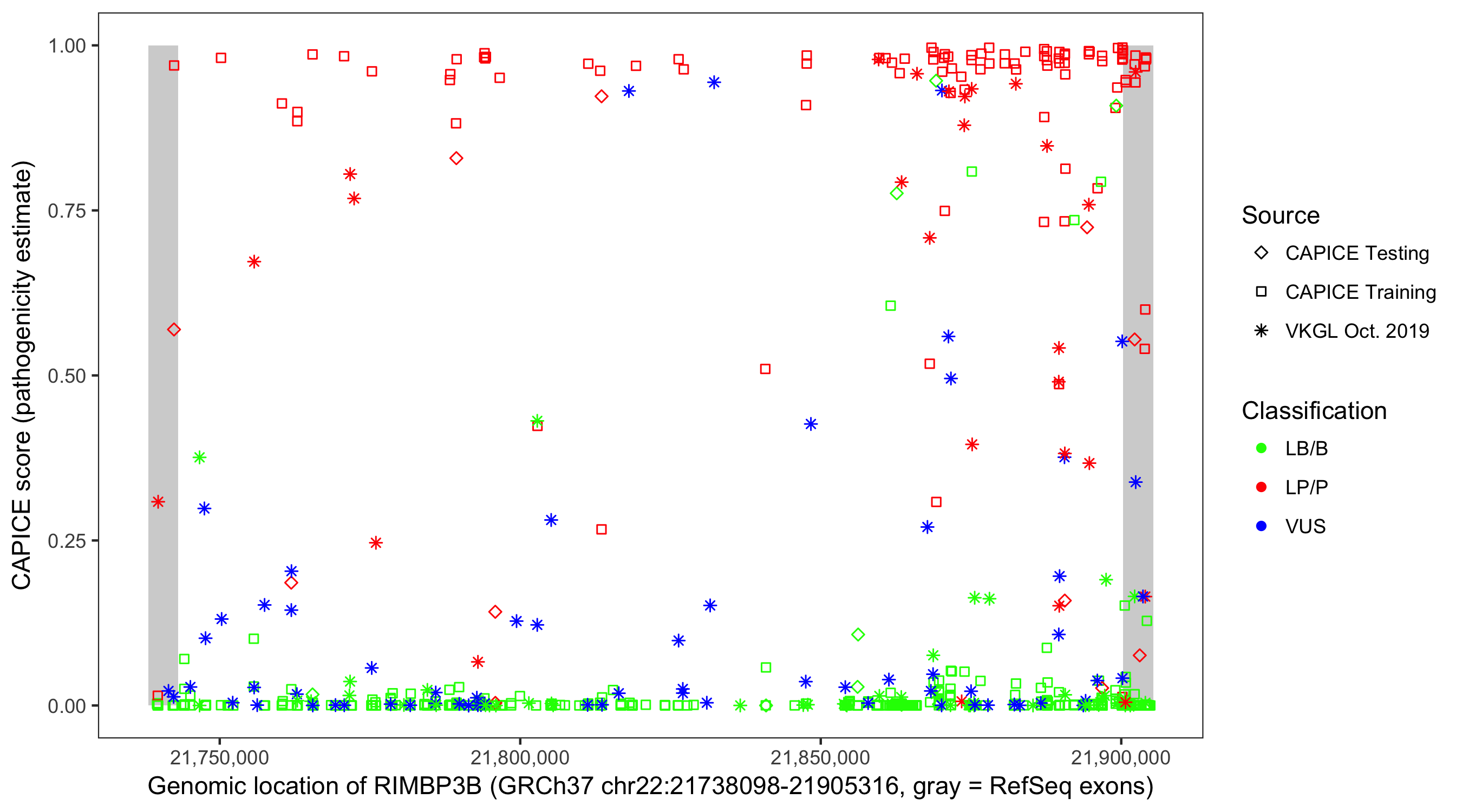 Shown are CAPICE train/test variants plus VKGL Oct 2019.