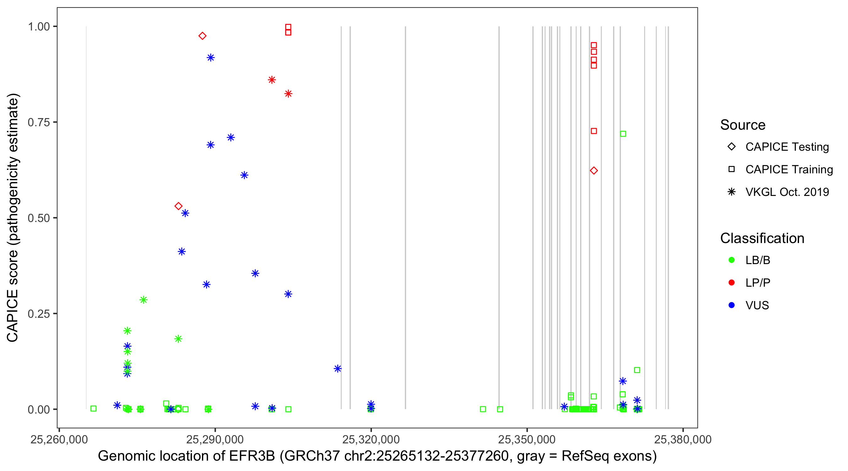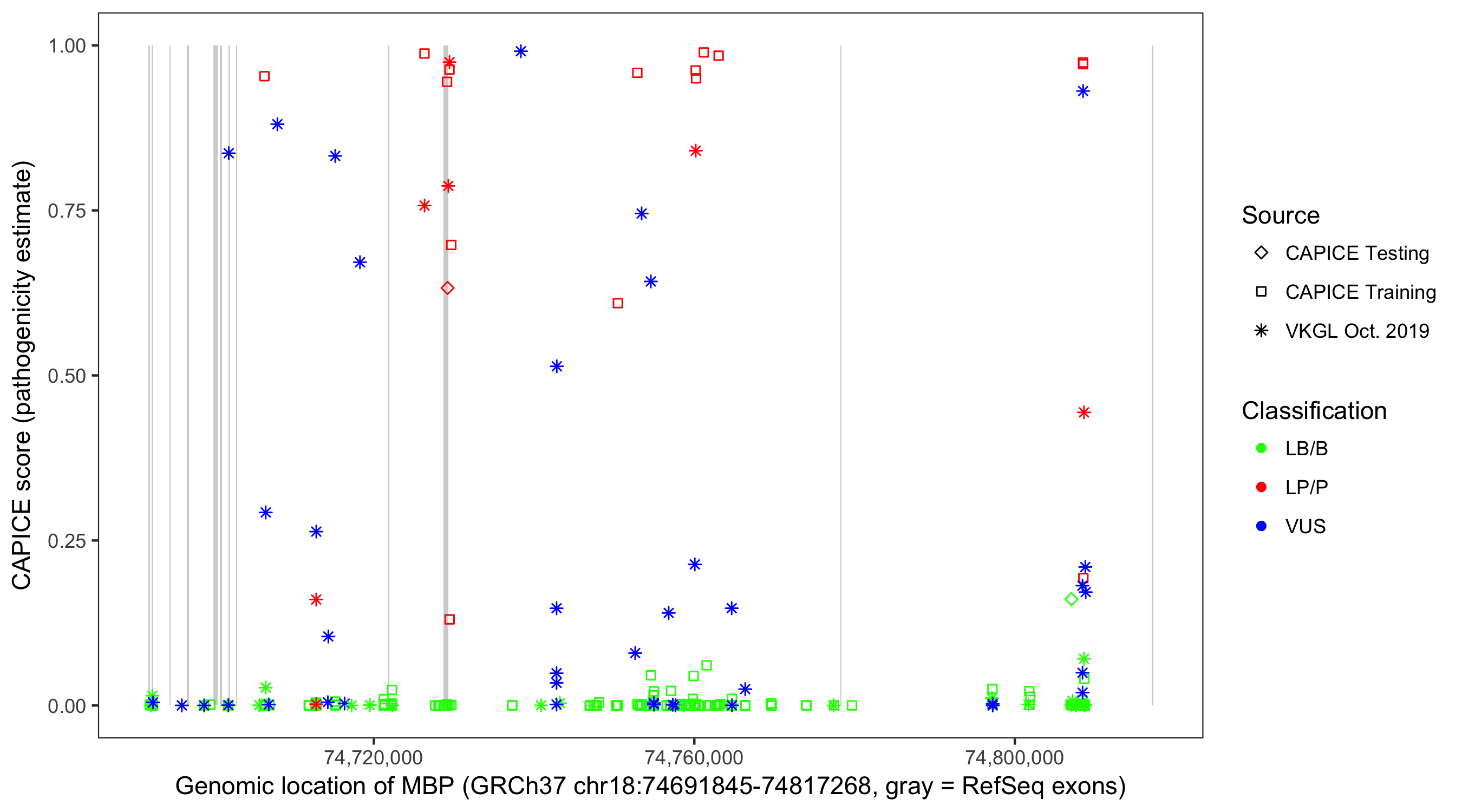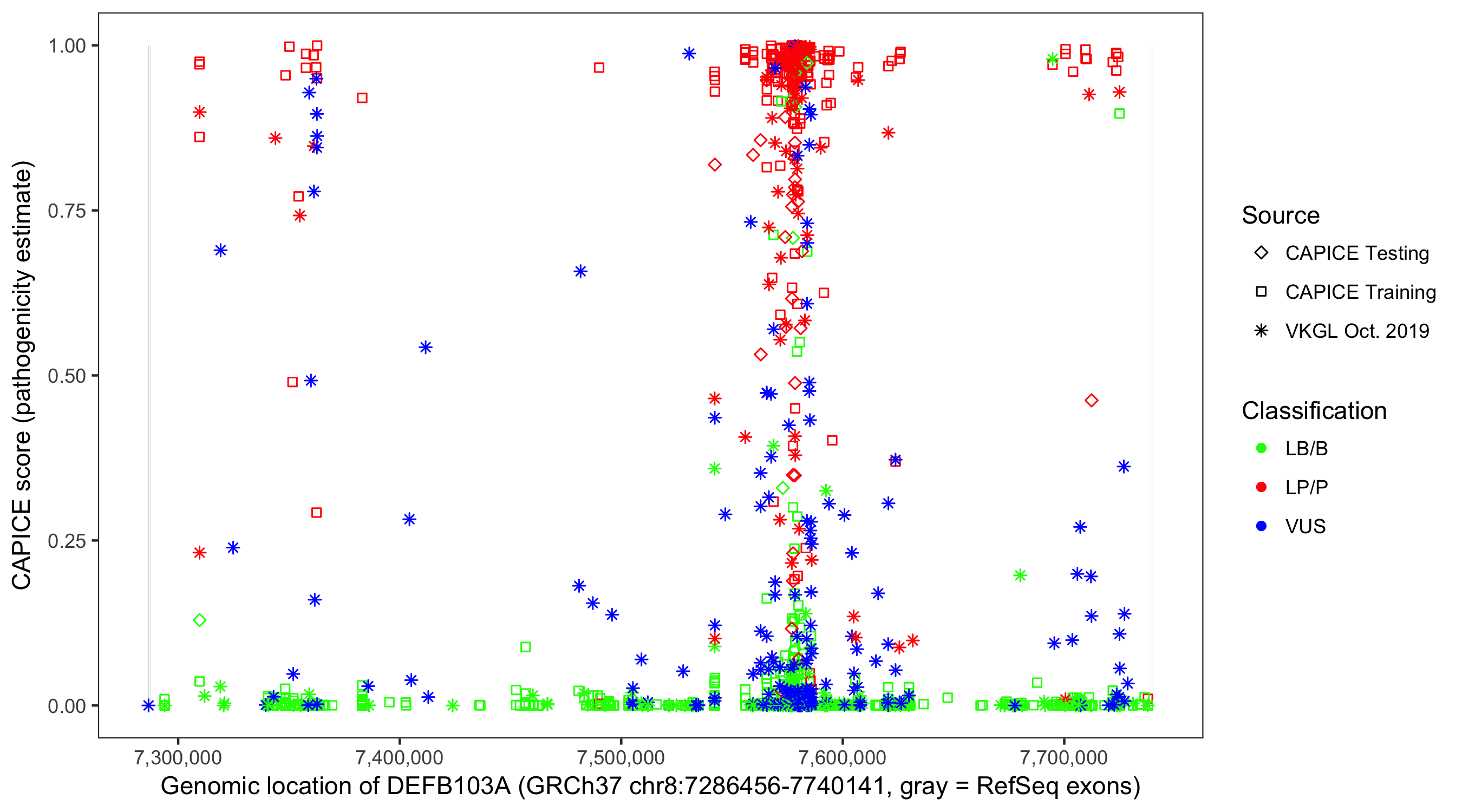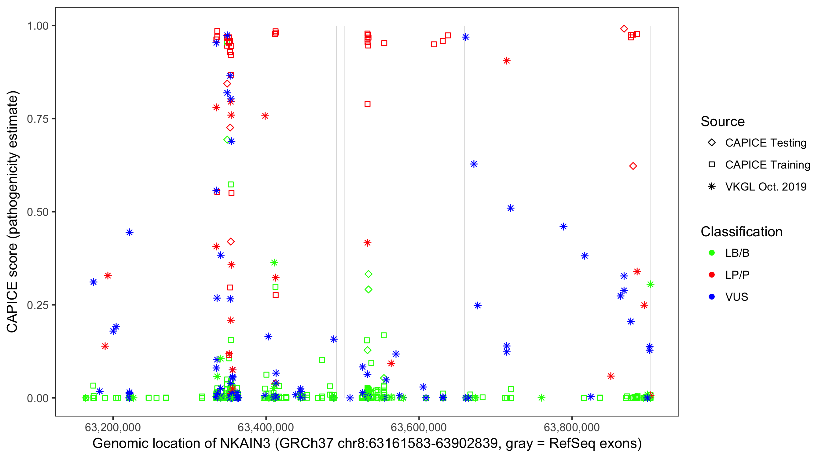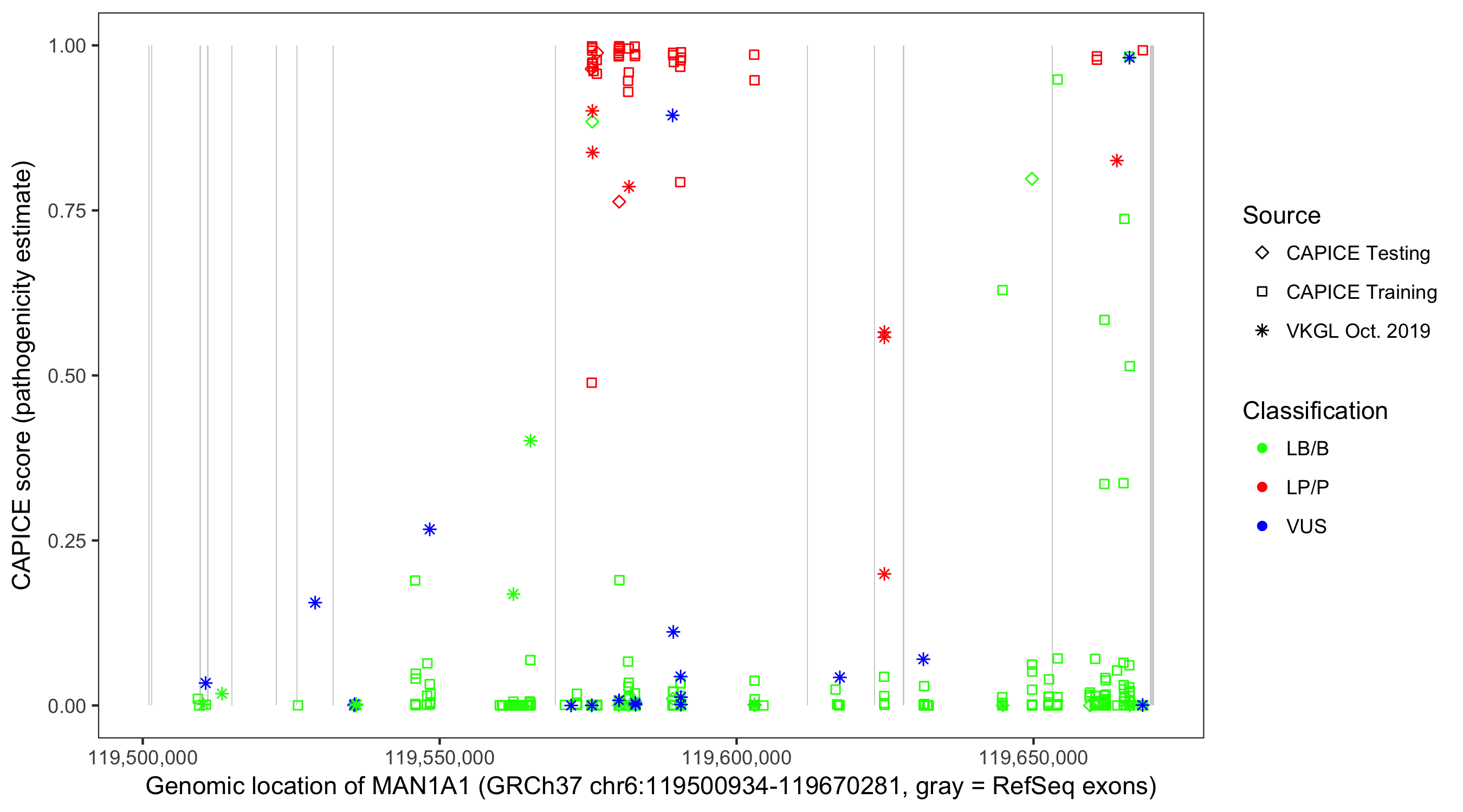 Shown are CAPICE train/test variants plus VKGL Oct 2019.