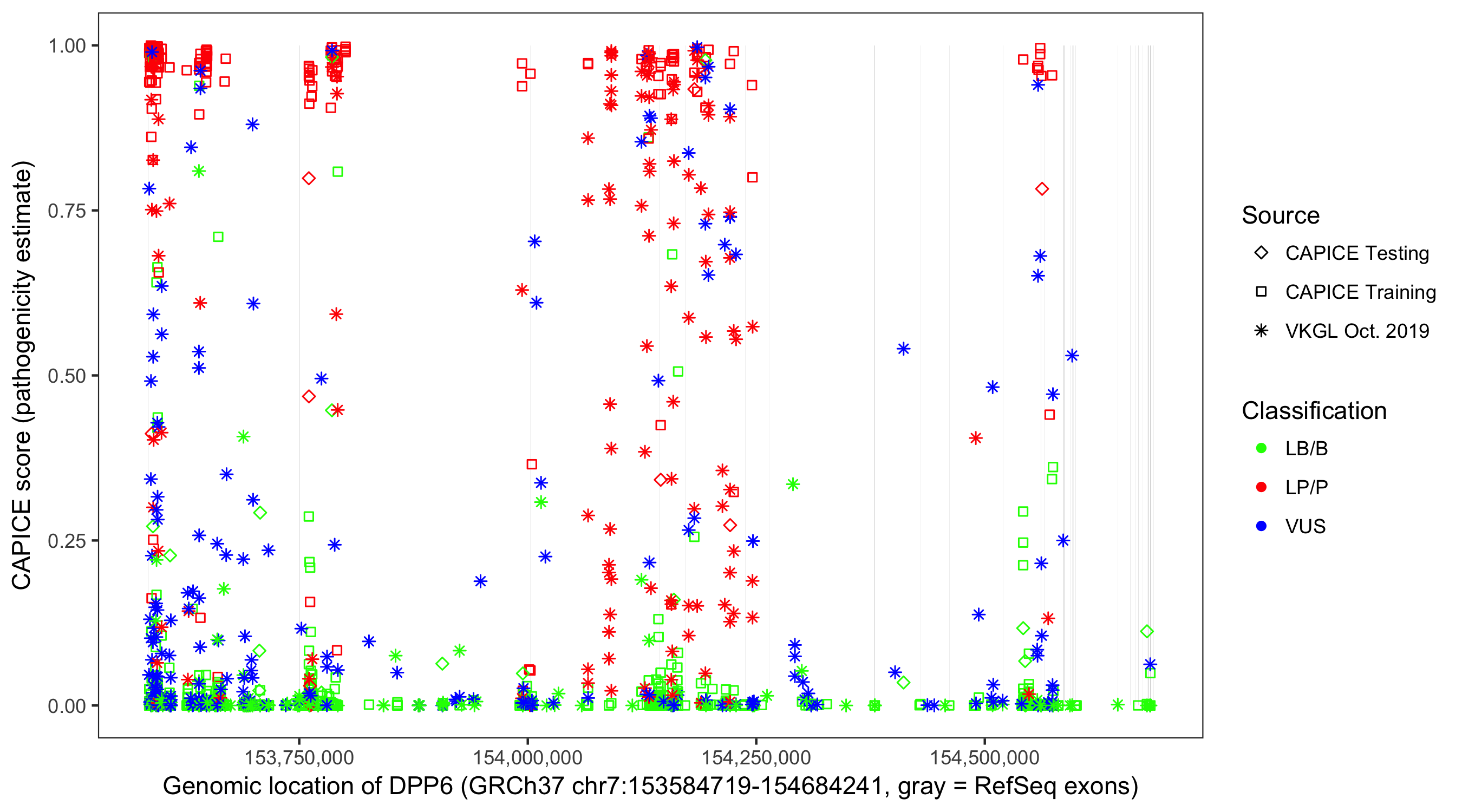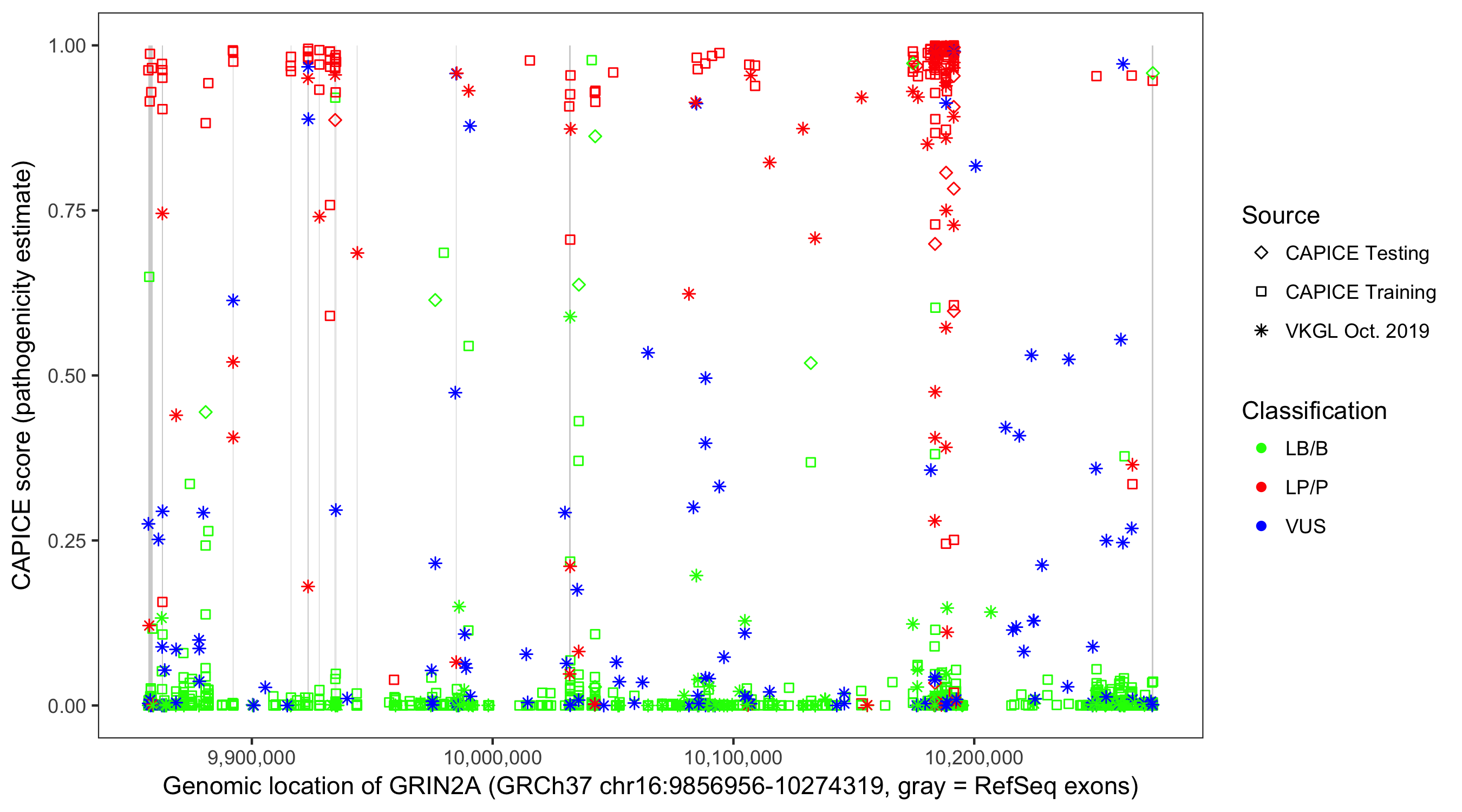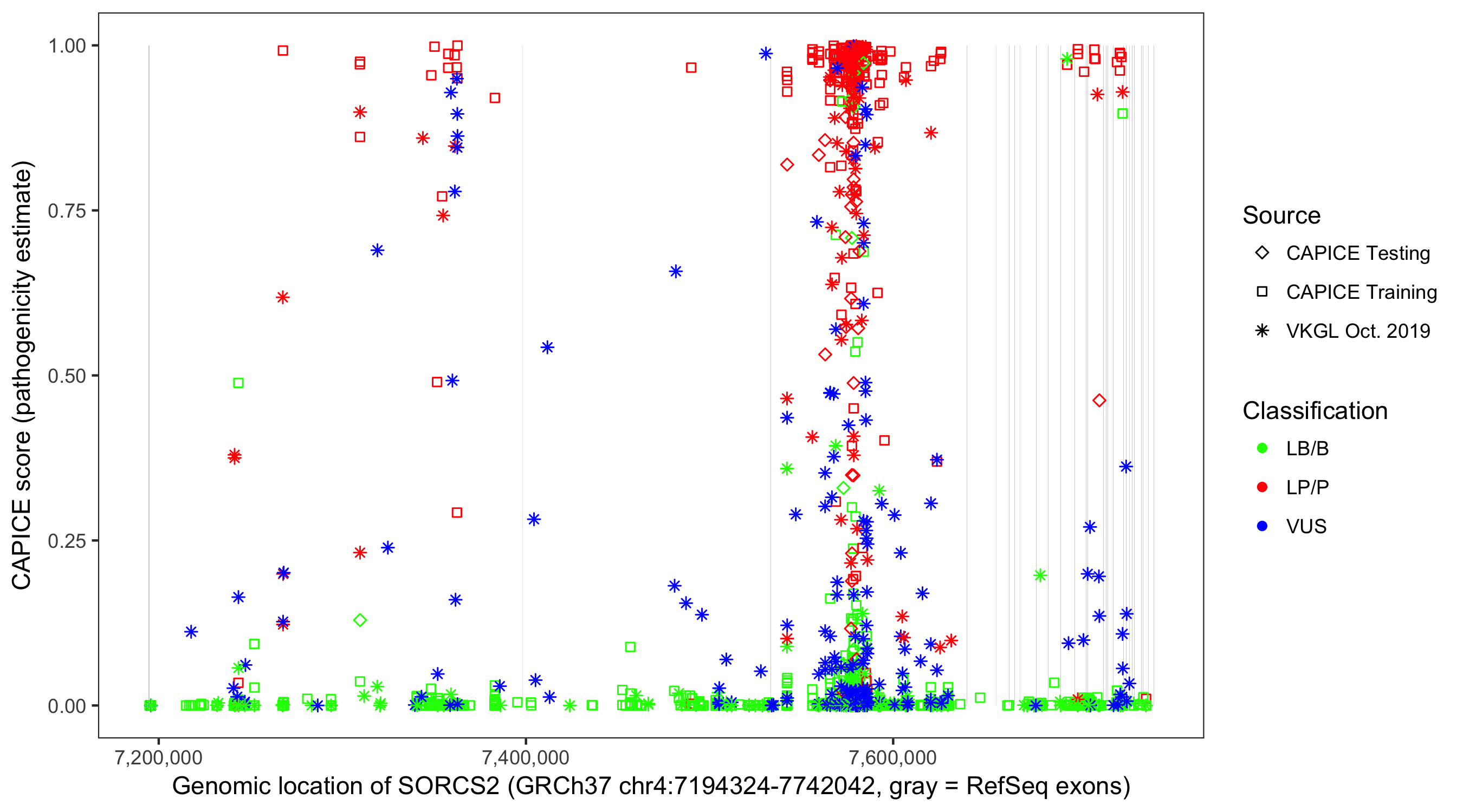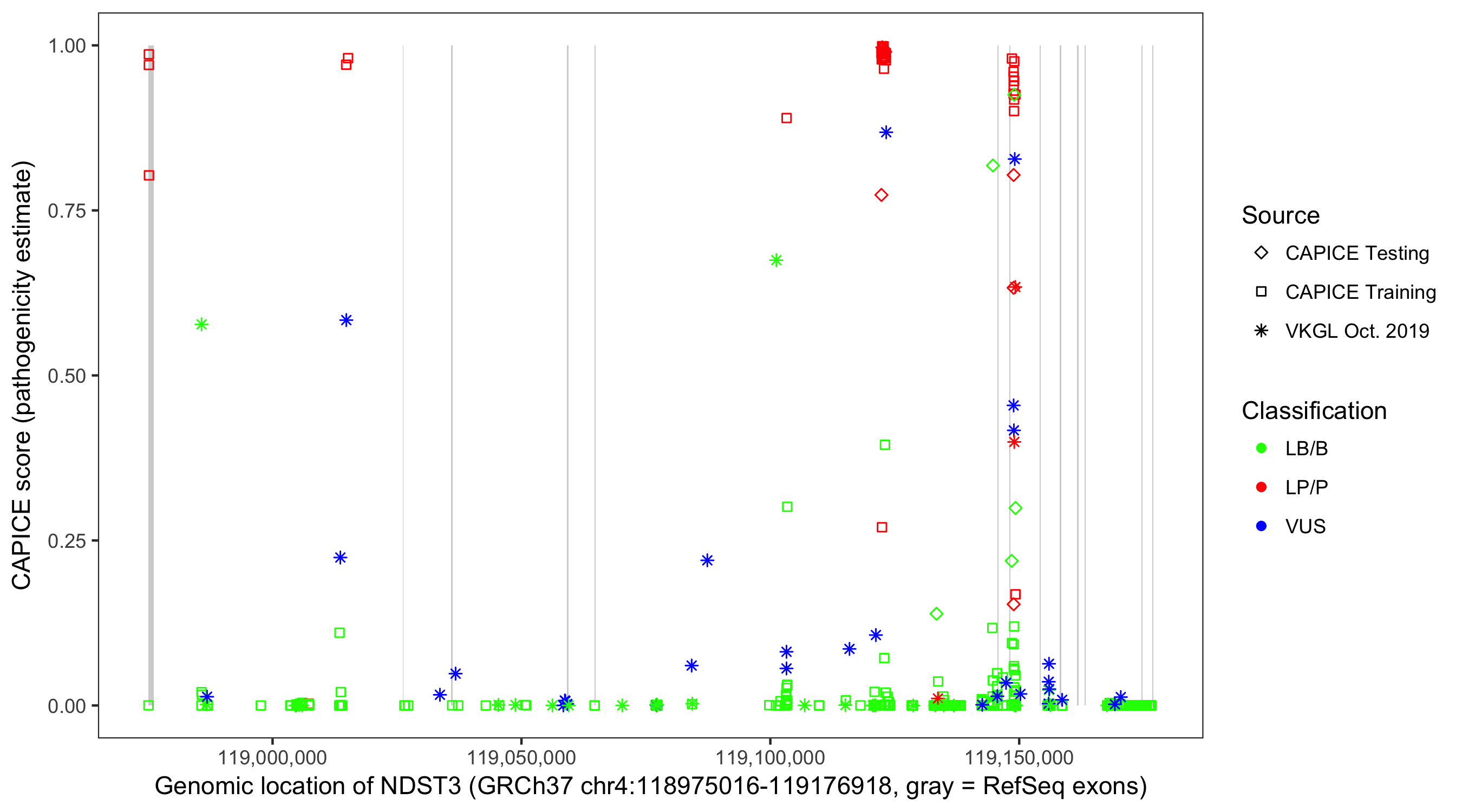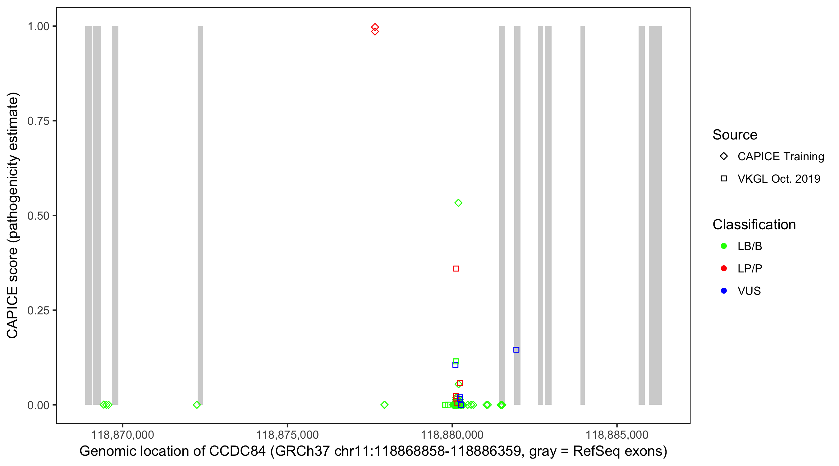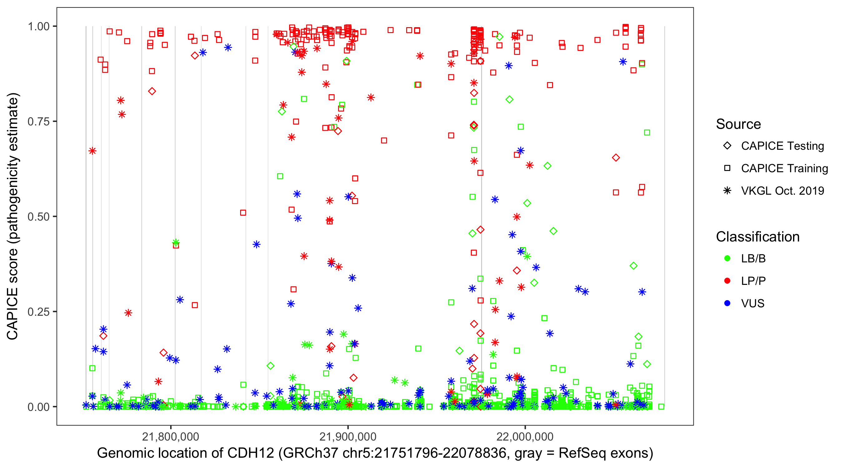 Shown are CAPICE train/test variants plus VKGL Oct 2019.