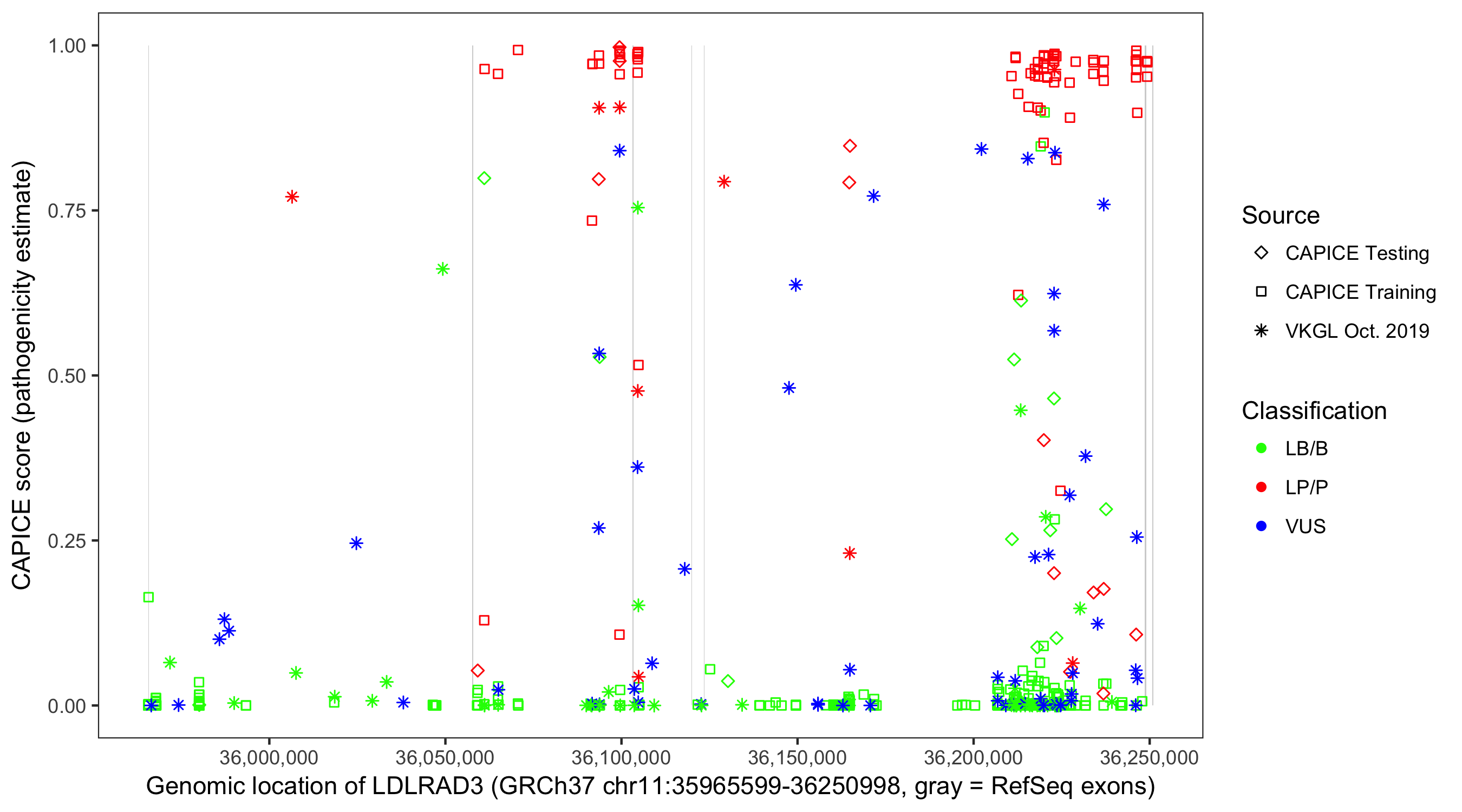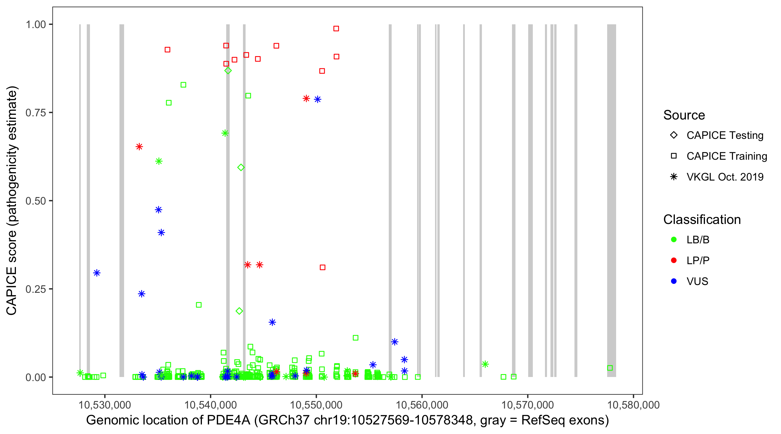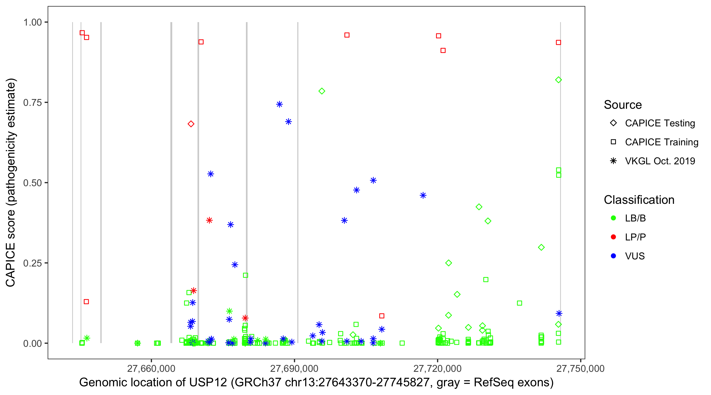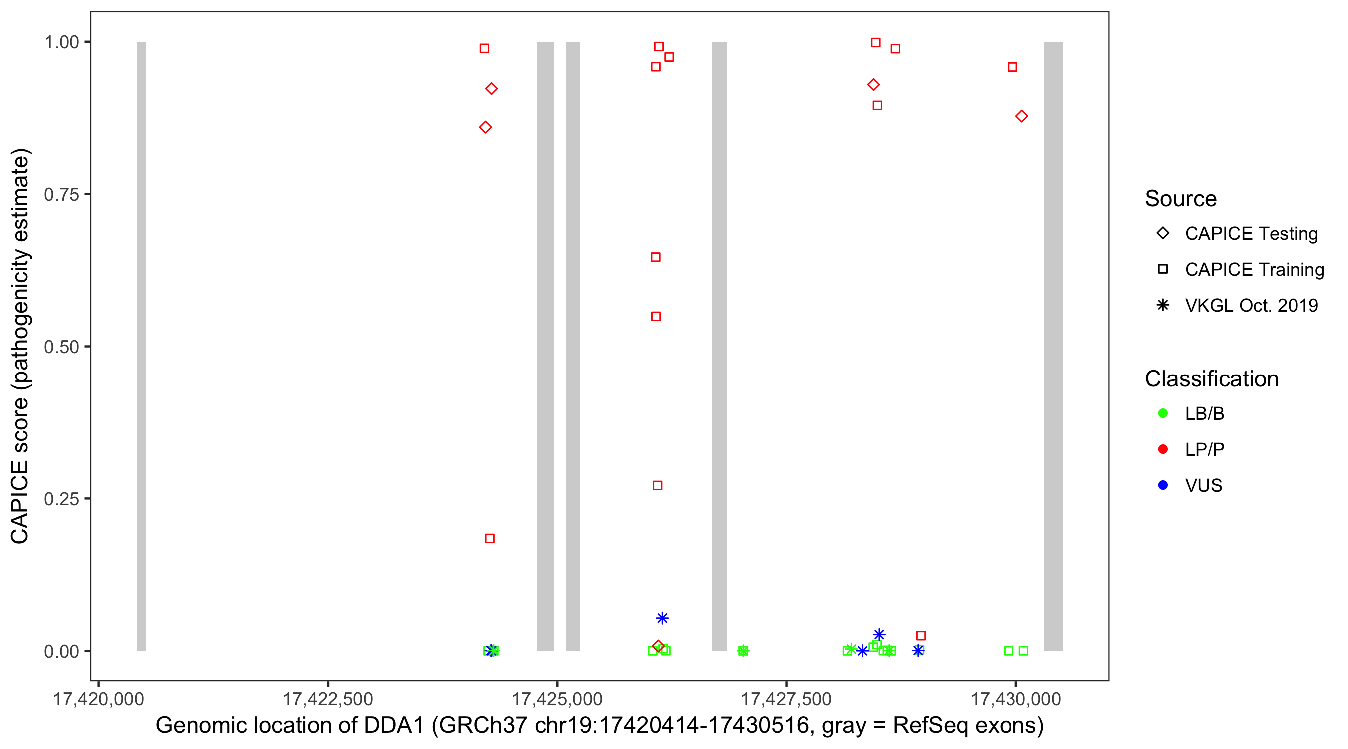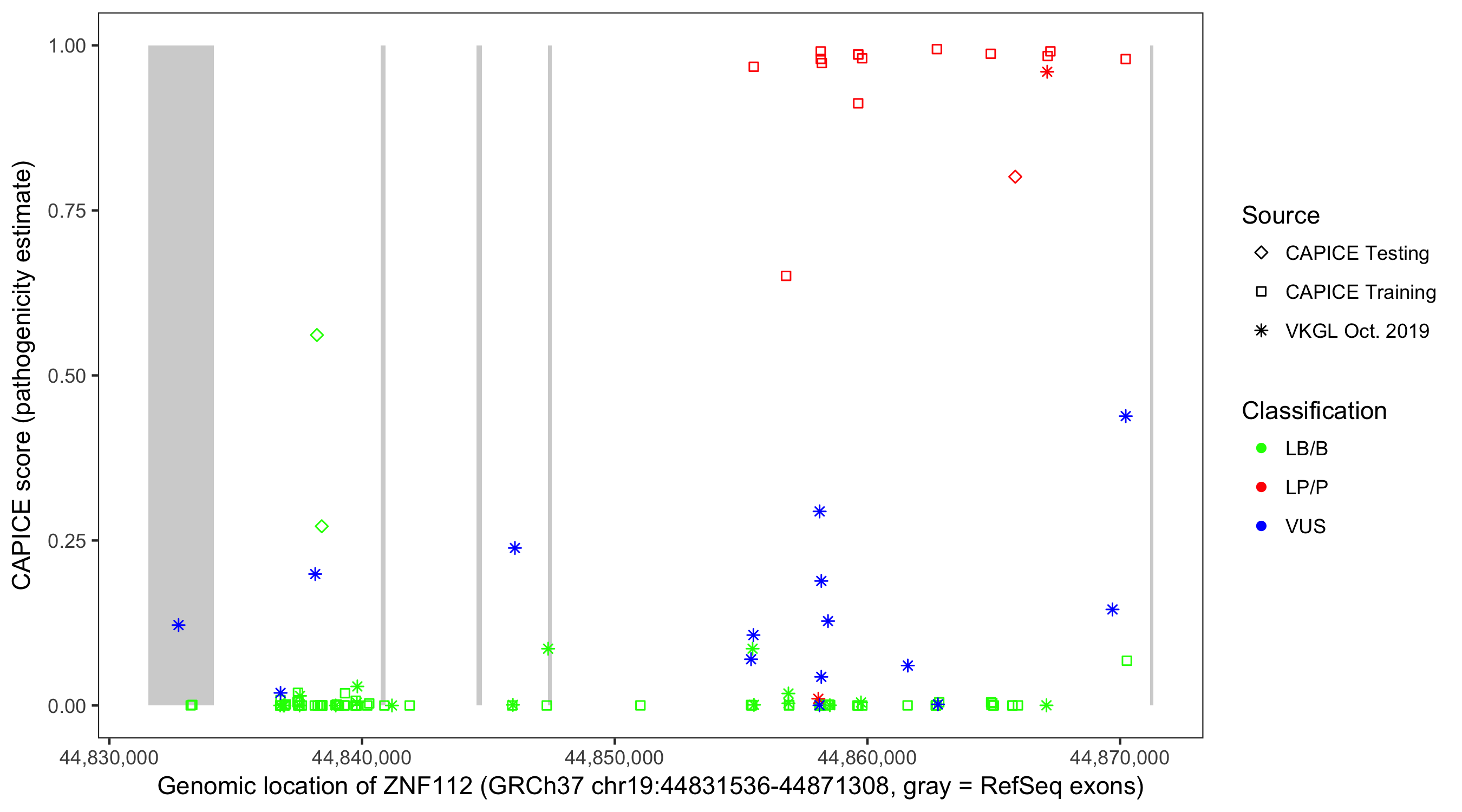Shown are CAPICE train/test variants plus VKGL Oct 2019.