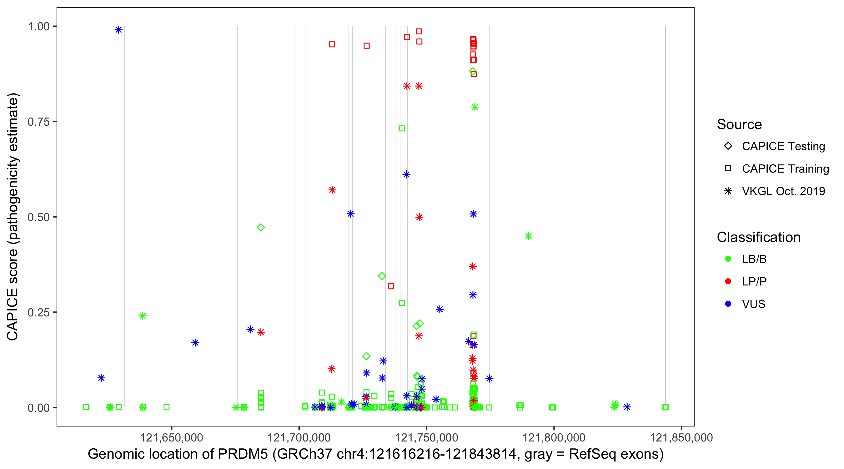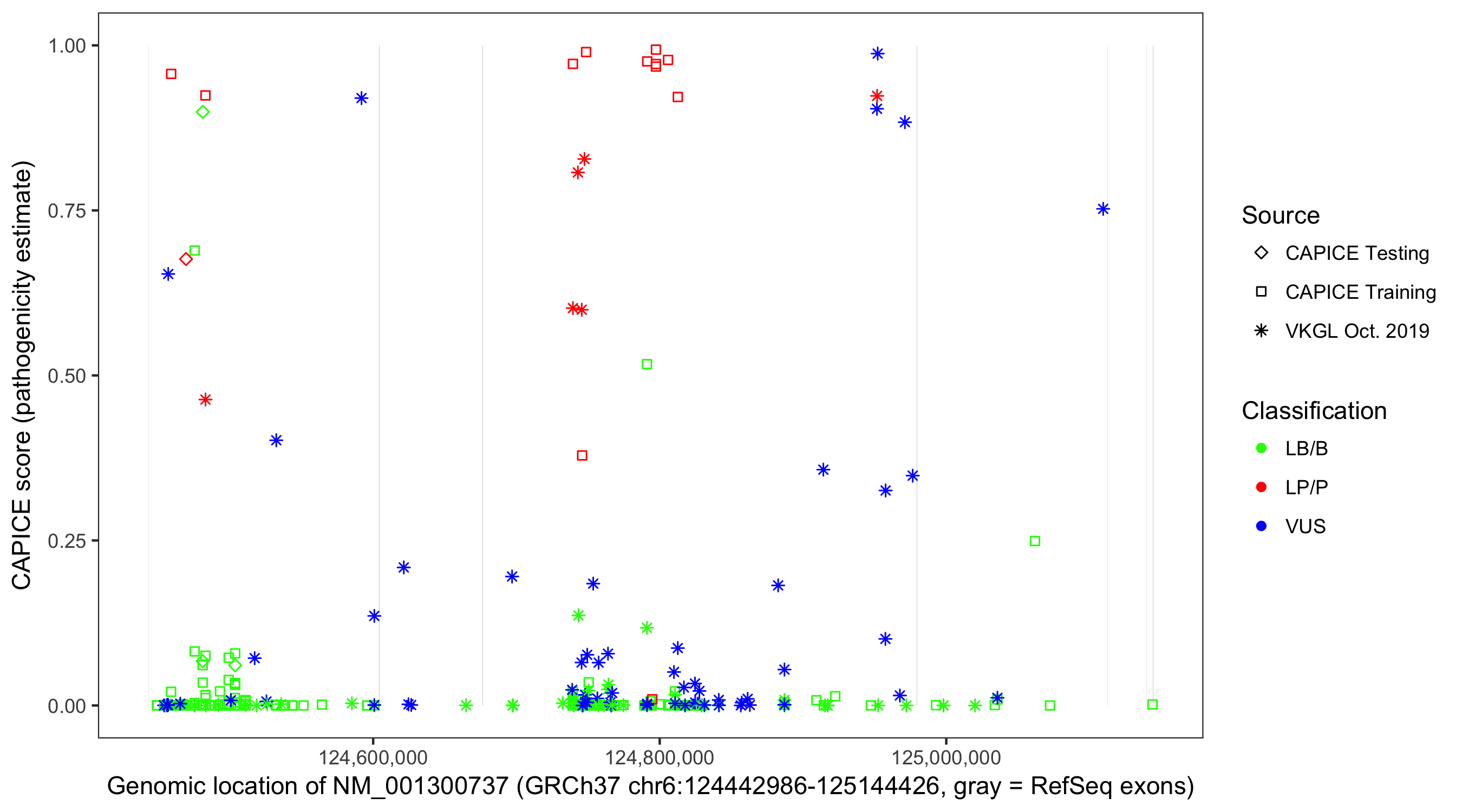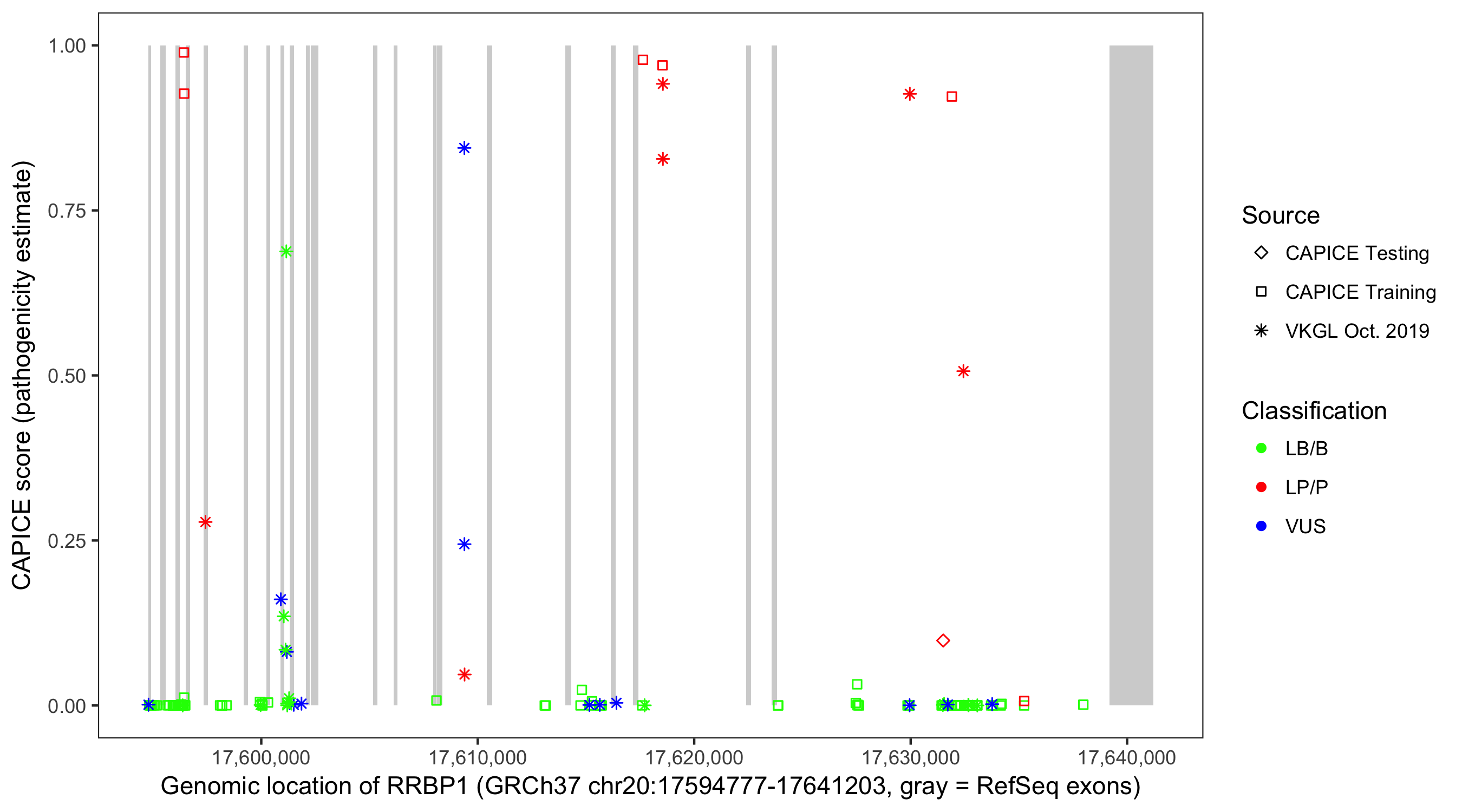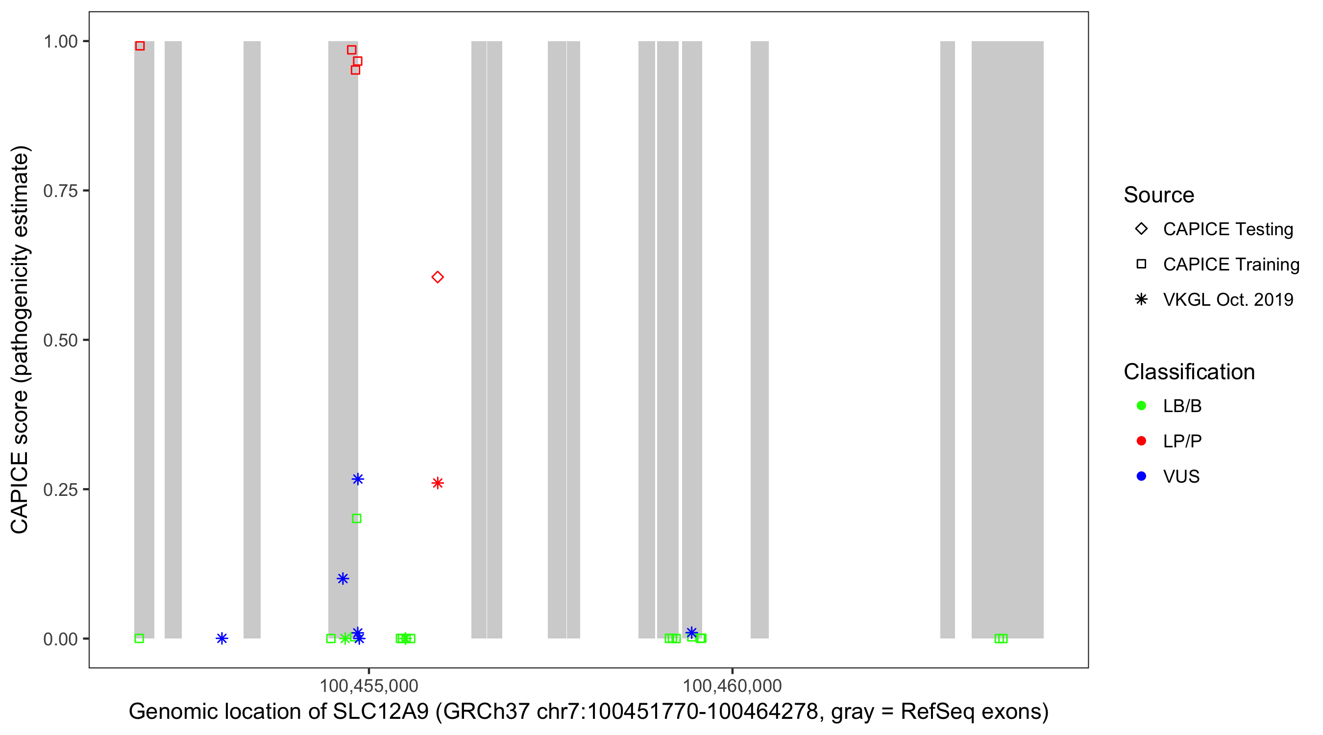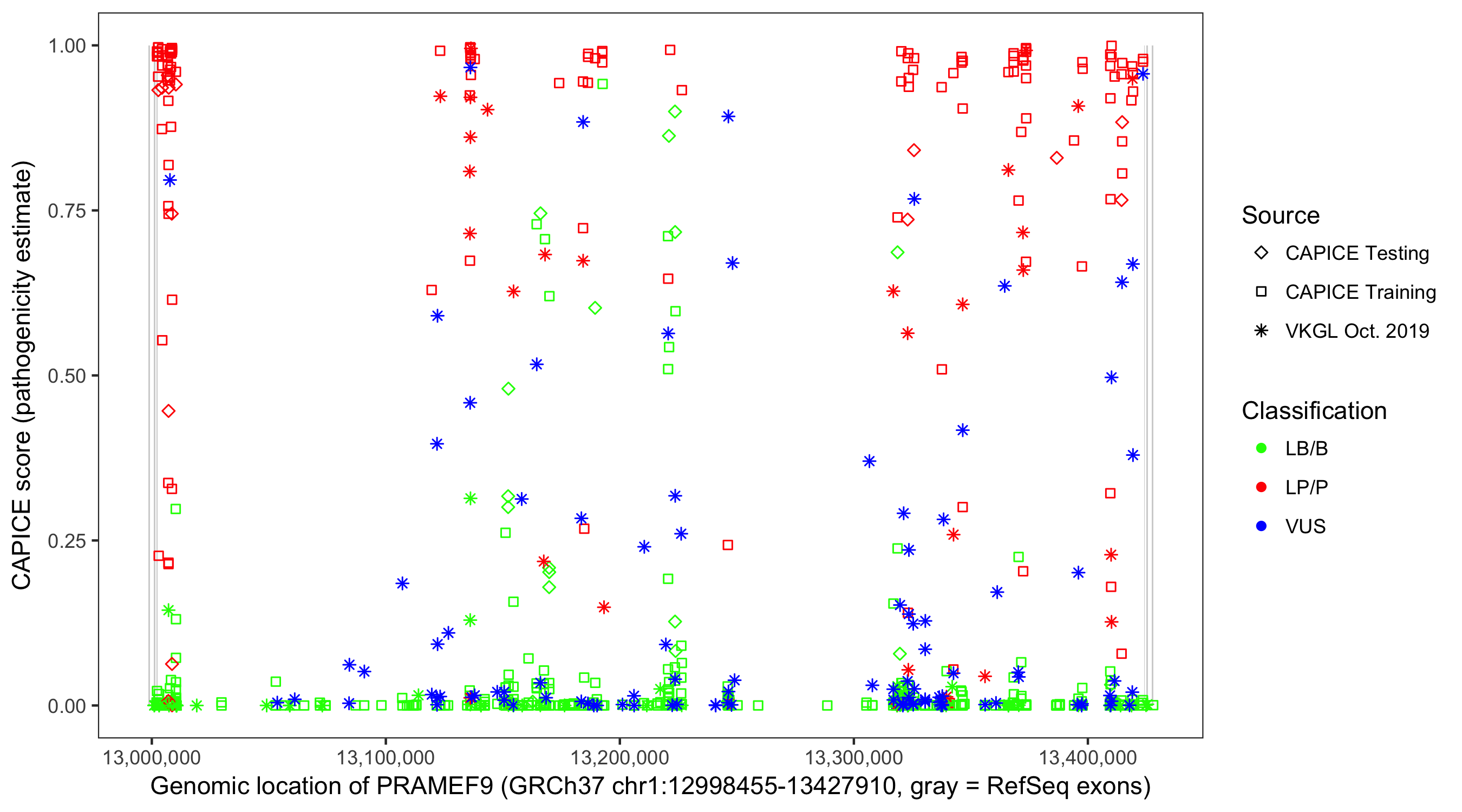 Shown are CAPICE train/test variants plus VKGL Oct 2019.
