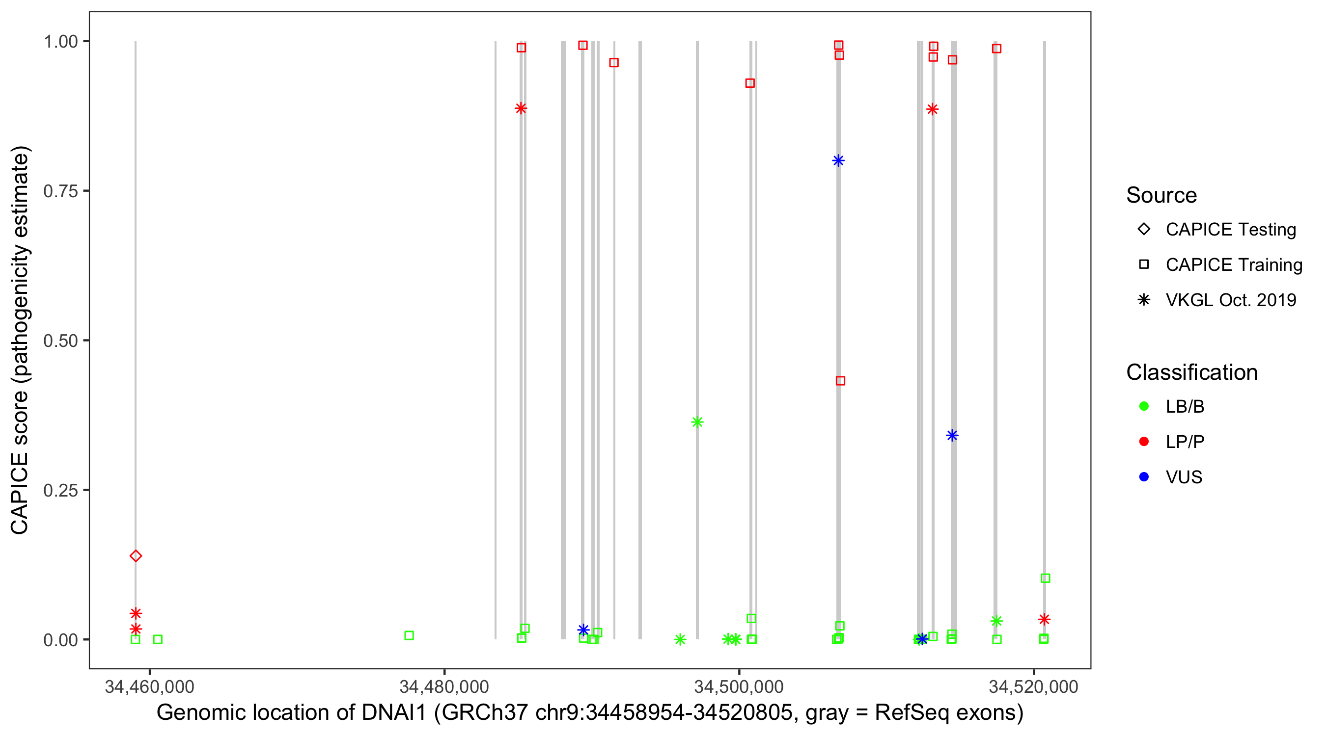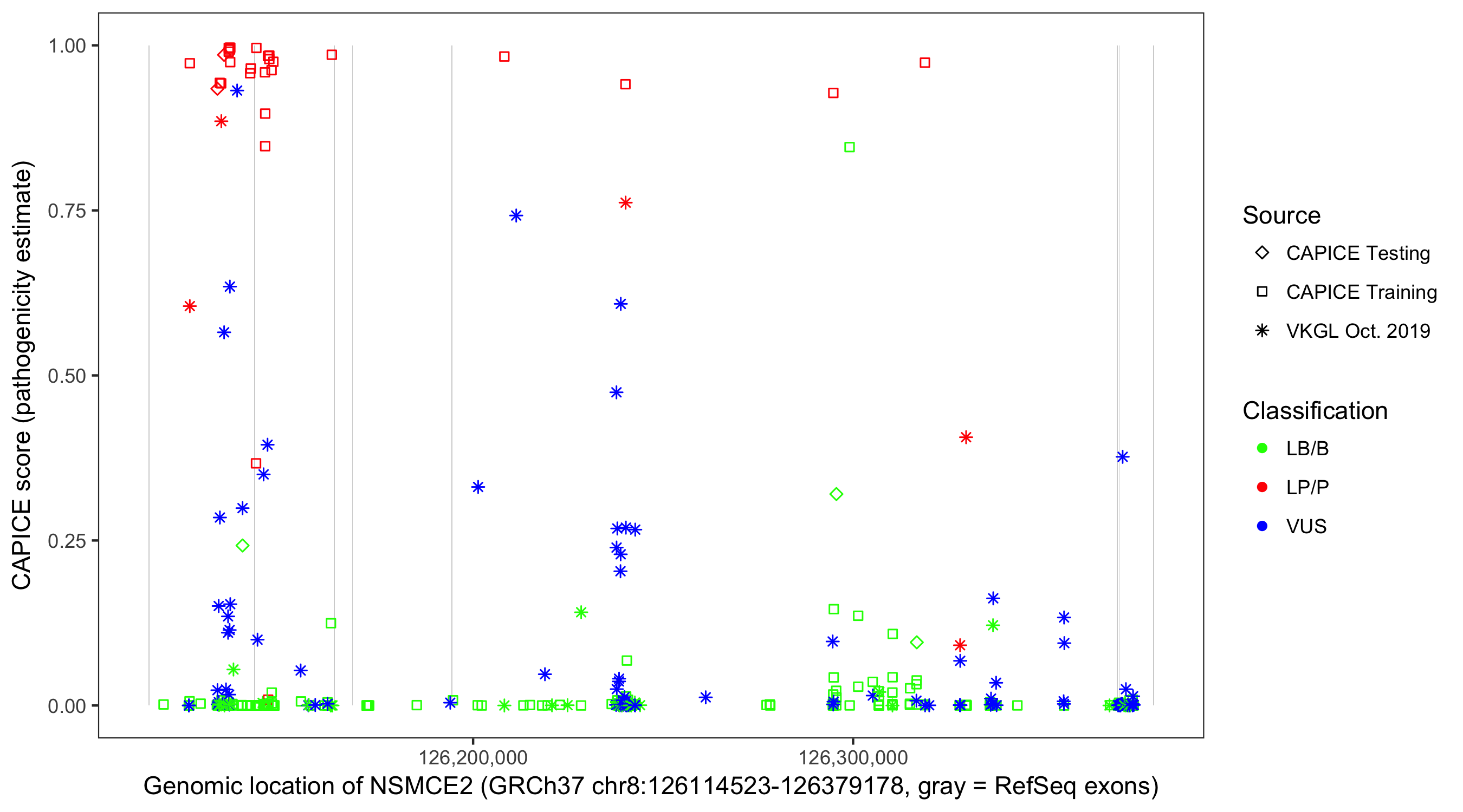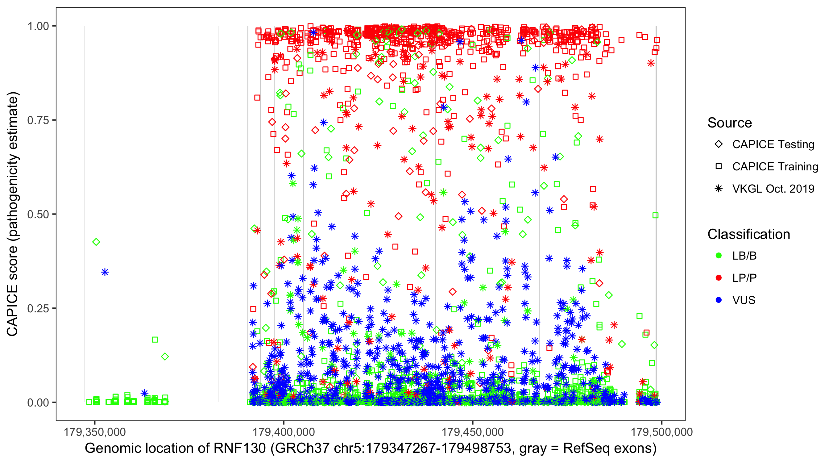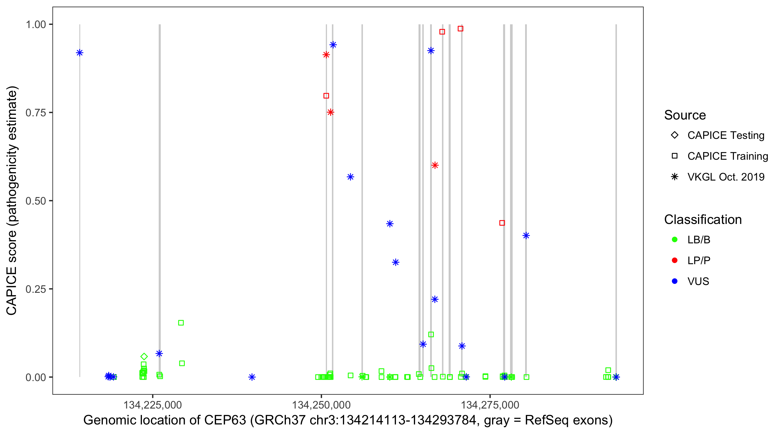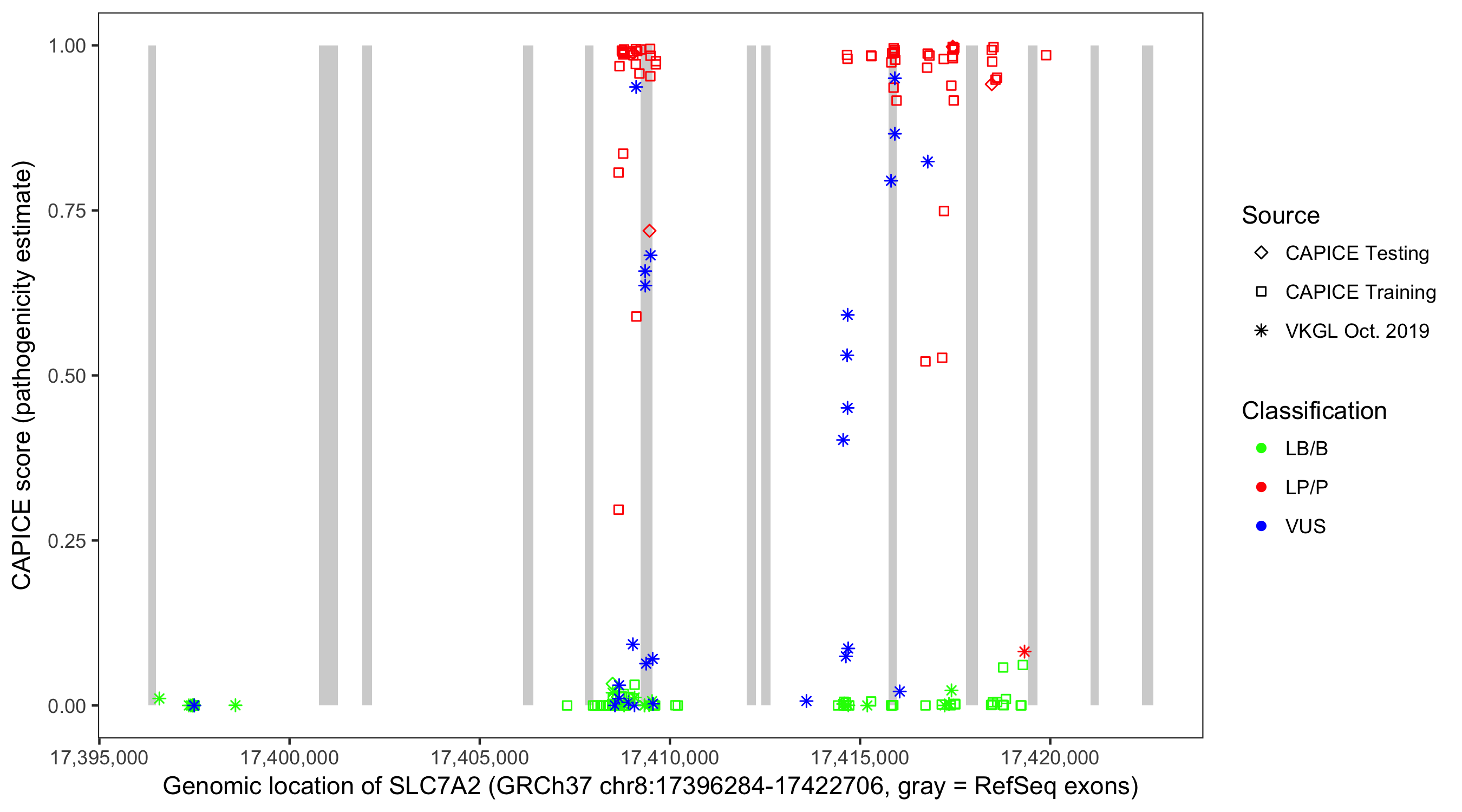 Shown are CAPICE train/test variants plus VKGL Oct 2019.
