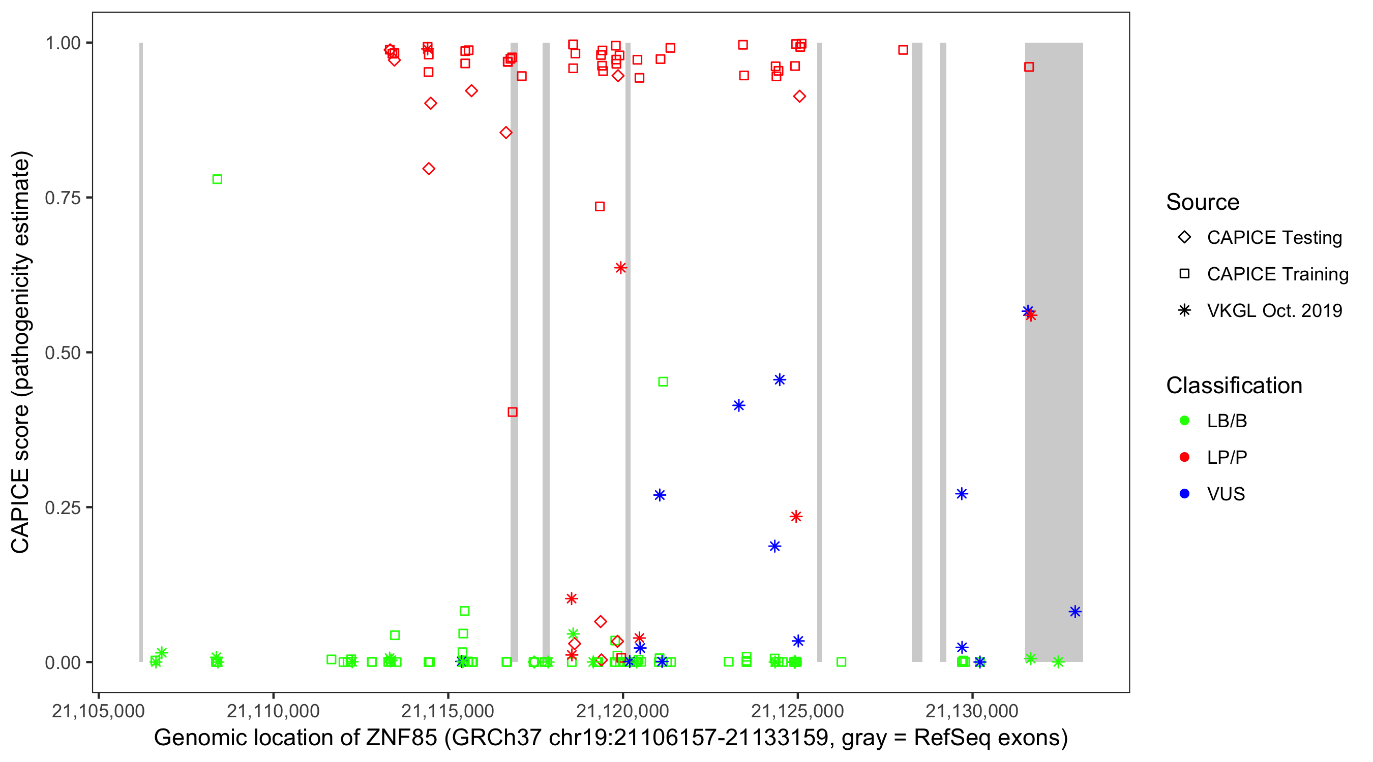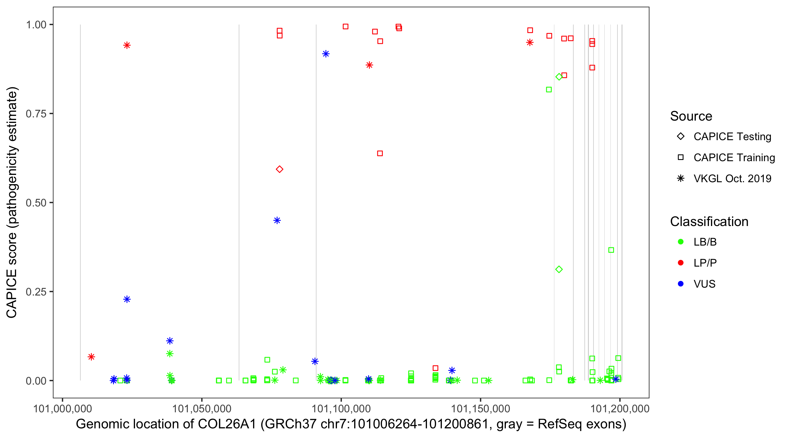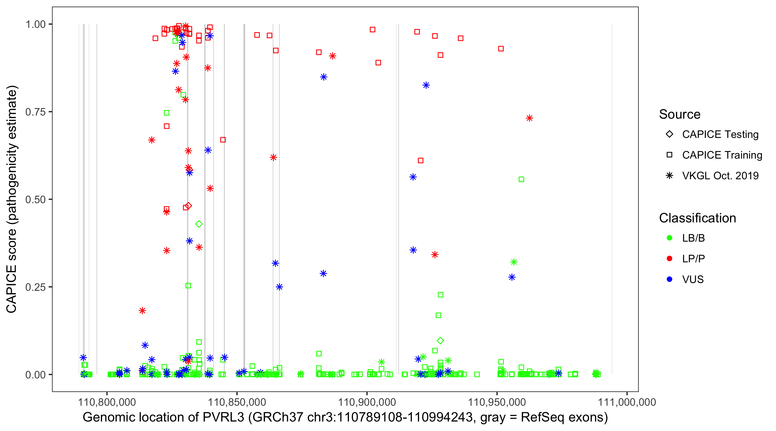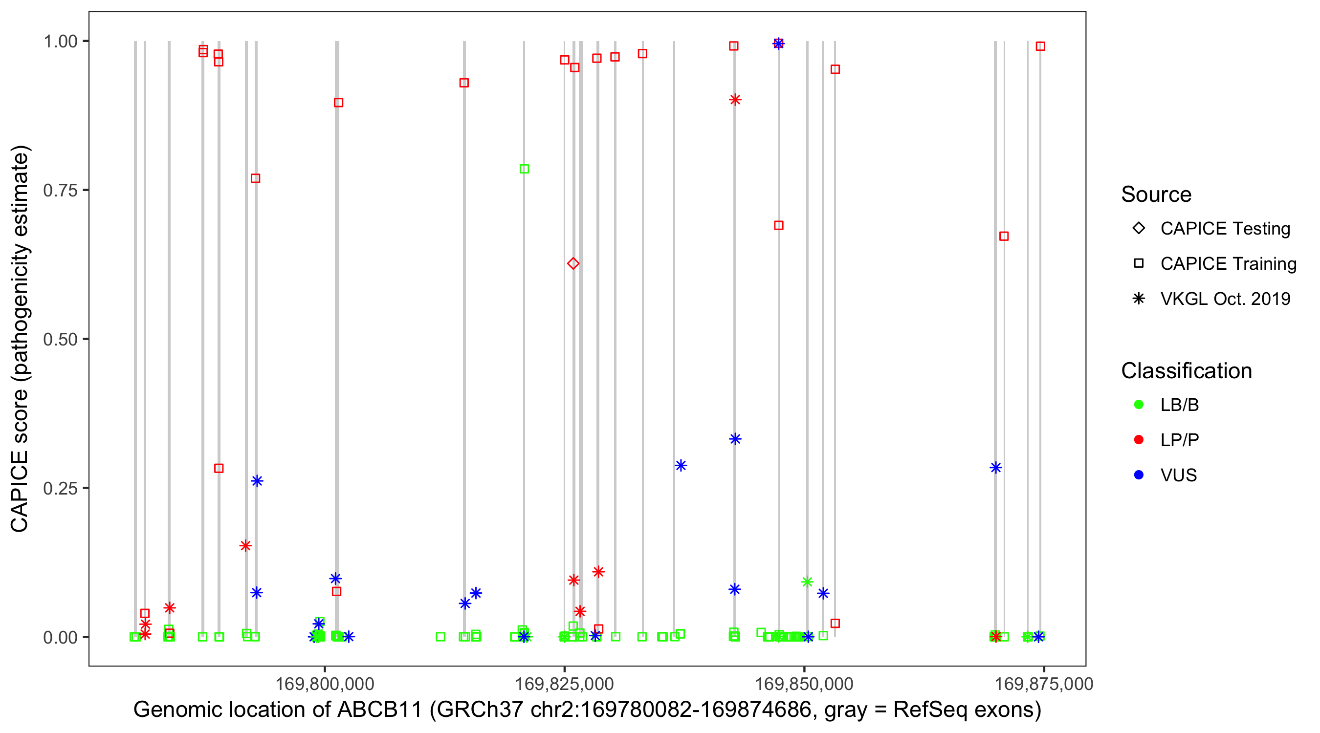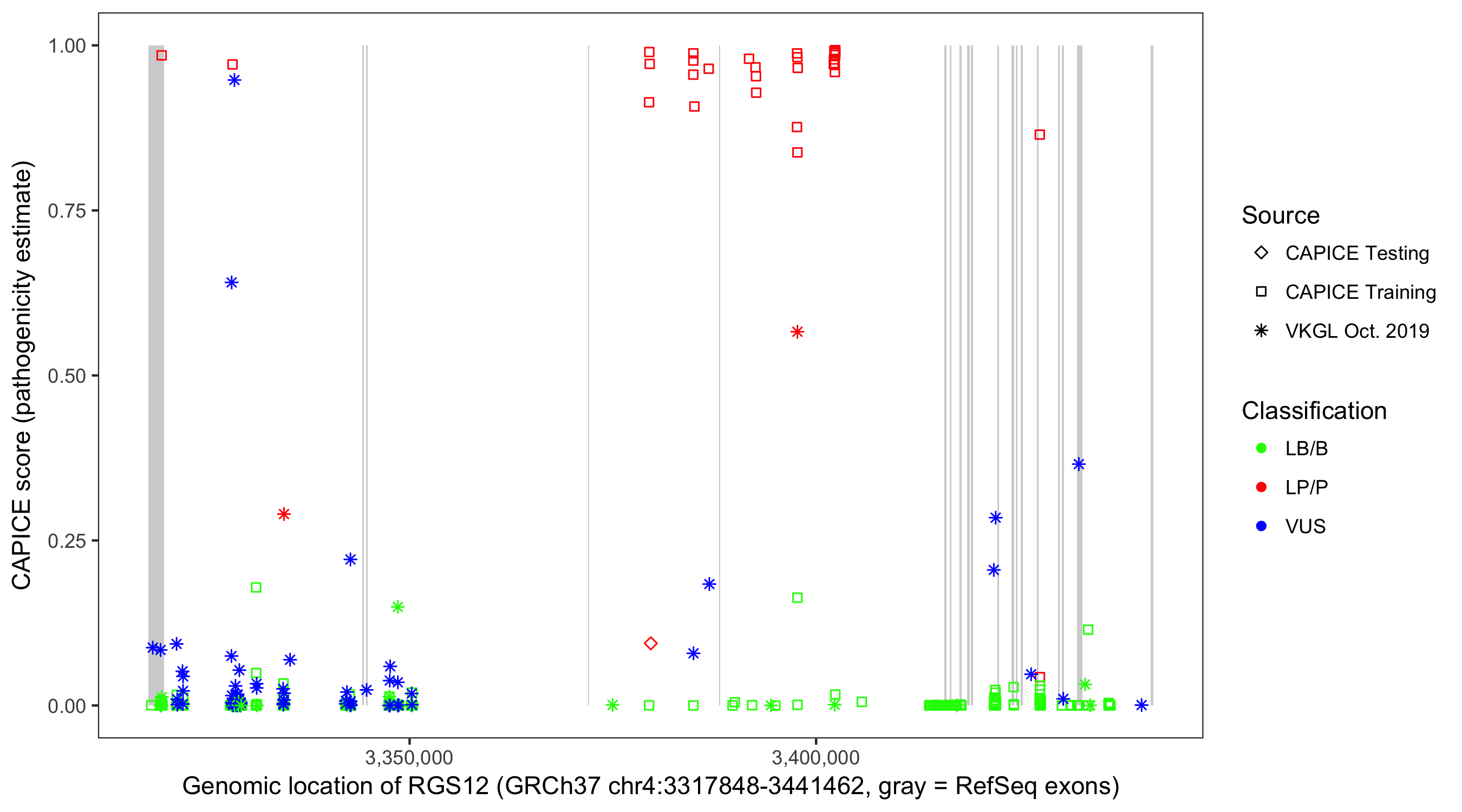 Shown are CAPICE train/test variants plus VKGL Oct 2019.