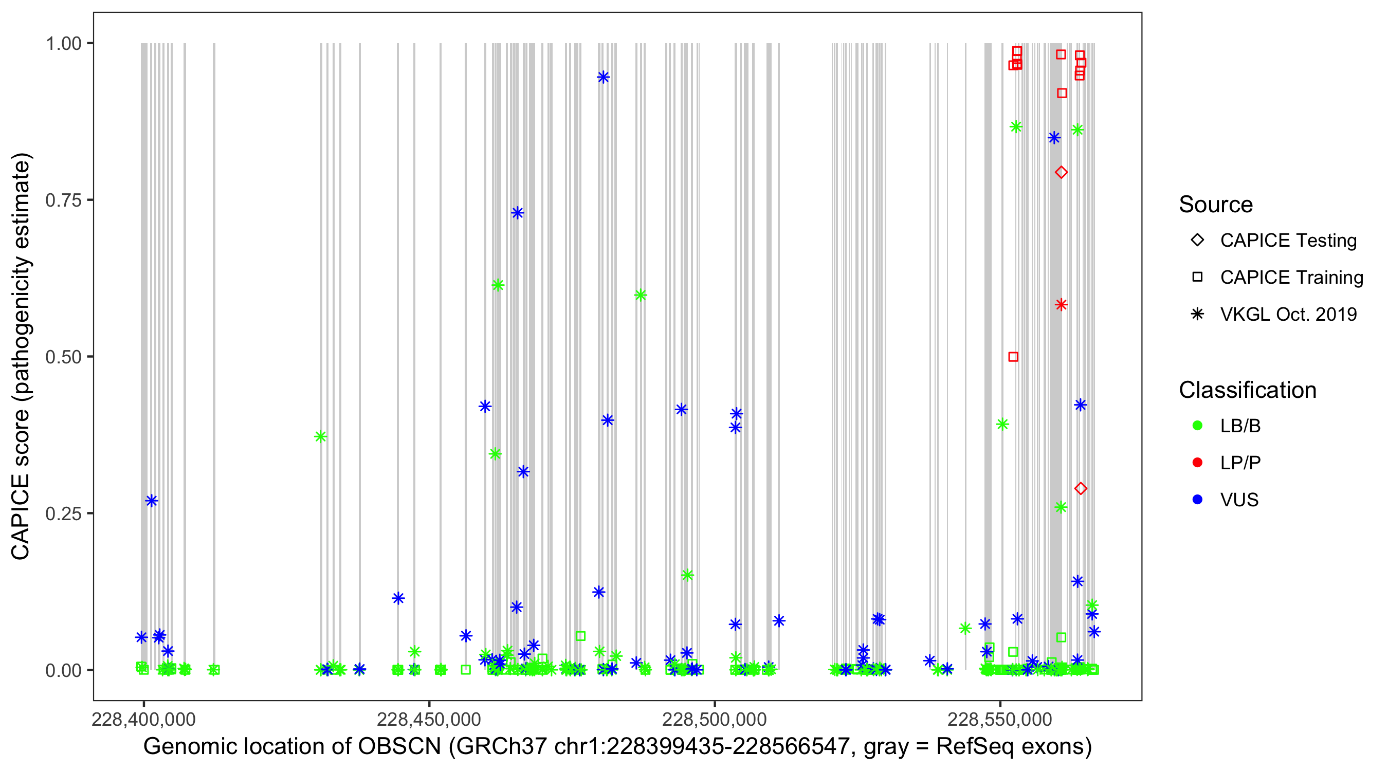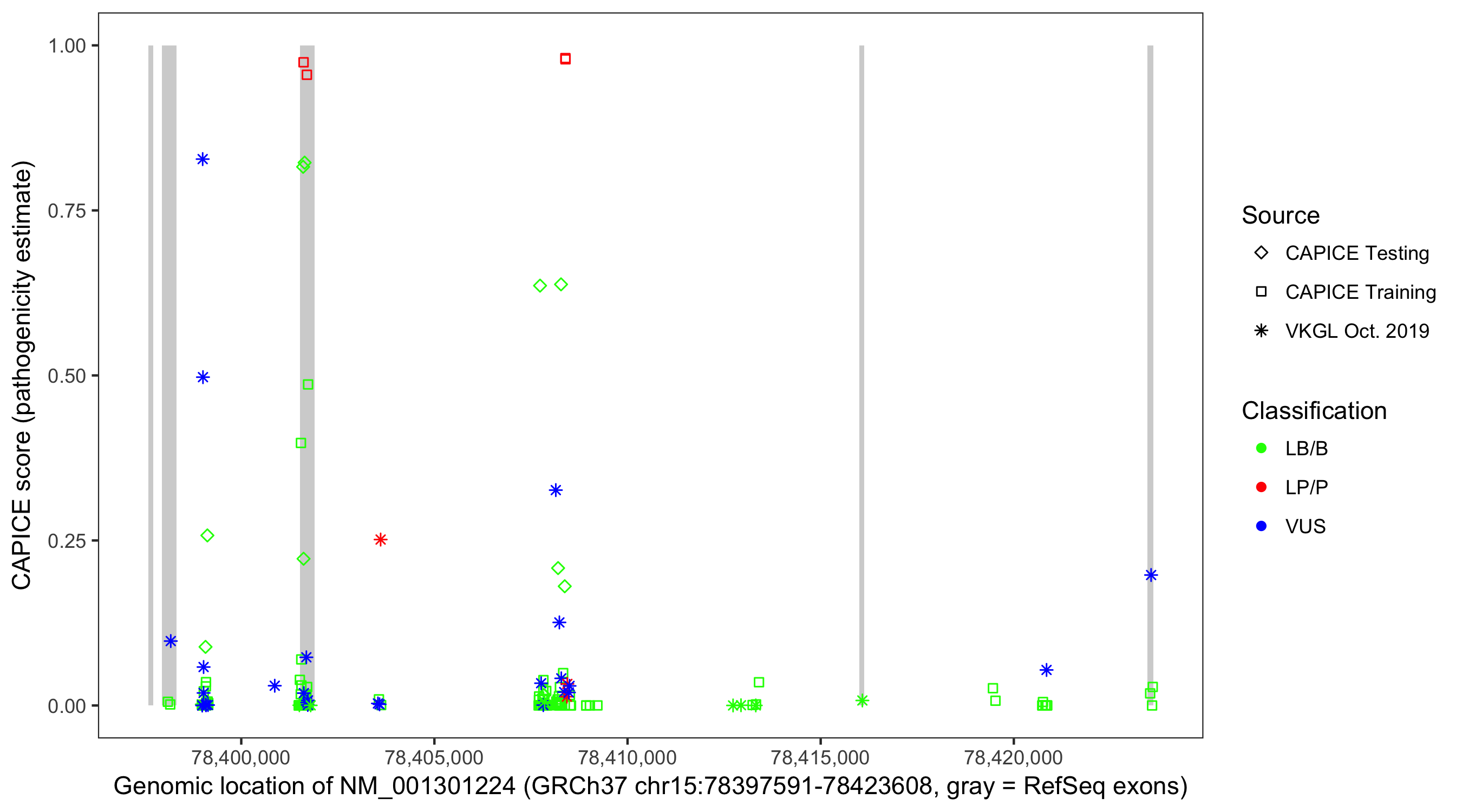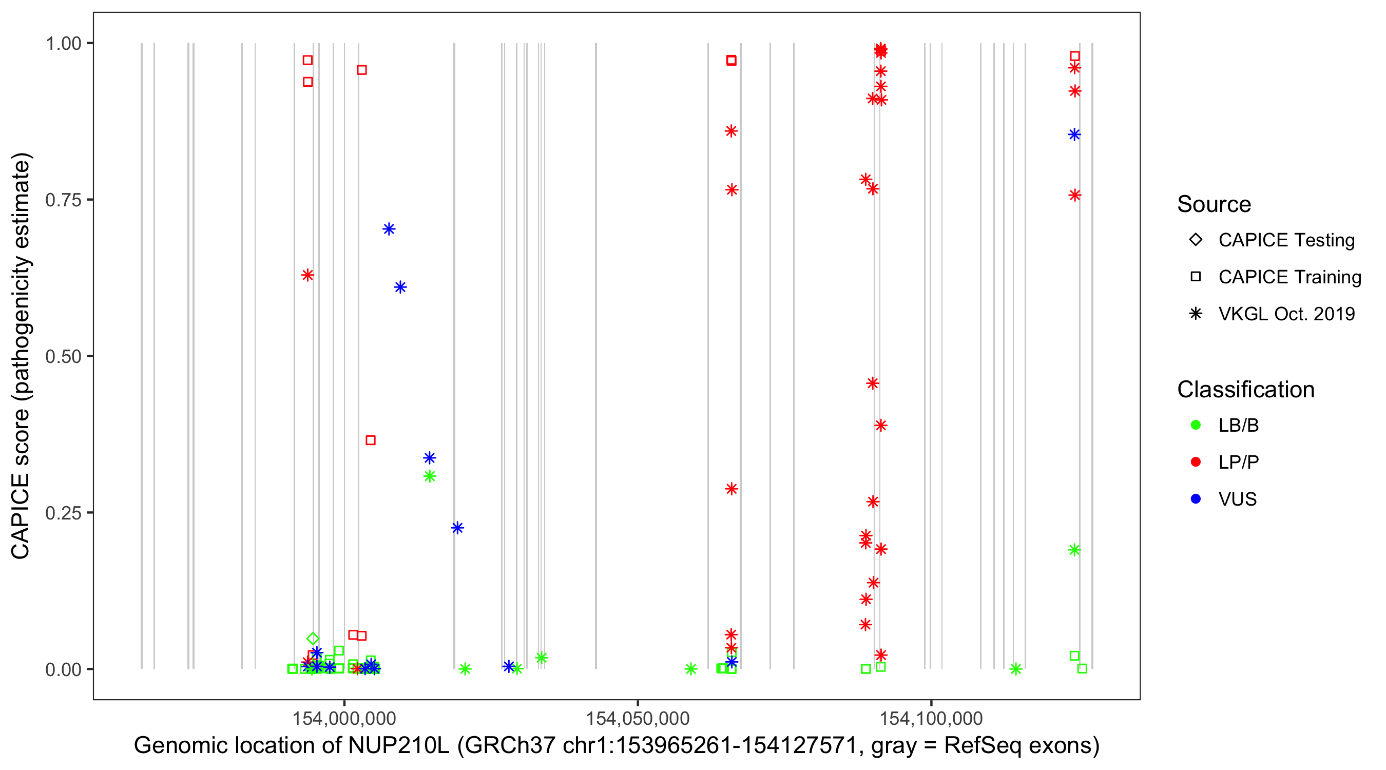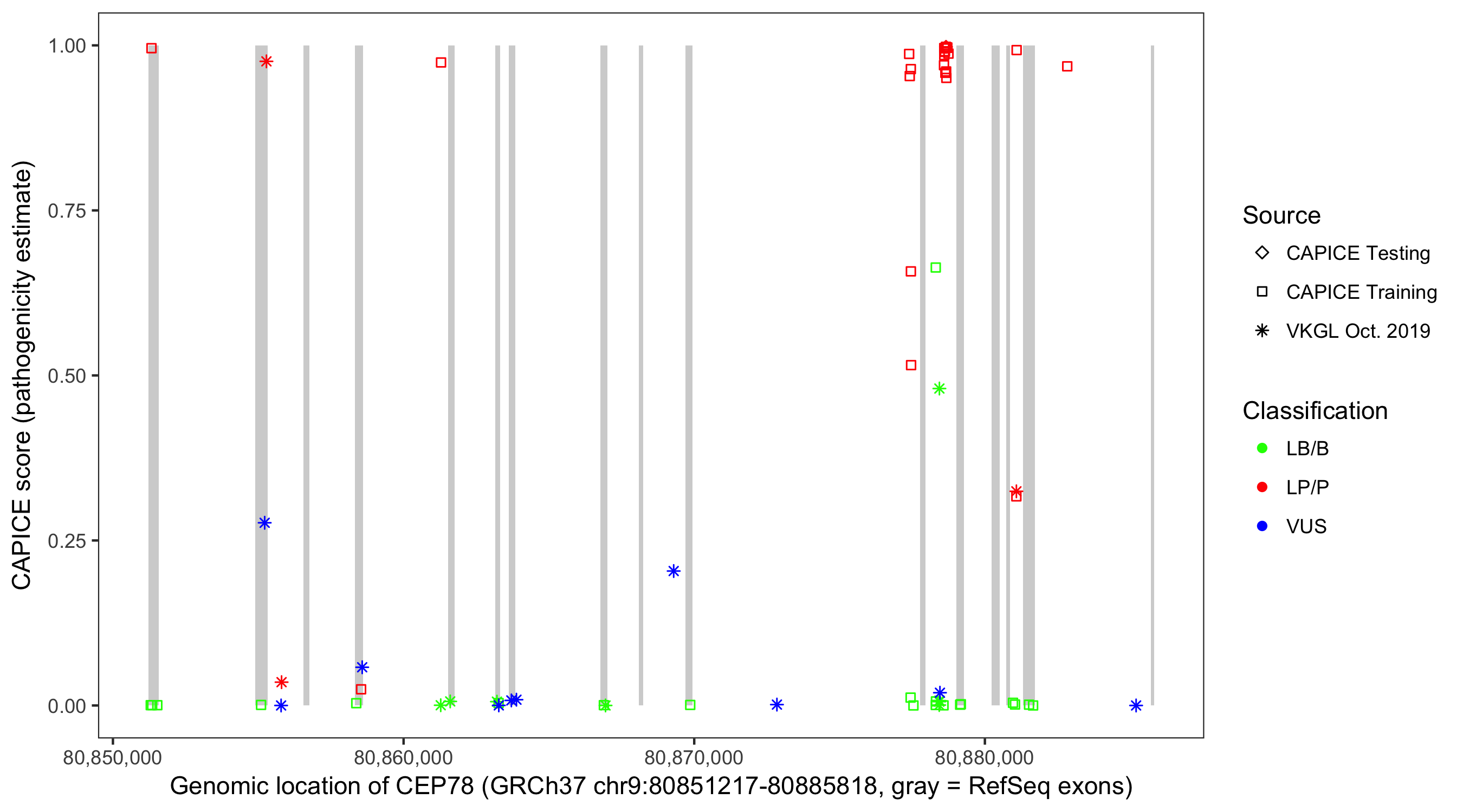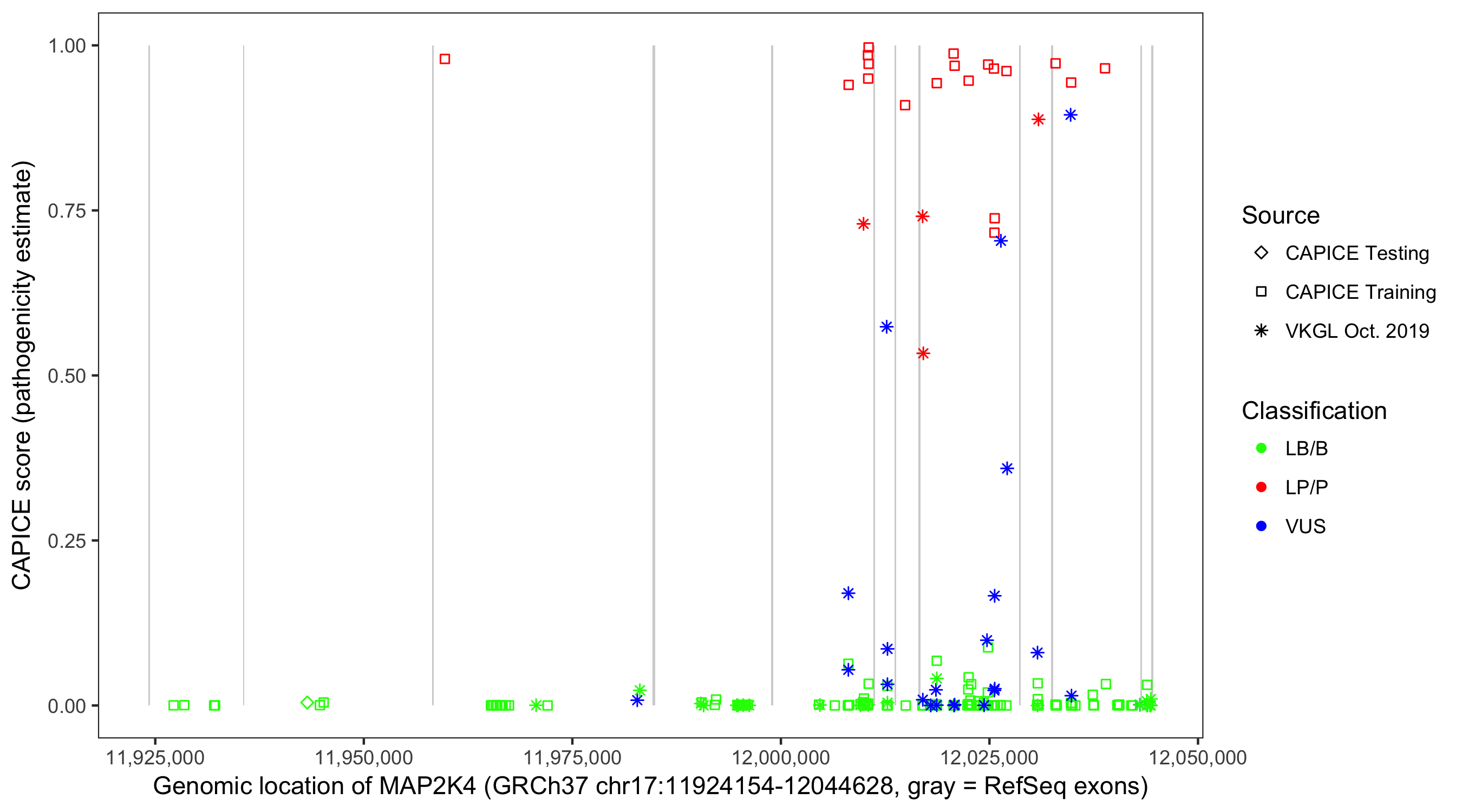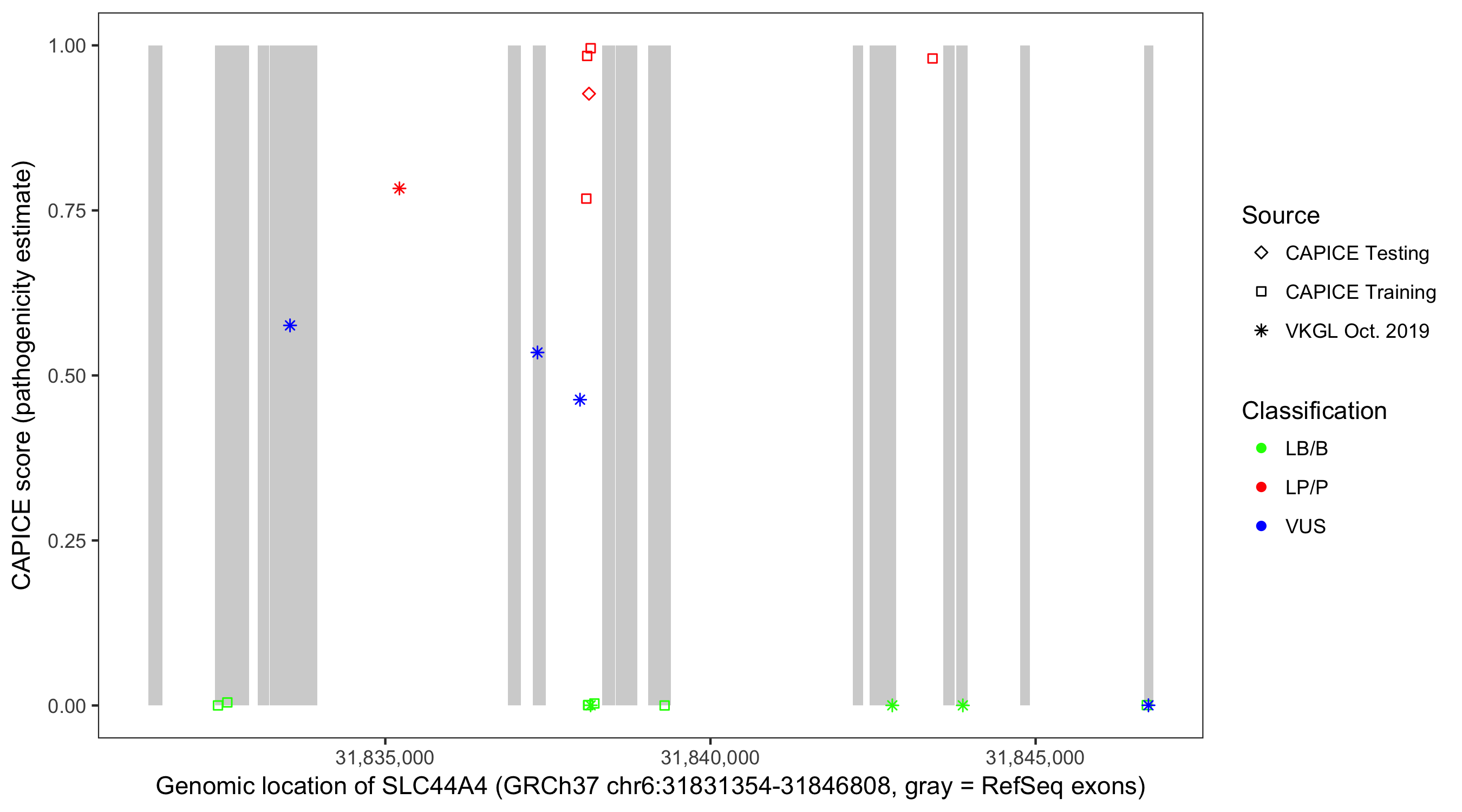 Shown are CAPICE train/test variants plus VKGL Oct 2019.
