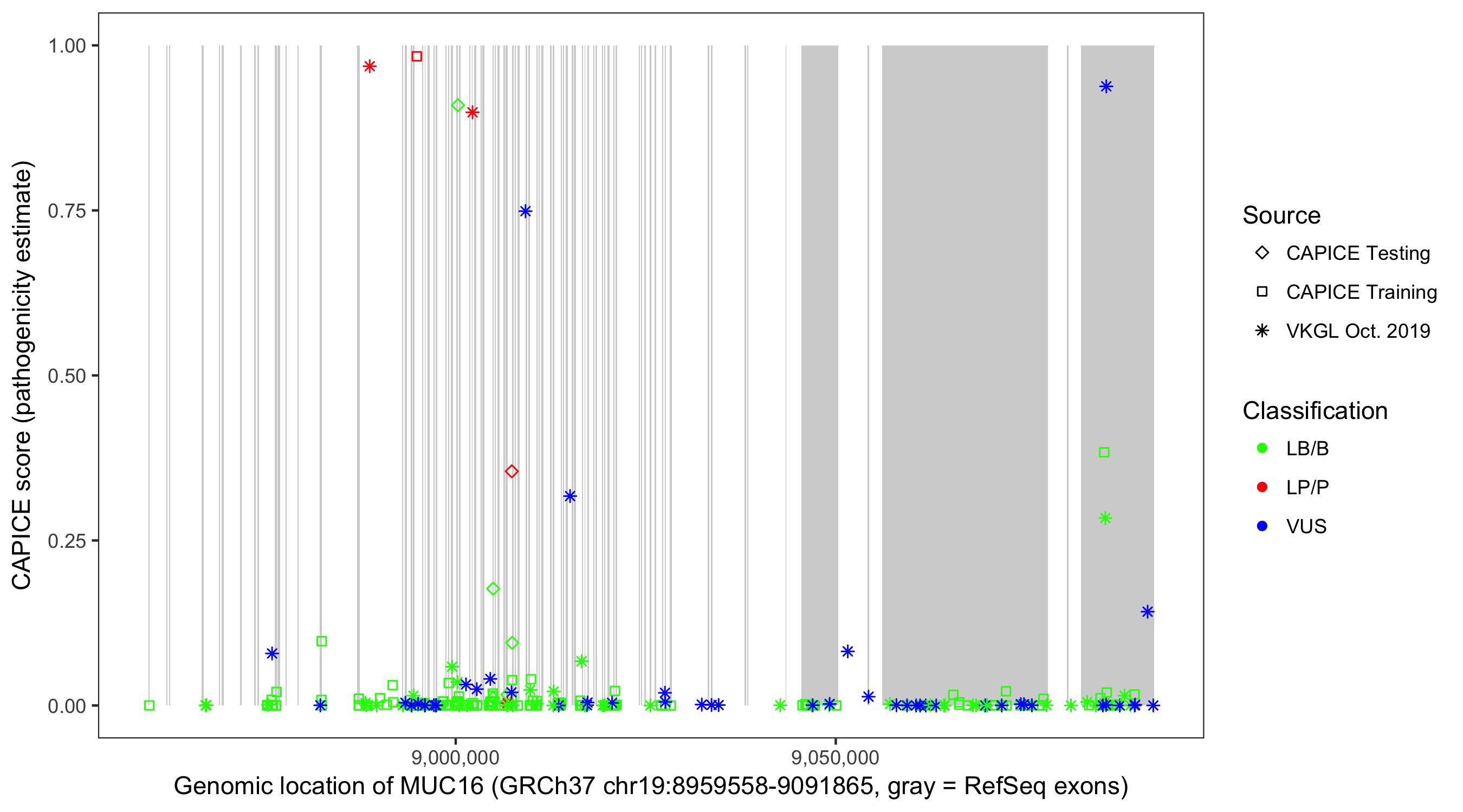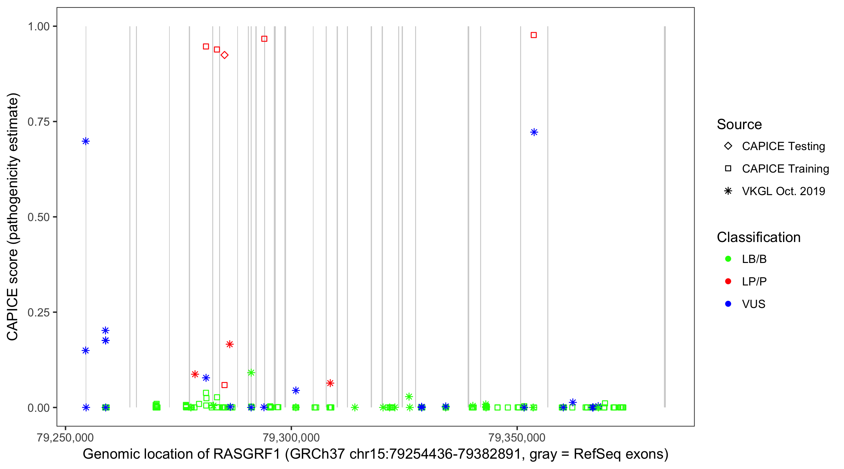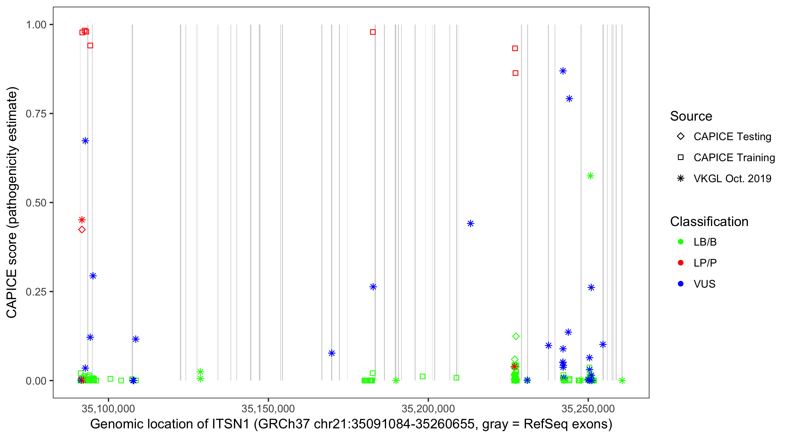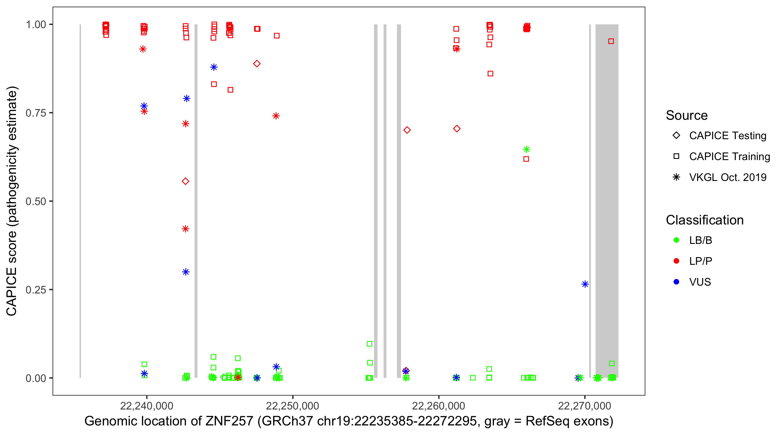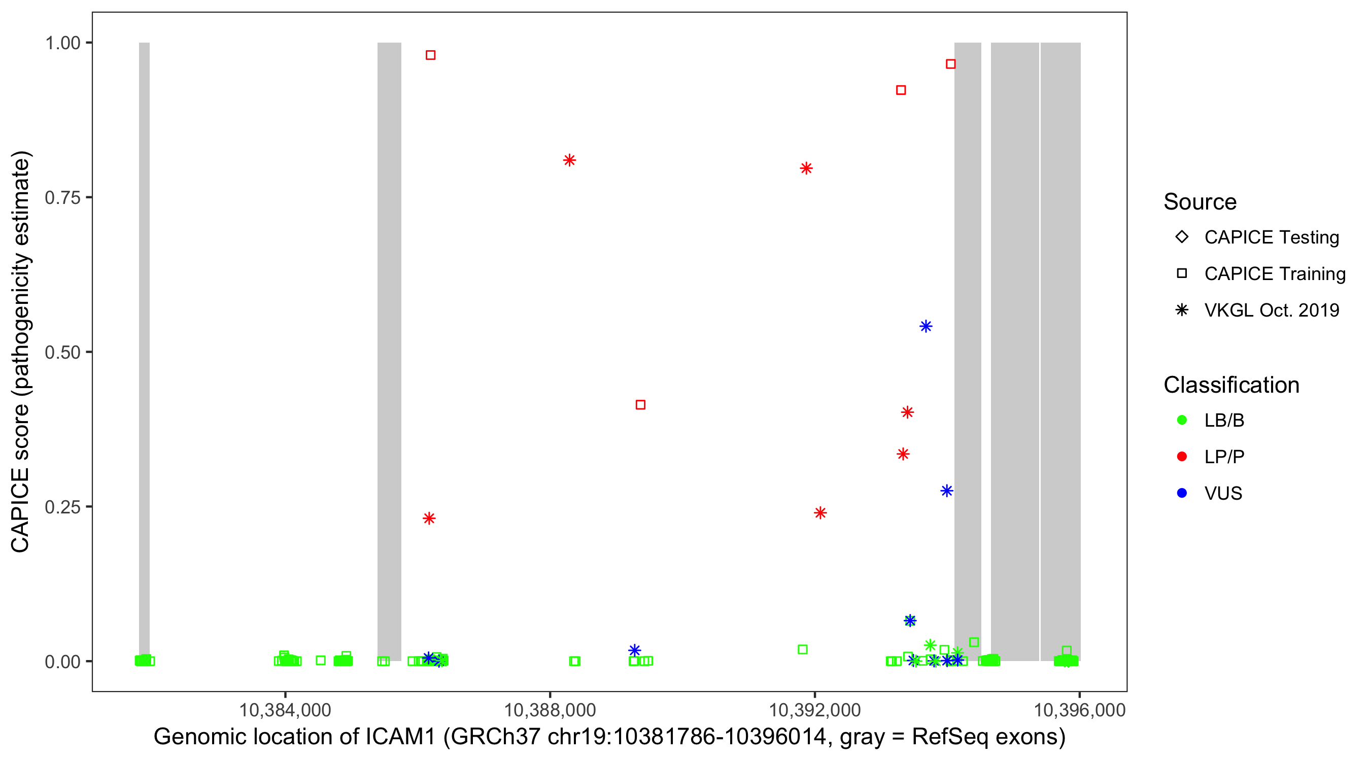 Shown are CAPICE train/test variants plus VKGL Oct 2019.