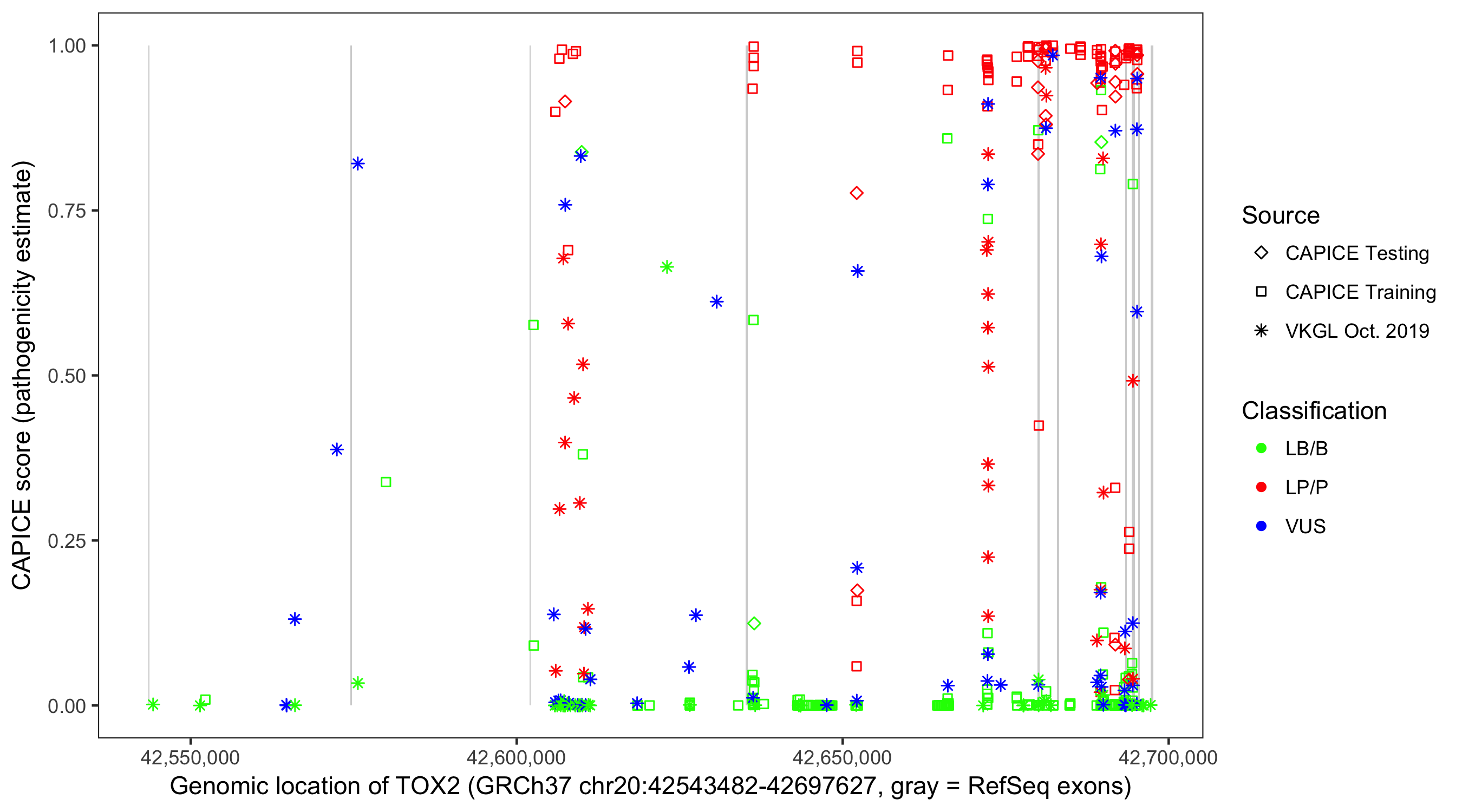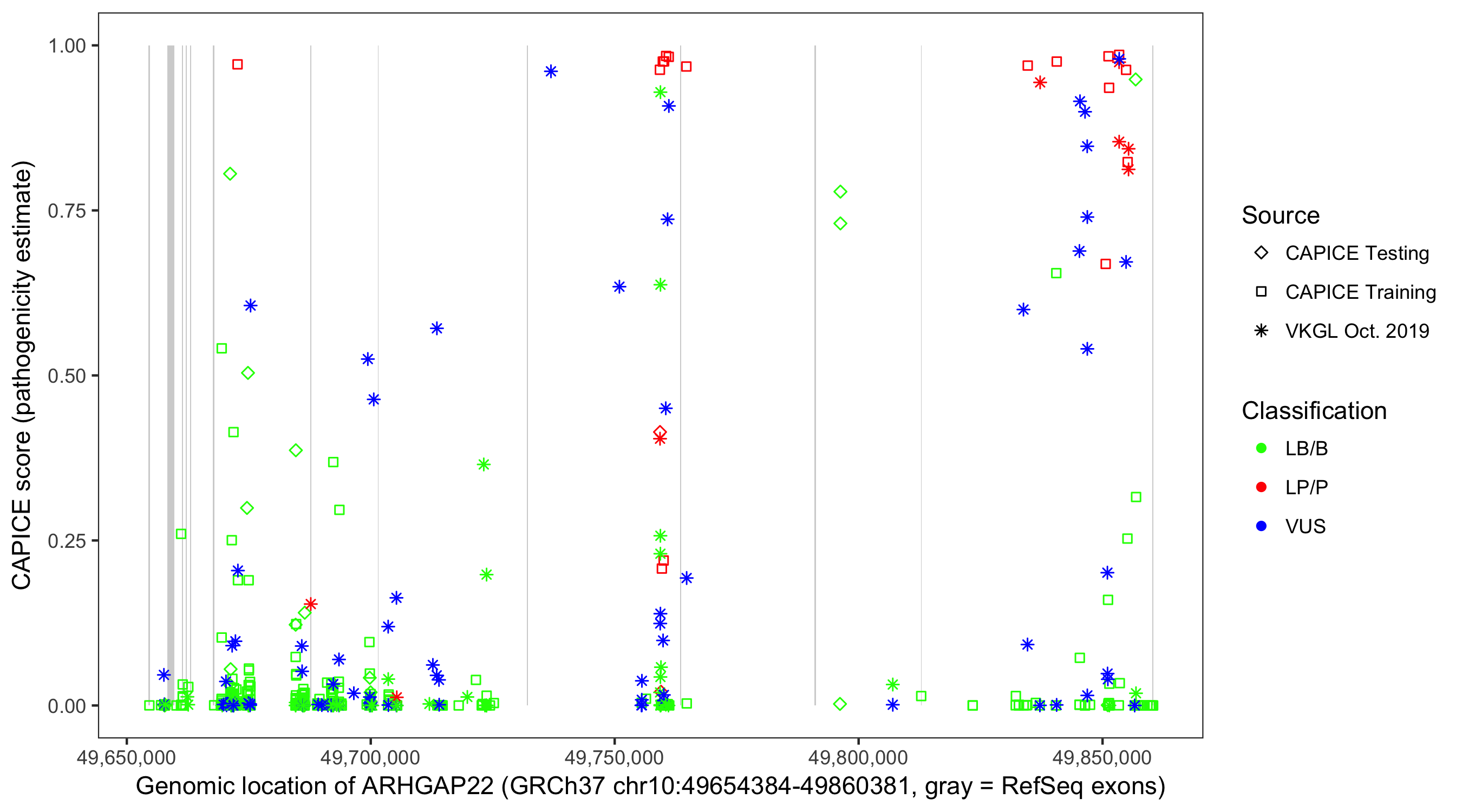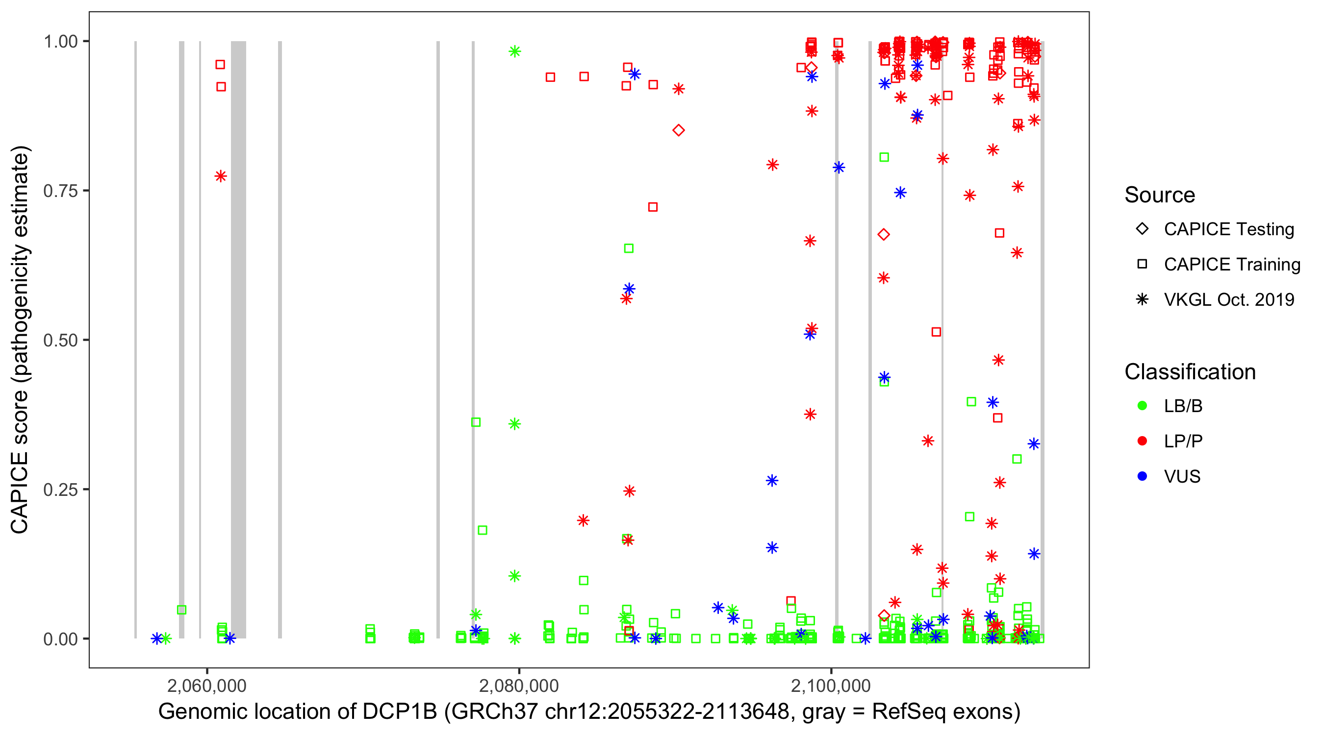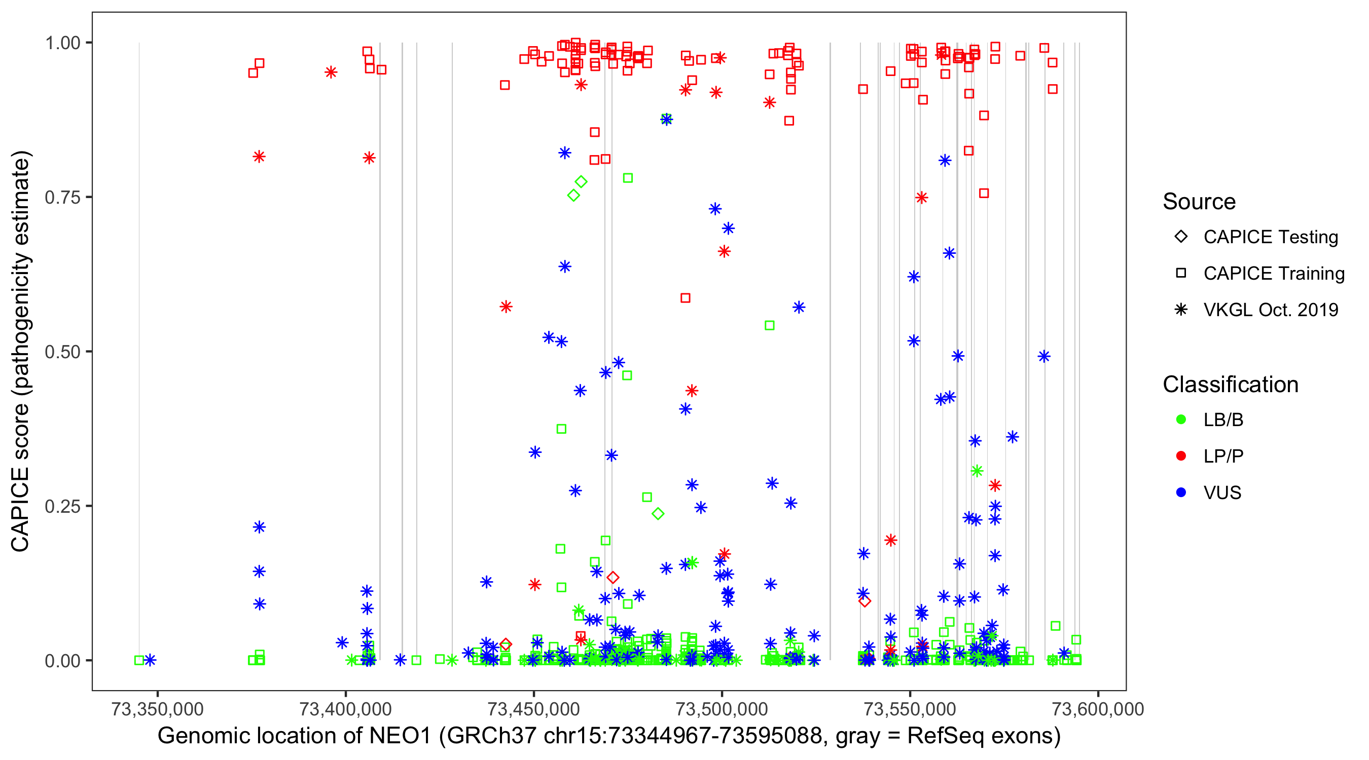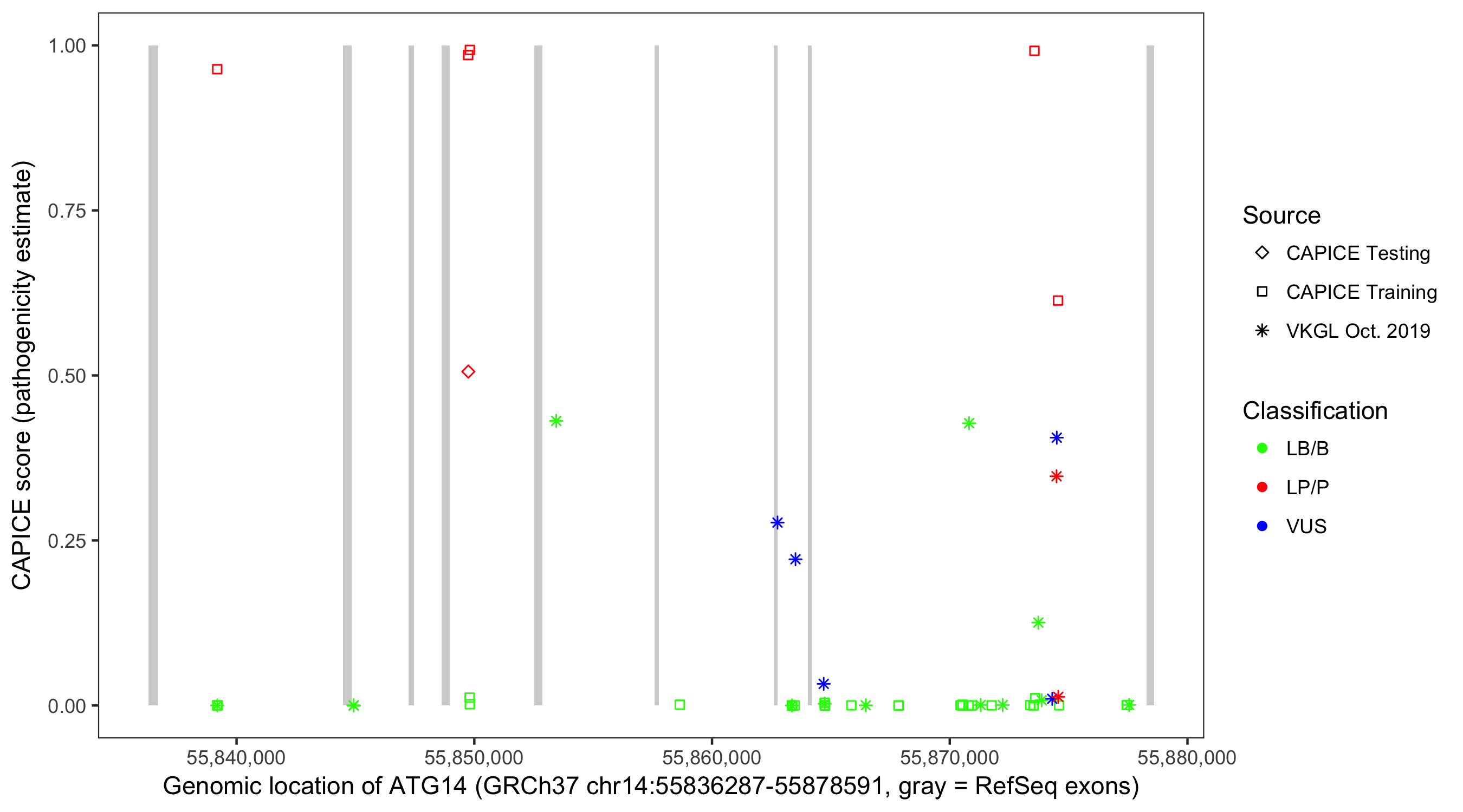 Shown are CAPICE train/test variants plus VKGL Oct 2019.