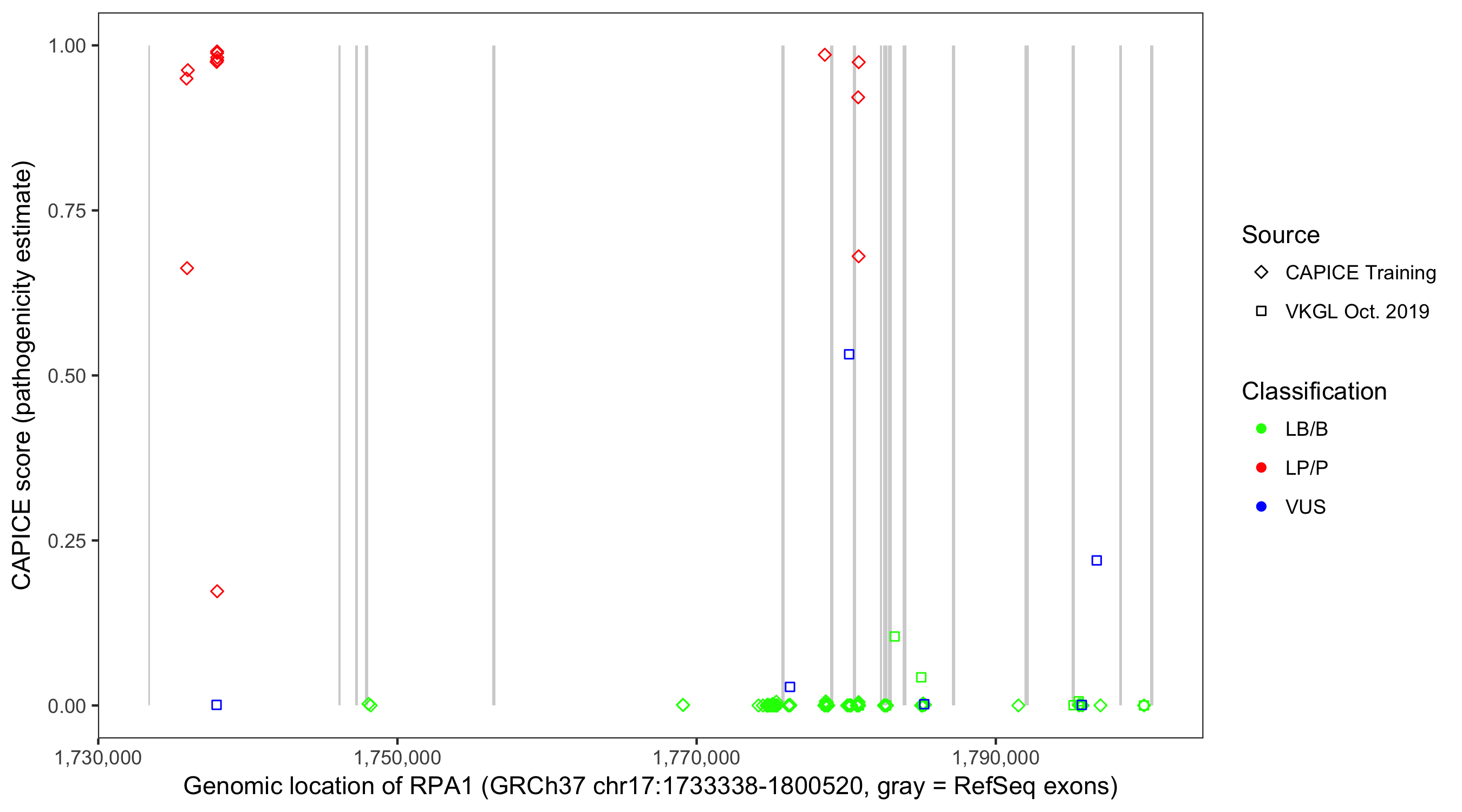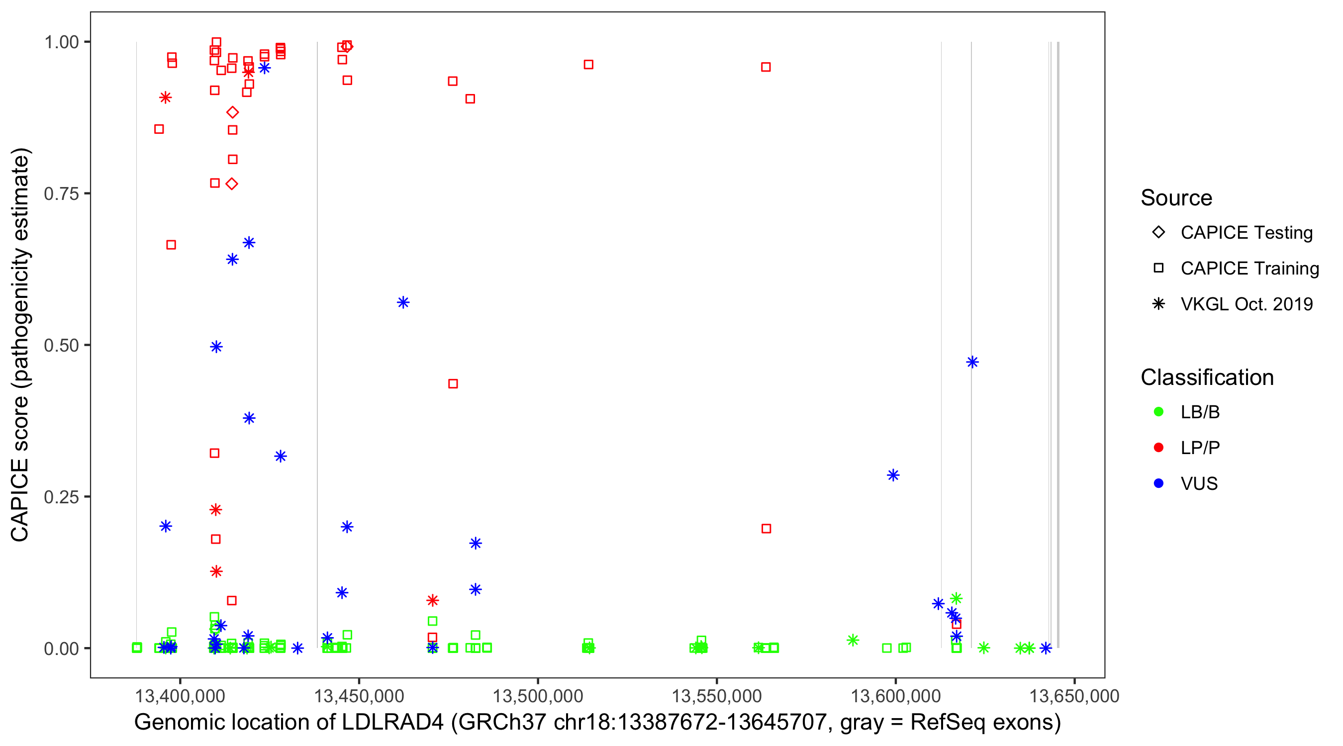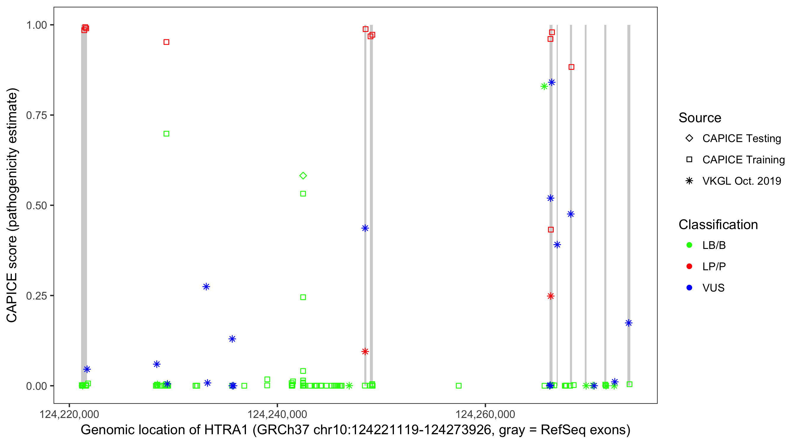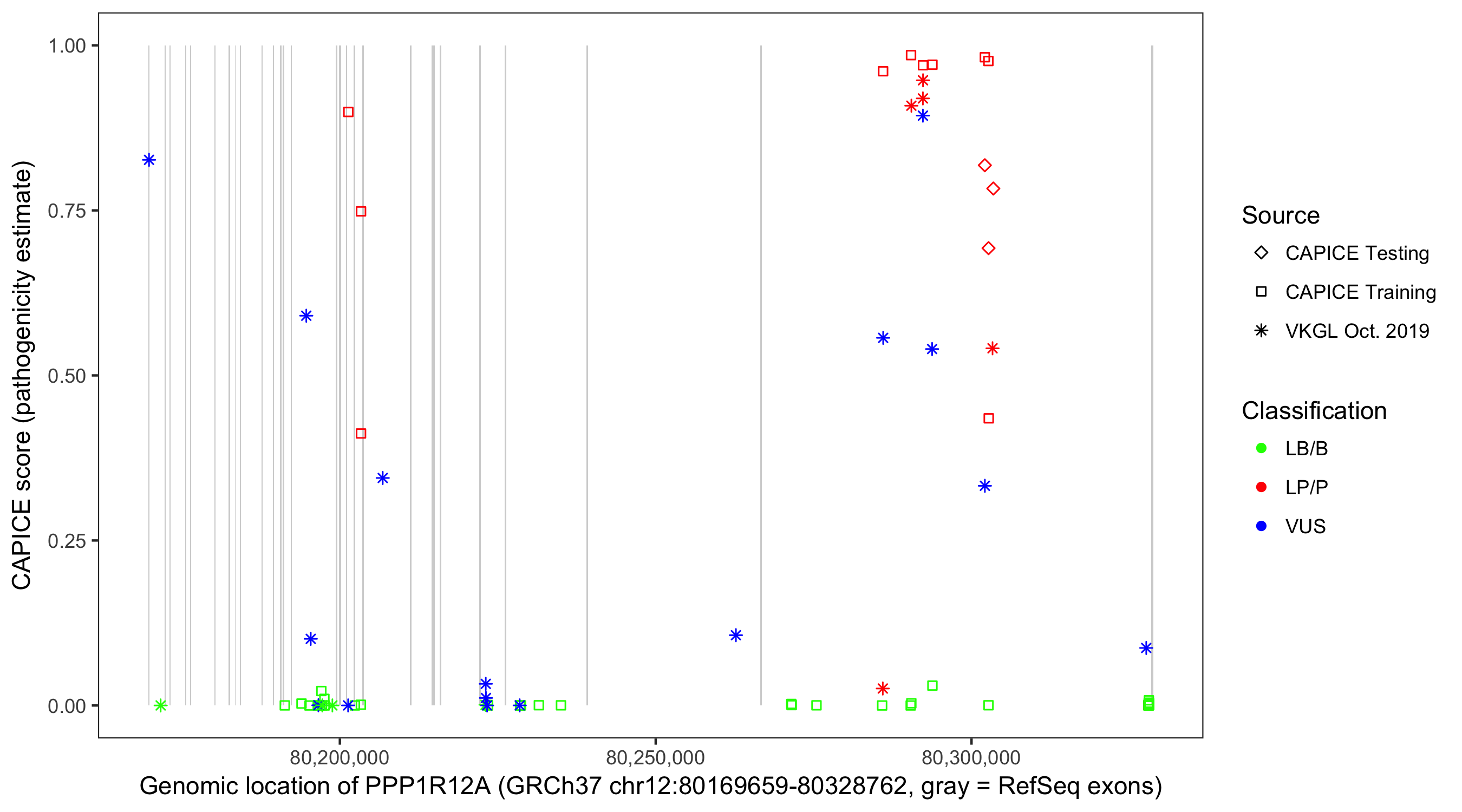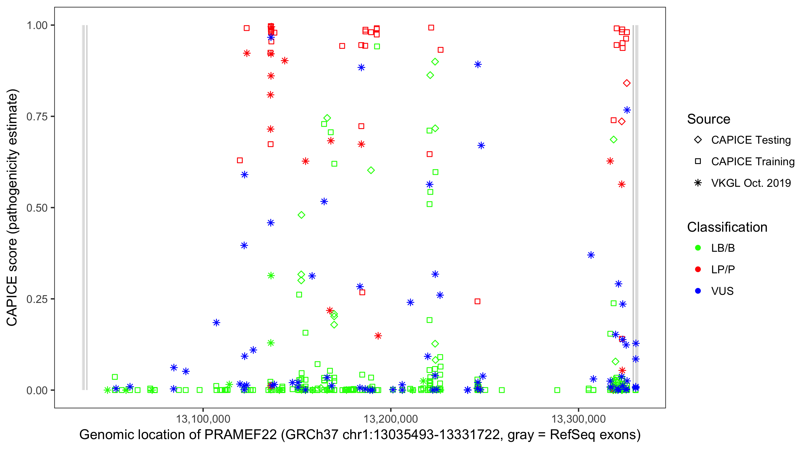 Shown are CAPICE train/test variants plus VKGL Oct 2019.