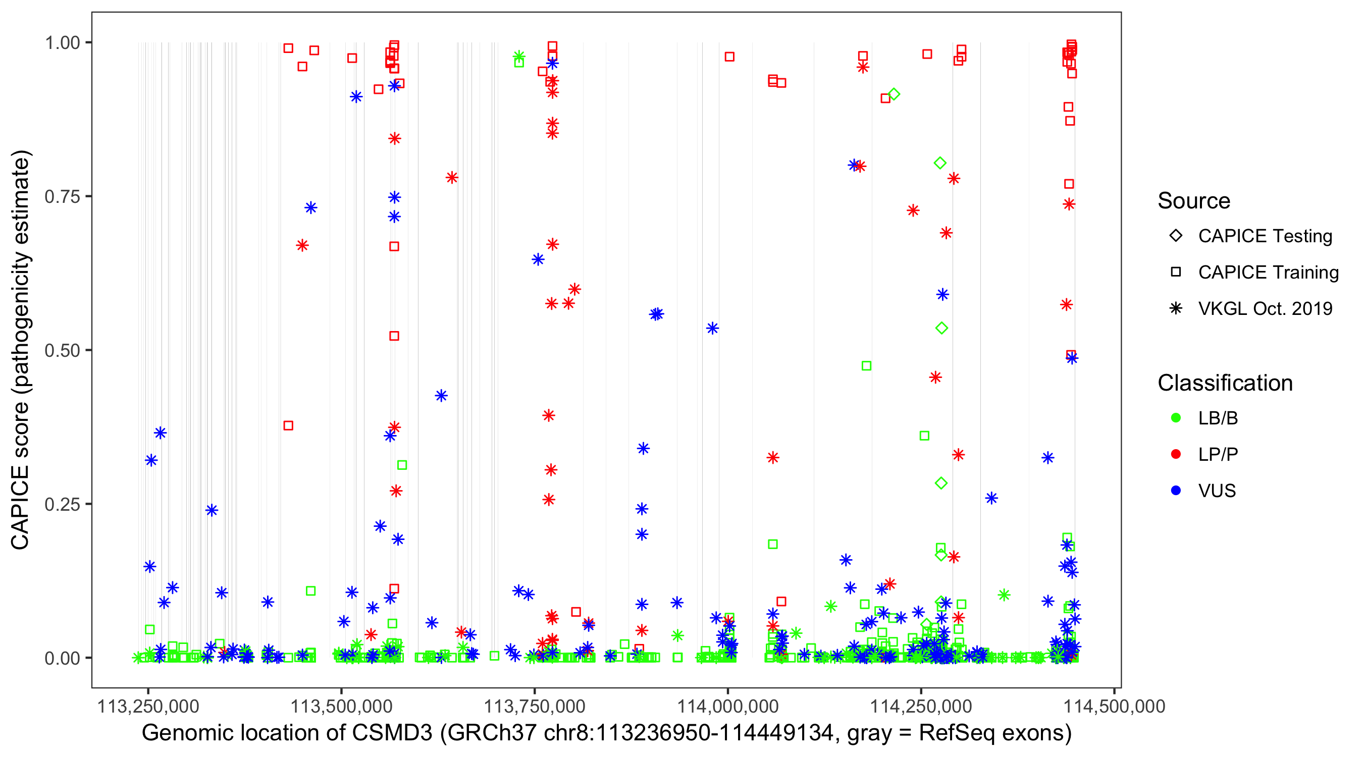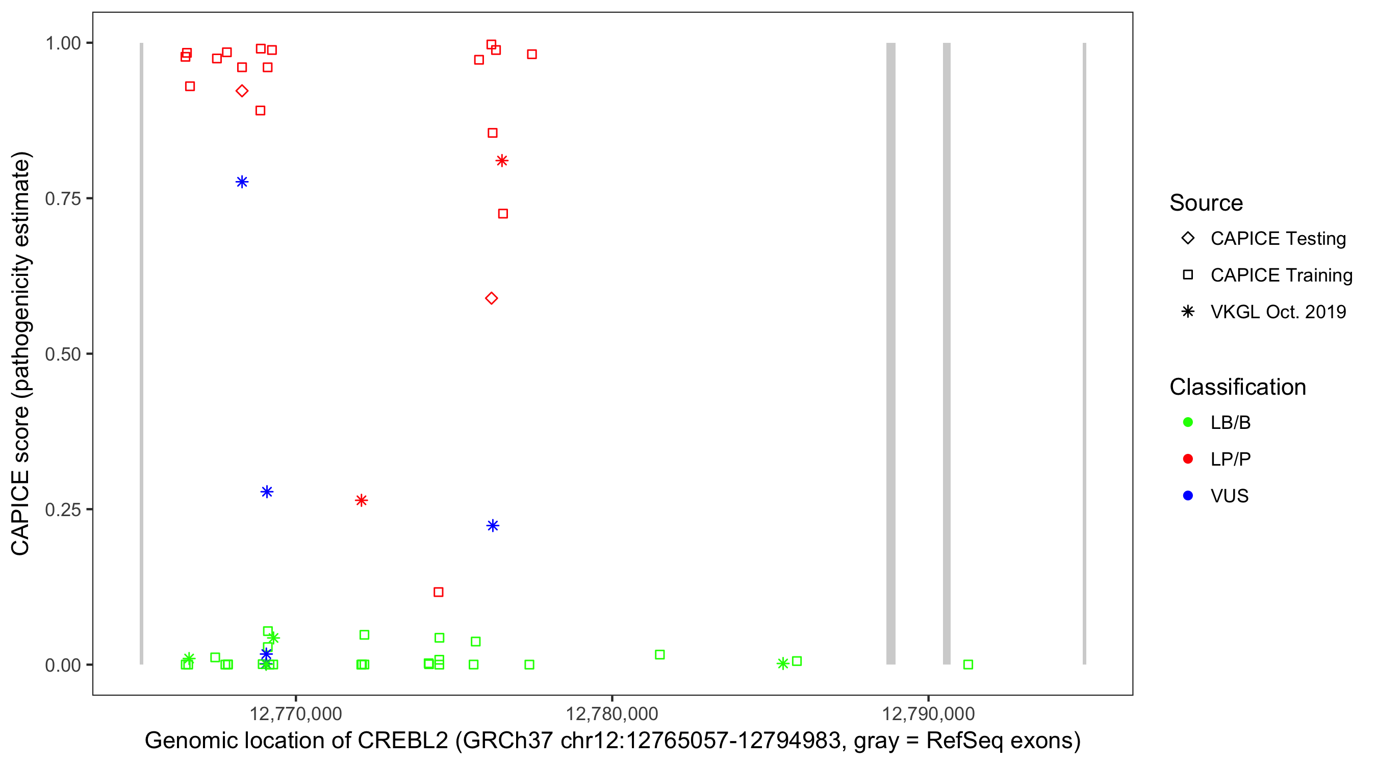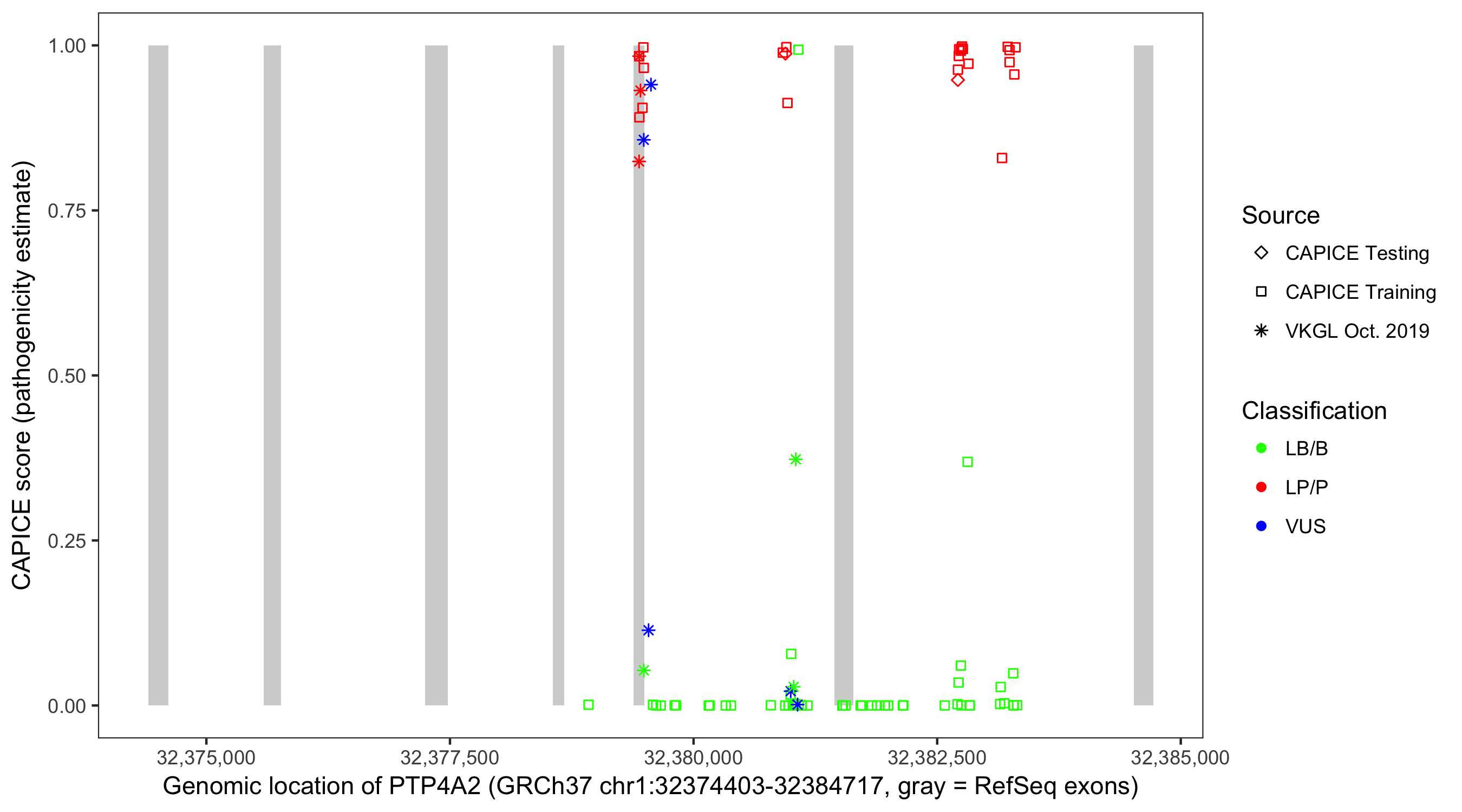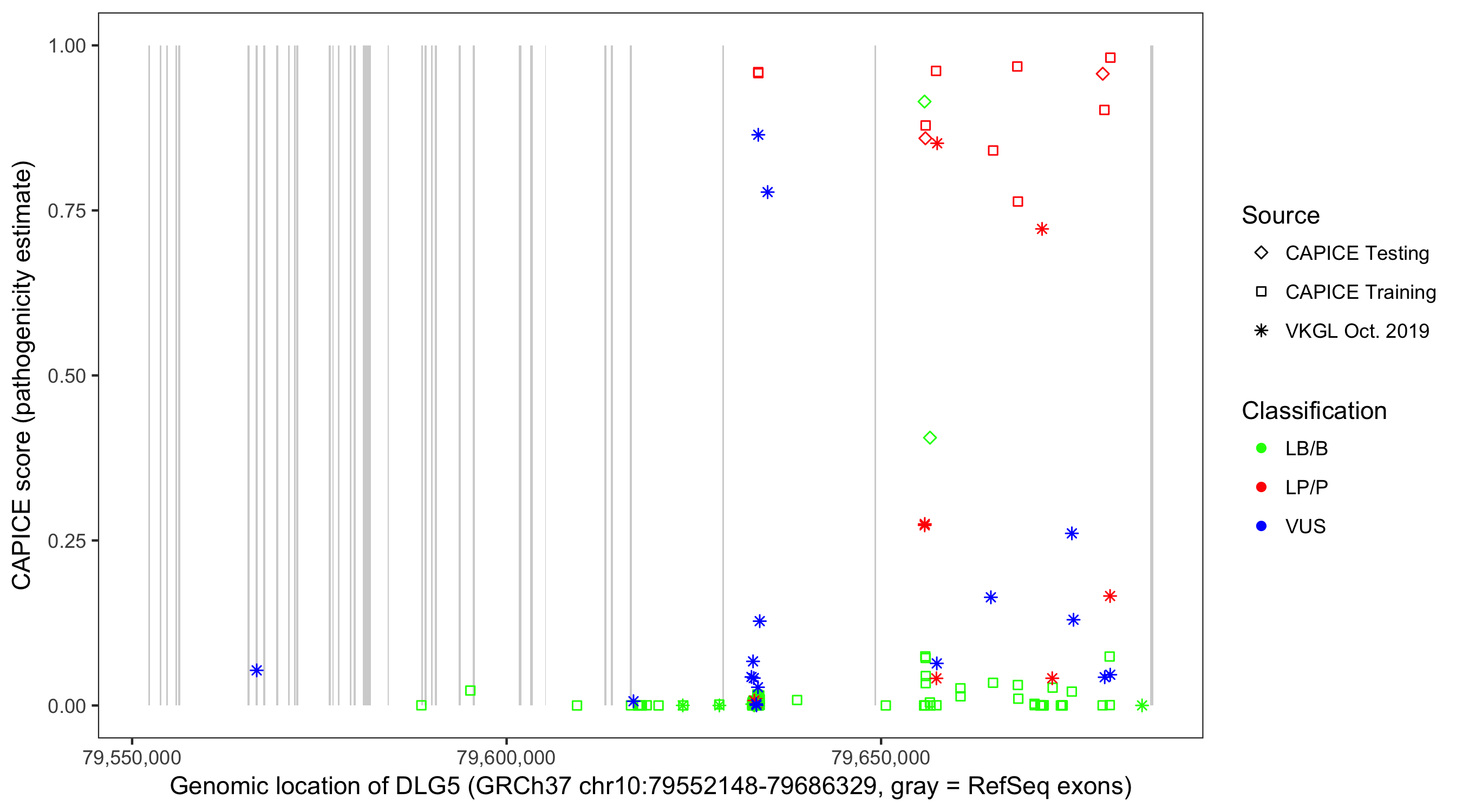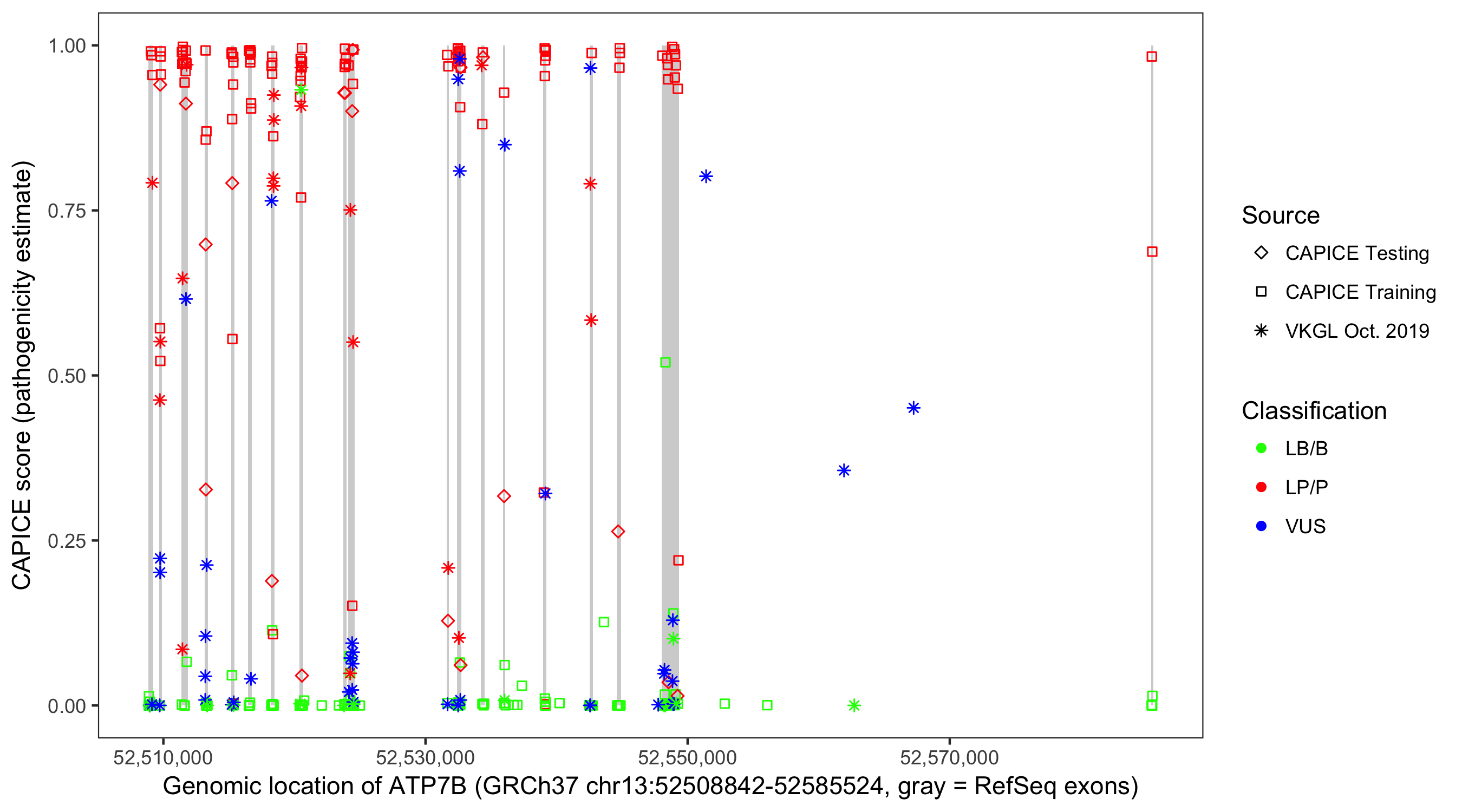 Shown are CAPICE train/test variants plus VKGL Oct 2019.