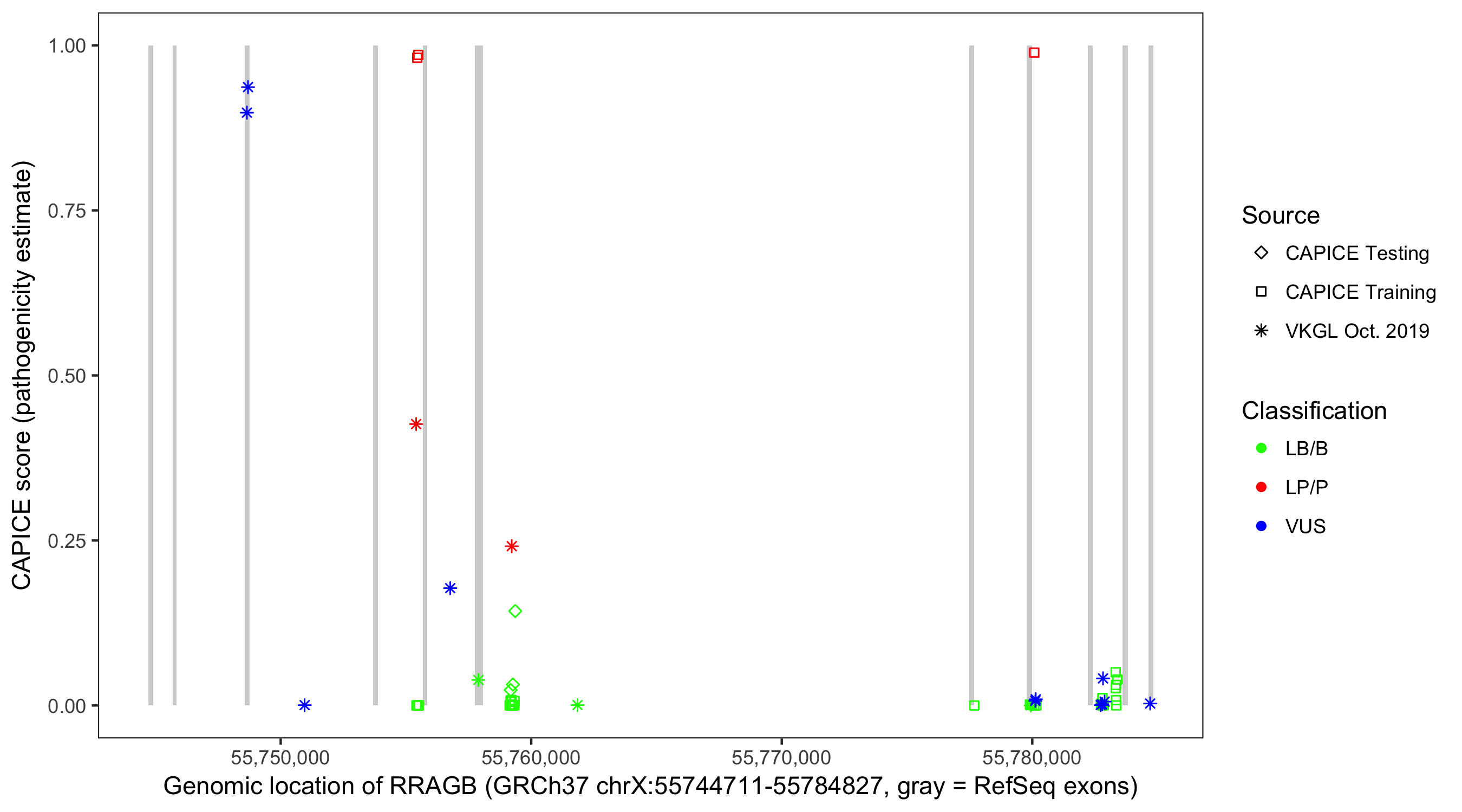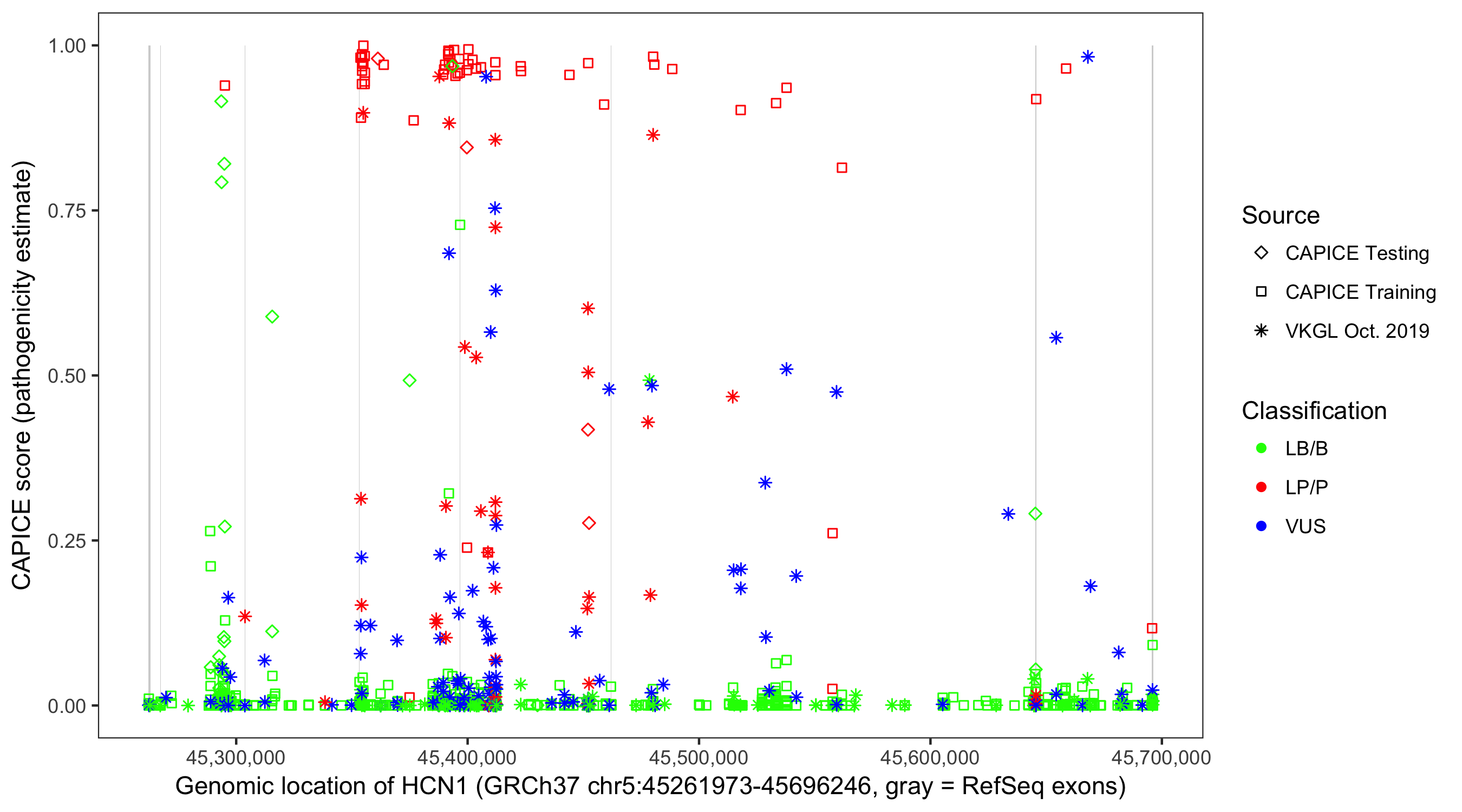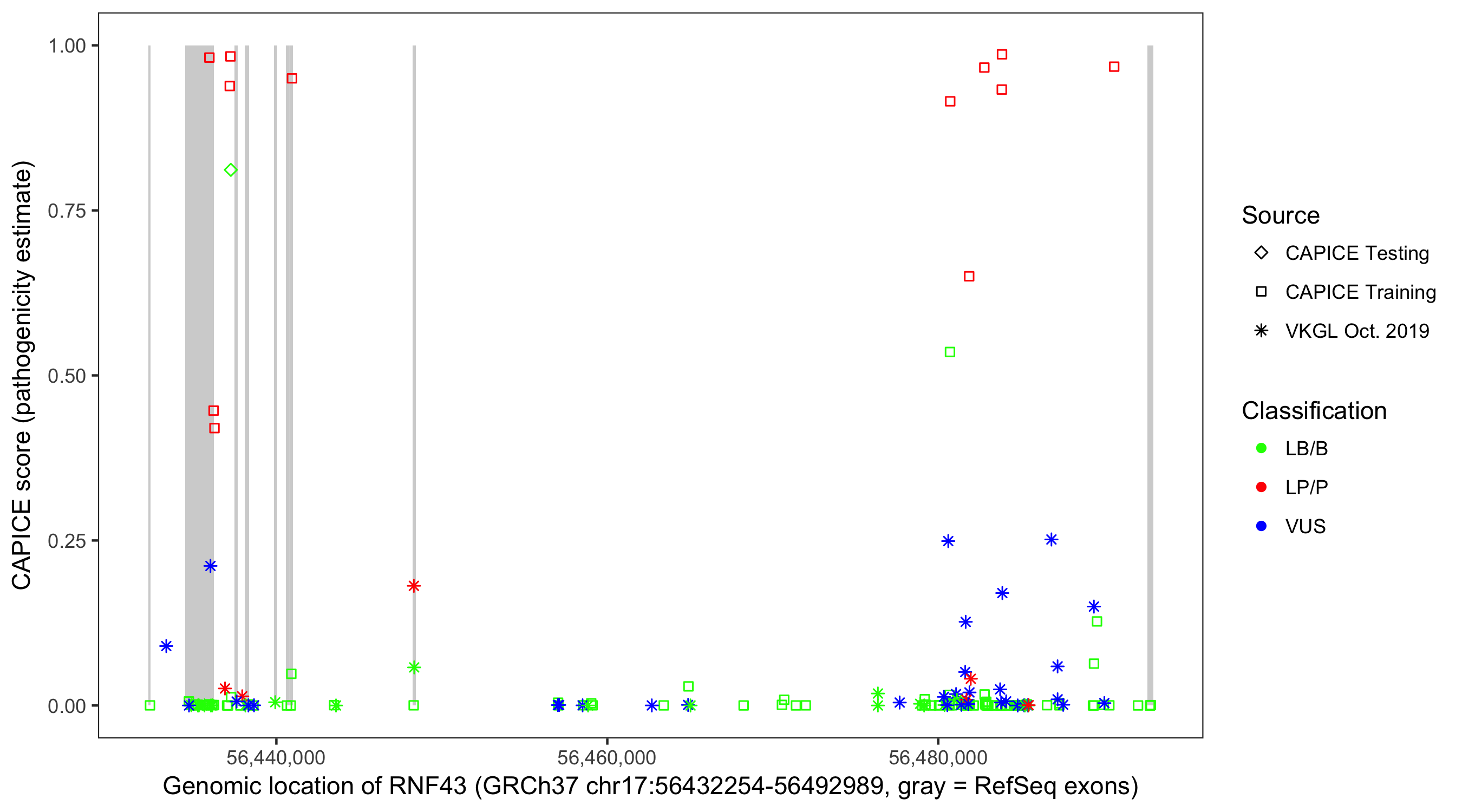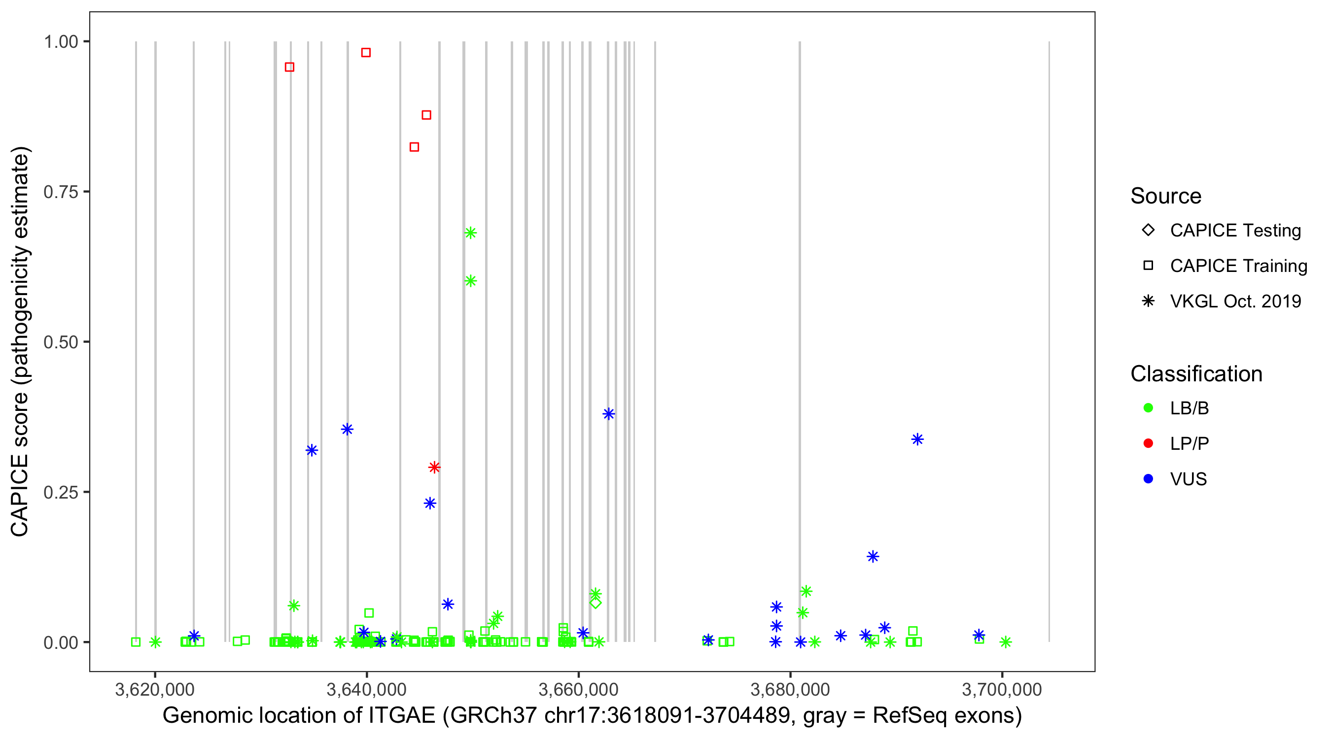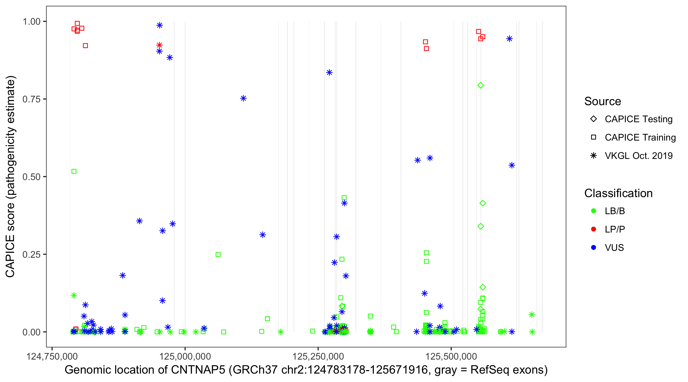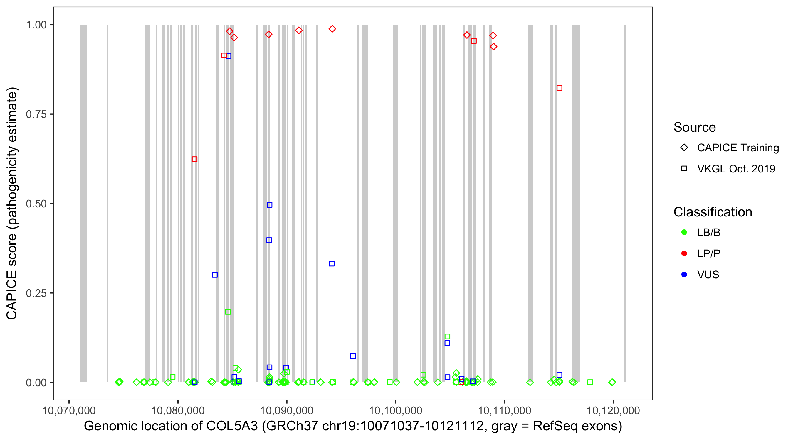 Shown are CAPICE train/test variants plus VKGL Oct 2019.