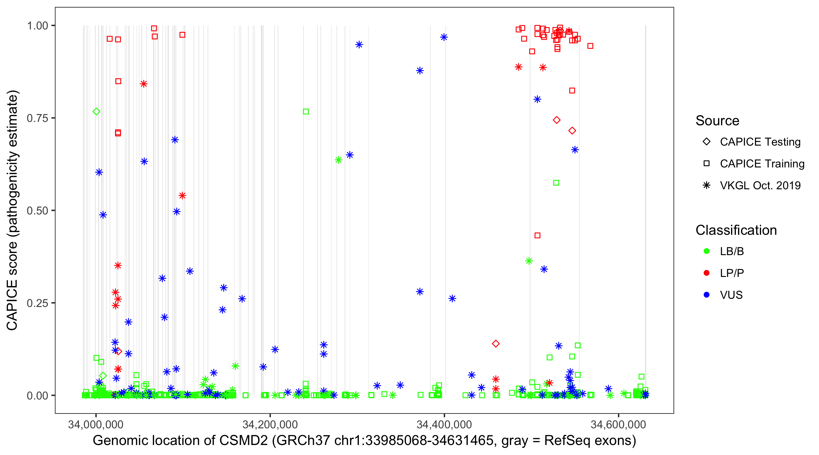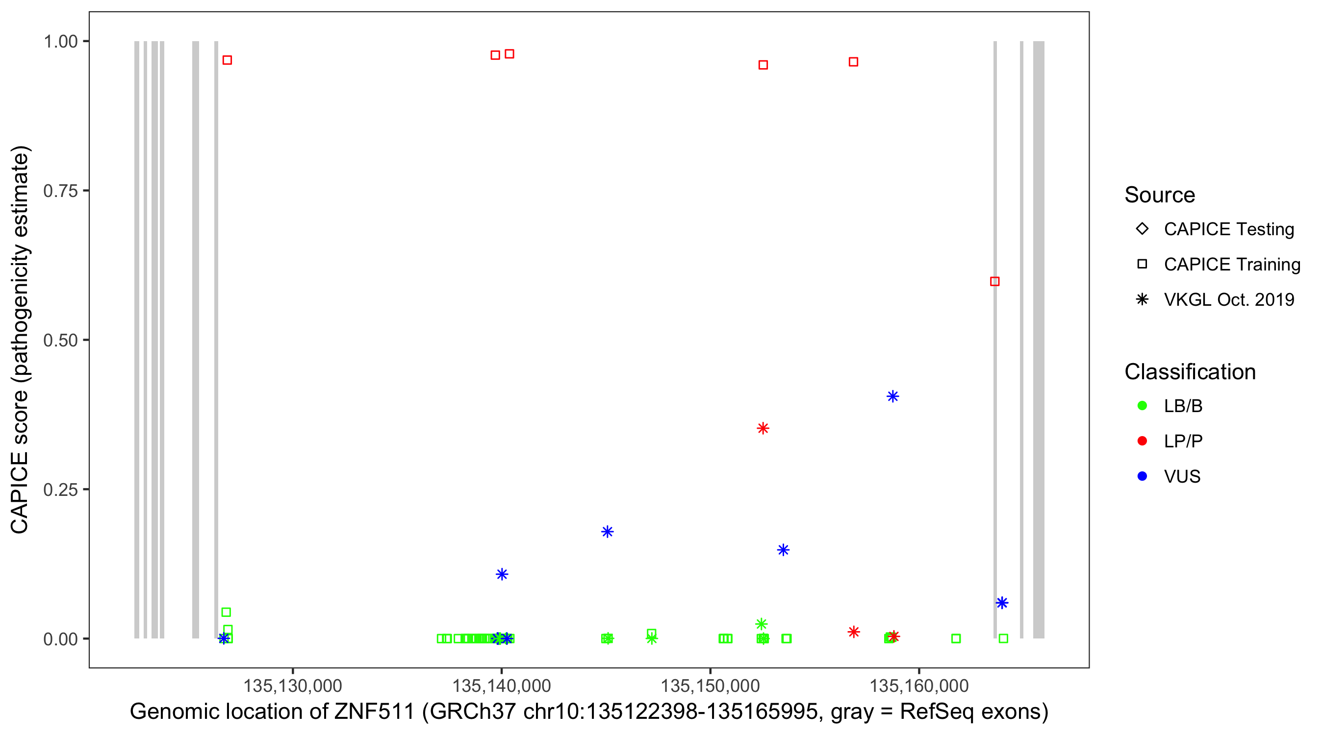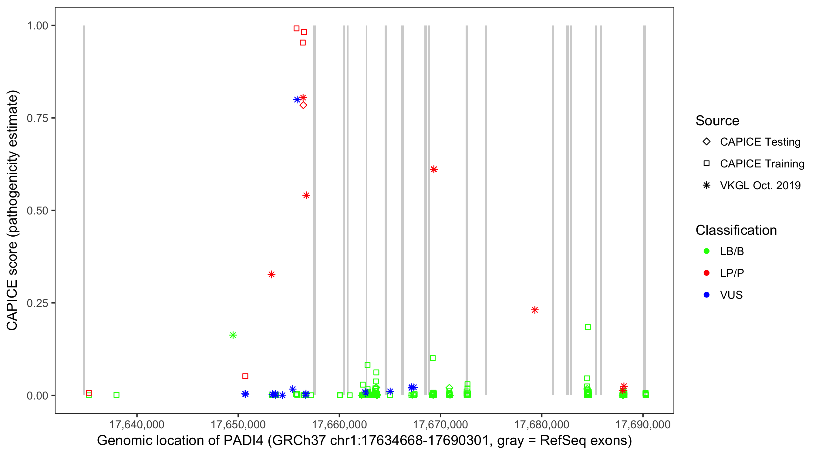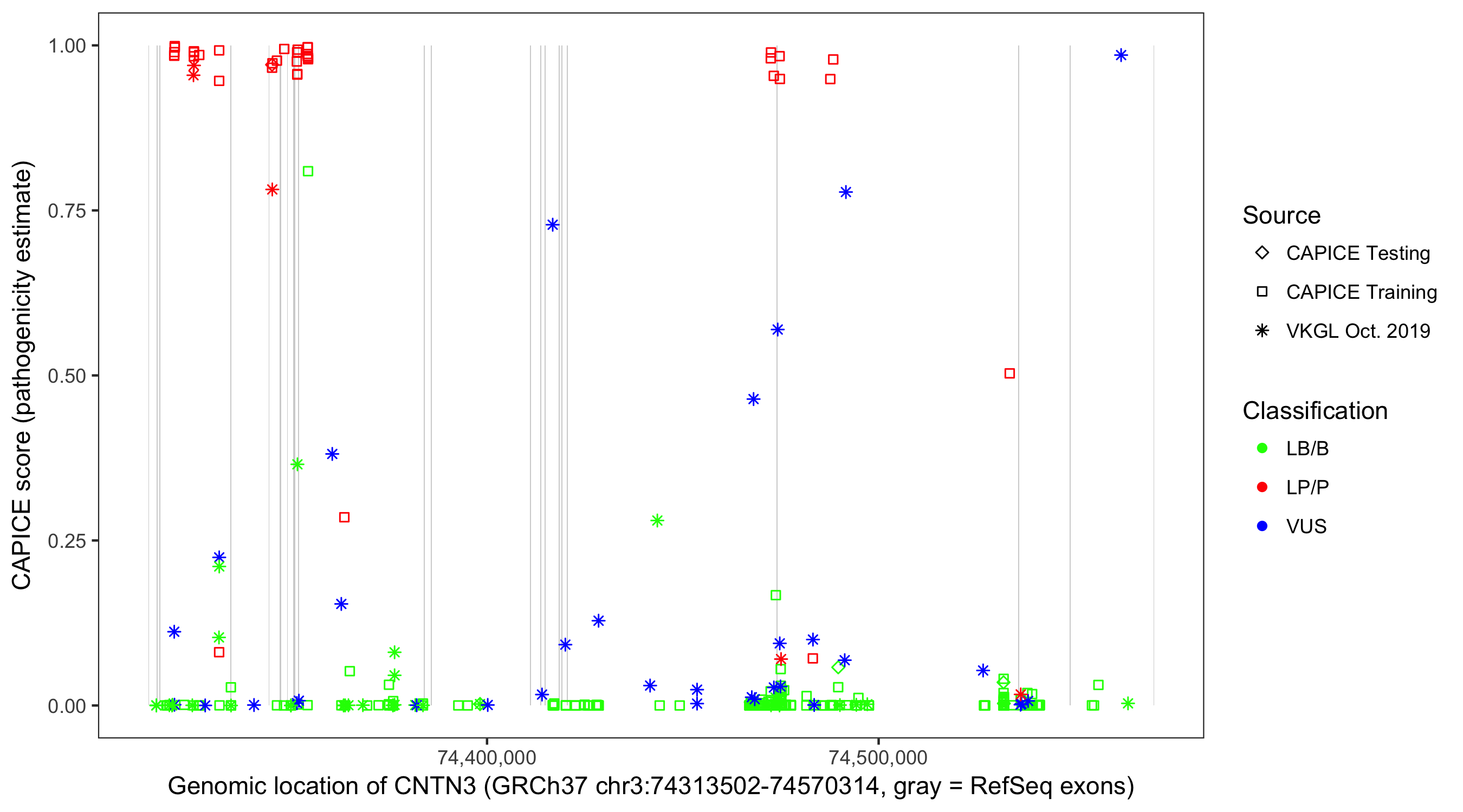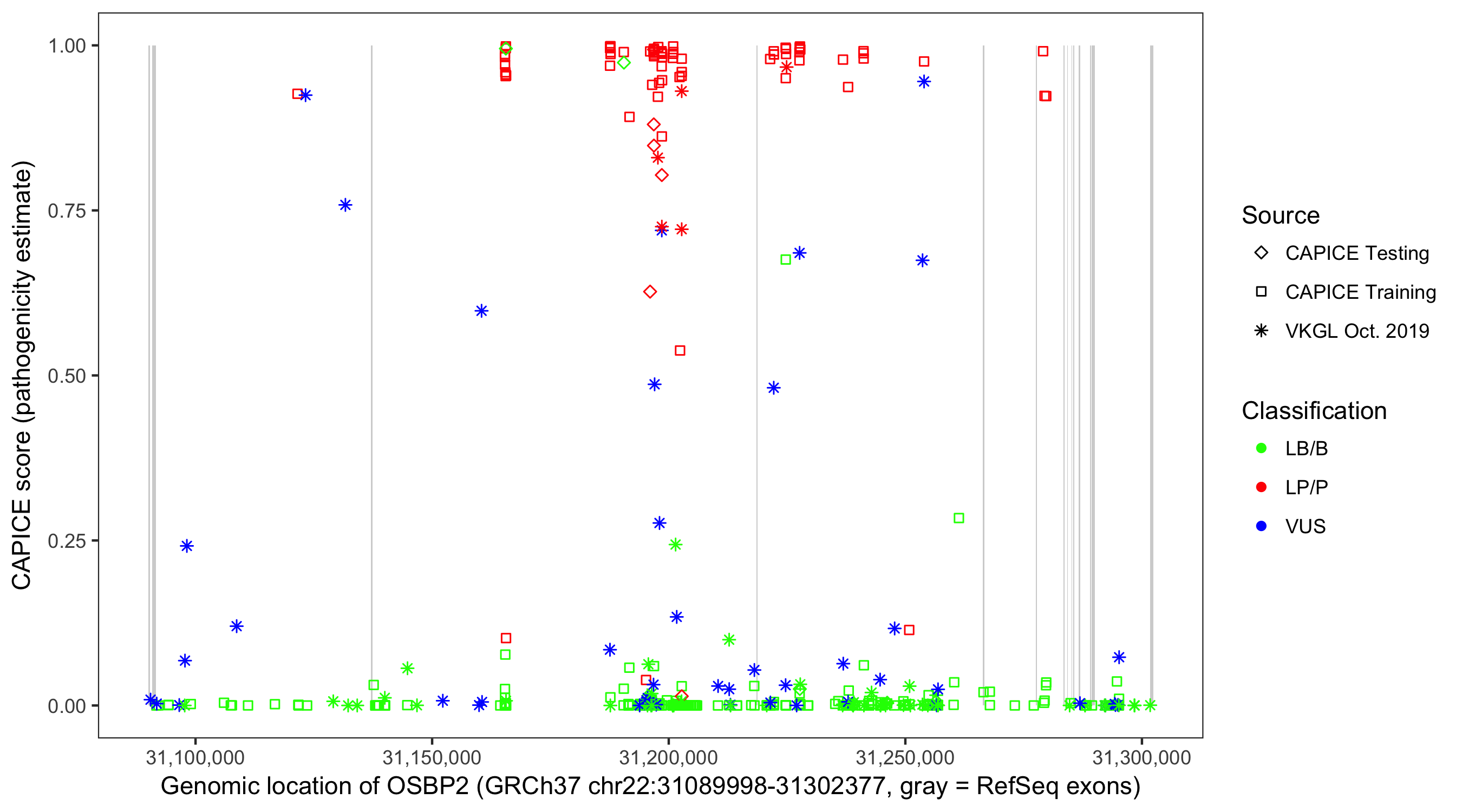 Shown are CAPICE train/test variants plus VKGL Oct 2019.