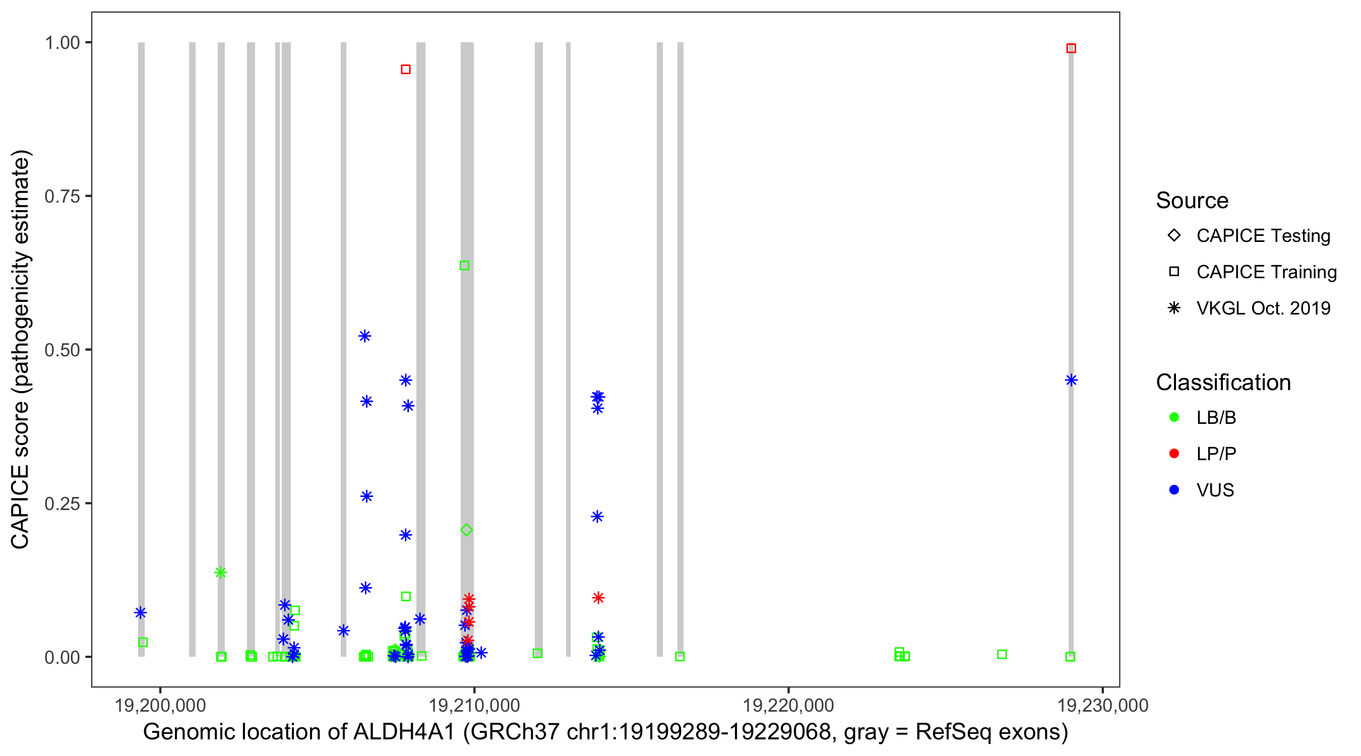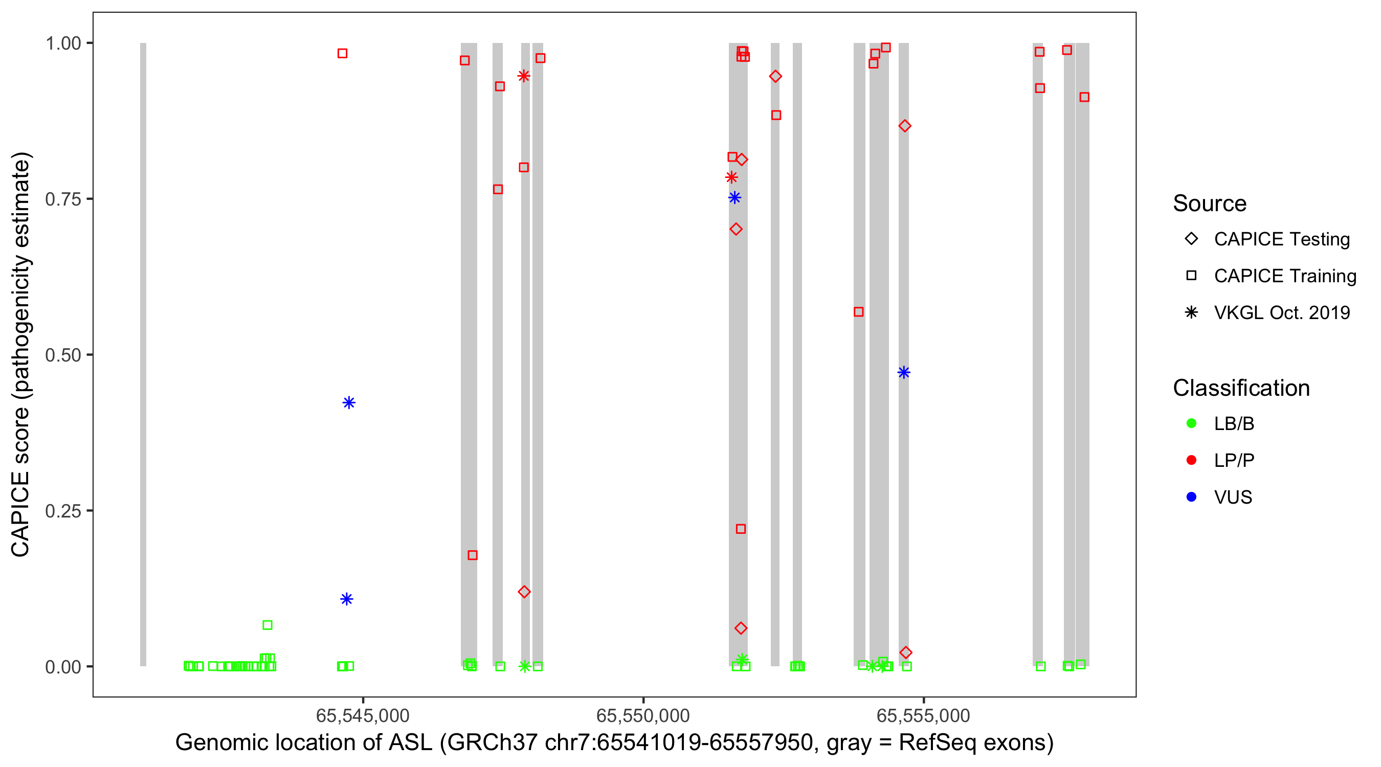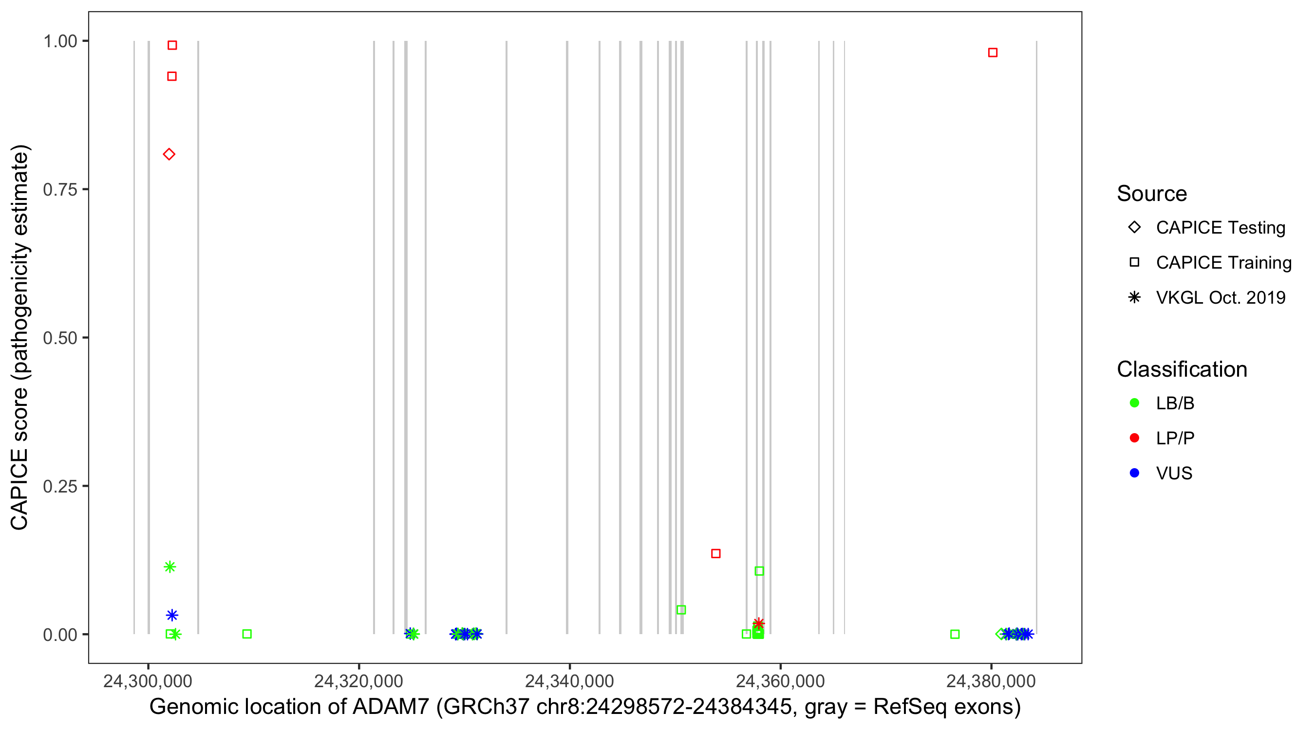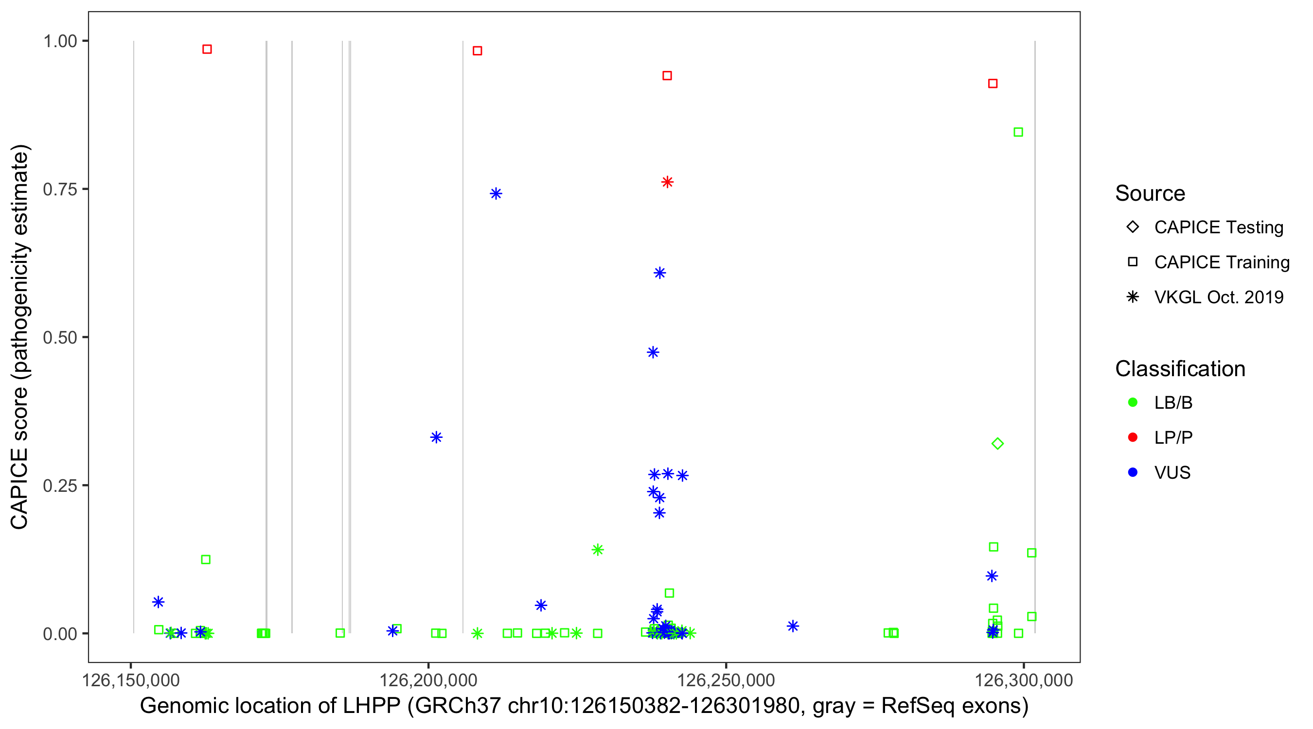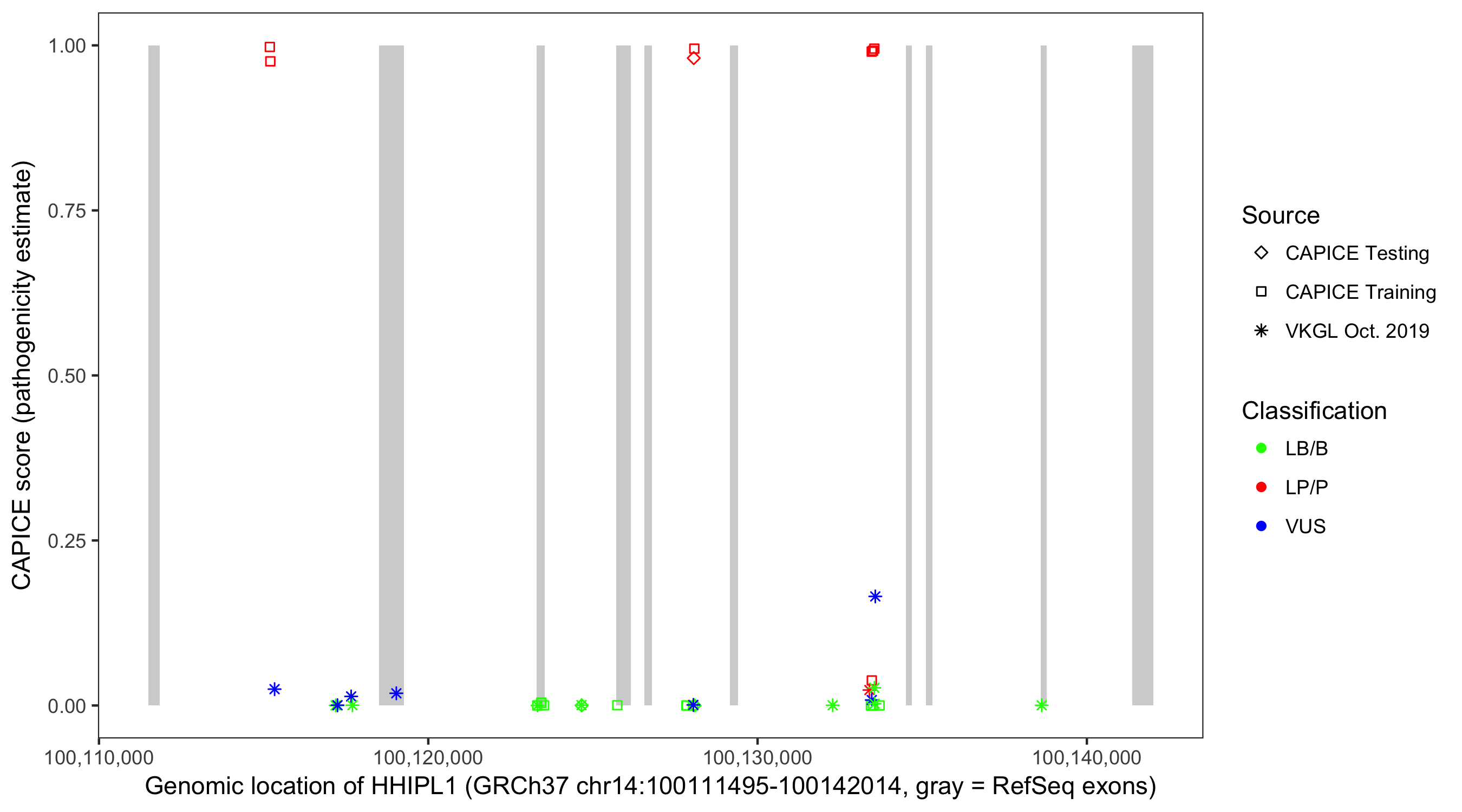 Shown are CAPICE train/test variants plus VKGL Oct 2019.