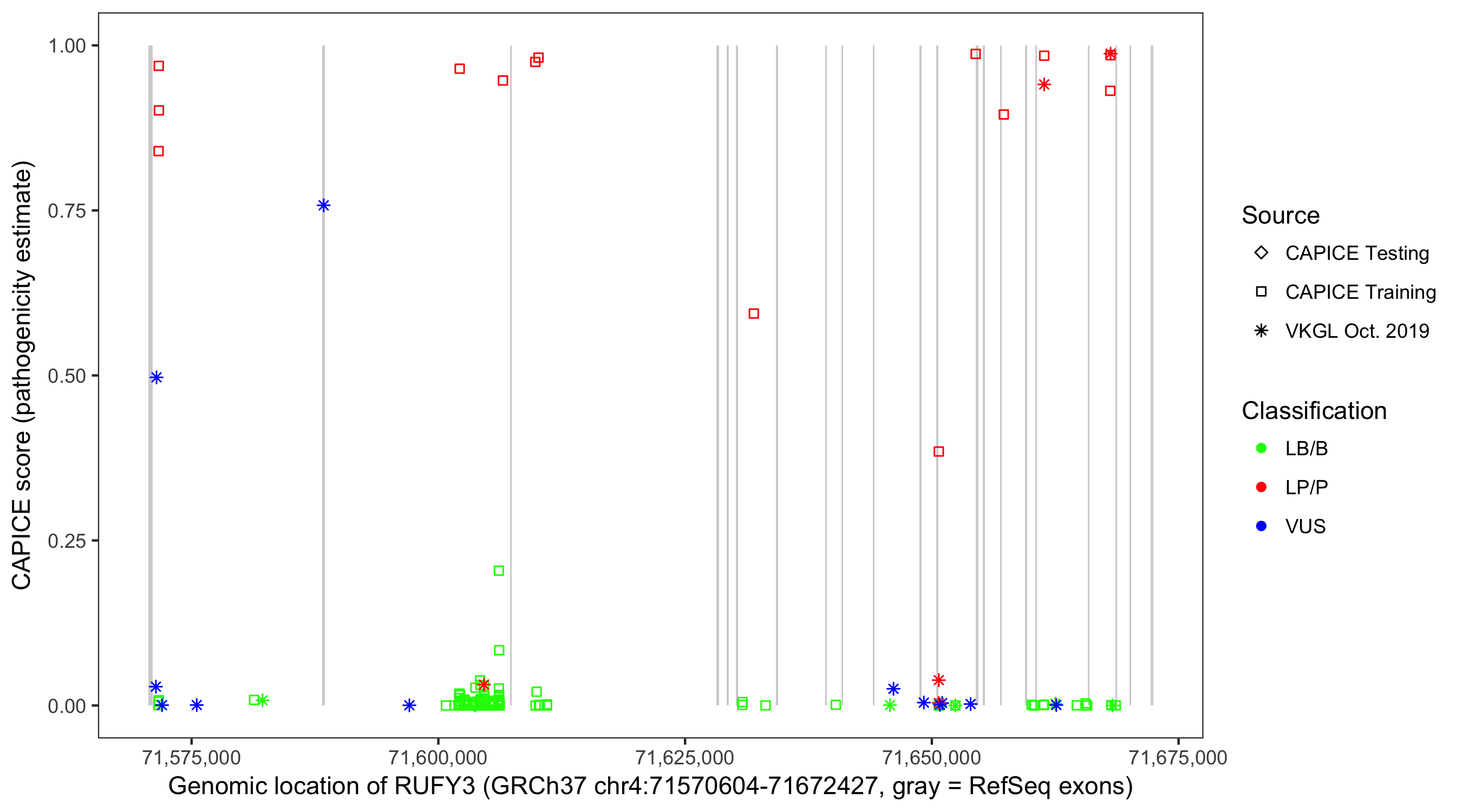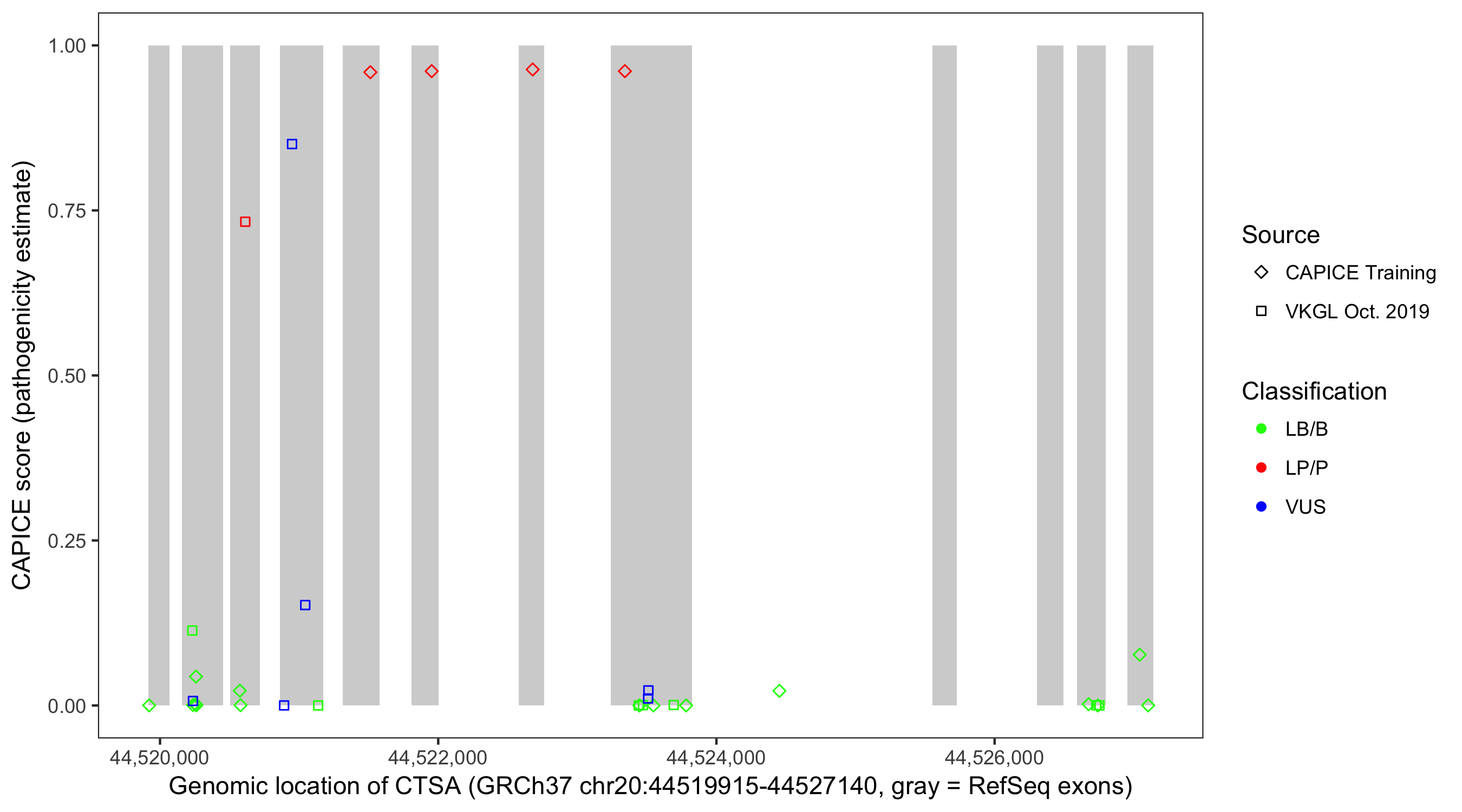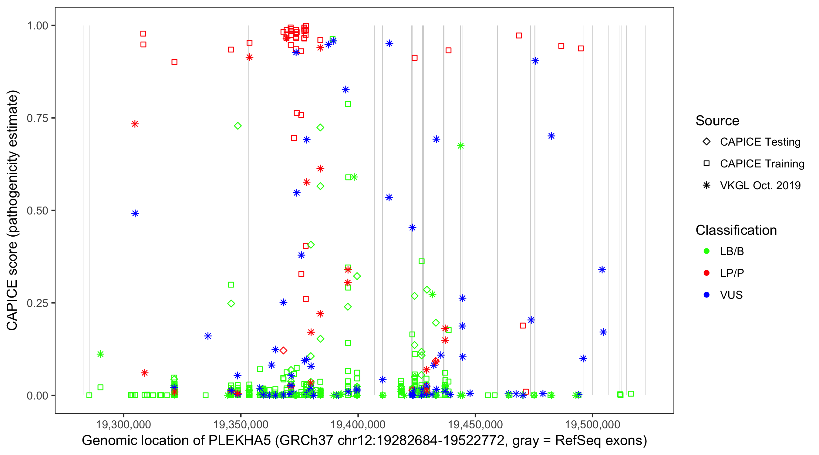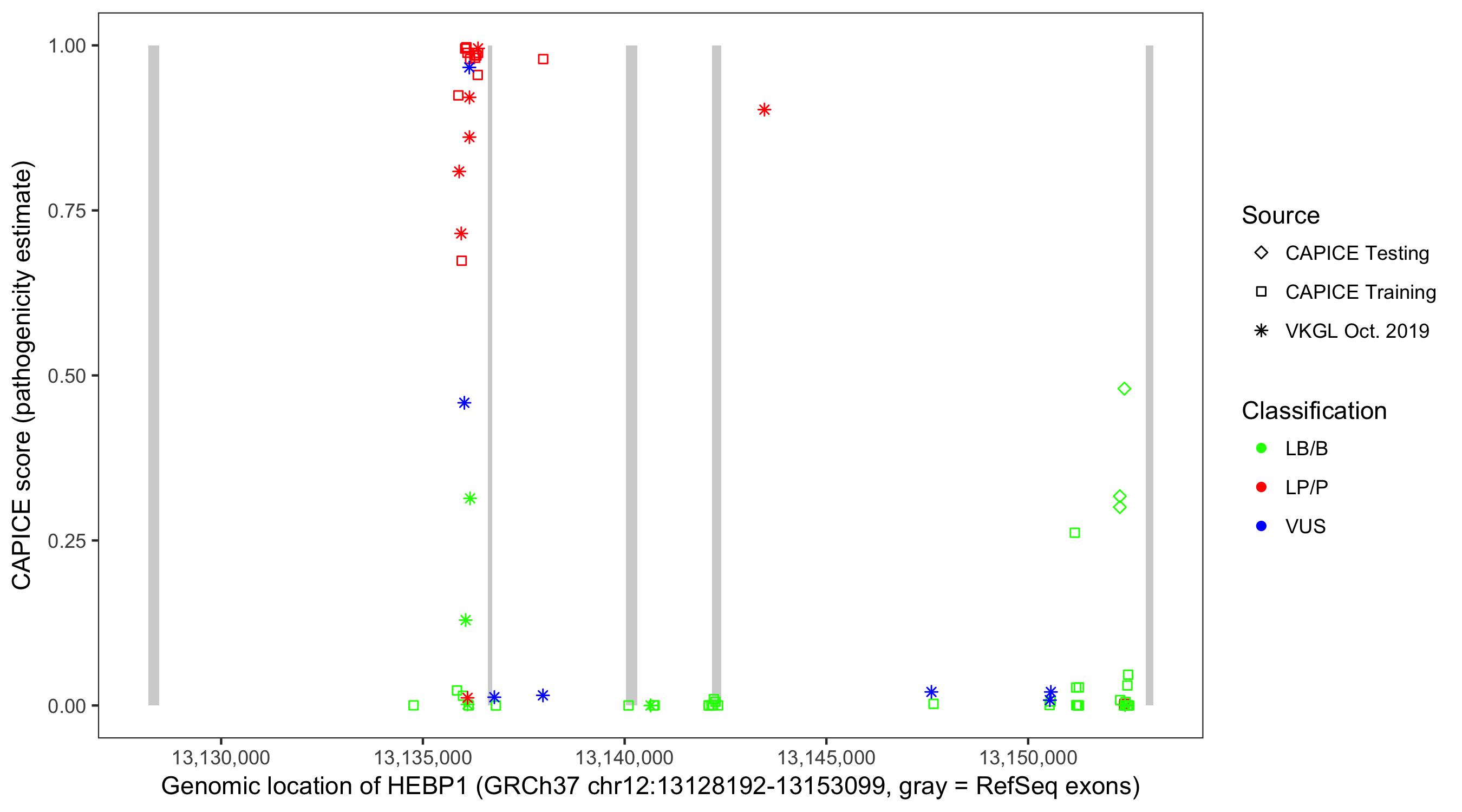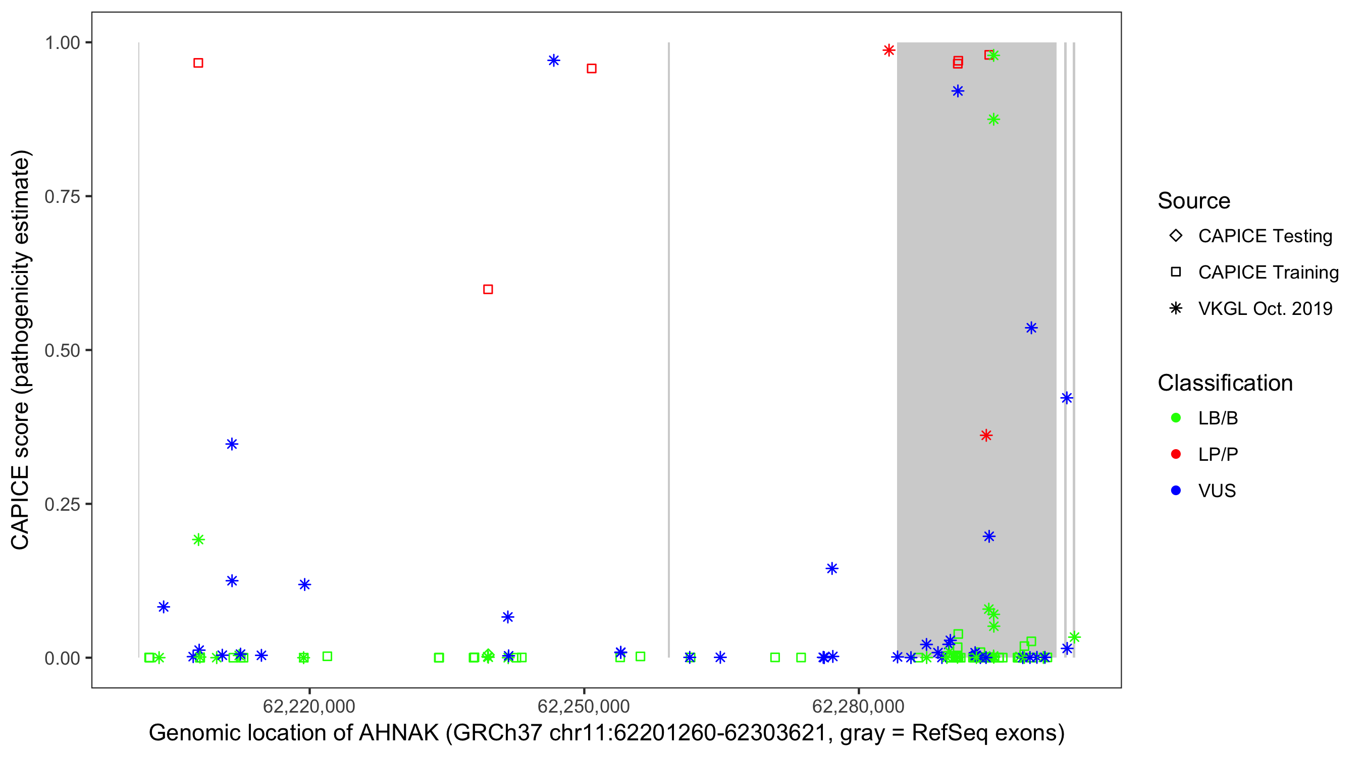Shown are CAPICE train/test variants plus VKGL Oct 2019.
