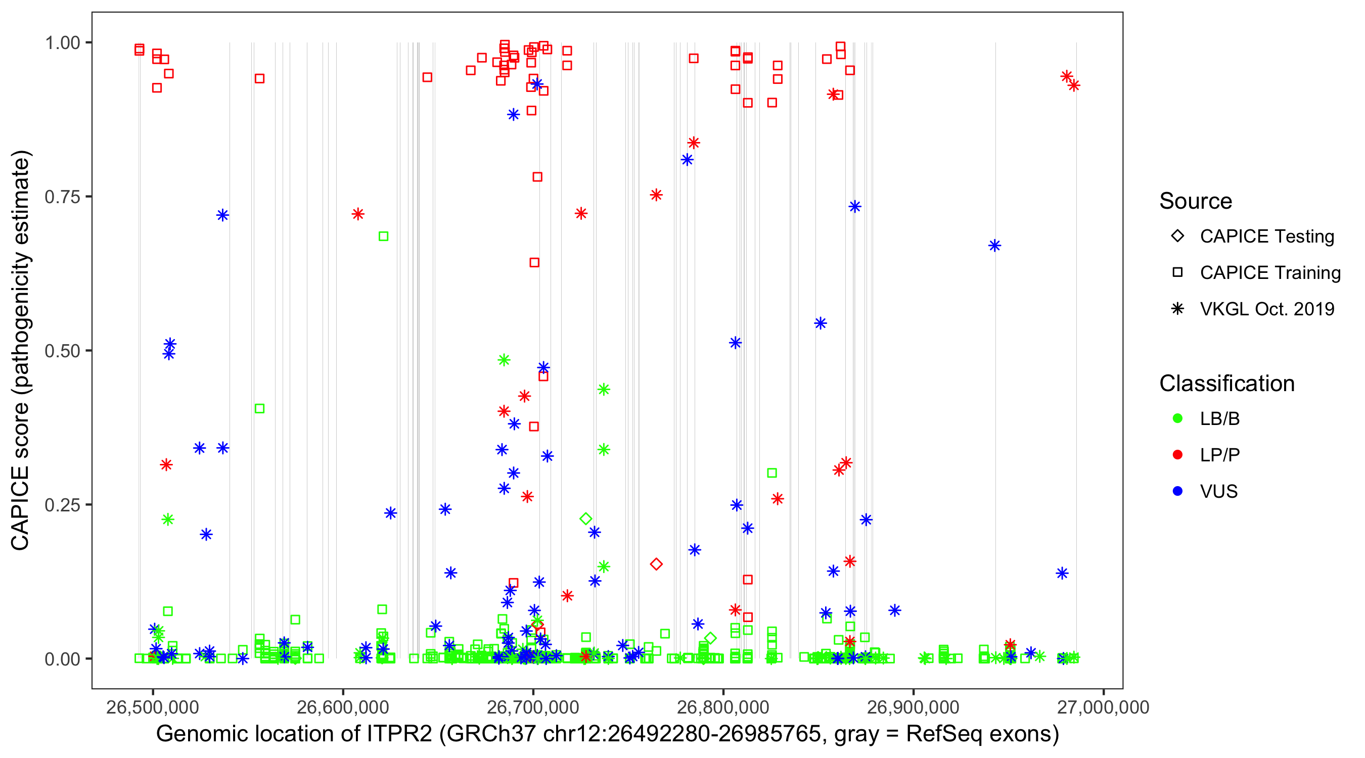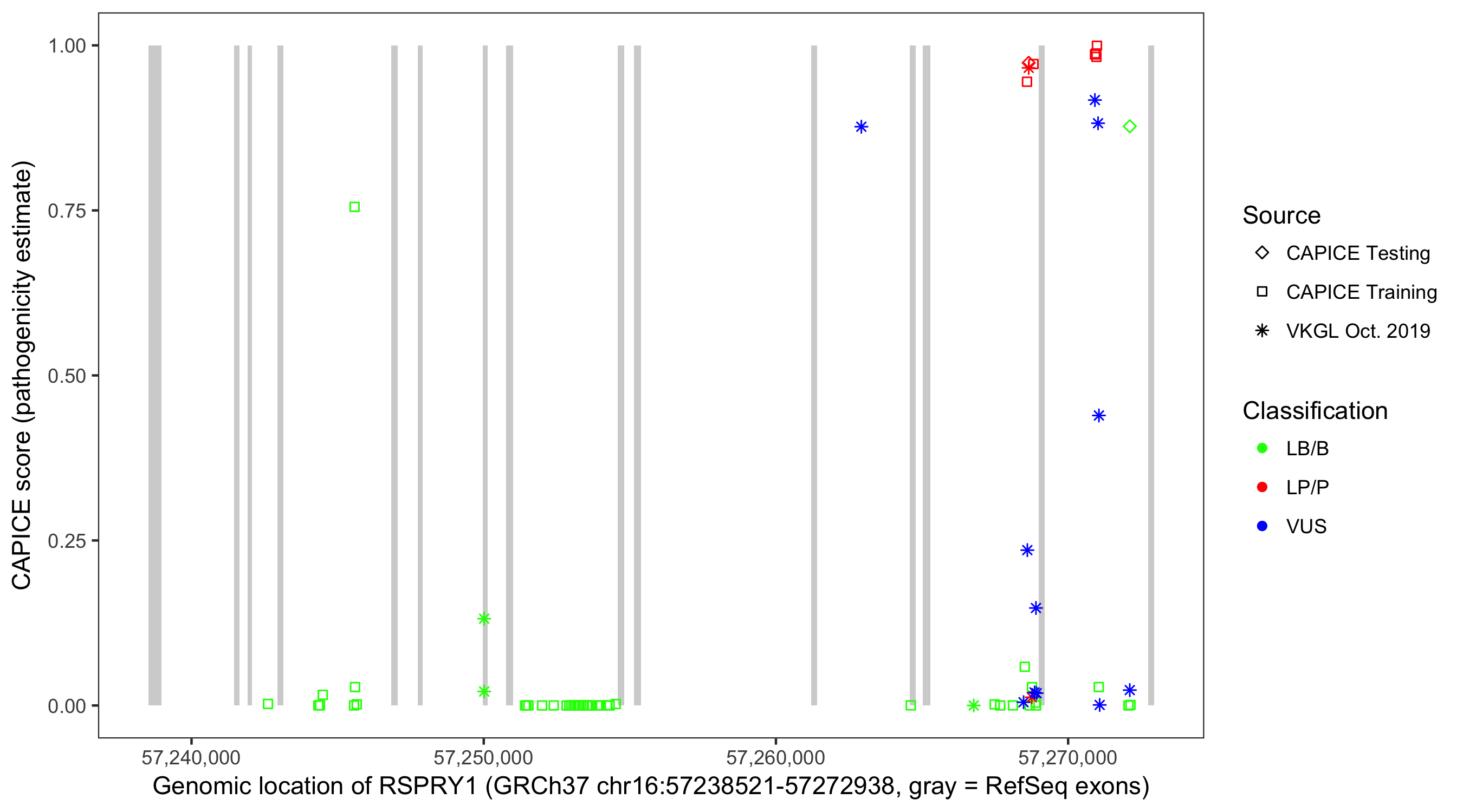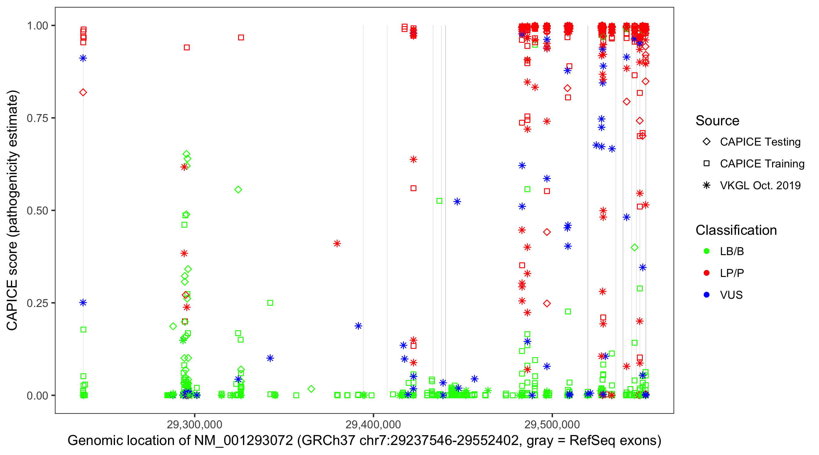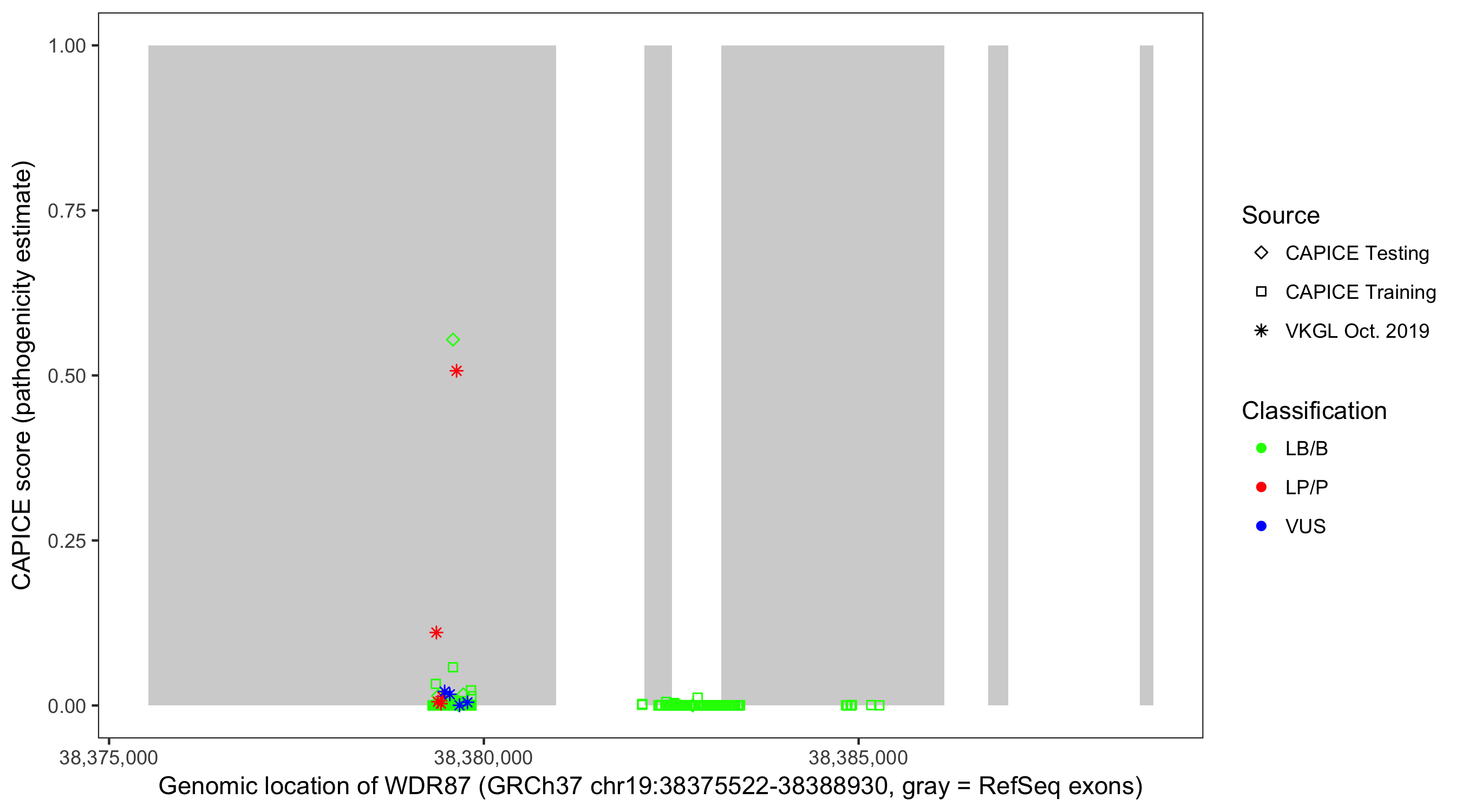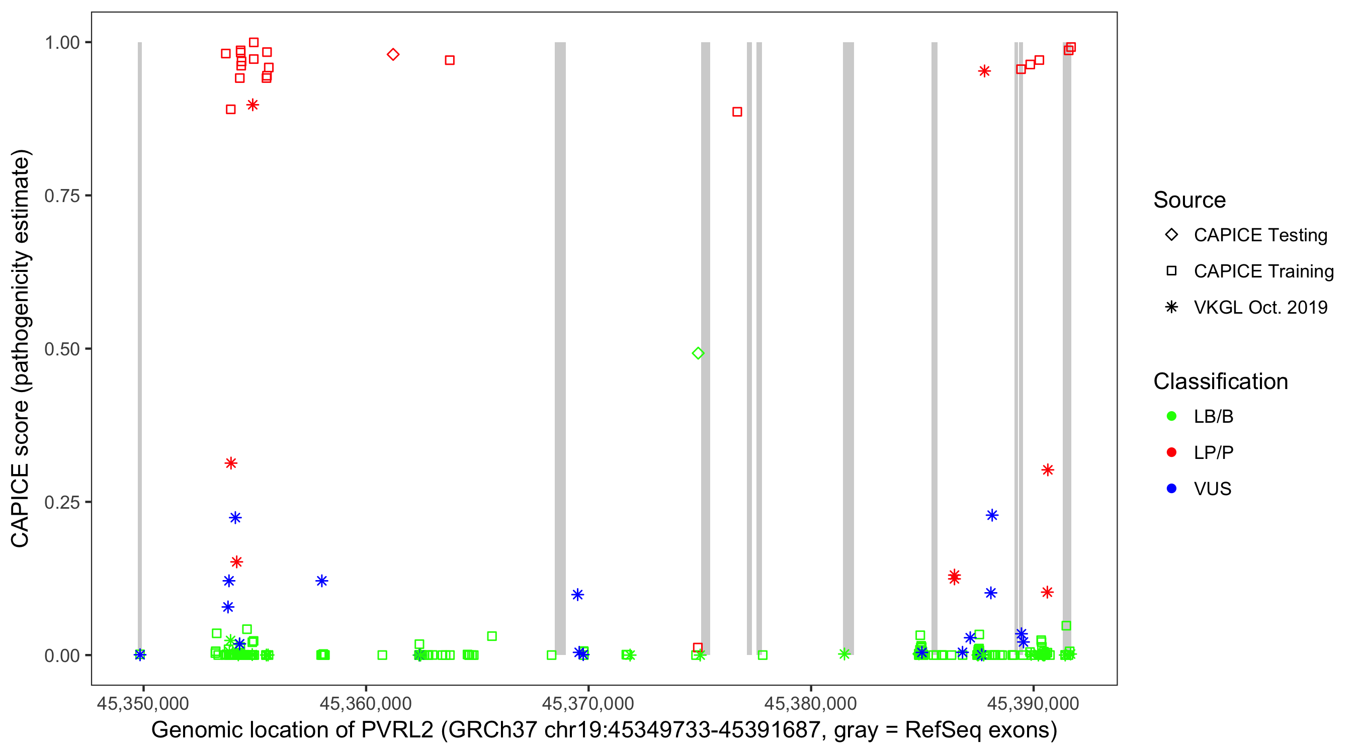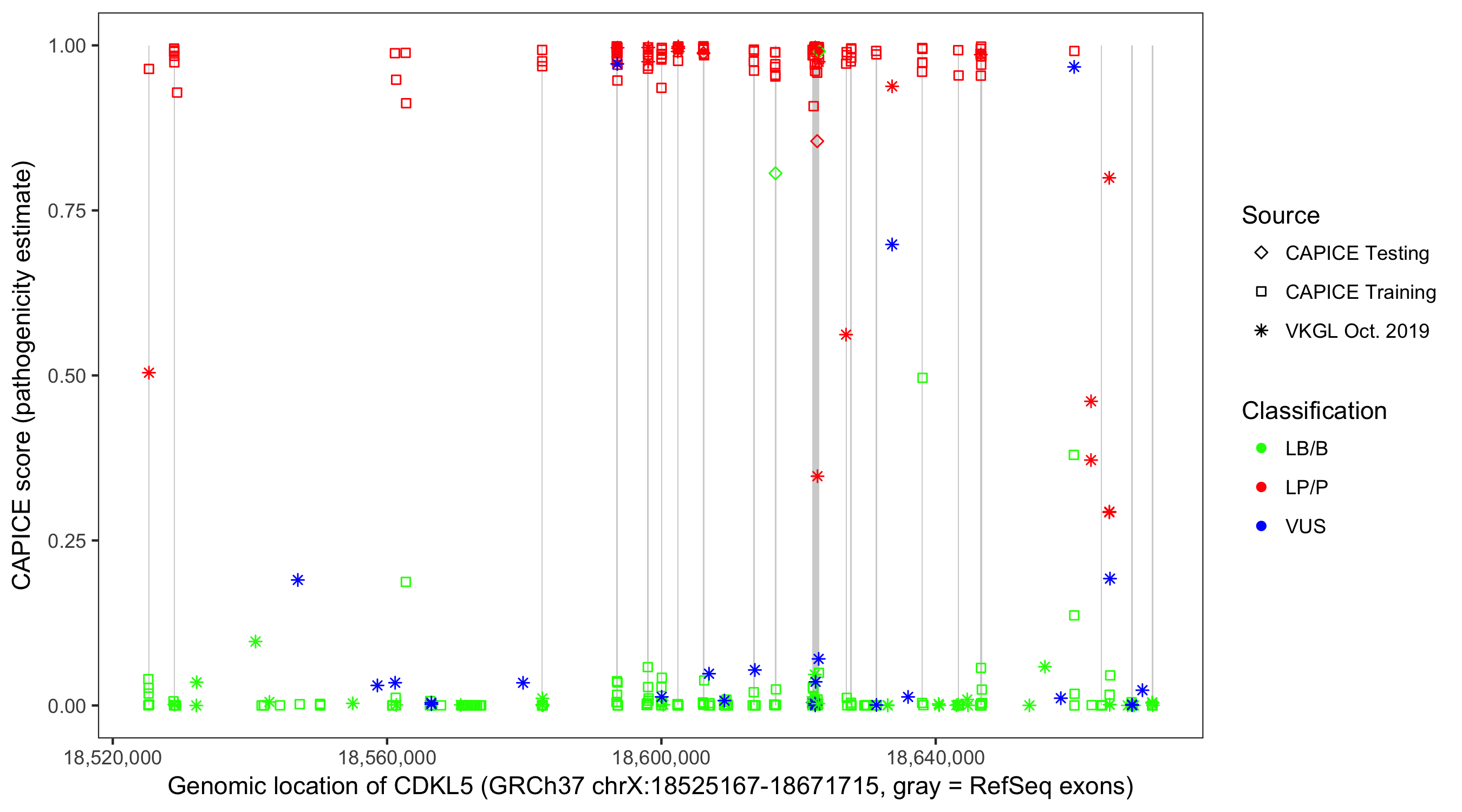 Shown are CAPICE train/test variants plus VKGL Oct 2019.