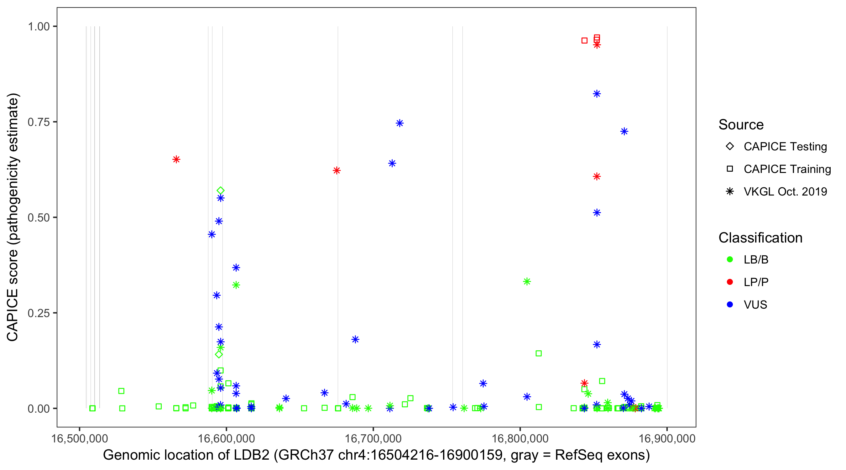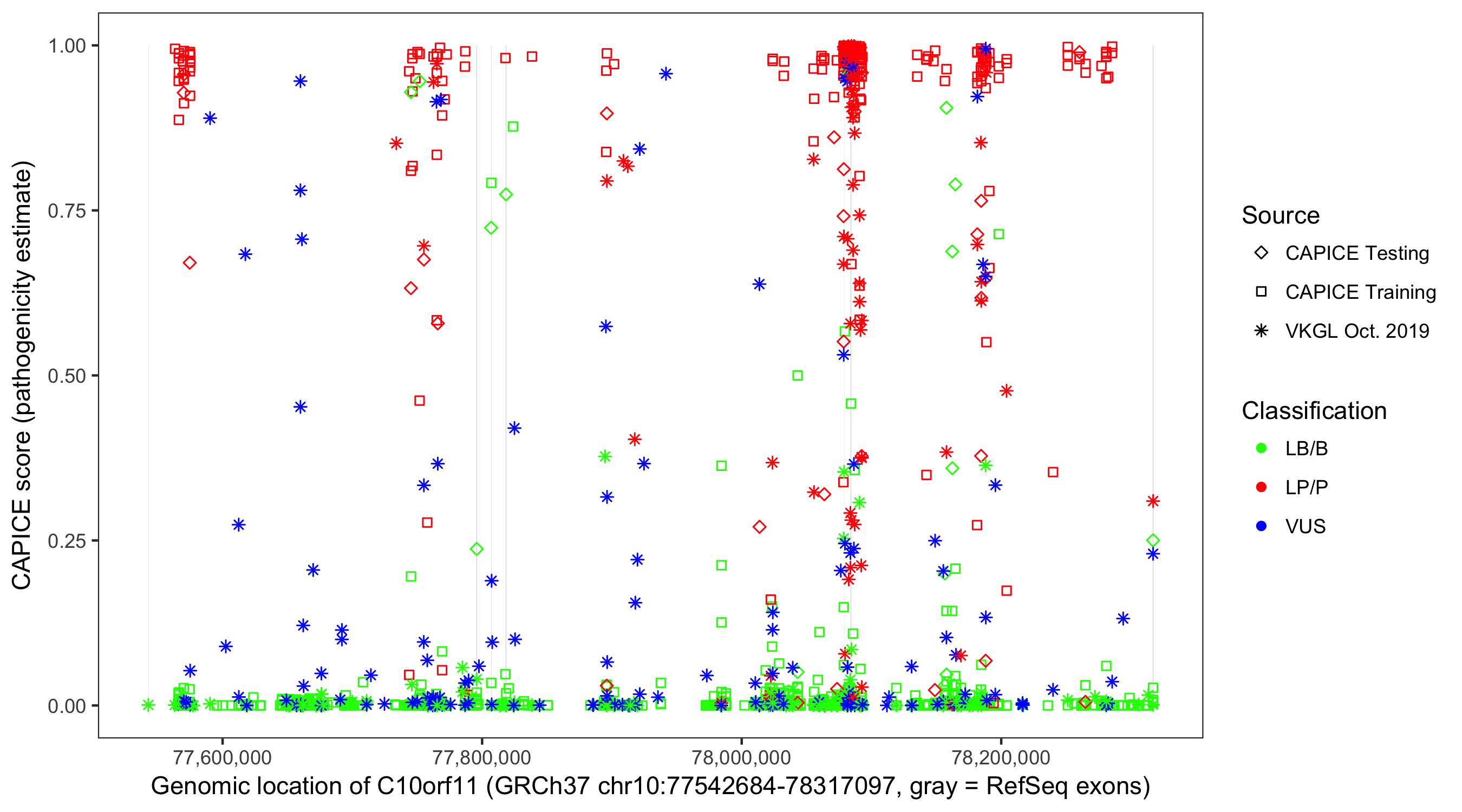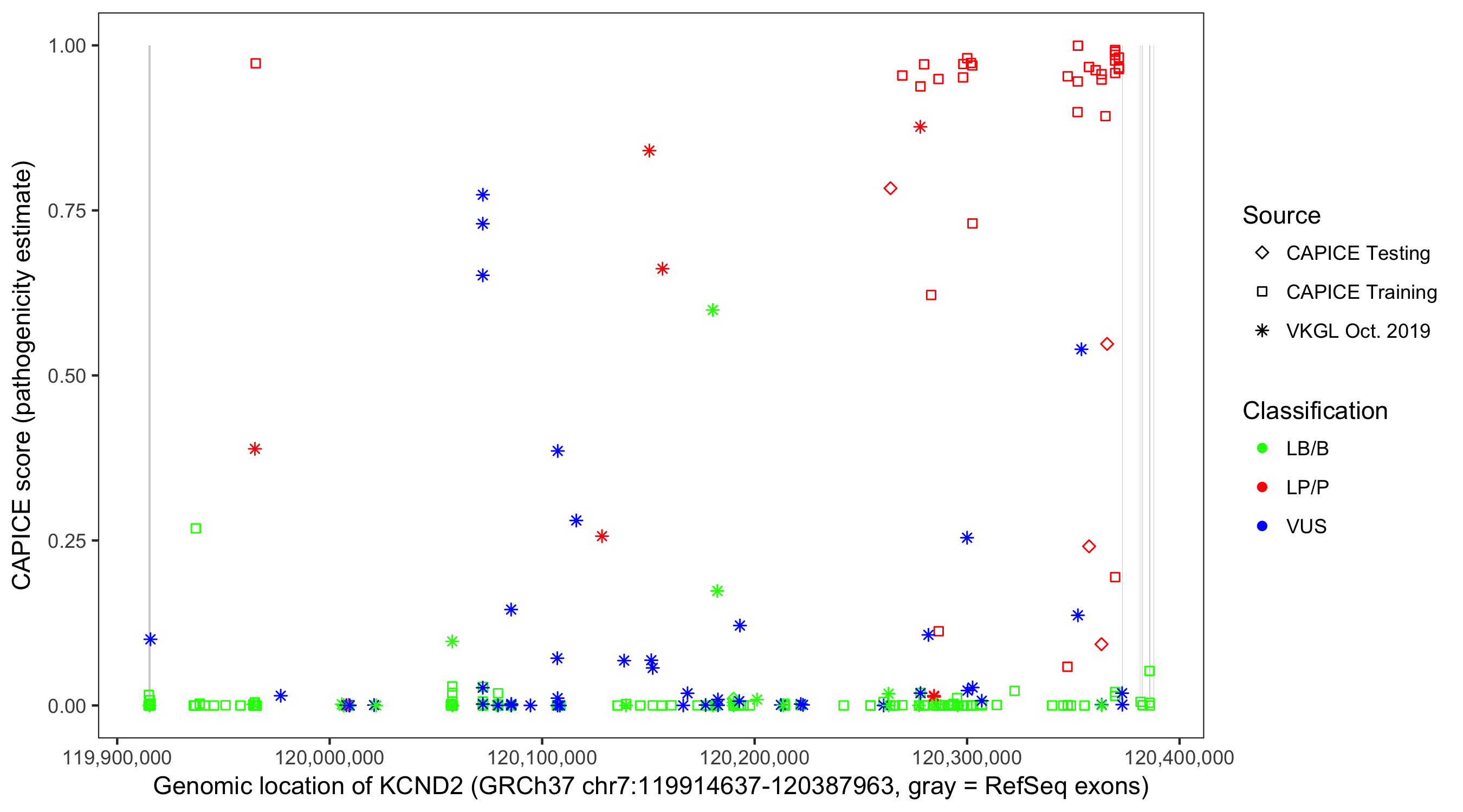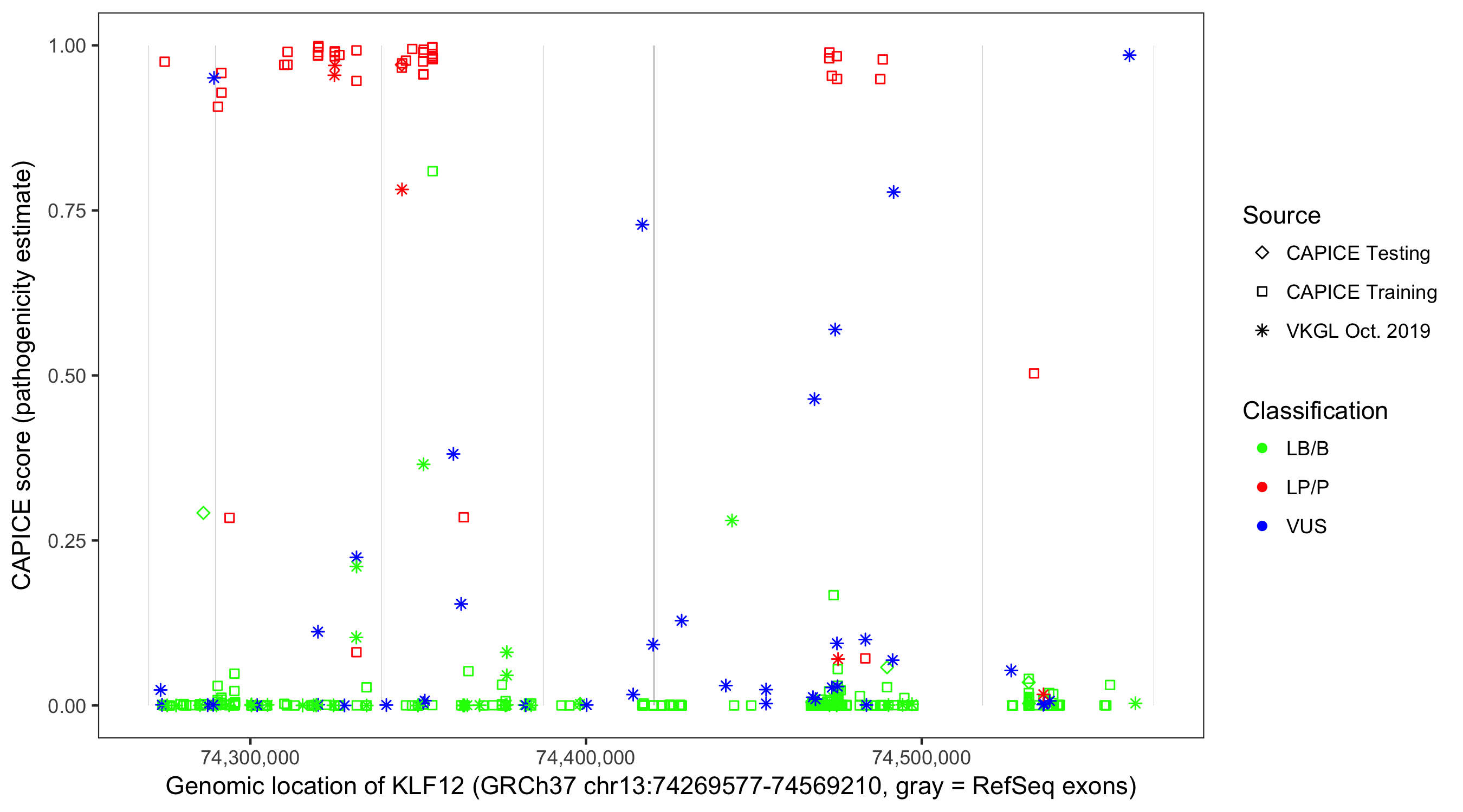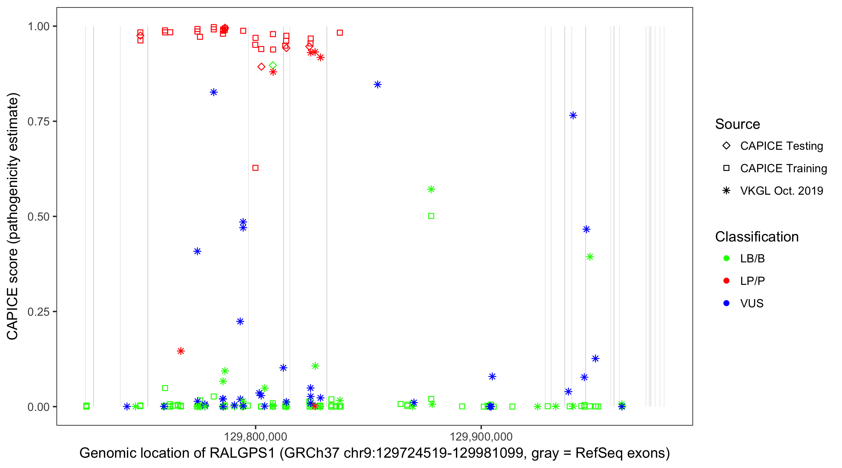 Shown are CAPICE train/test variants plus VKGL Oct 2019.