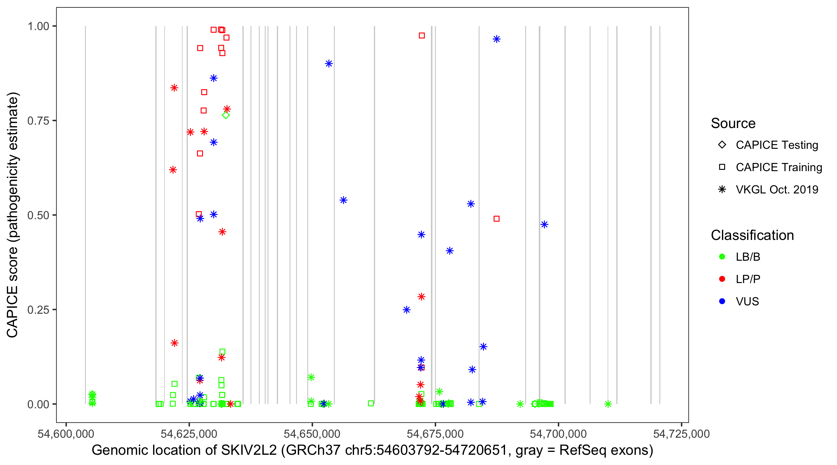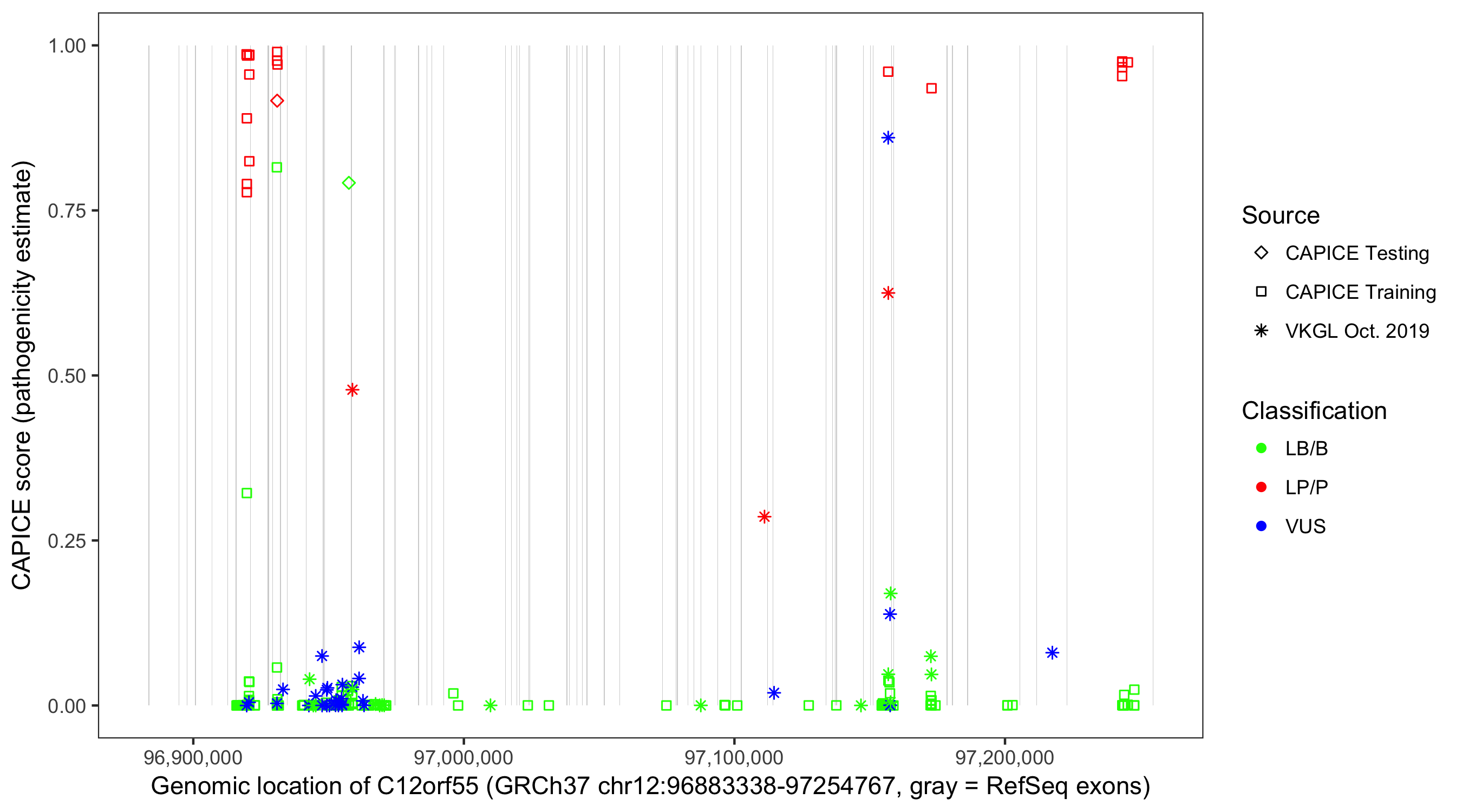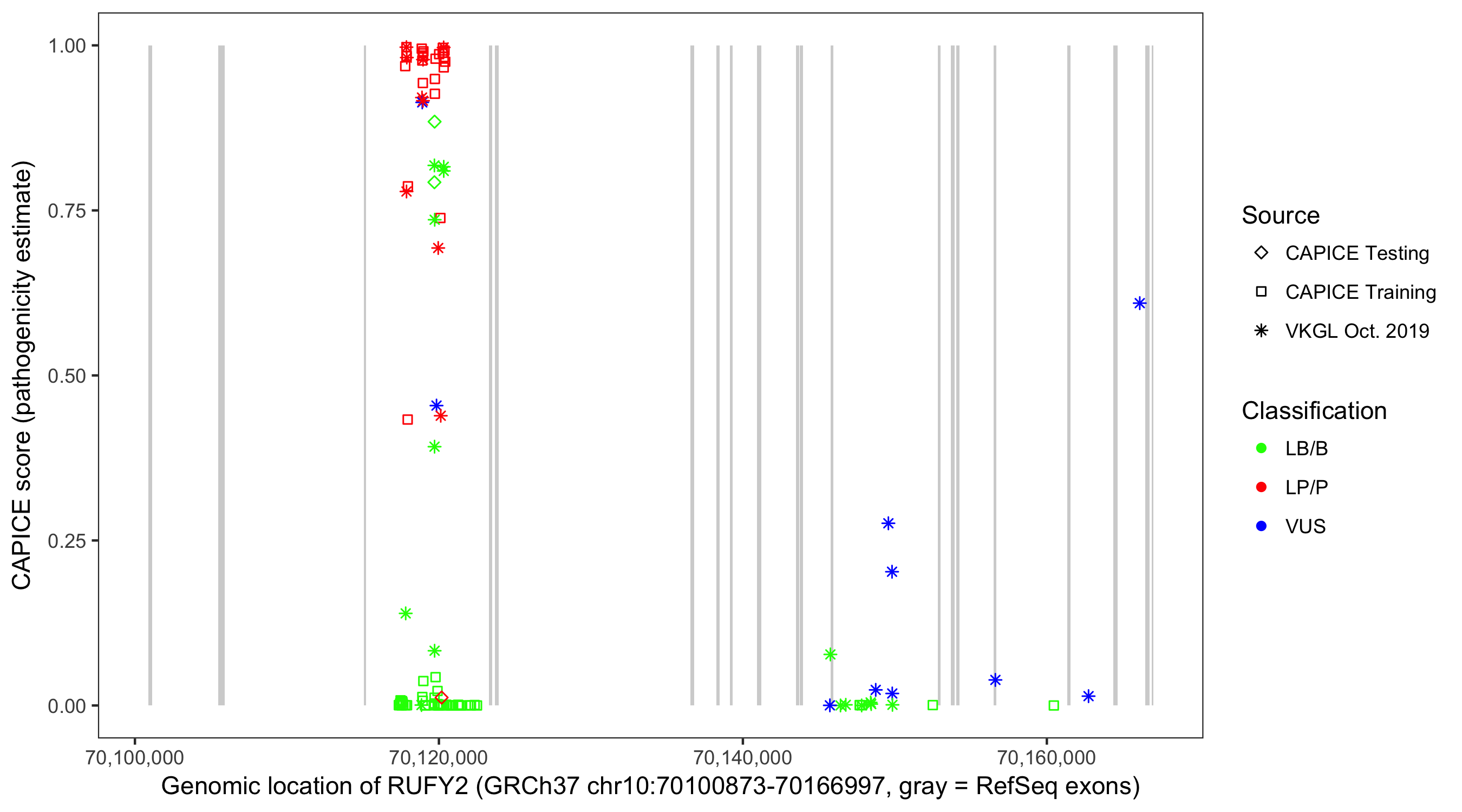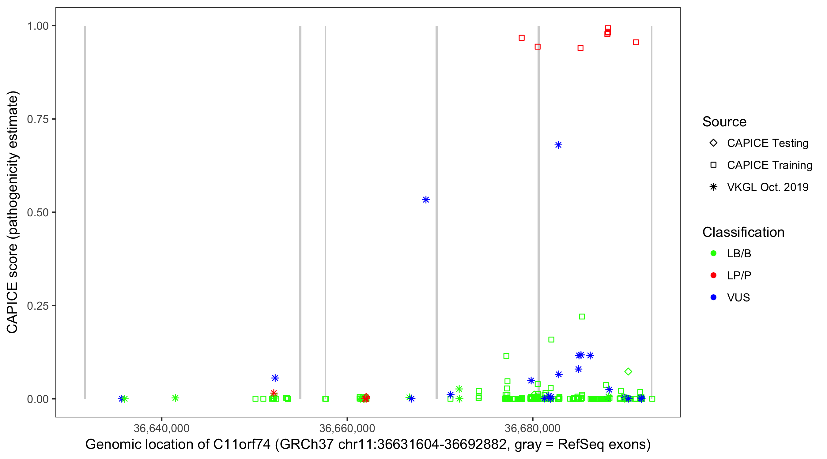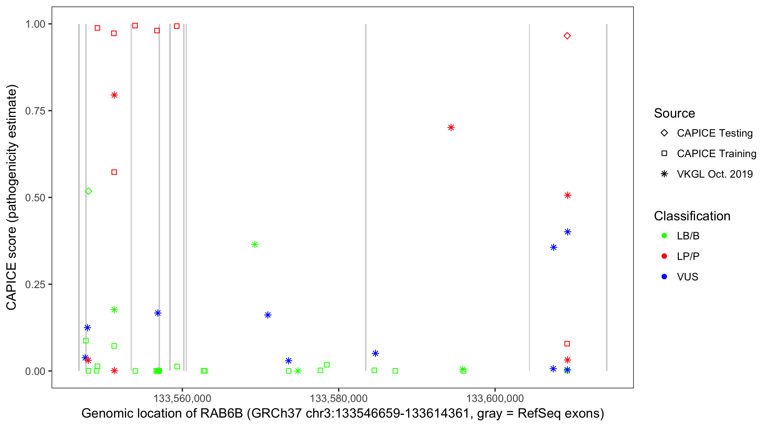 Shown are CAPICE train/test variants plus VKGL Oct 2019.