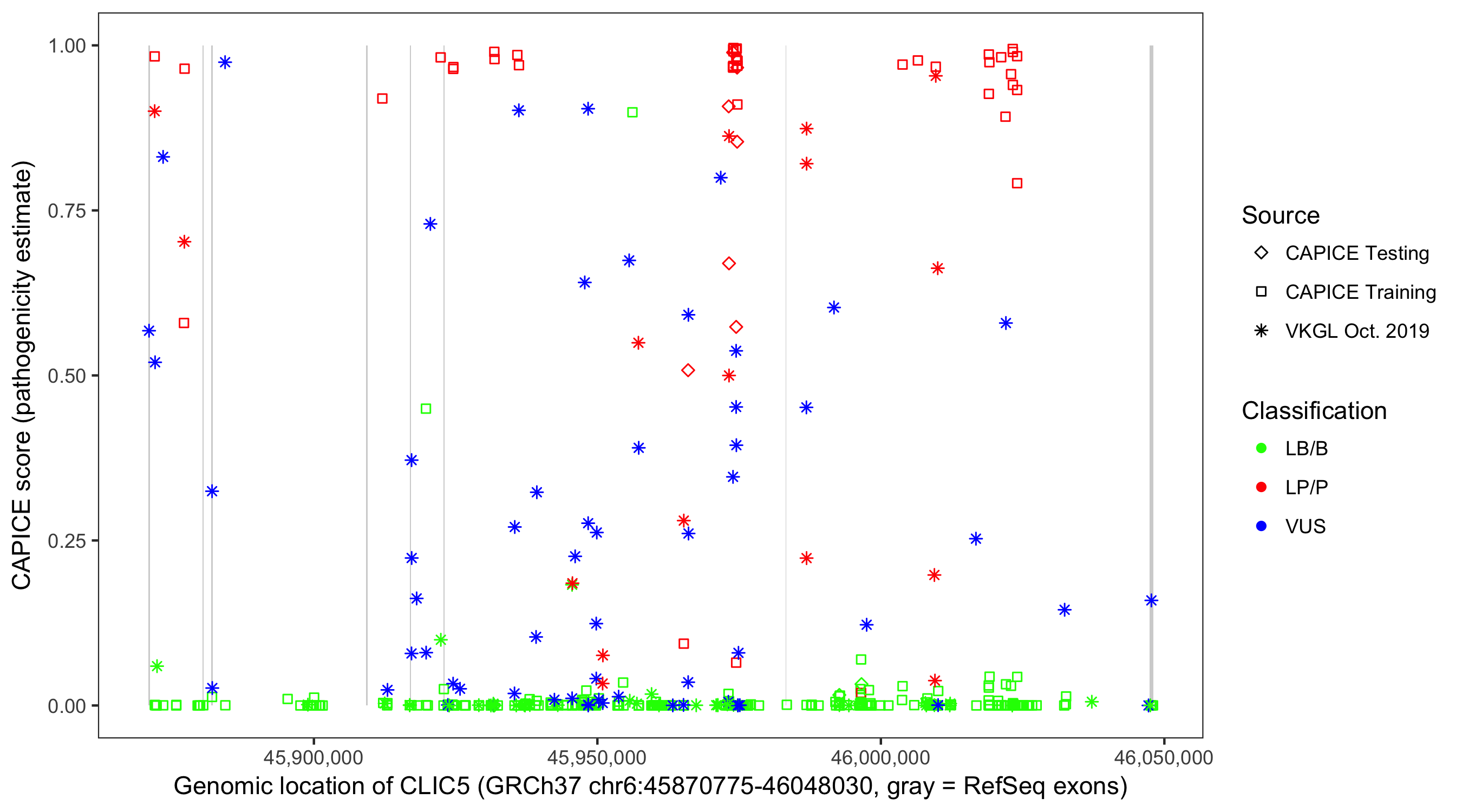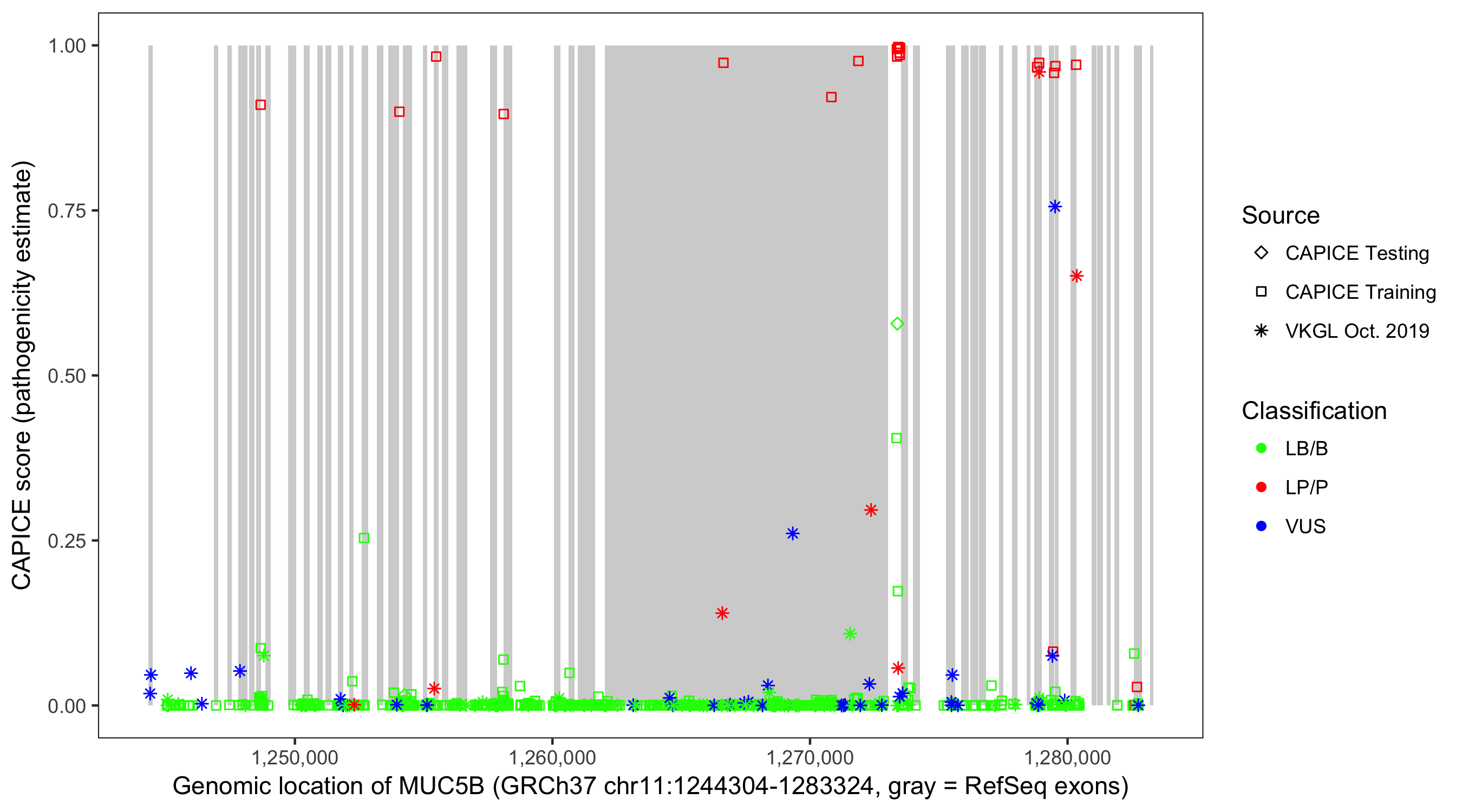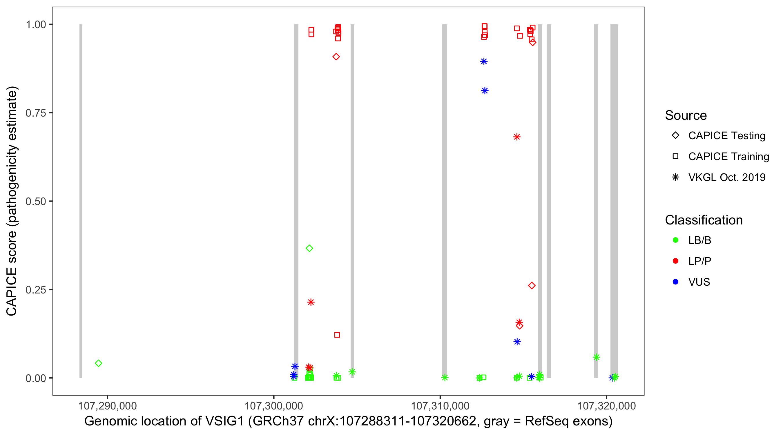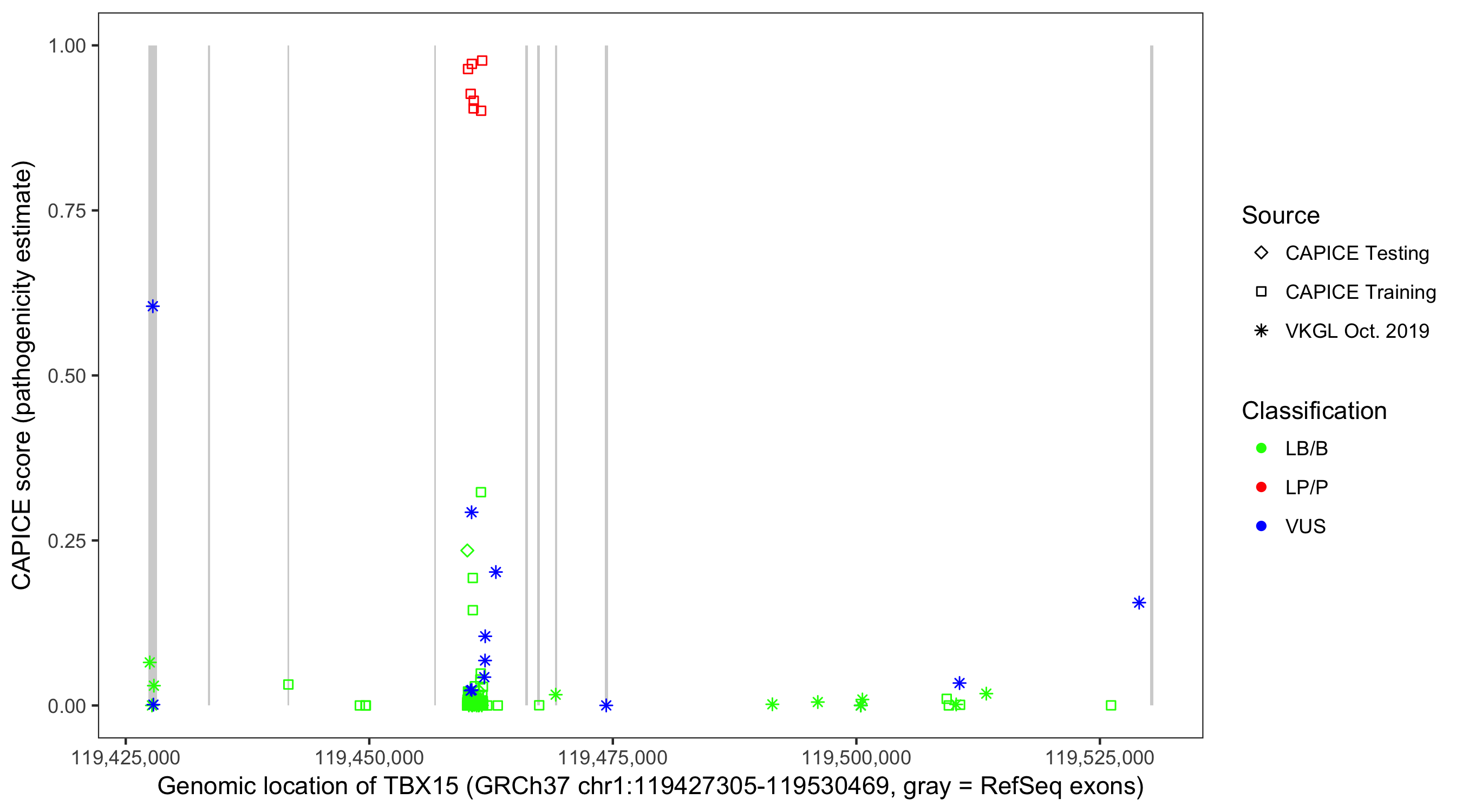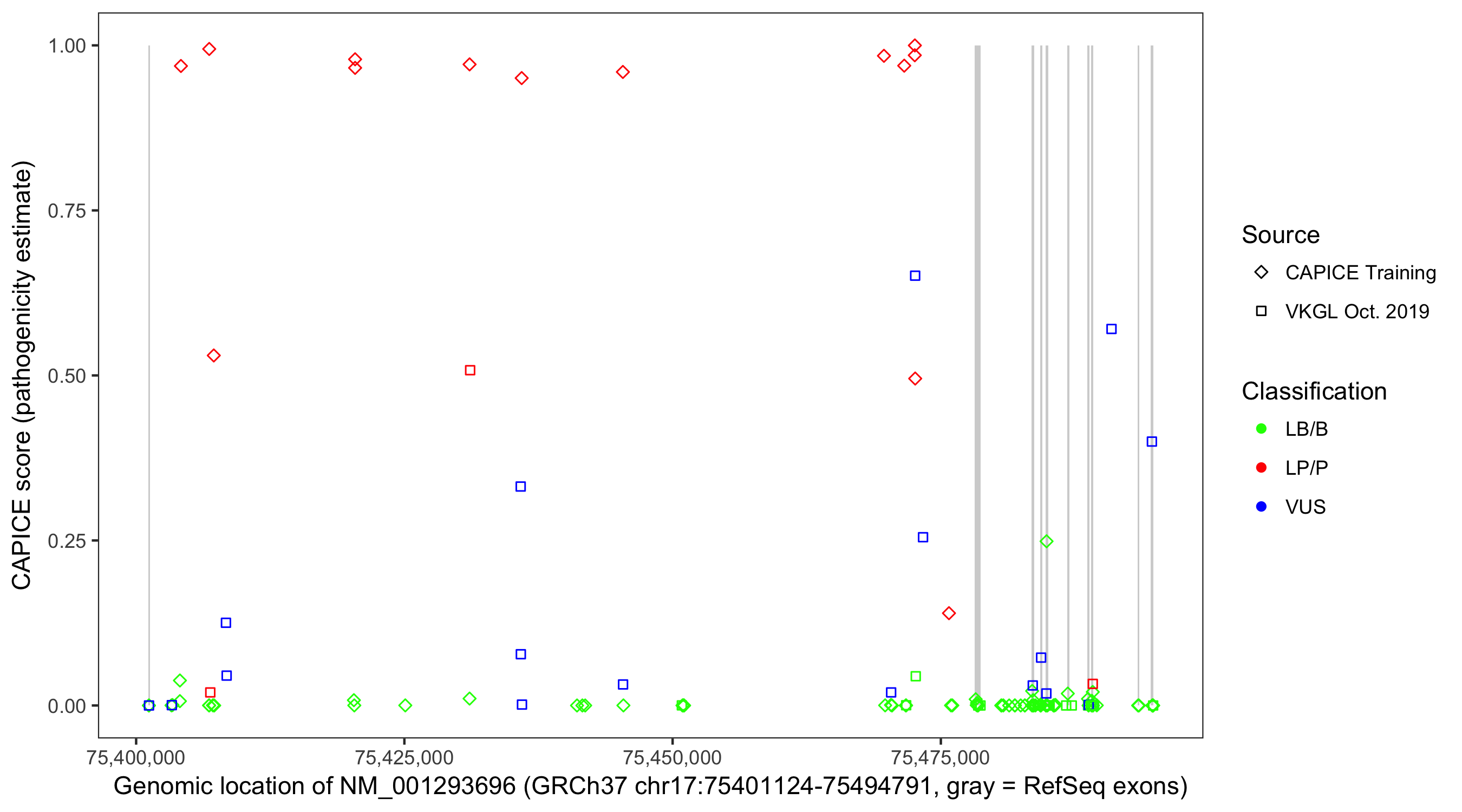 Shown are CAPICE train/test variants plus VKGL Oct 2019.