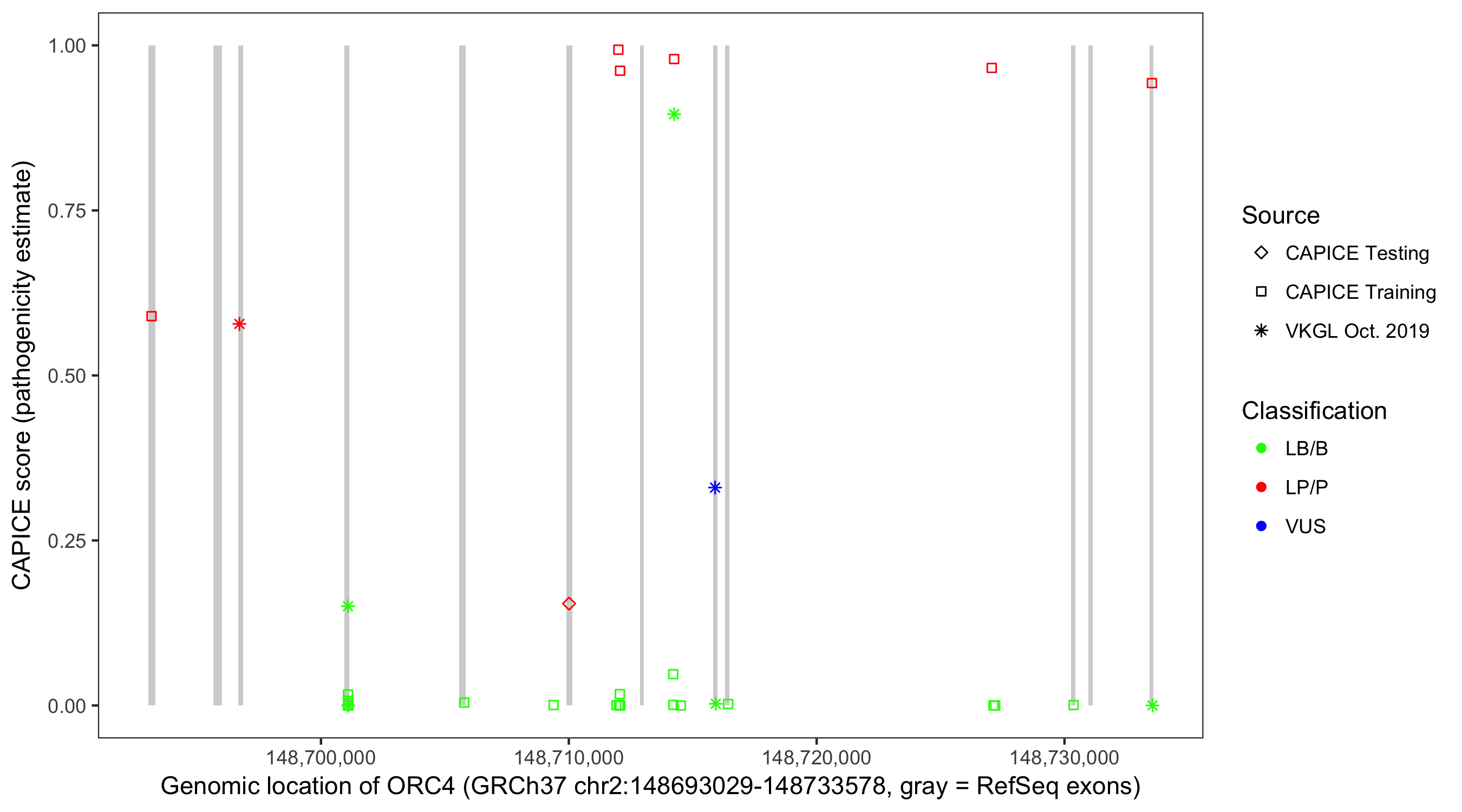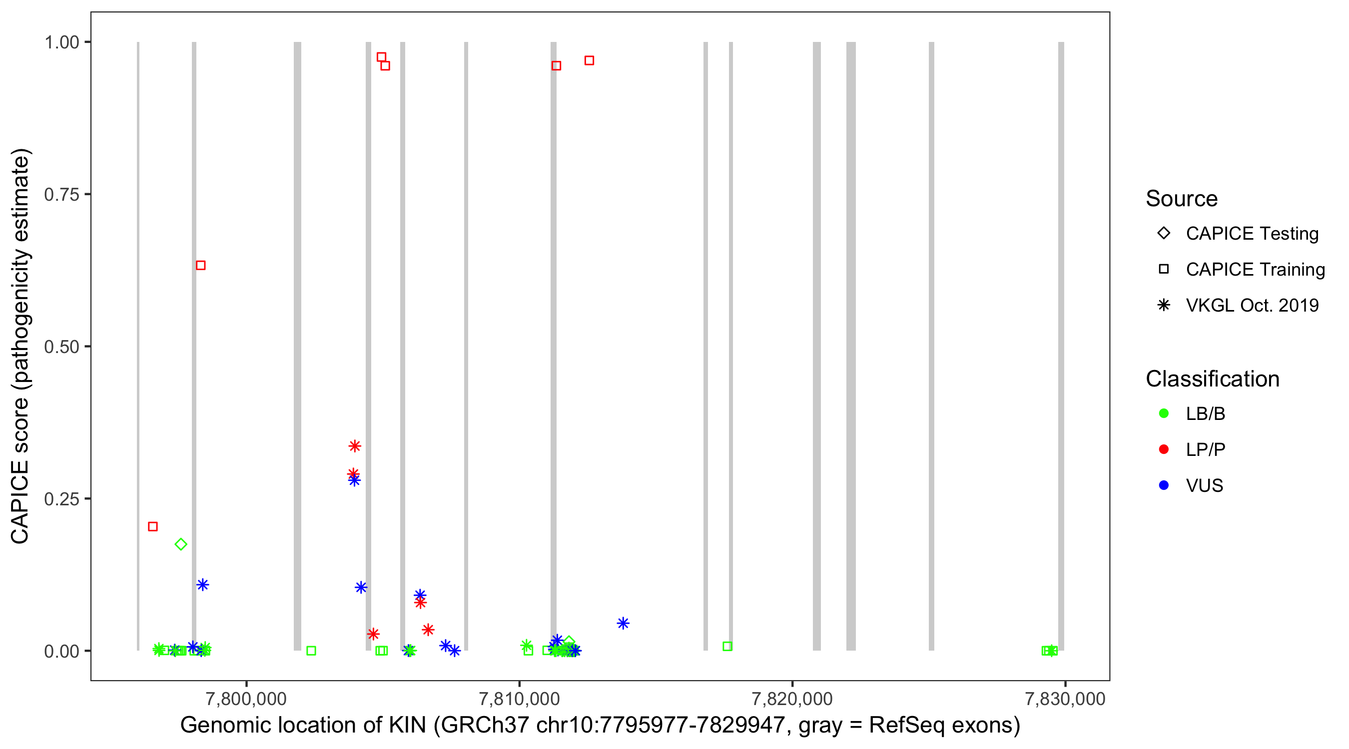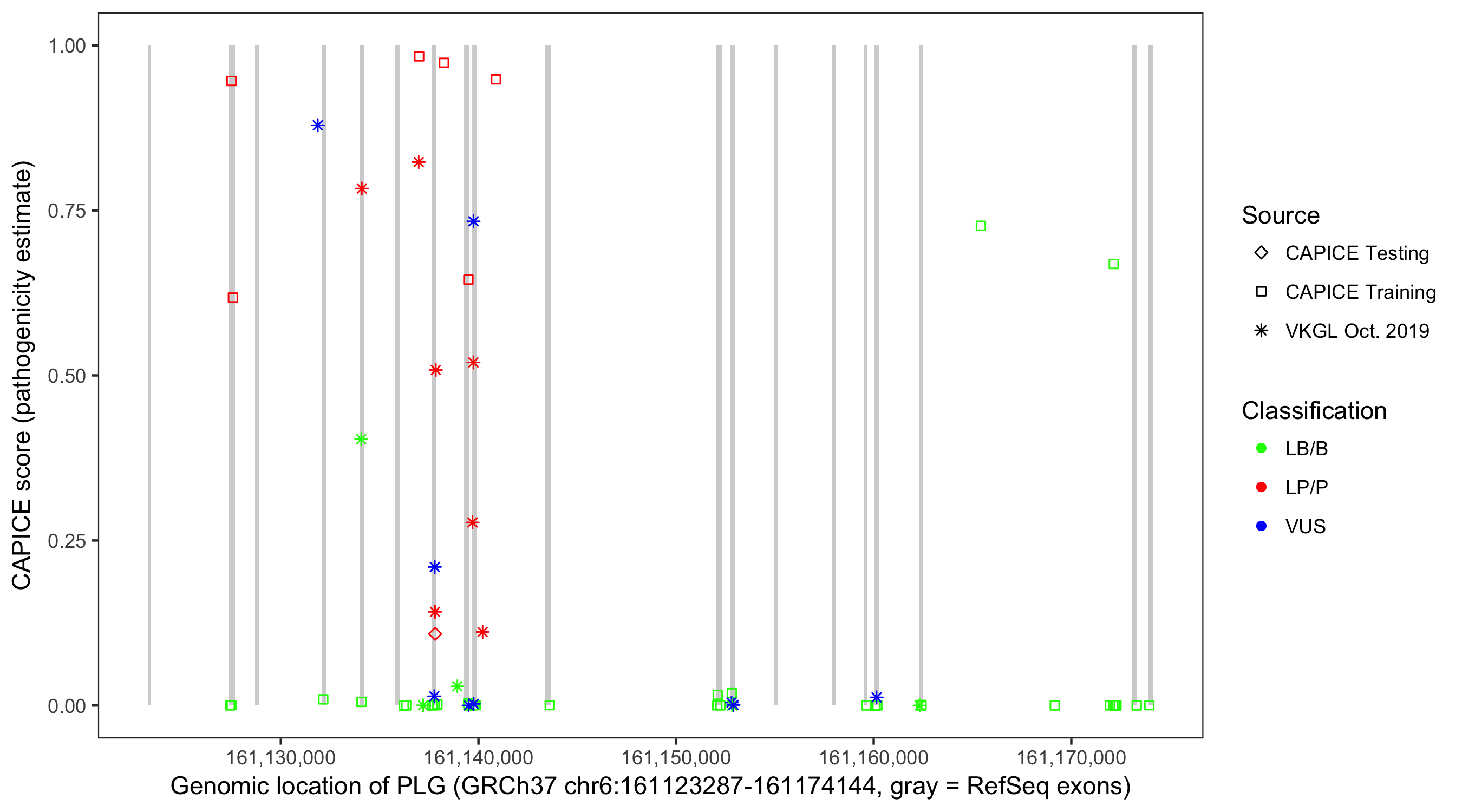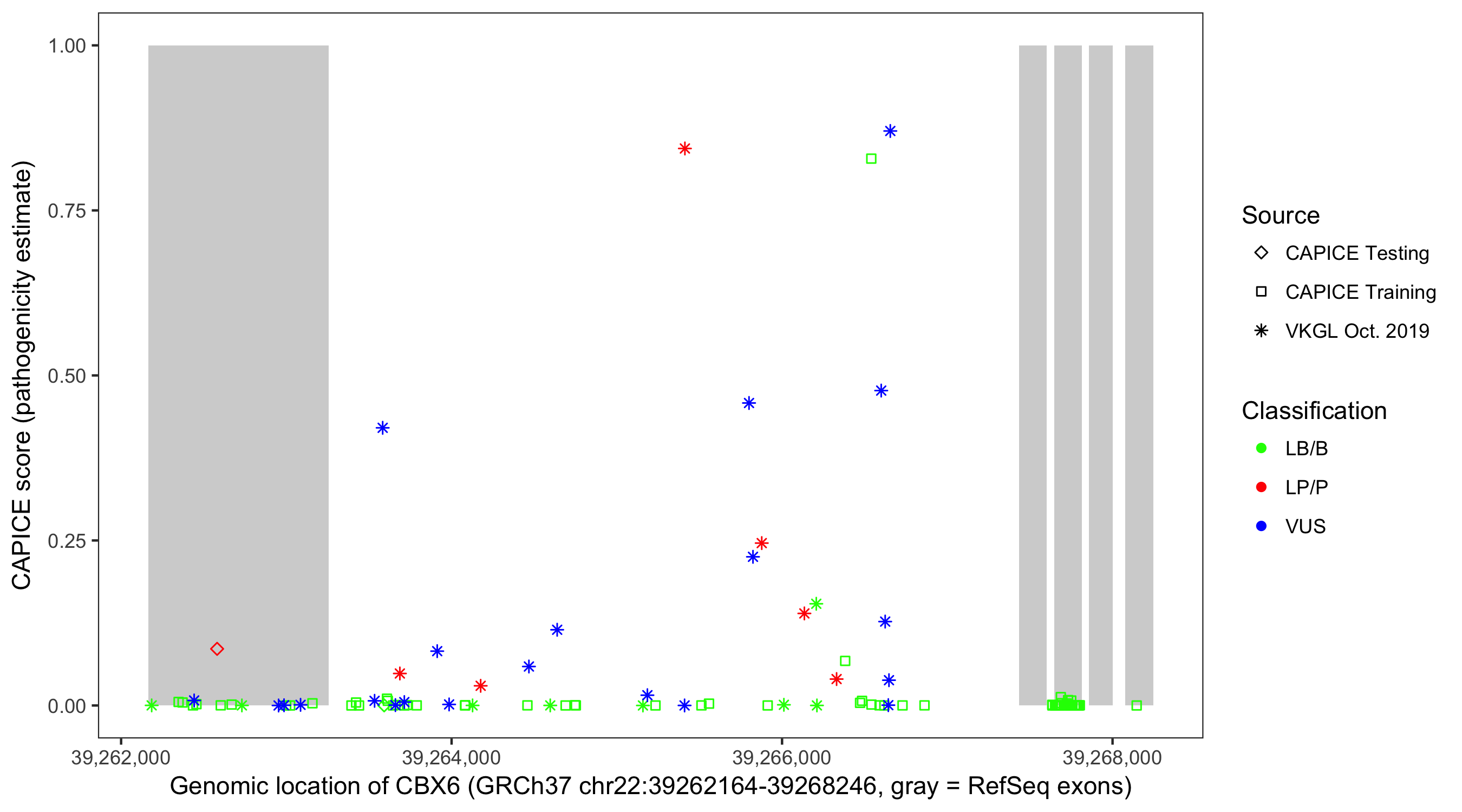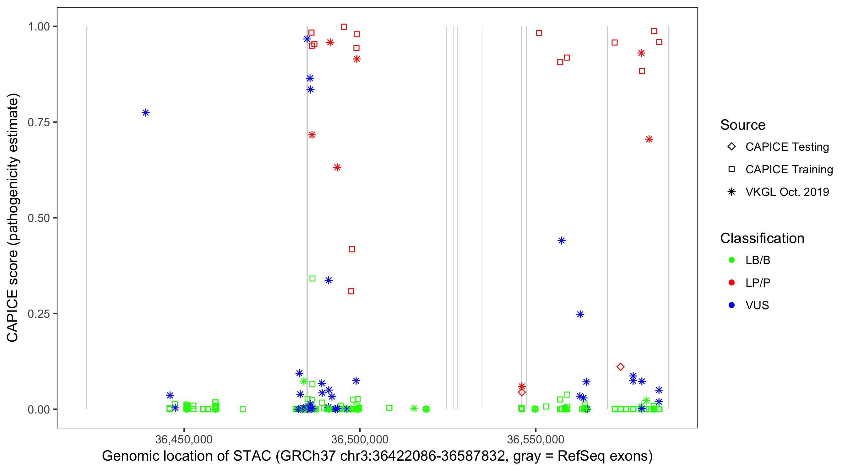 Shown are CAPICE train/test variants plus VKGL Oct 2019.