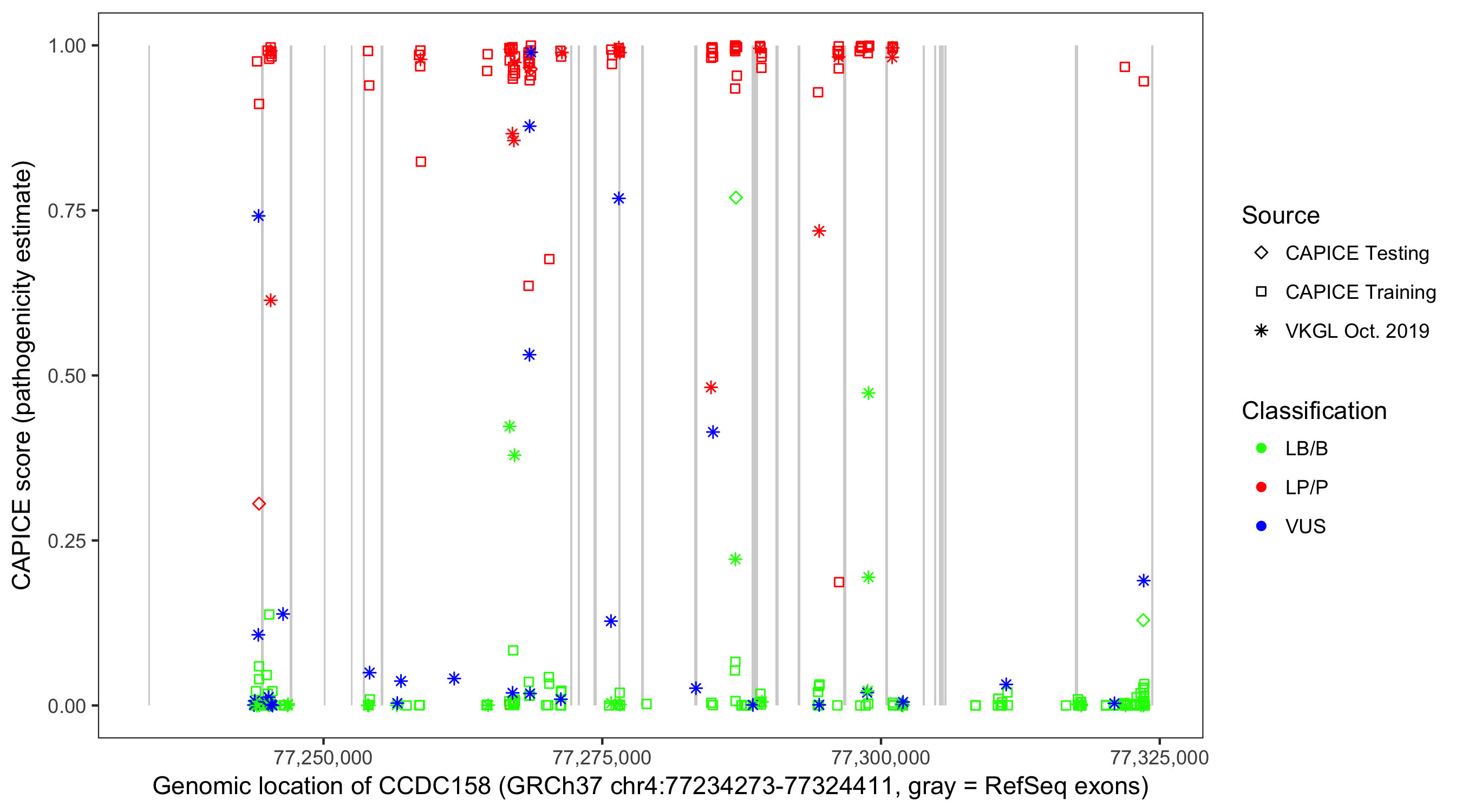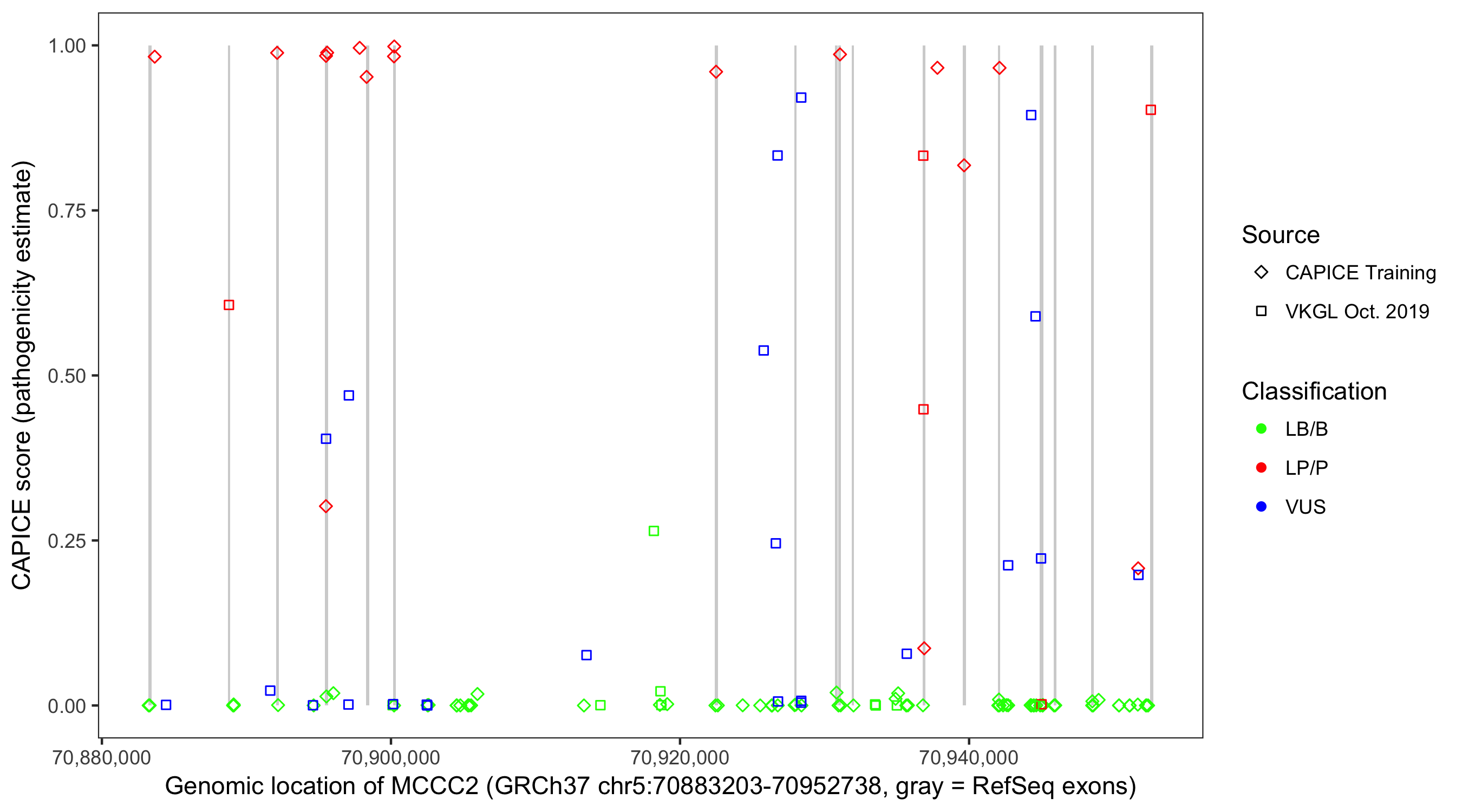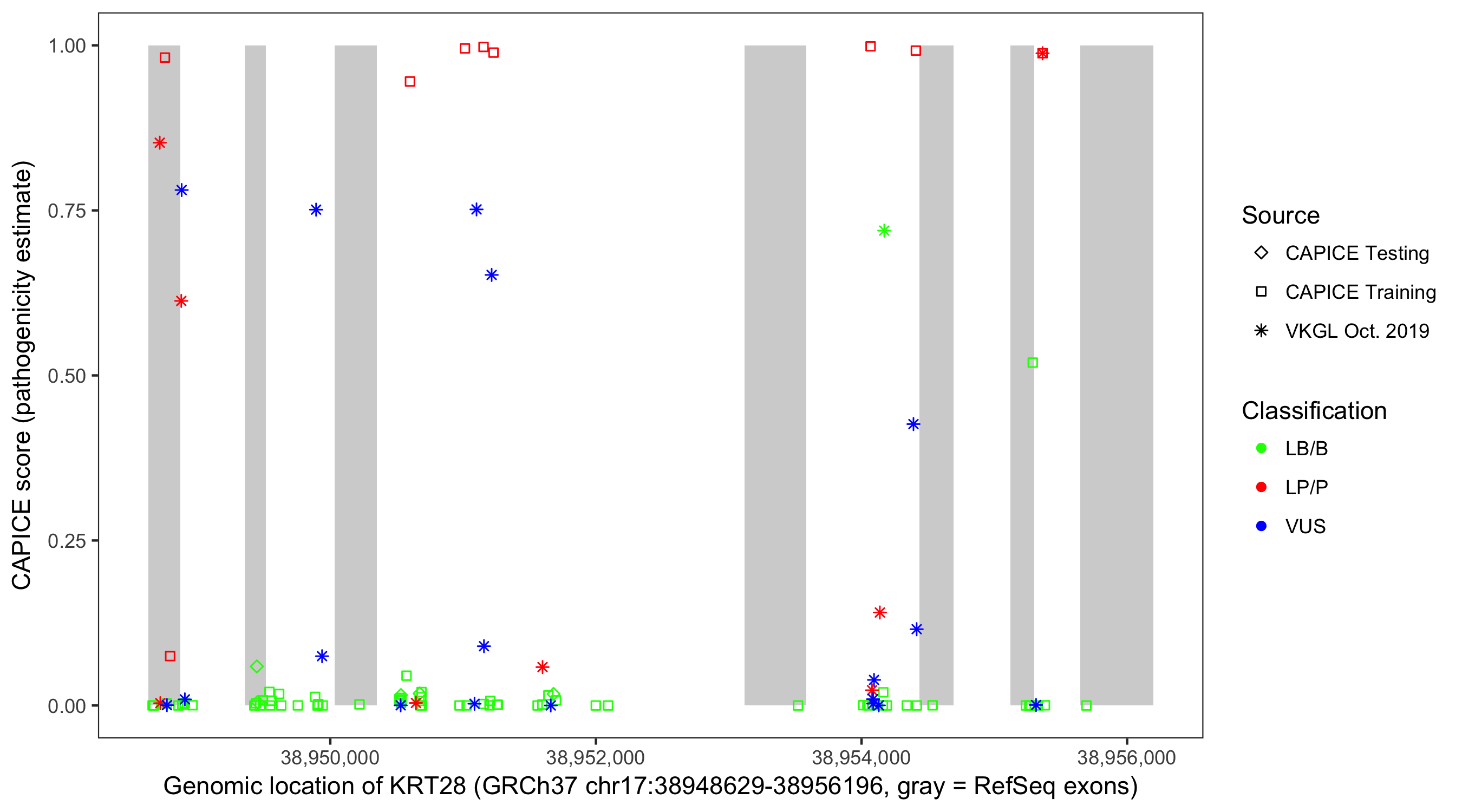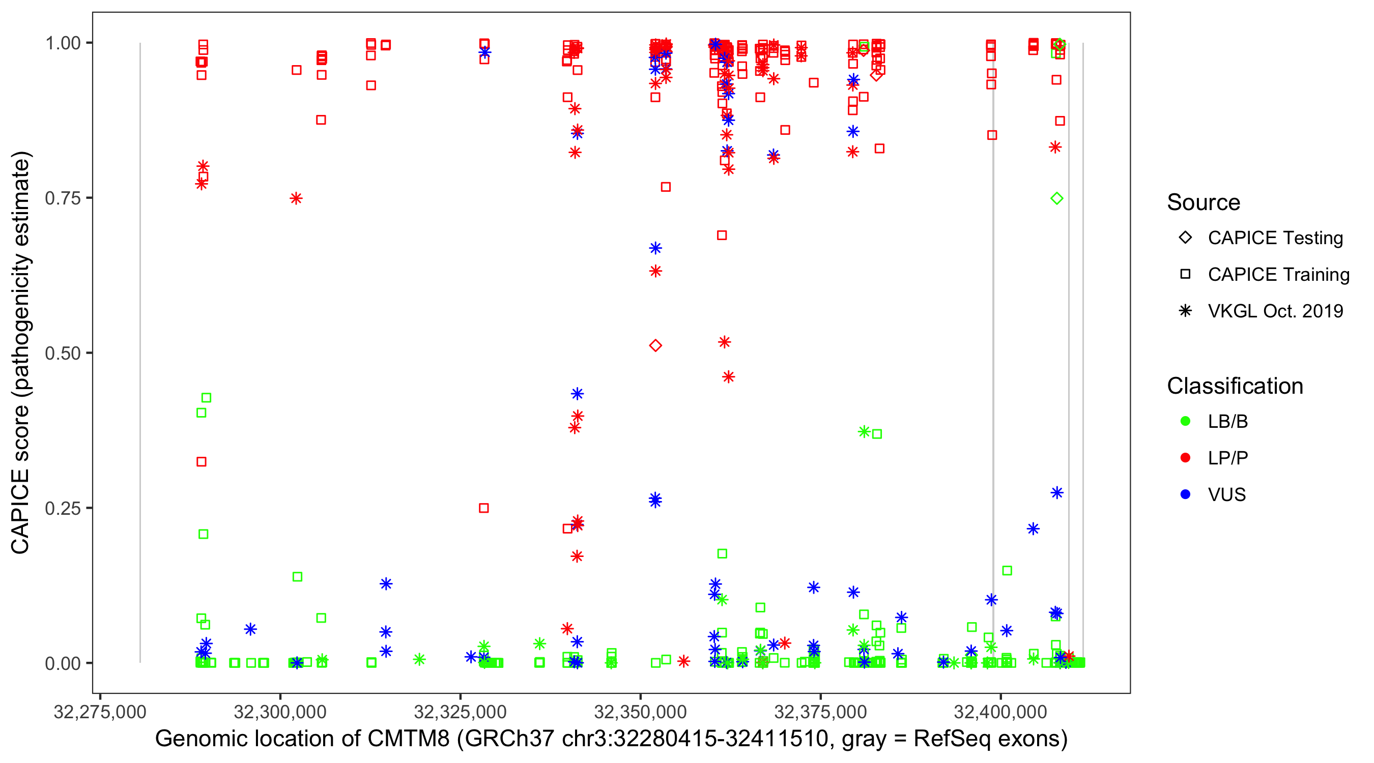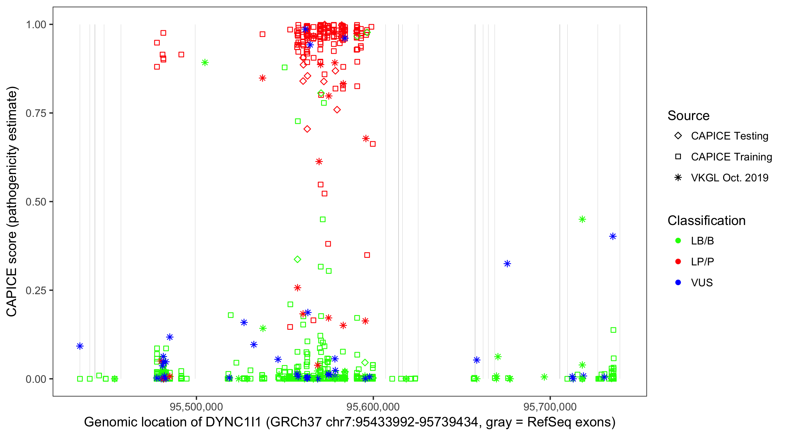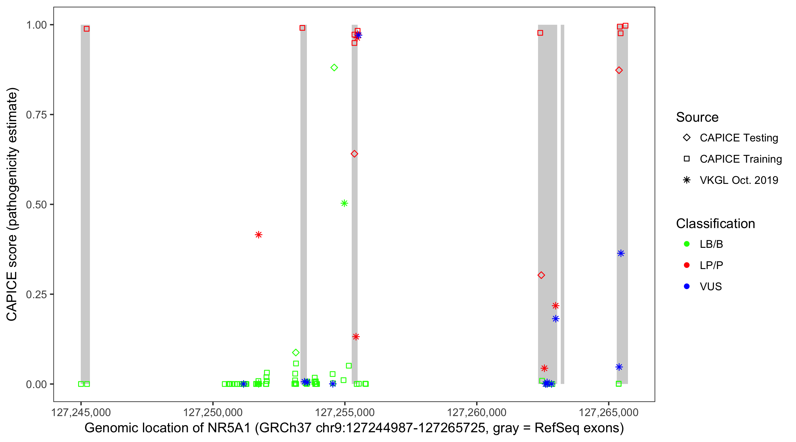 Shown are CAPICE train/test variants plus VKGL Oct 2019.